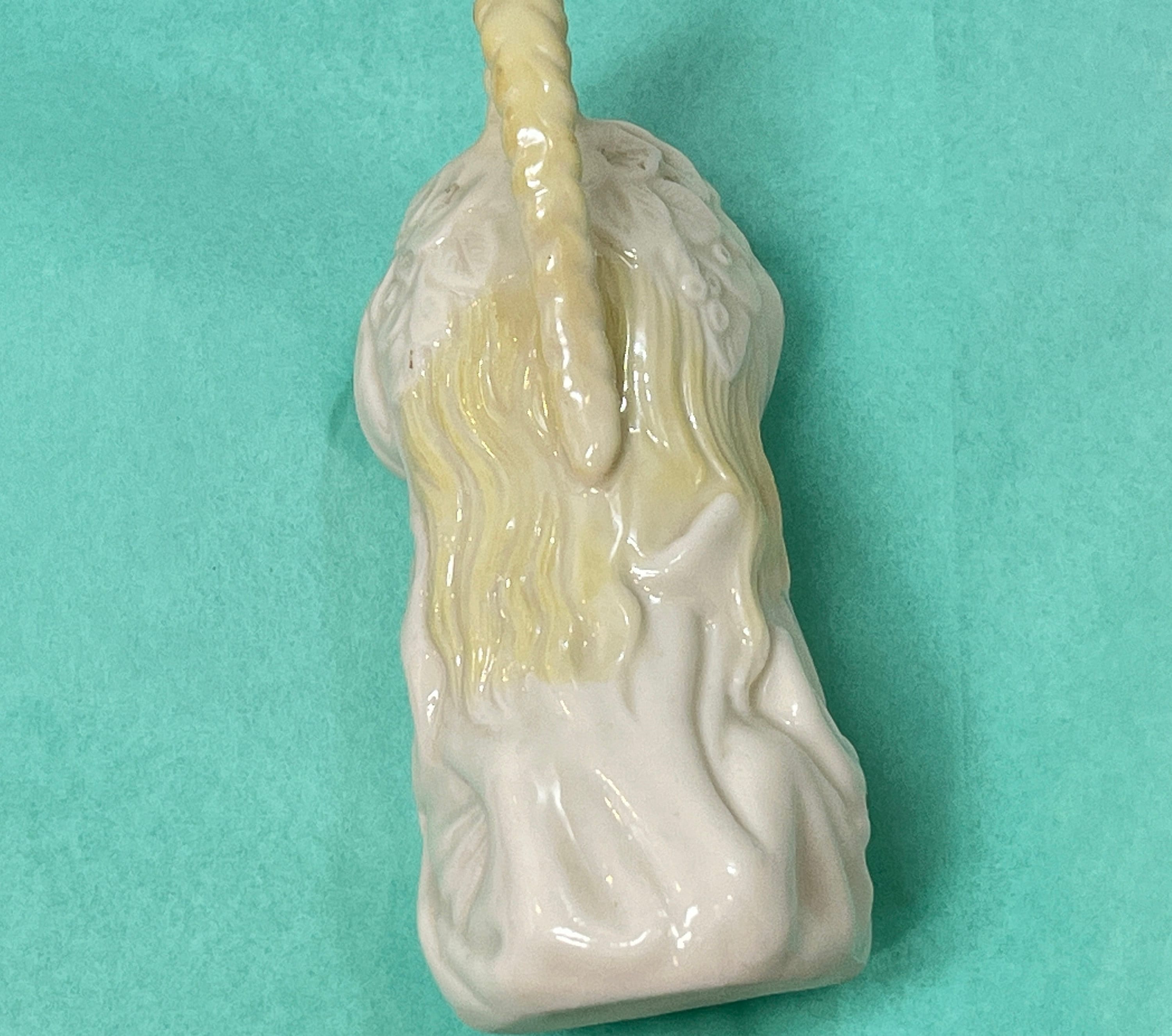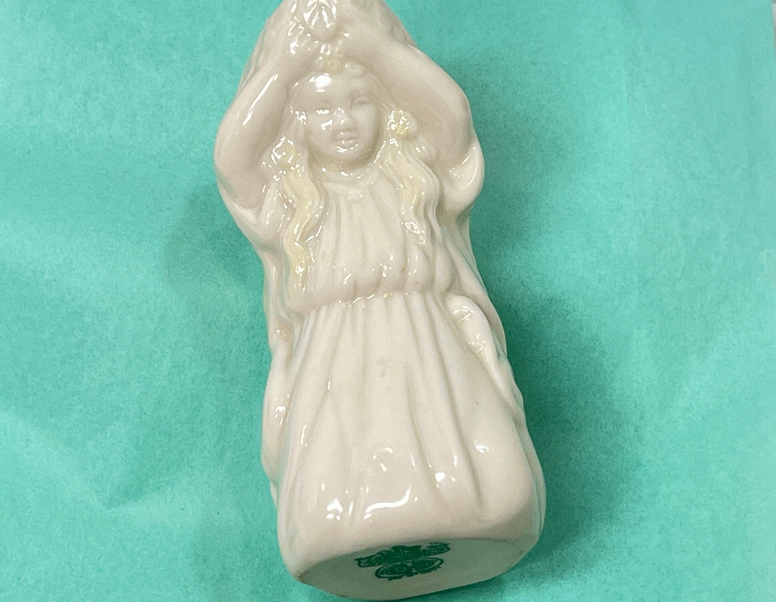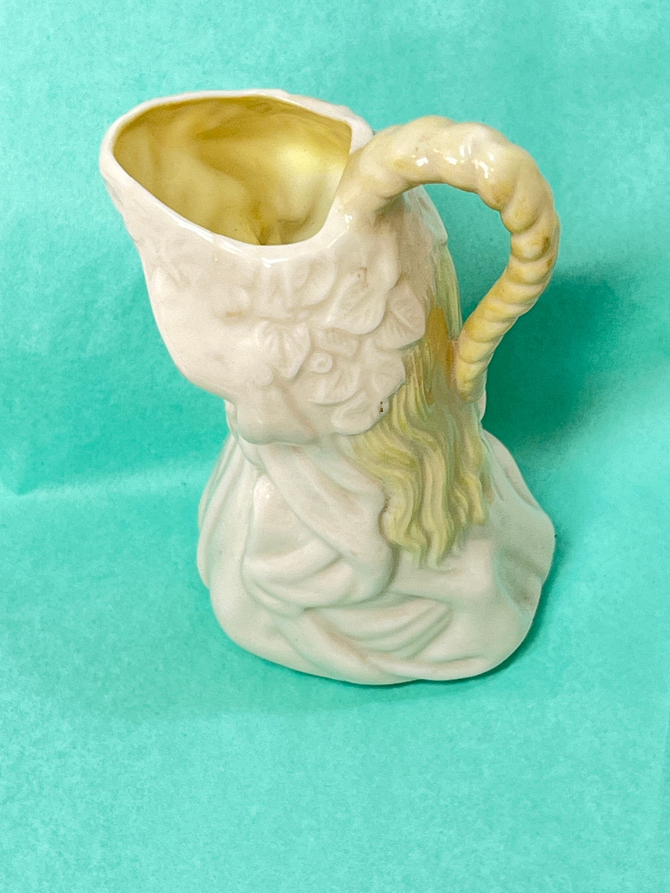 This Irish cream pitcher represents Undine, the pretty lass who was portrayed by Hans Christian Anderson. She proudly wears the sixth green Belleek mark which means it was made between 1965 and 1980. Water nymphs are often called undines. To us this little lady looks like she is about to dive into the water. Belleek featured her in one of their catalogs. This might also make a lovely bud vase.