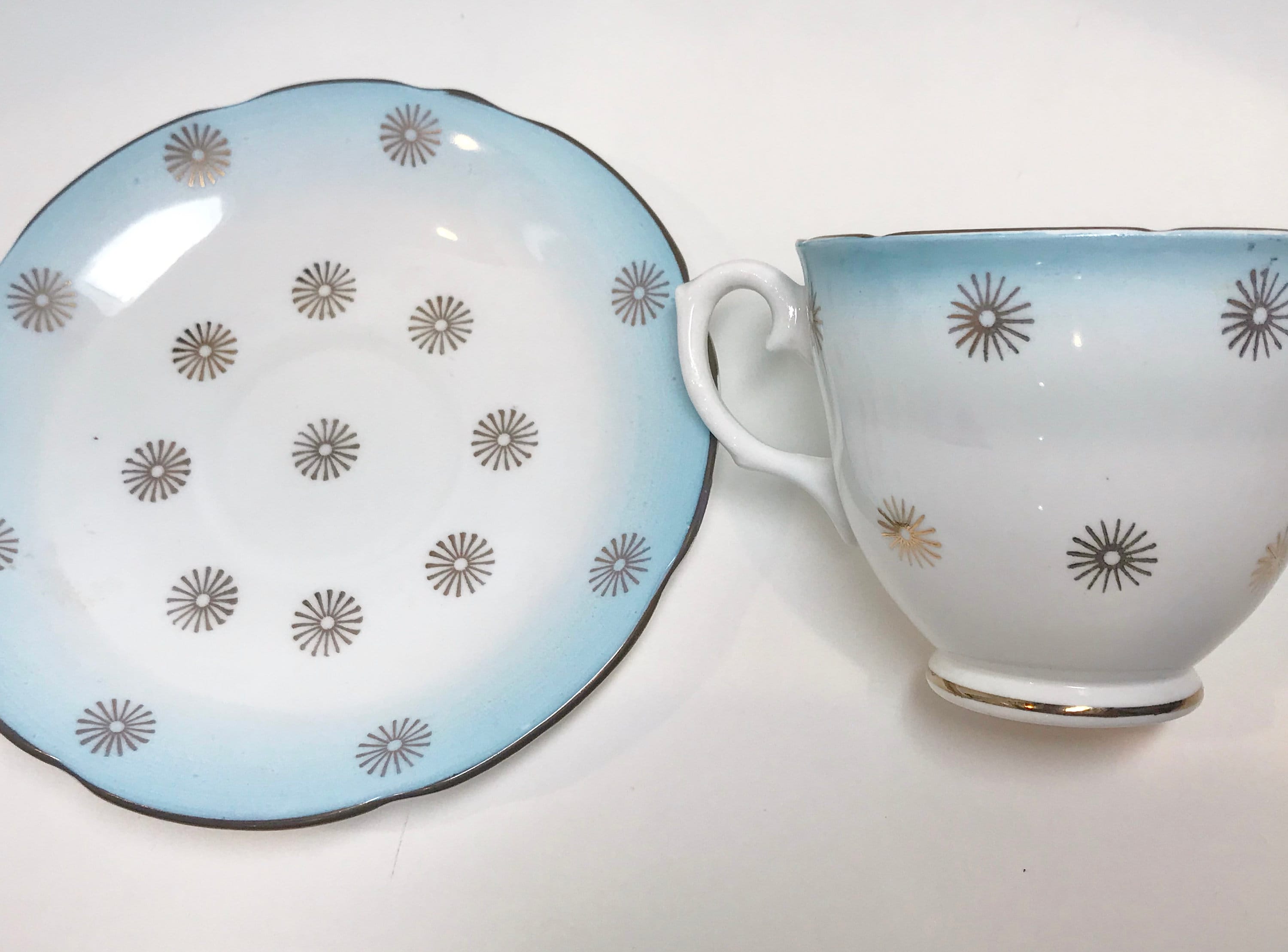 The 1950s were famous for the sunburst of gold in design. Here we have it on a teacup. It reminded us of the atomic clocks. We suggest you have tea and let time float by.