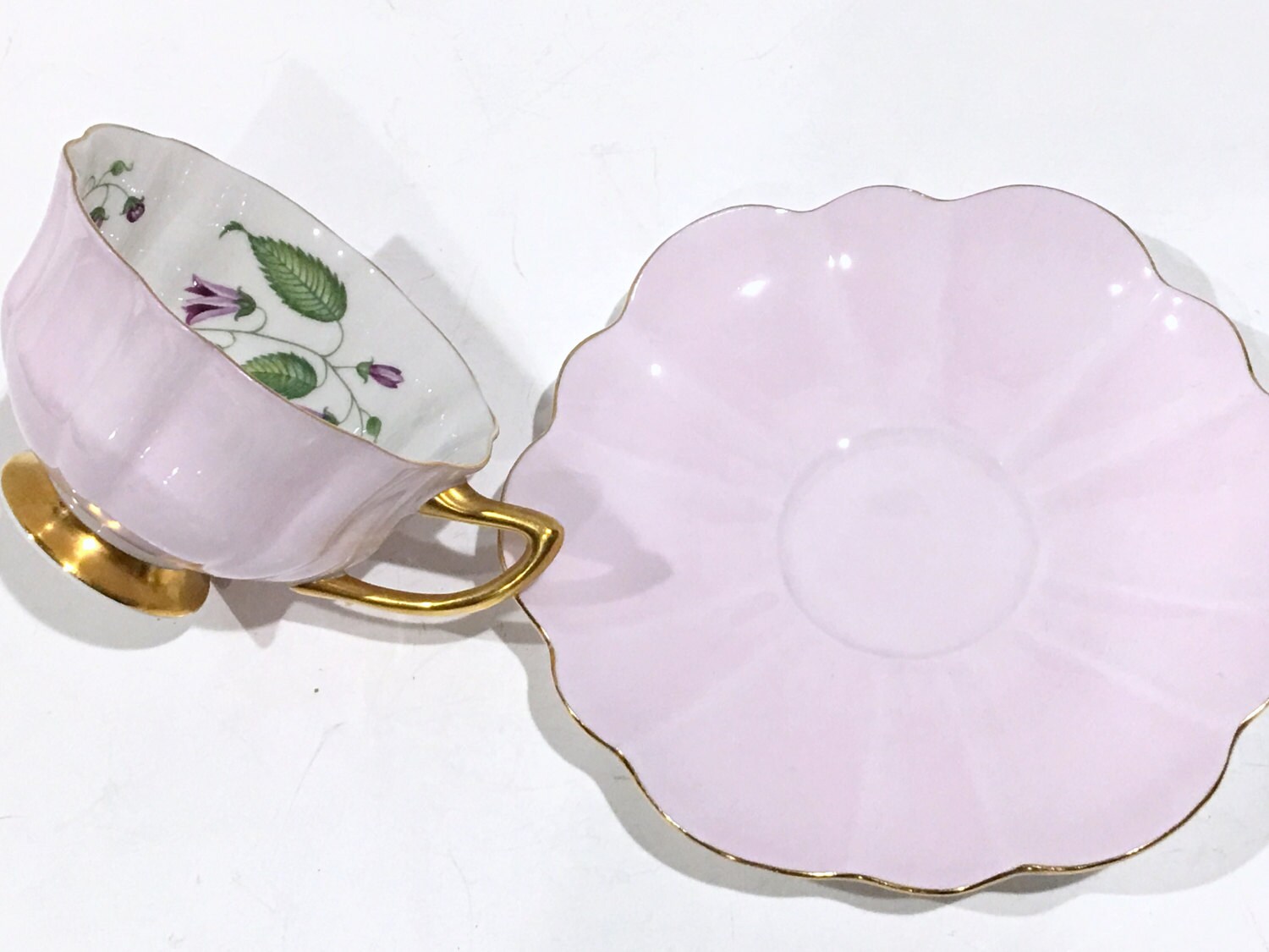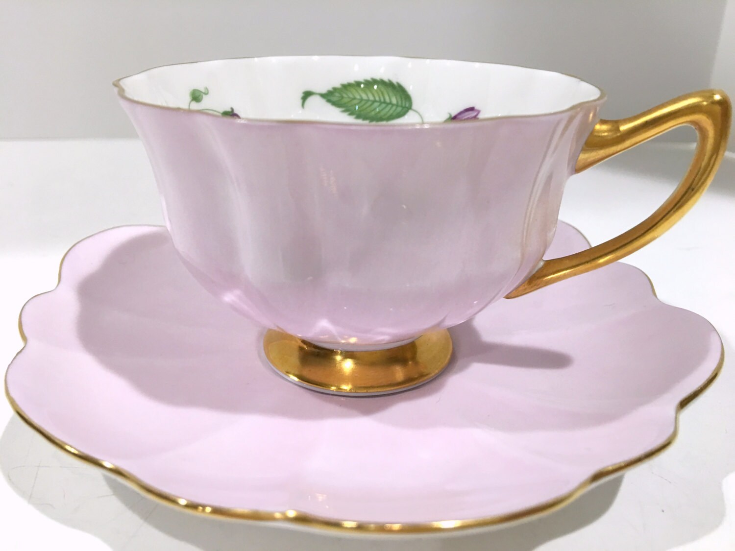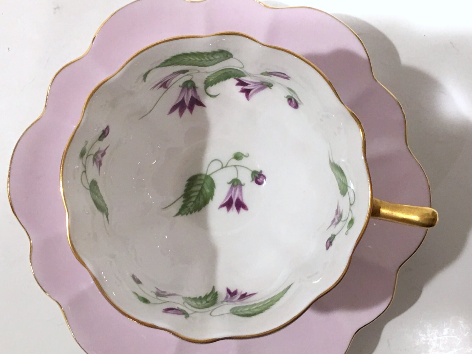 This exceptional Shelley teacup and saucer is called the Campanula pattern using the Atholl shape in the S41 or lilac color.