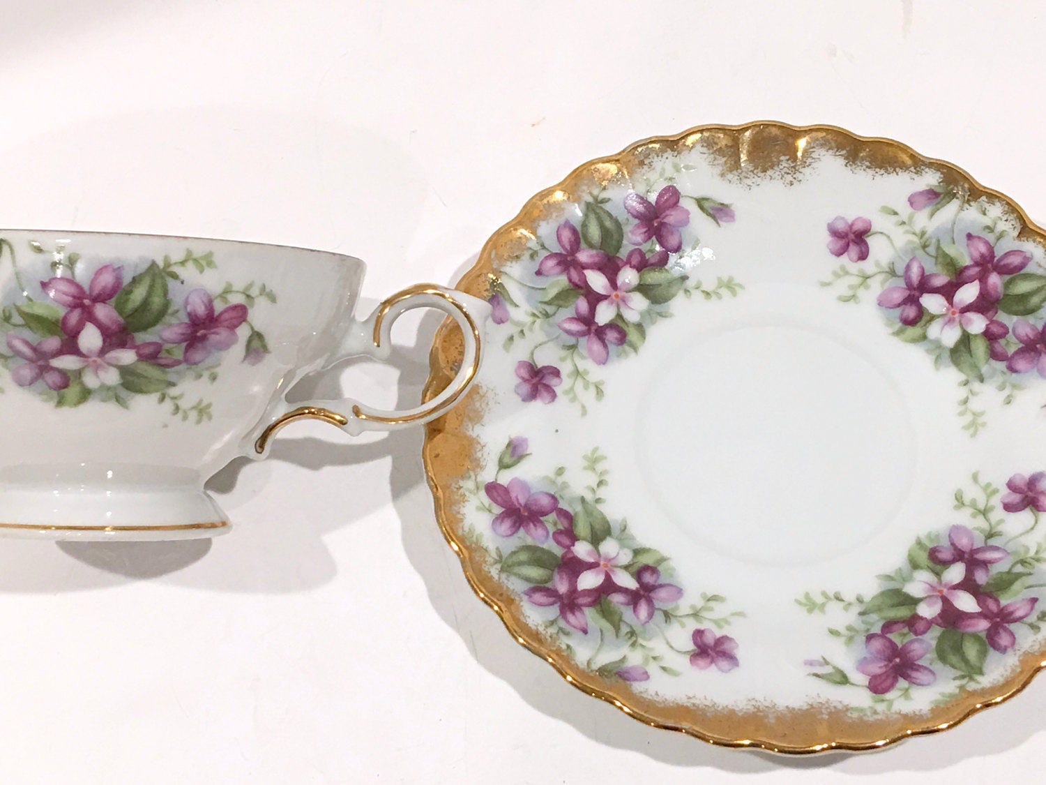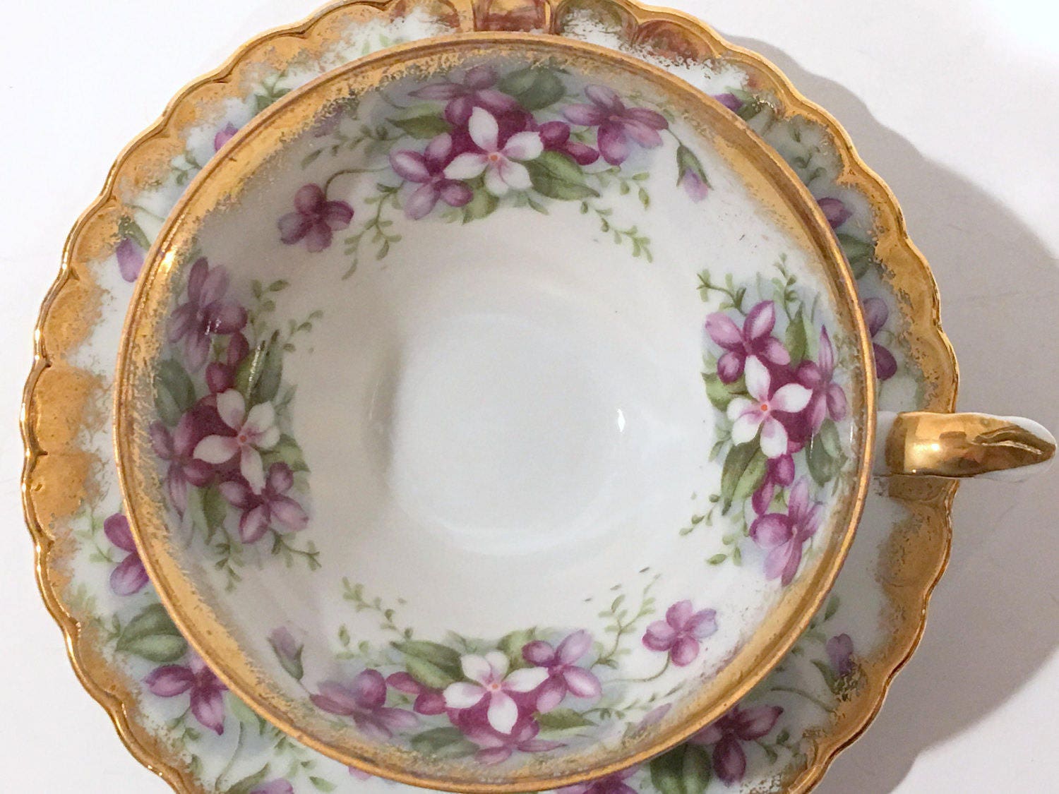 Gold makes the perfect frame for the delicate violets which cascade over the pretty china.