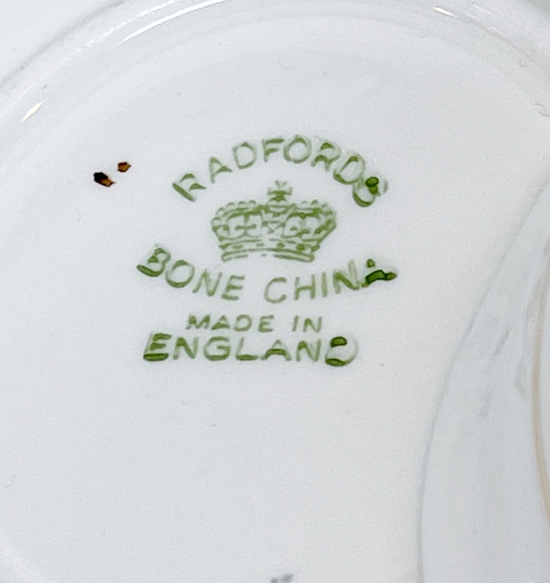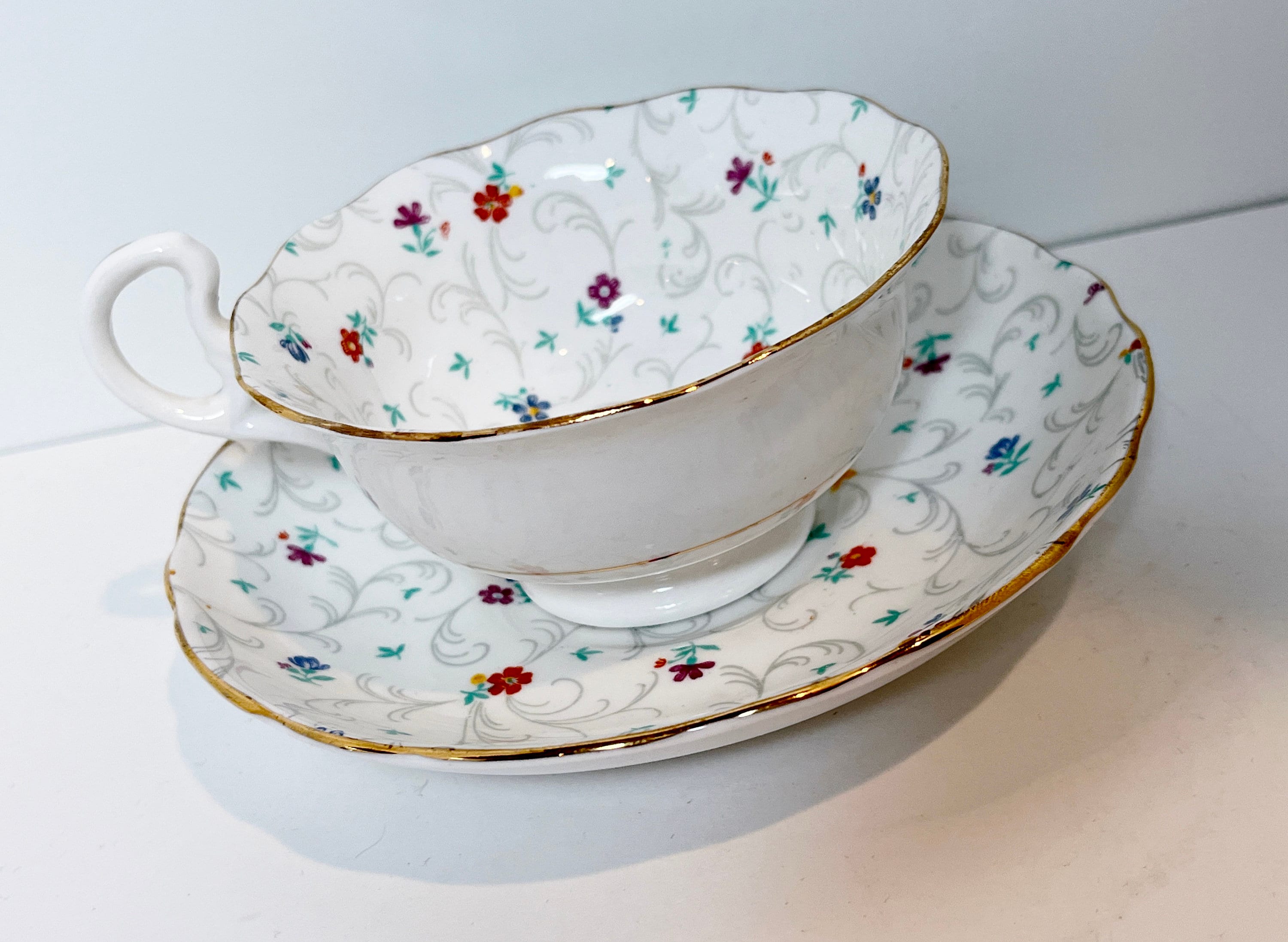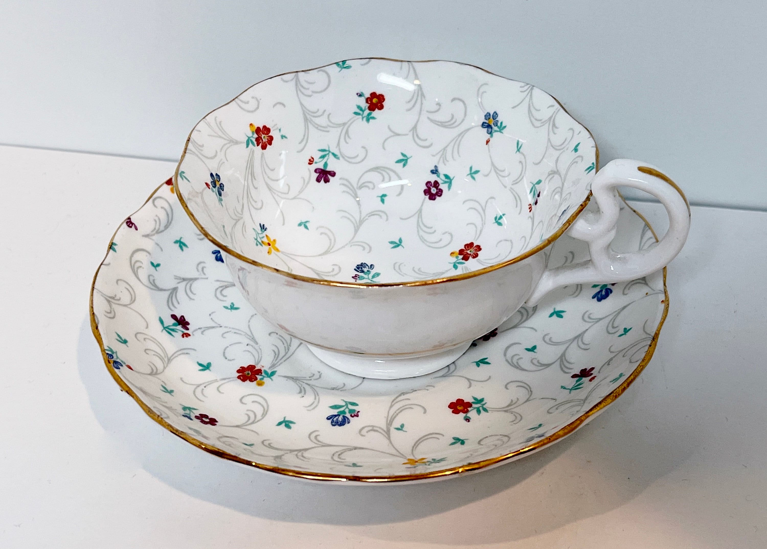 Radfords Bone China of England used one of their antique designs to create an elegant teacup and saucer. The backstamp was first introduced in 1928. This bone china pings with high tones and a wispy air. The little blossoms are painted by hand. One appreciates the subtle flowers and the softly scalloped rim and saucer. The handle is typical of the Victorian era.