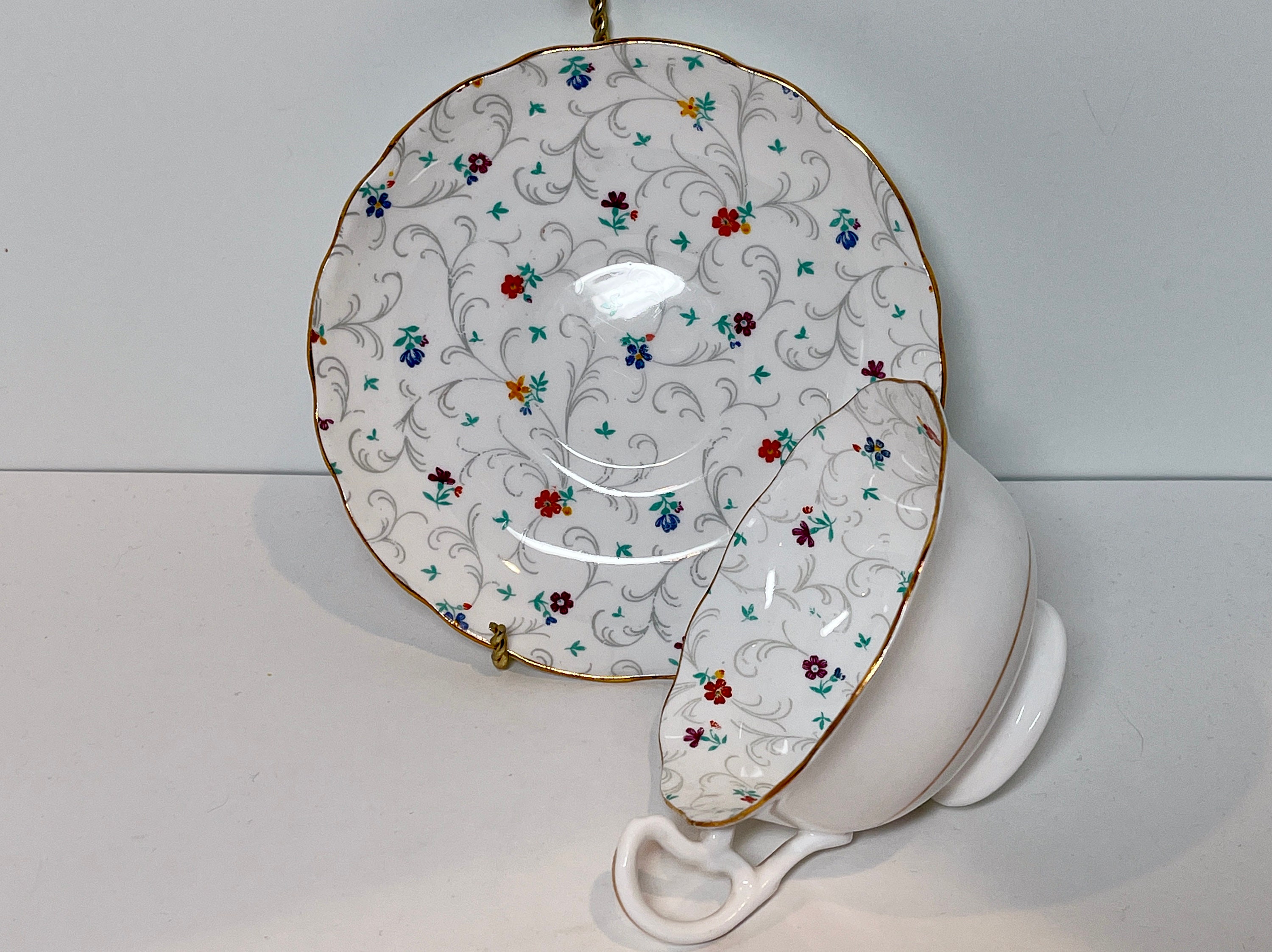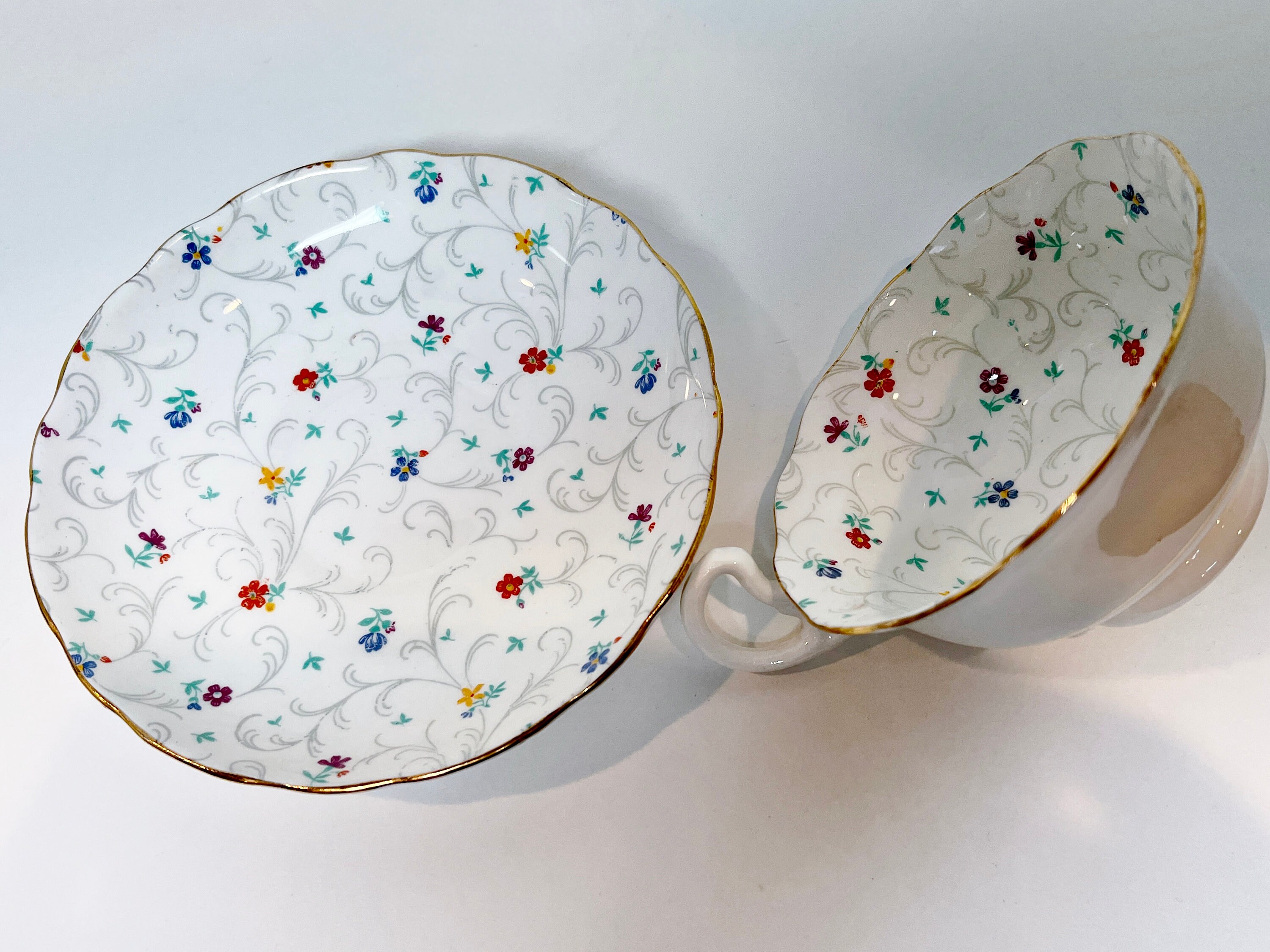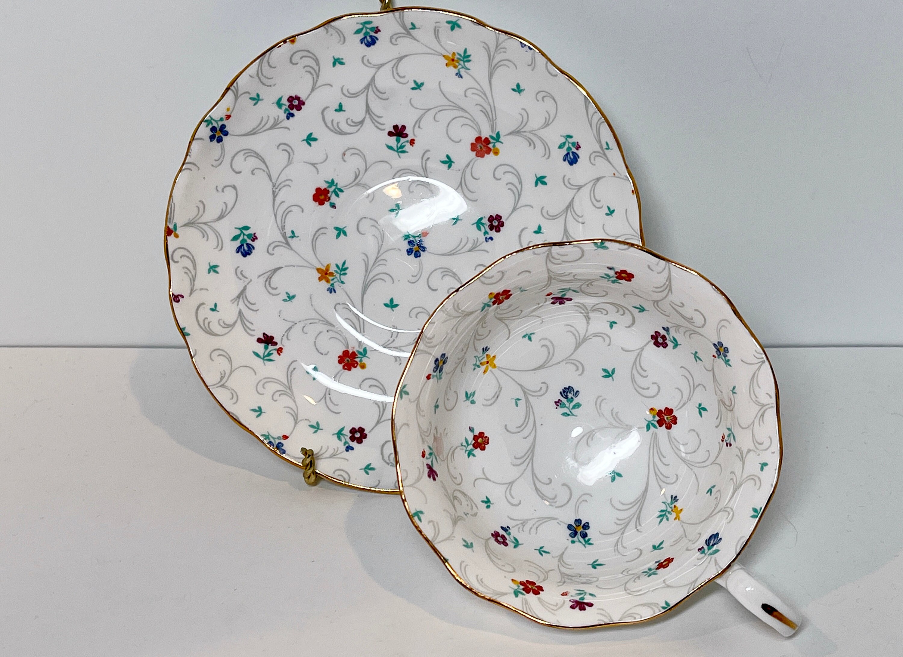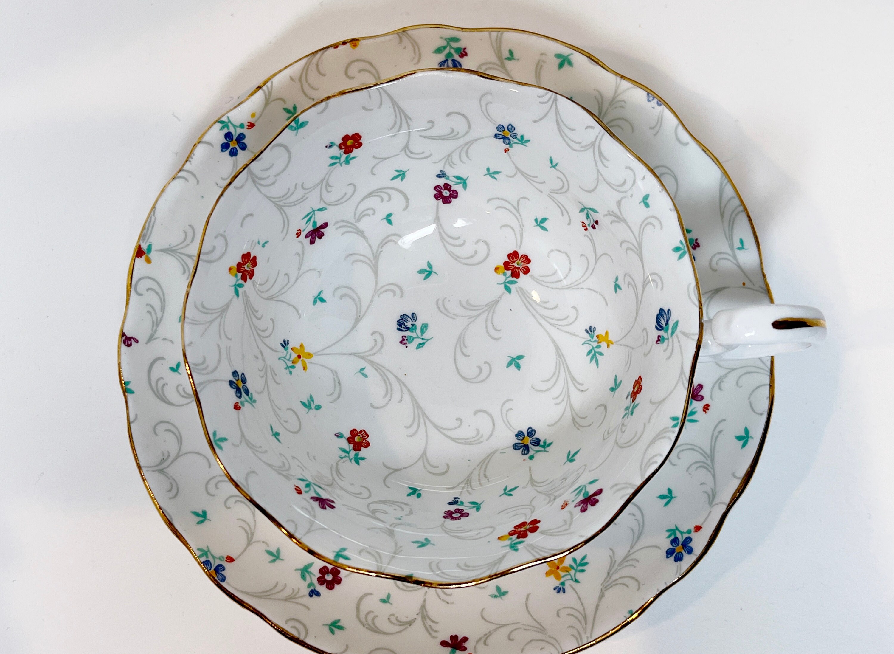 Radfords Bone China of England used one of their antique designs to create an elegant teacup and saucer. The backstamp was first introduced in 1928. This bone china pings with high tones and a wispy air. The little blossoms are painted by hand. One appreciates the subtle flowers and the softly scalloped rim and saucer. The handle is typical of the Victorian era.