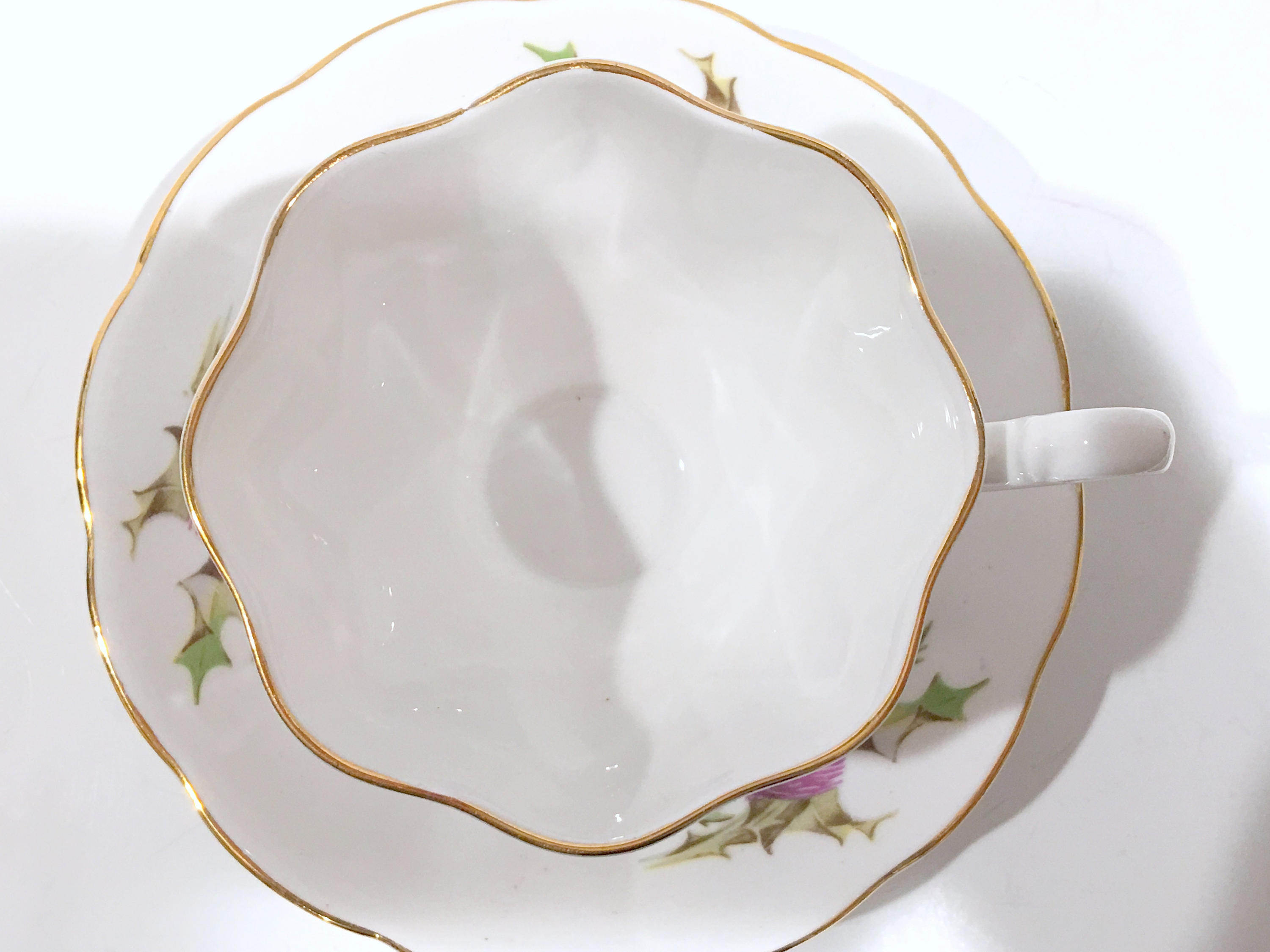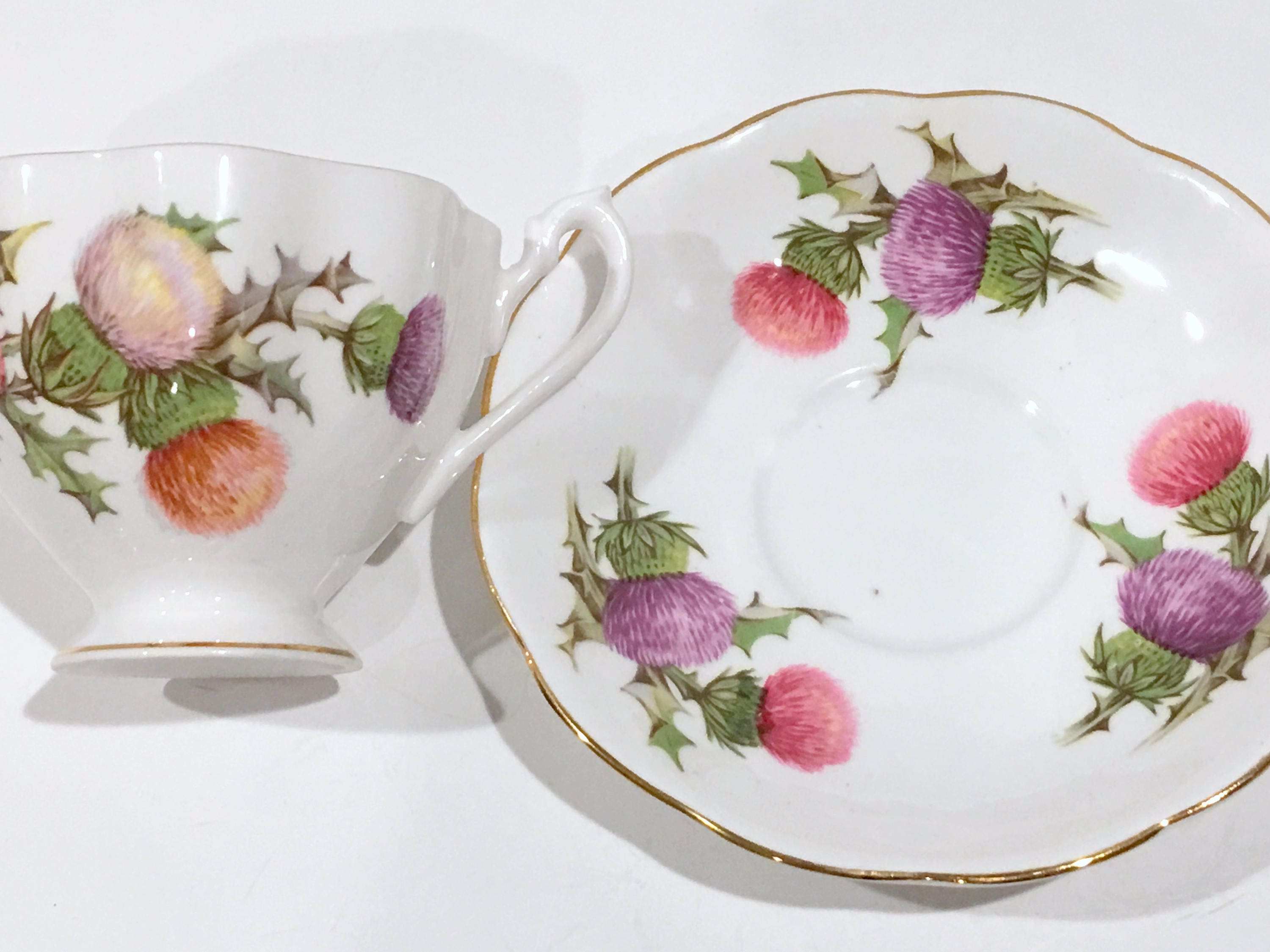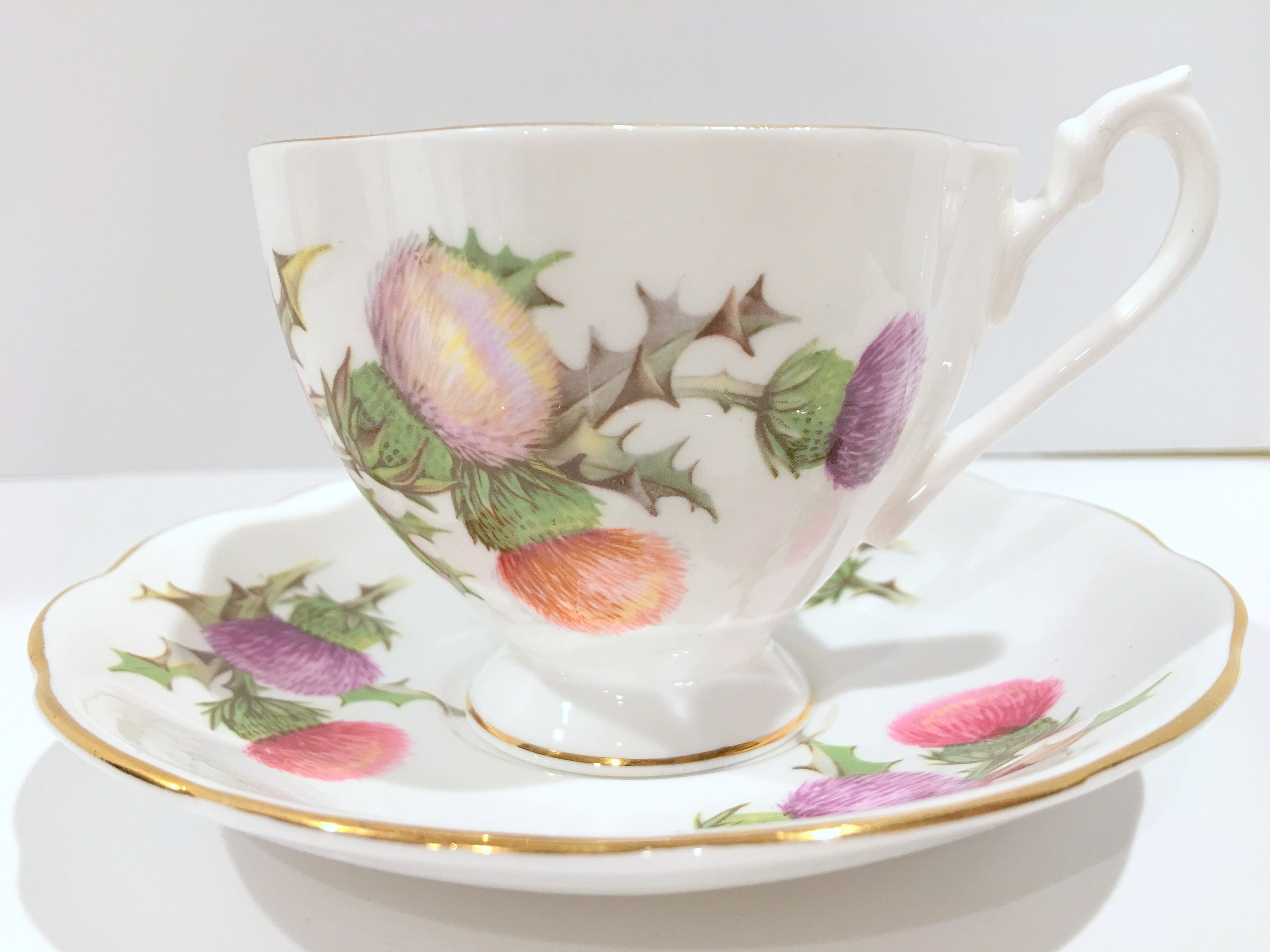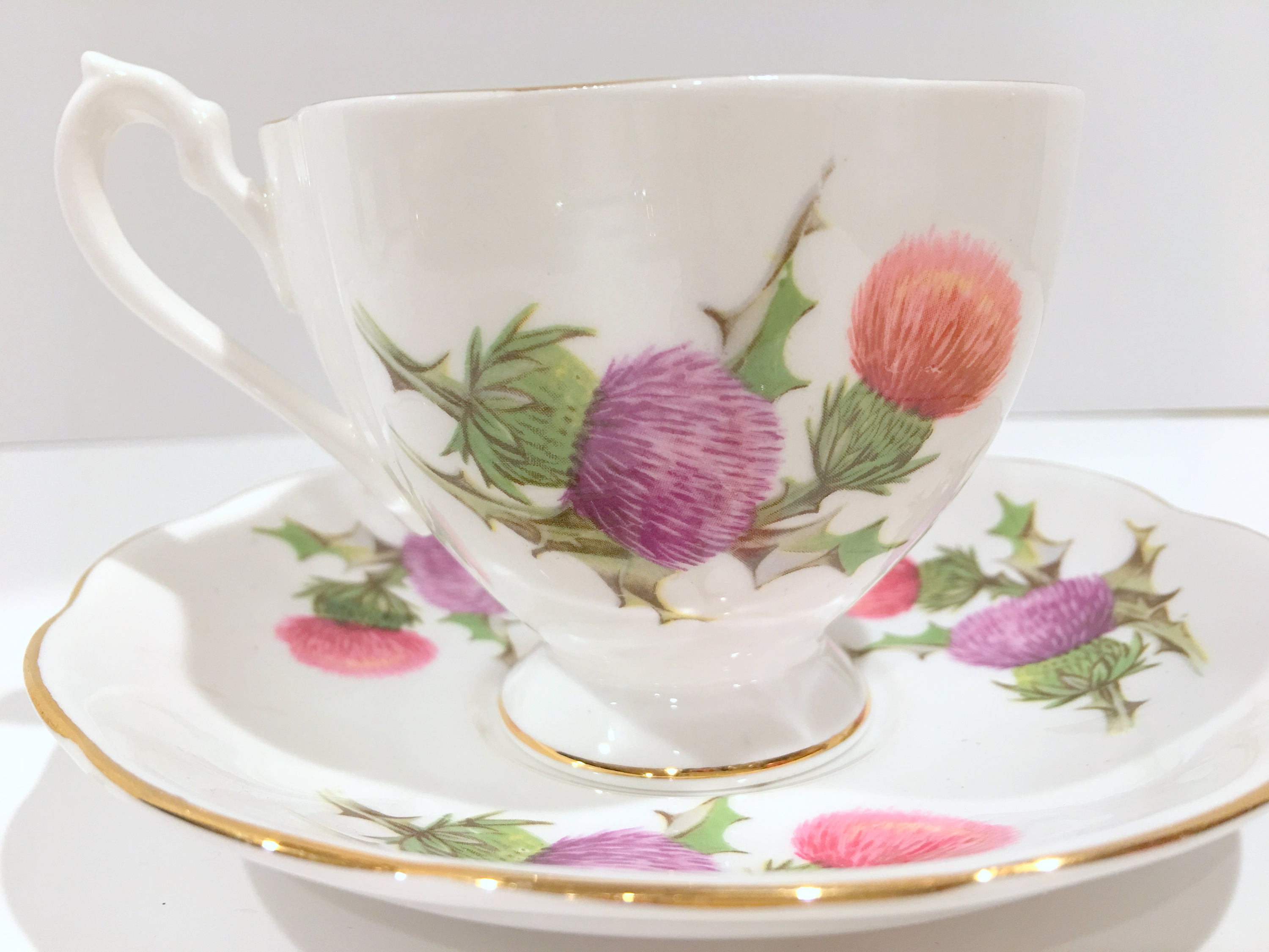 Think of the rolling hills of lavender haze filled with thistle. The highlands have inspired this luscious teacup and saucer by Queen Anne.