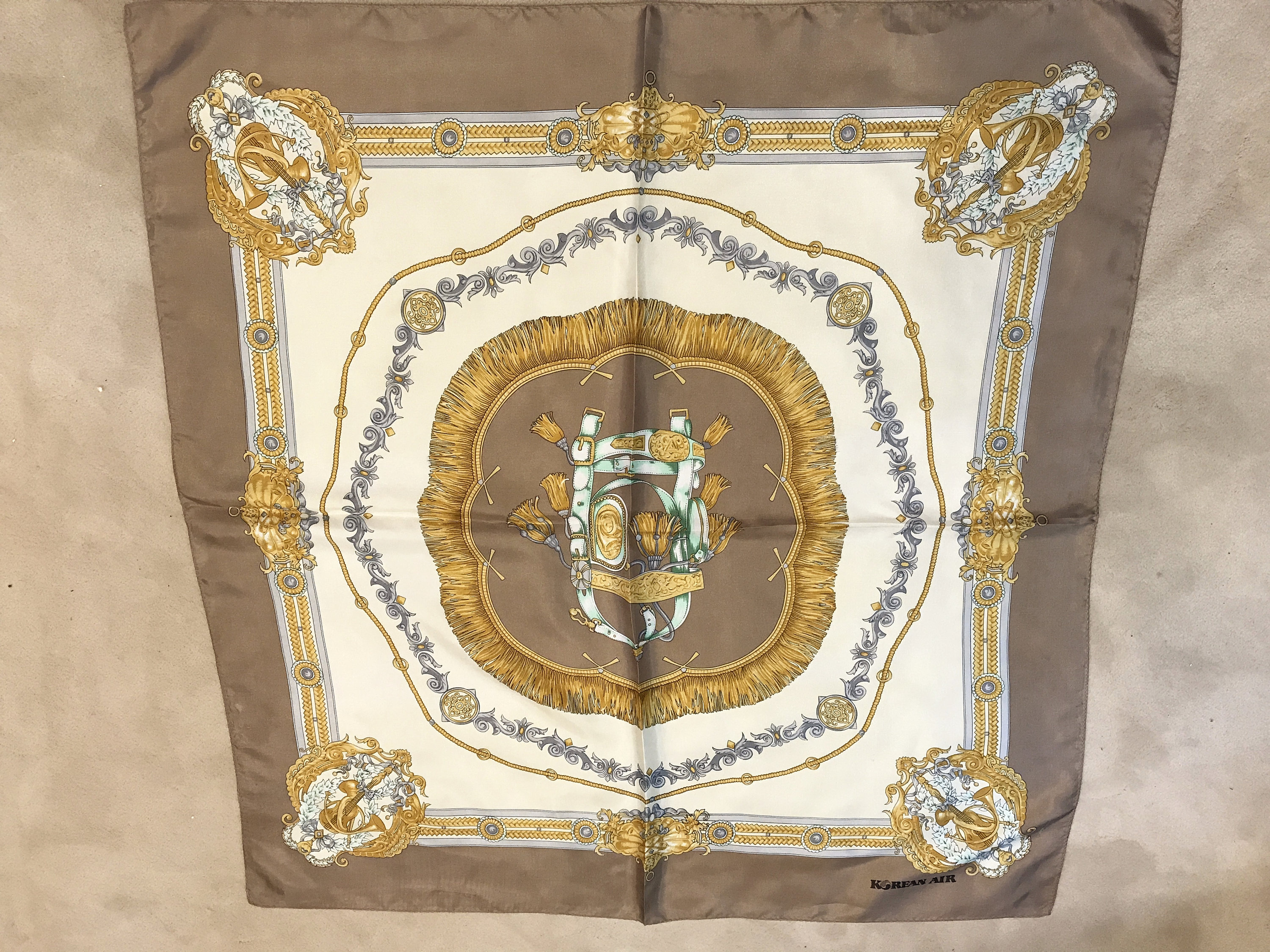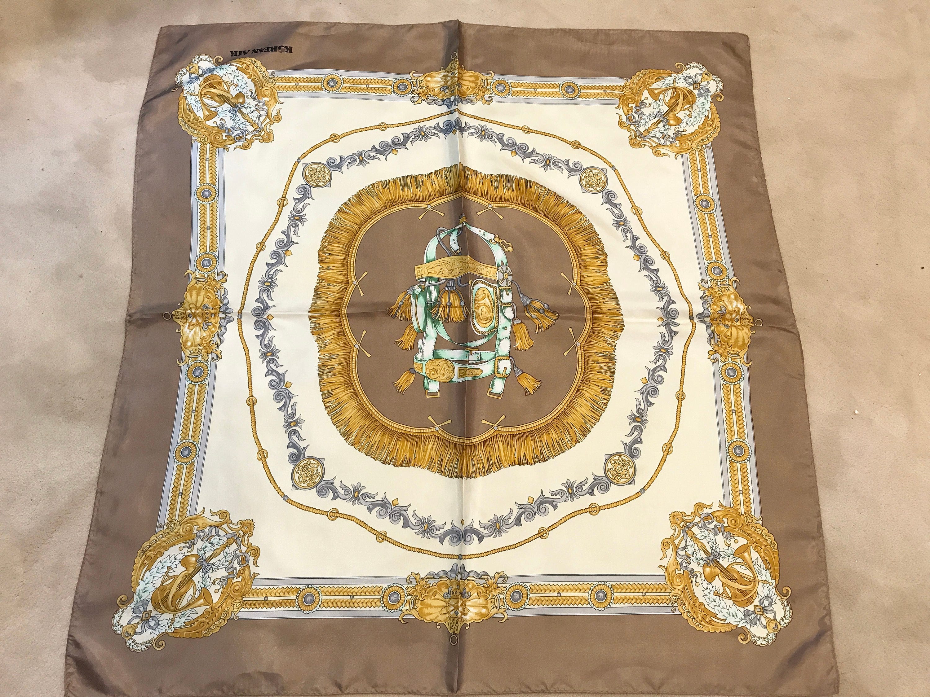 Languish in luxury and elegance using this tasteful designer scarf from Korean Air. This is a scarf that the flight attendants, then called Stewardesses, used to wear with their uniform.