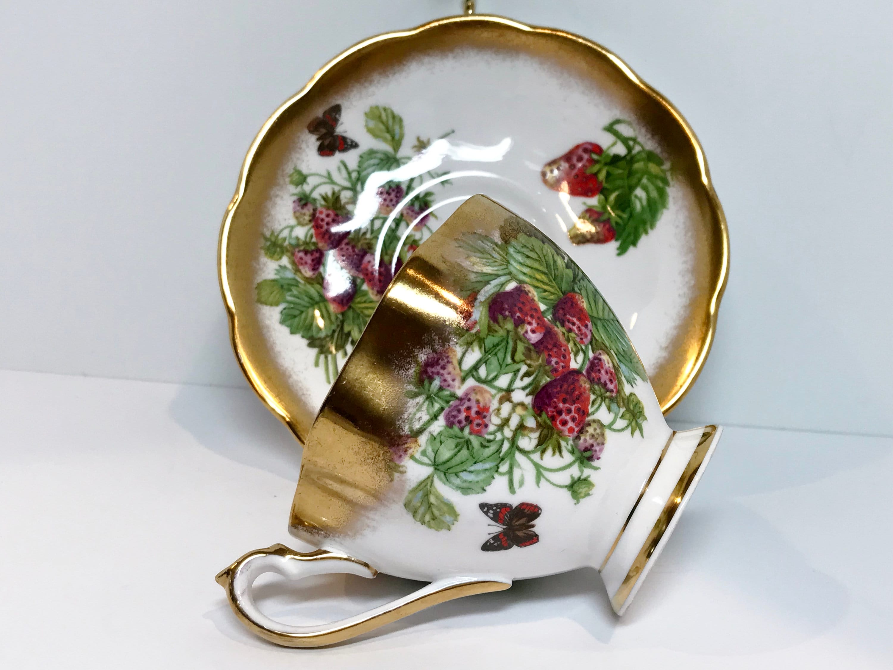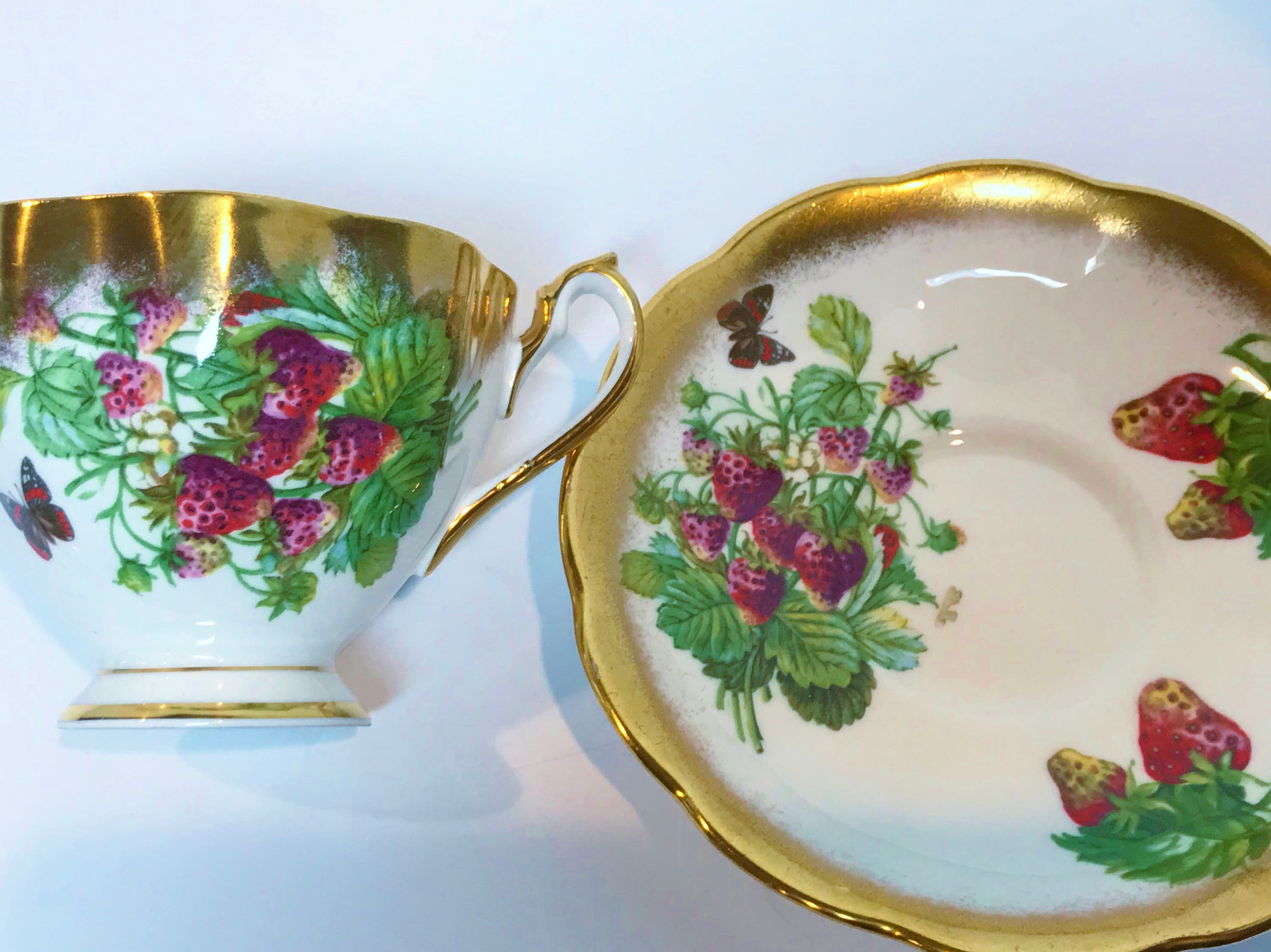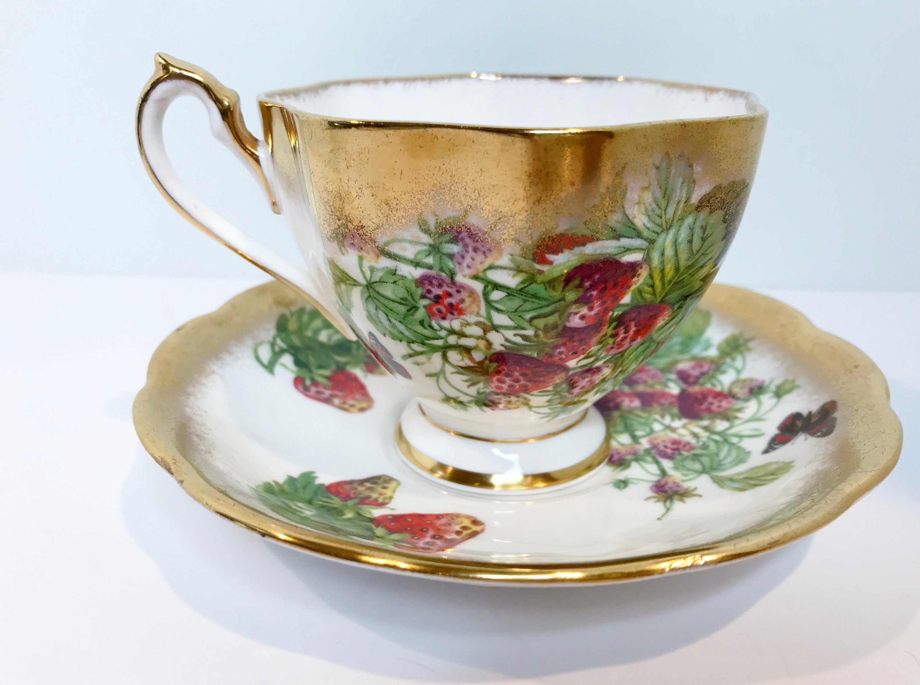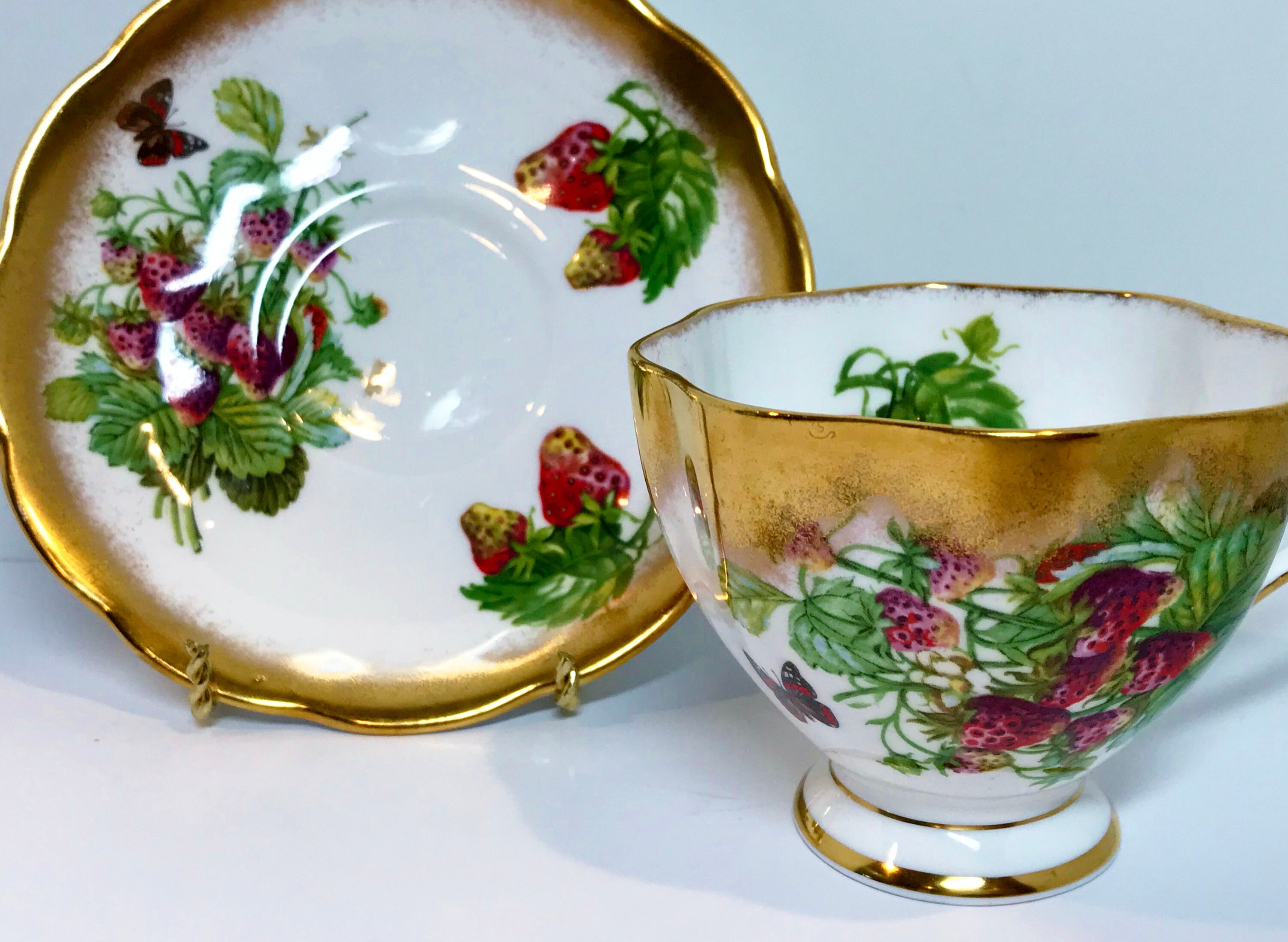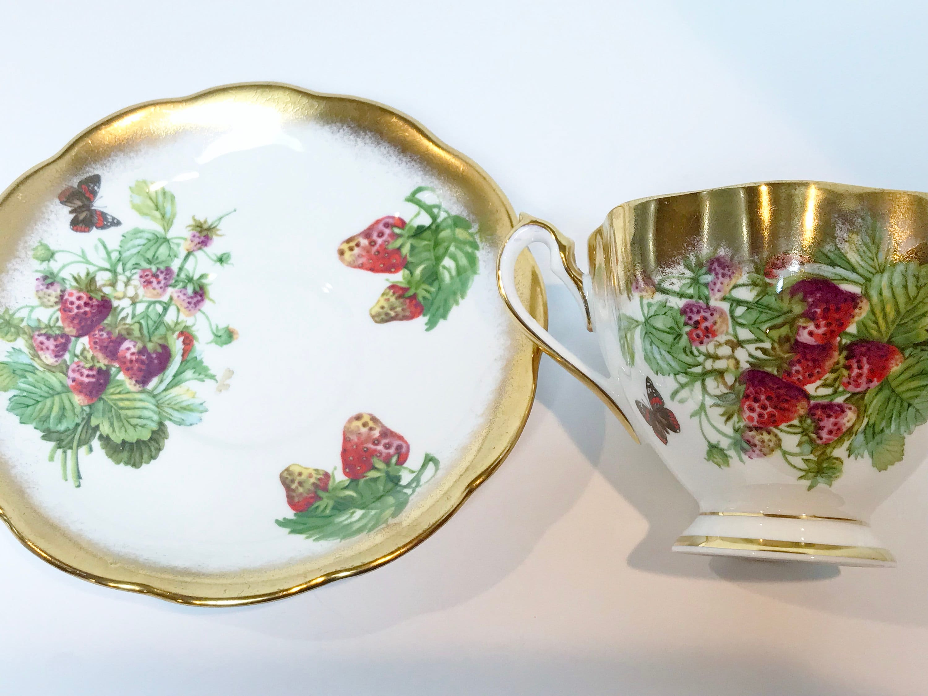 The gorgeous vines of a summer day have inspired this luscious teacup and saucer by Queen Anne. Notice the butterfly on the cup and another on the saucer as it glides among the sweet strawberries.