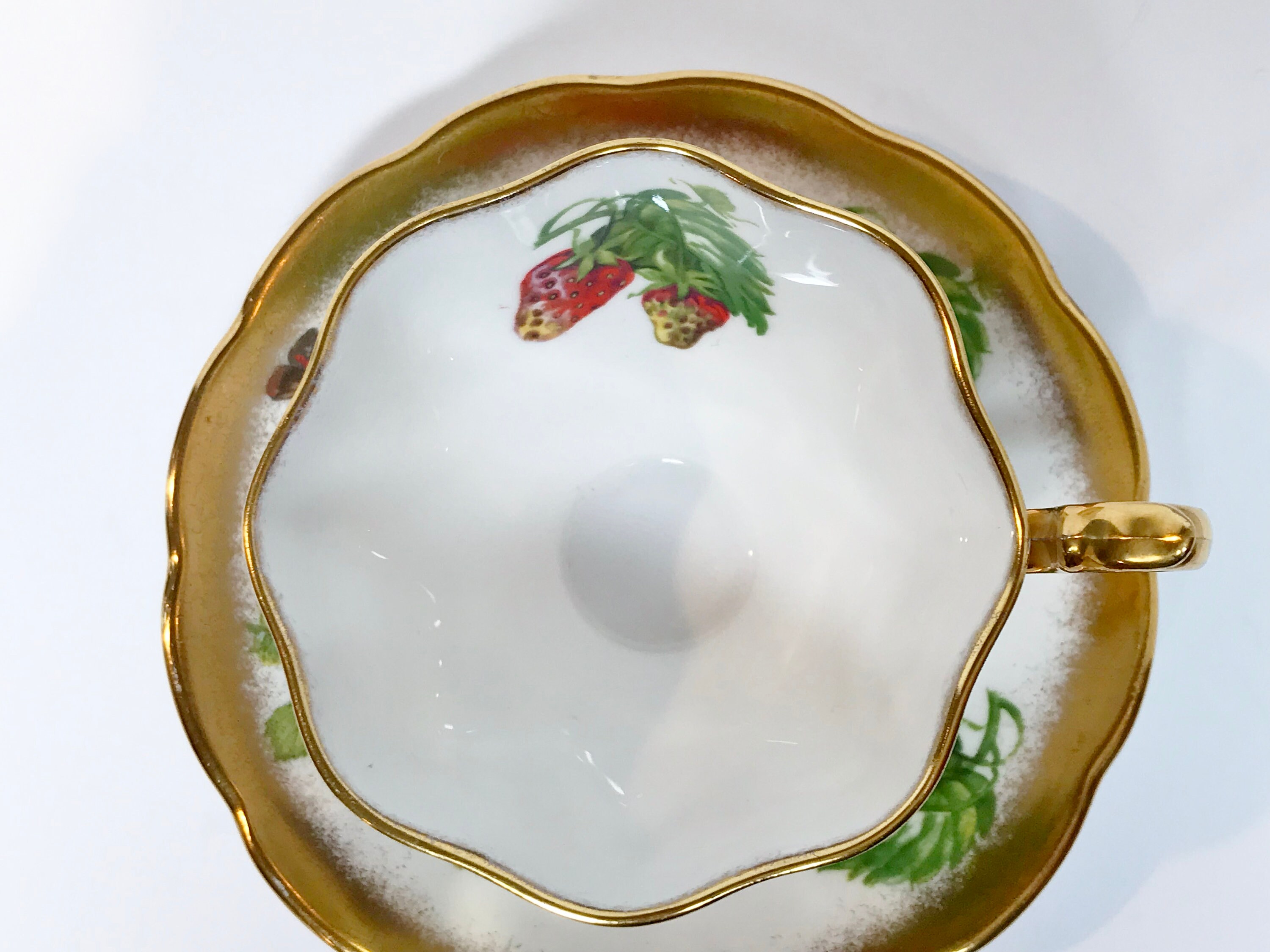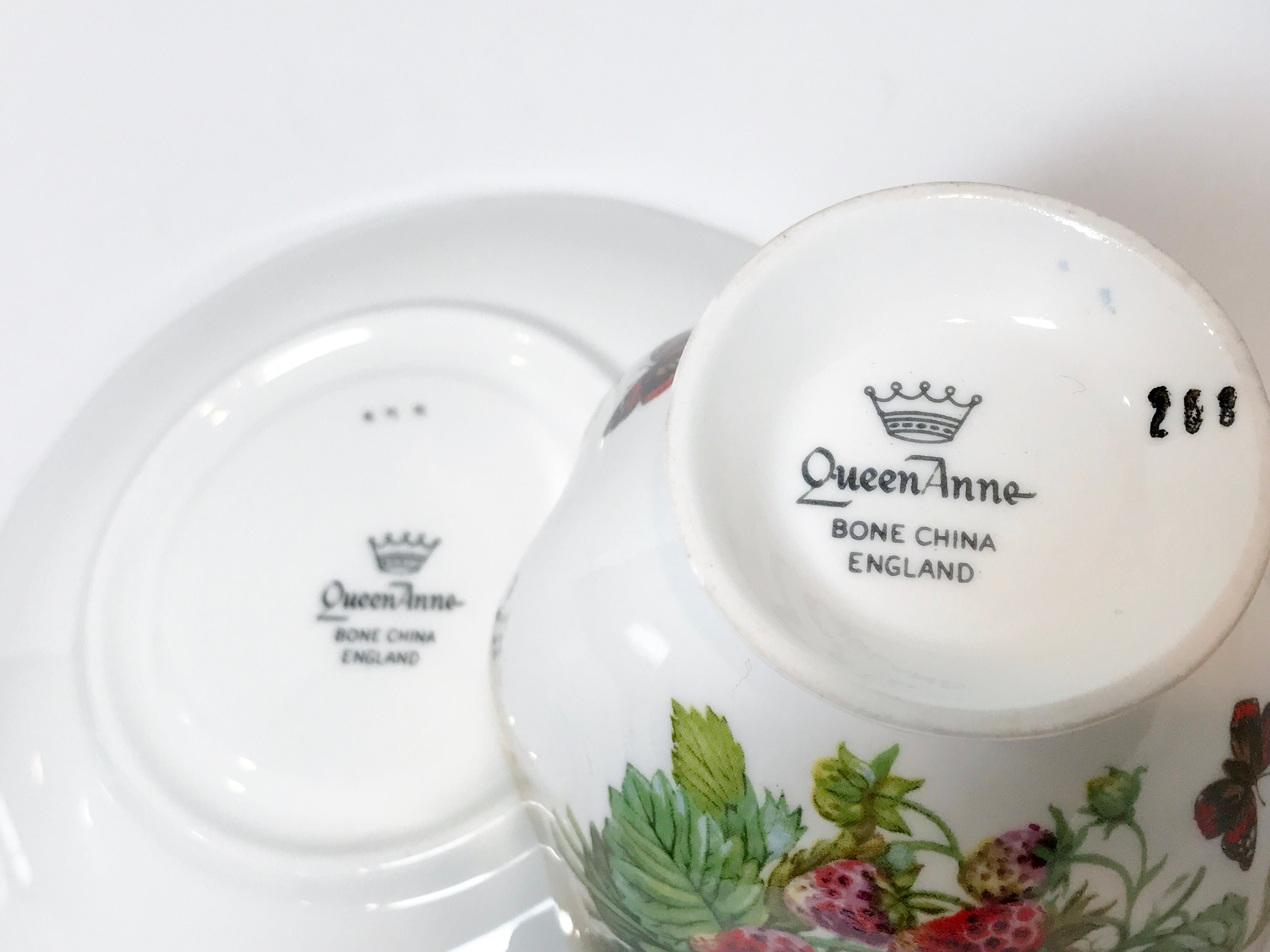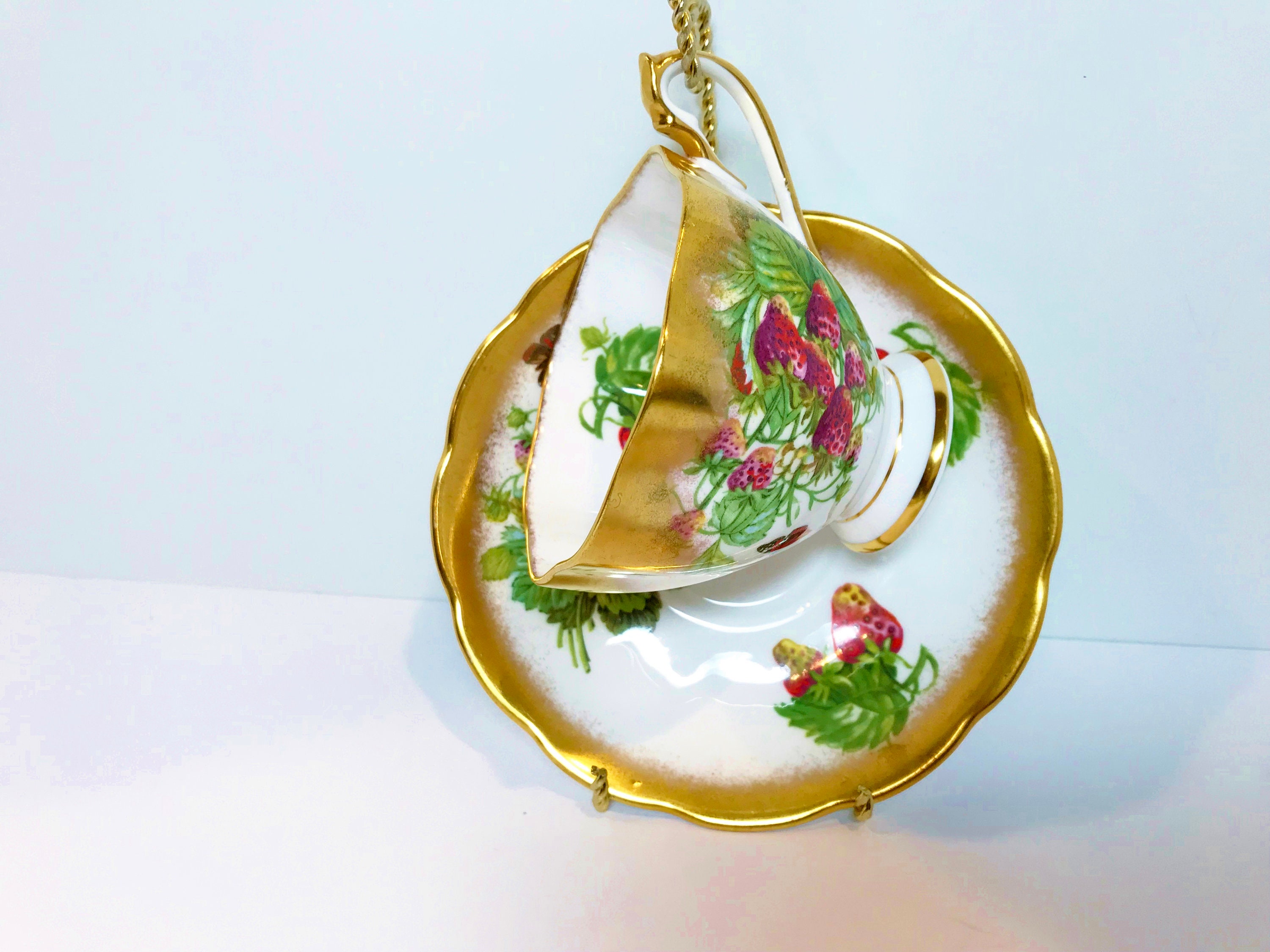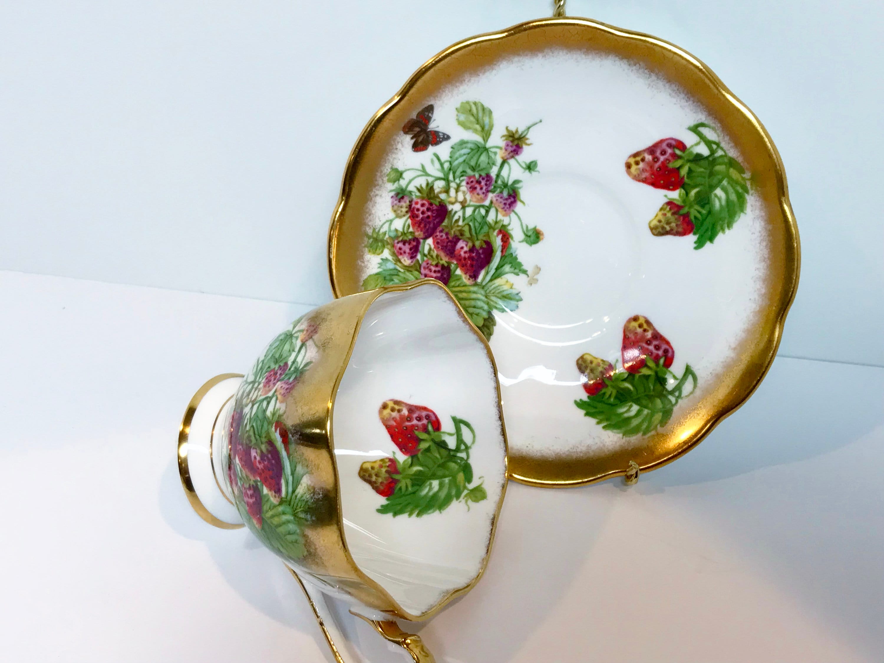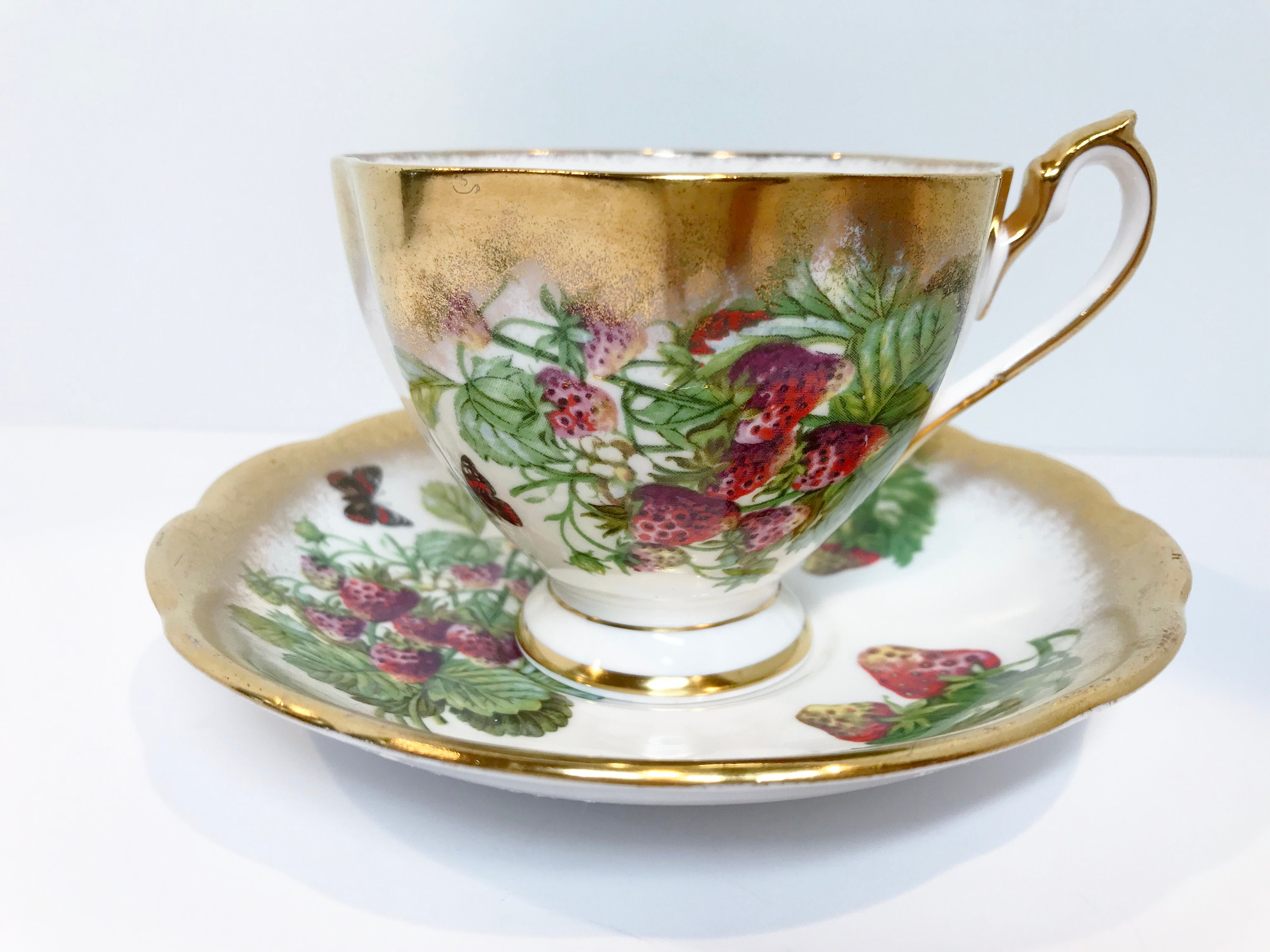 The gorgeous vines of a summer day have inspired this luscious teacup and saucer by Queen Anne. Notice the butterfly on the cup and another on the saucer as it glides among the sweet strawberries.