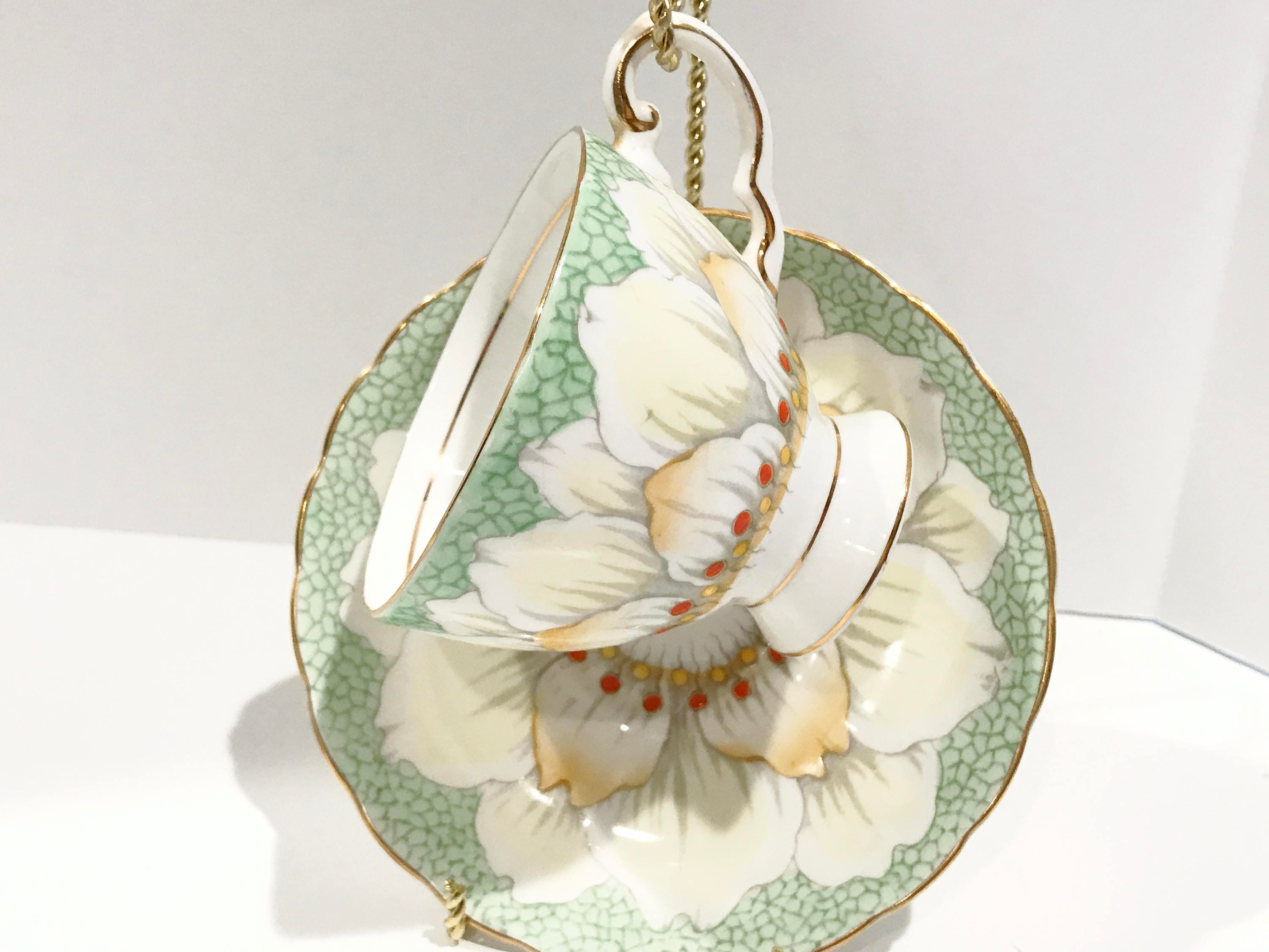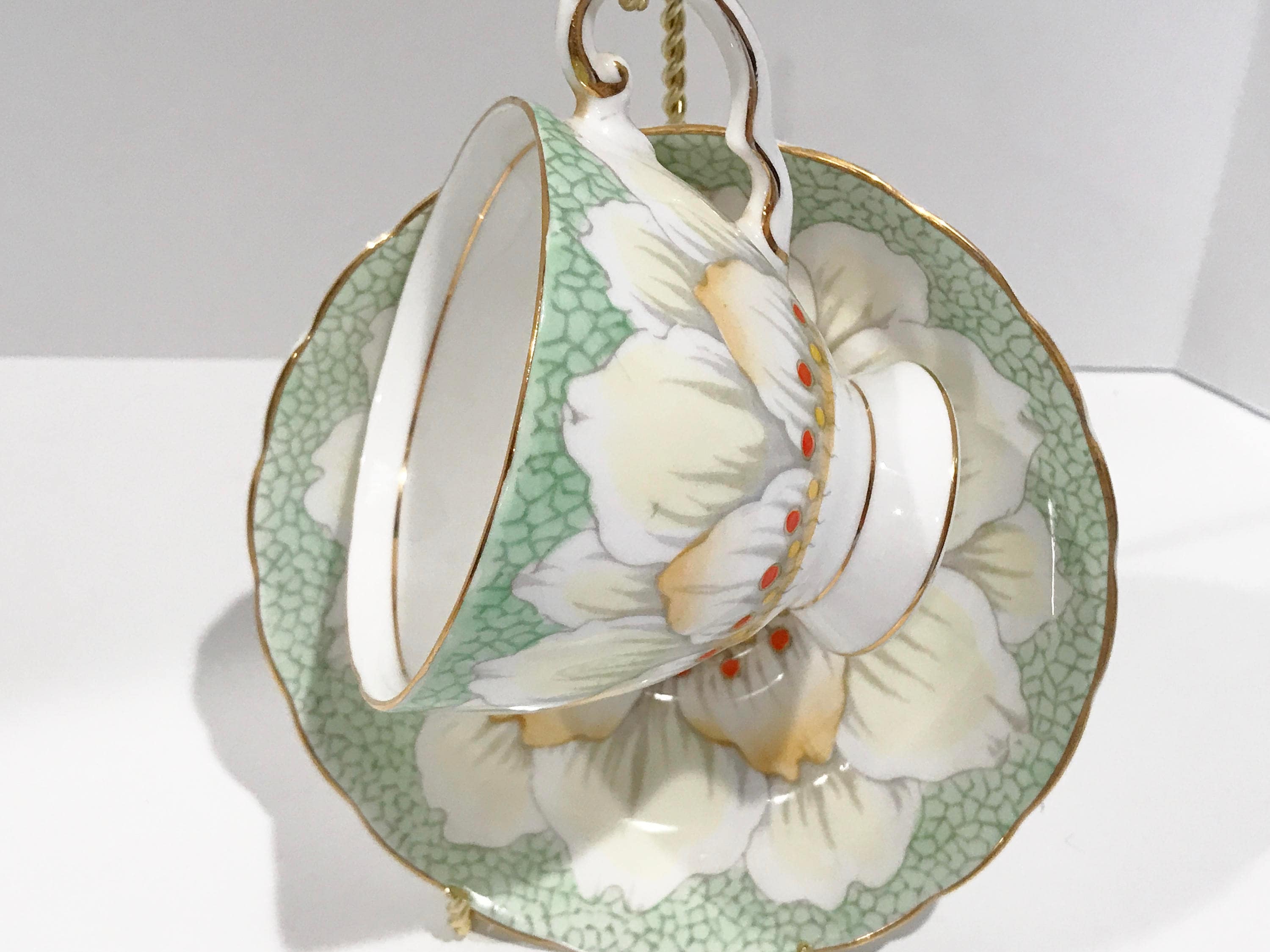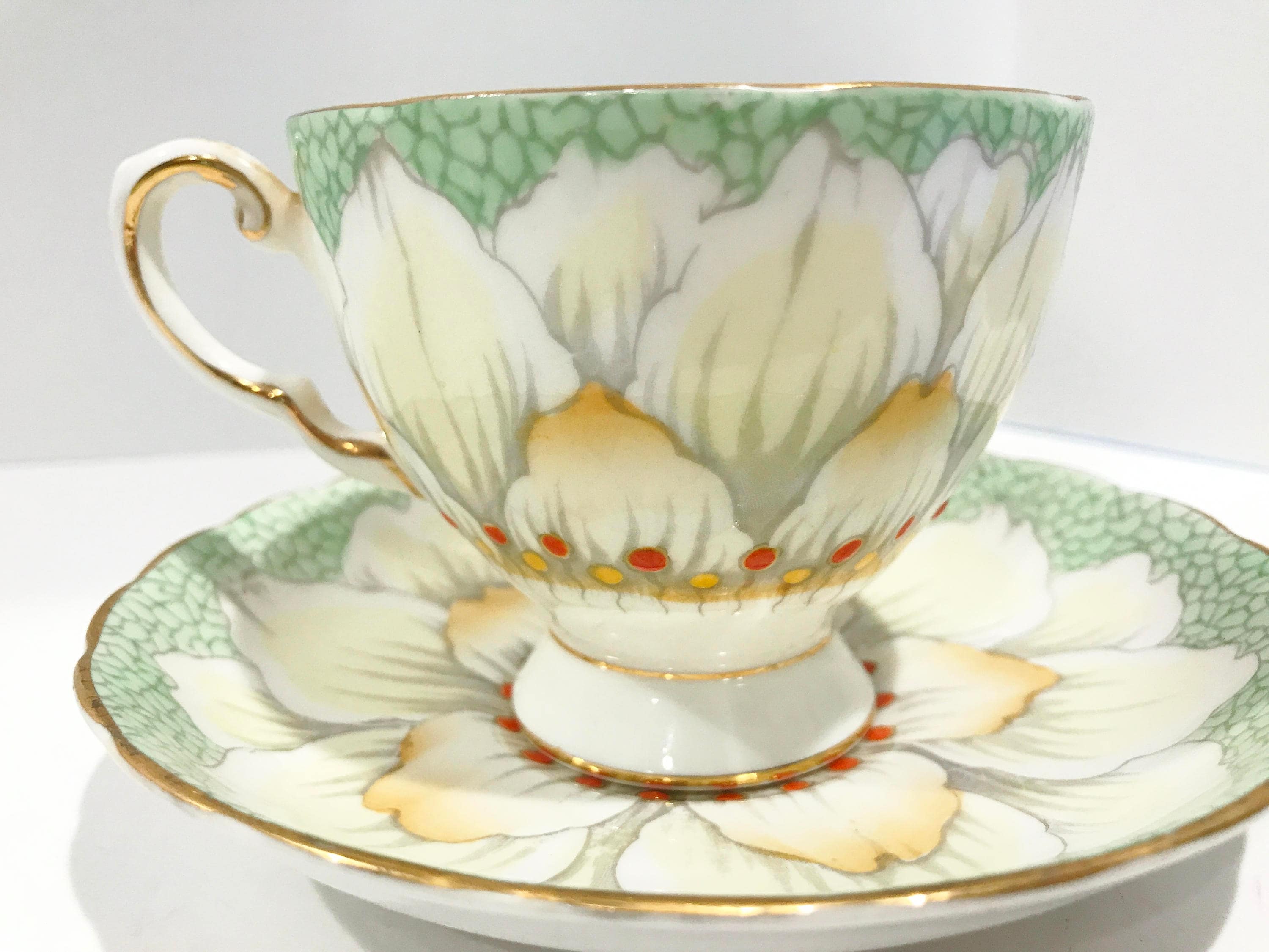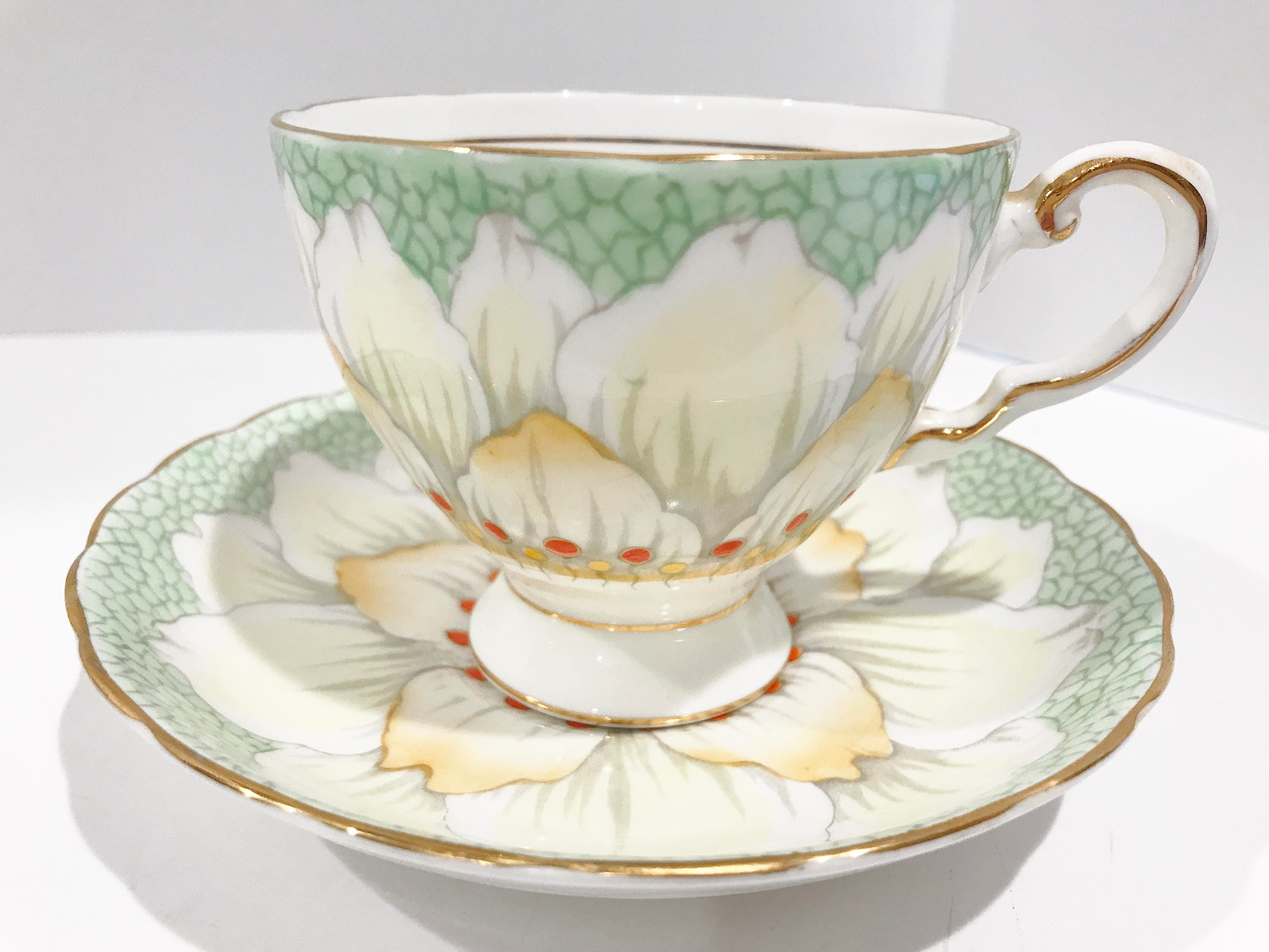 Gorgeous petals and golden highlights glisten on this hand painted teacup and saucer by Tuscan Bone China of England. The pattern number is C9861.