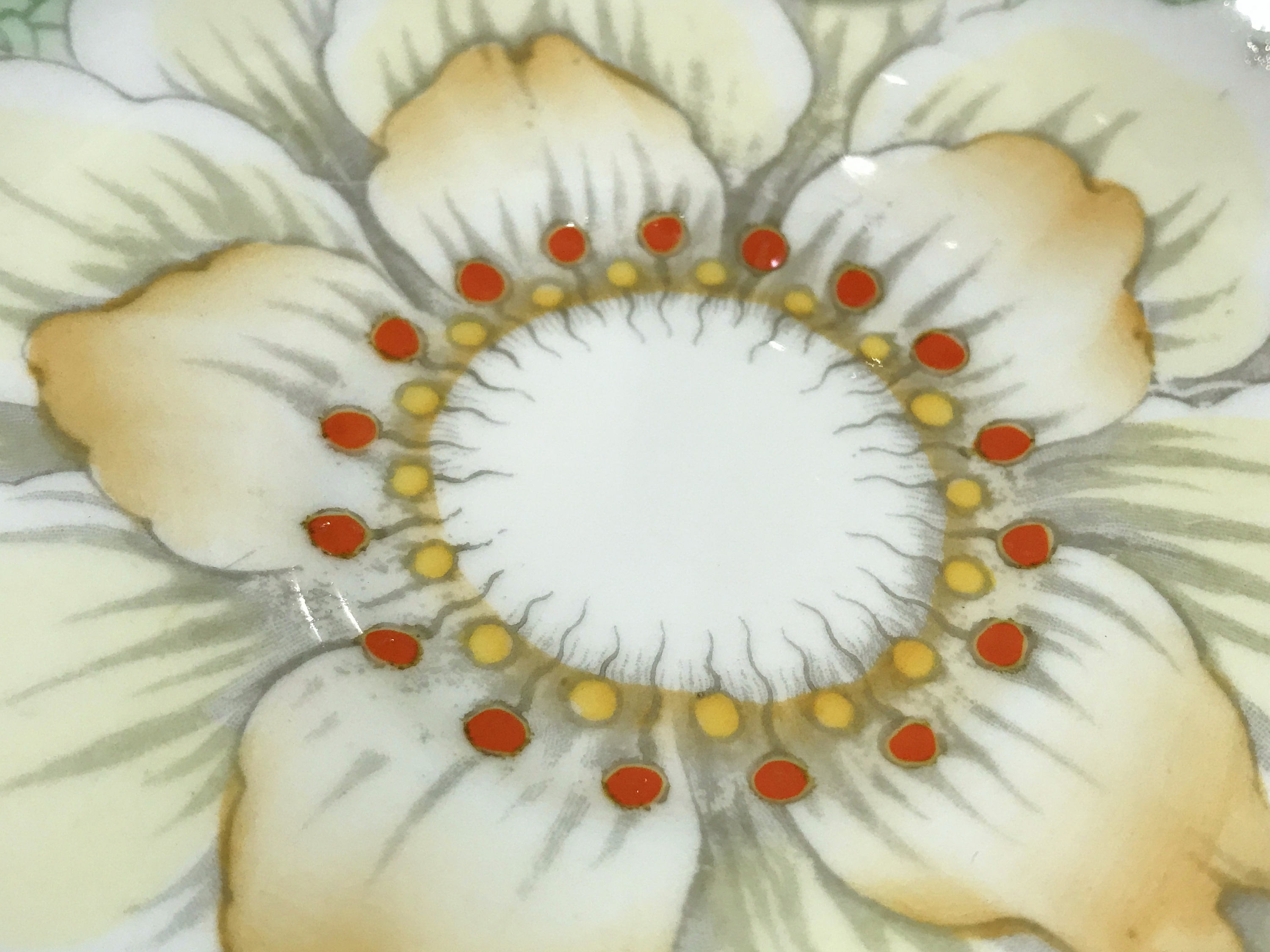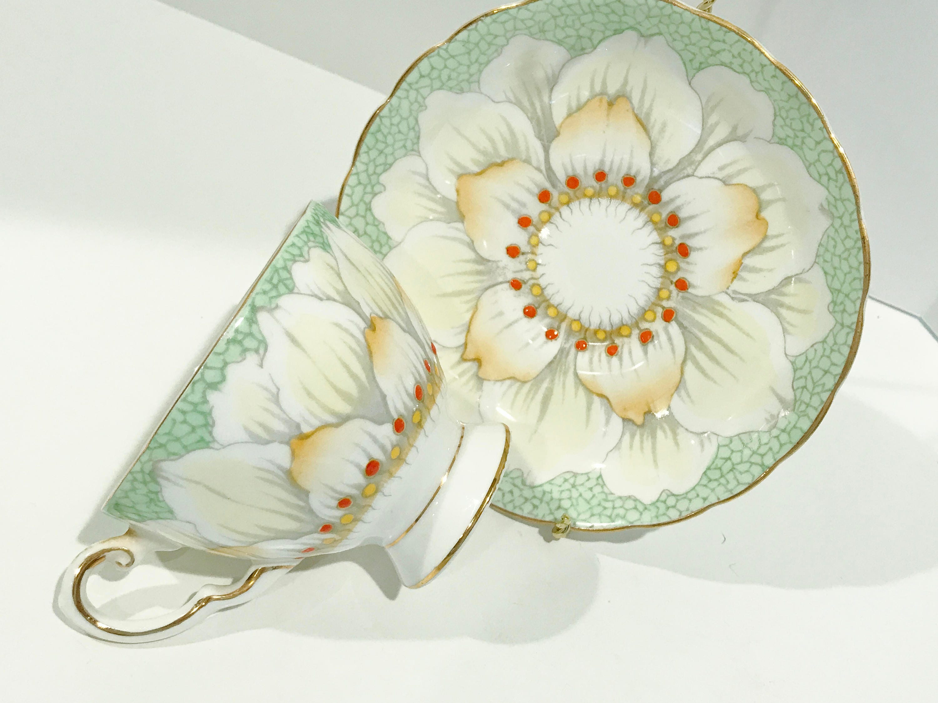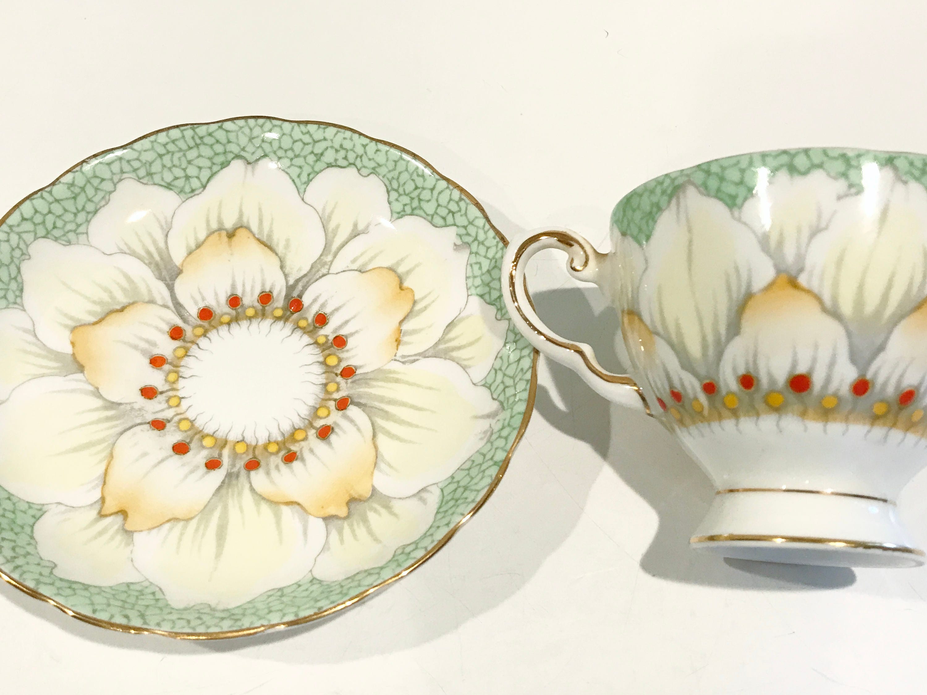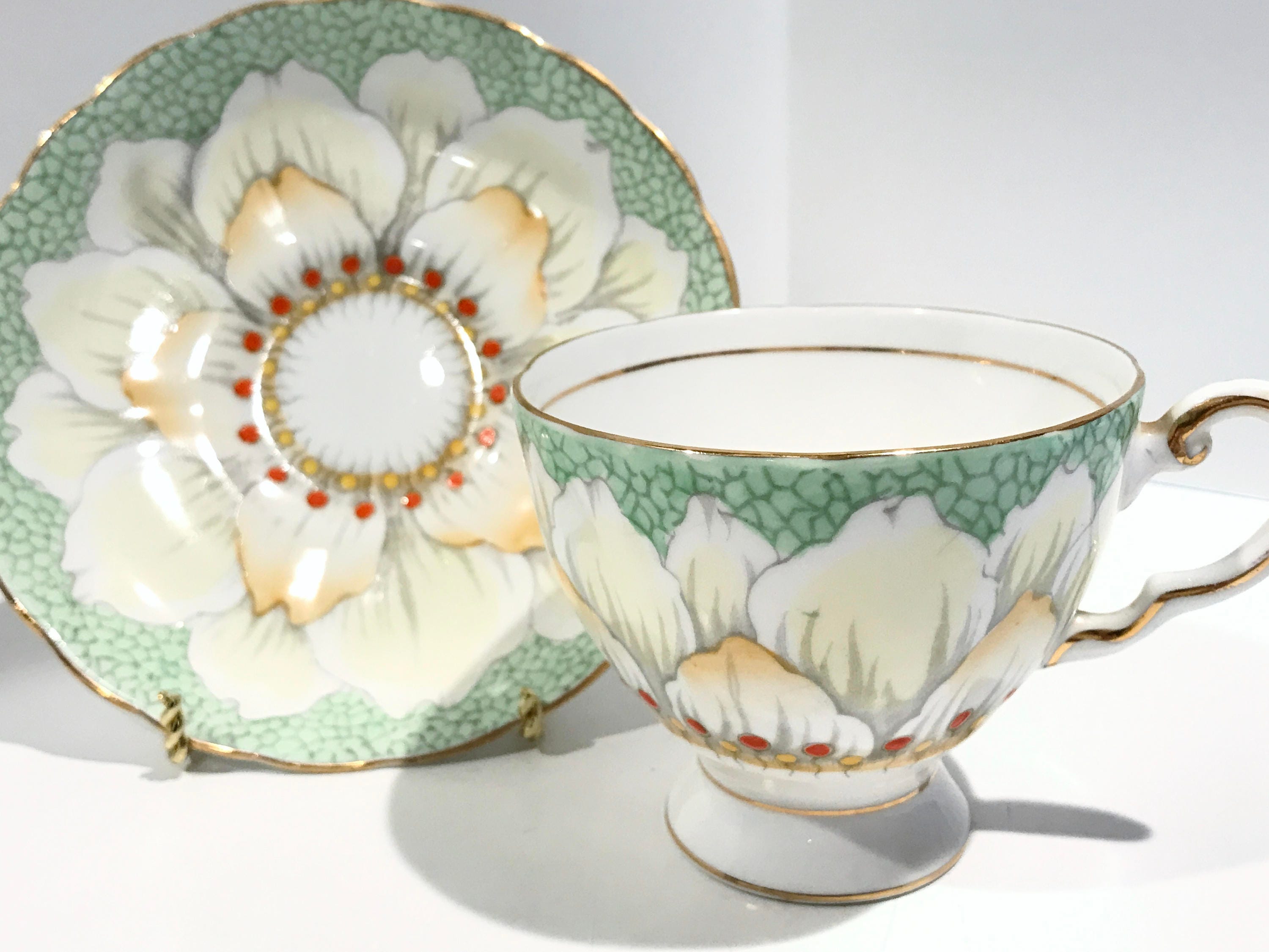 Gorgeous petals and golden highlights glisten on this hand painted teacup and saucer by Tuscan Bone China of England. The pattern number is C9861.
