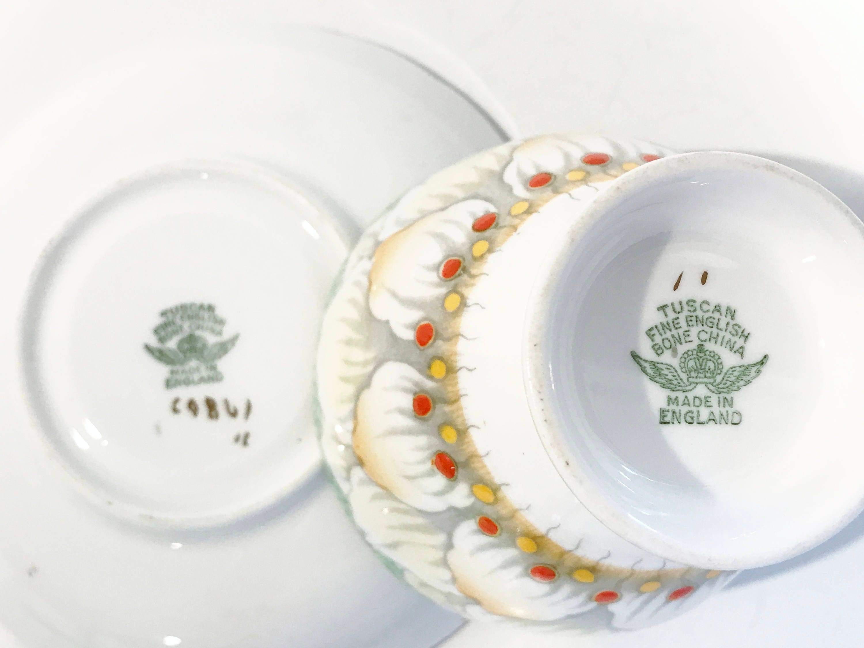 Tuscan was a brand of fine English bone china produced from 1876-1967 in Staffordshire, England. The company is owned by Wedgwood as of 2014. Tuscan China is popular among collectors who appreciate its vivid colors and bold patterns, especially those that feature elaborate hand painted designs.