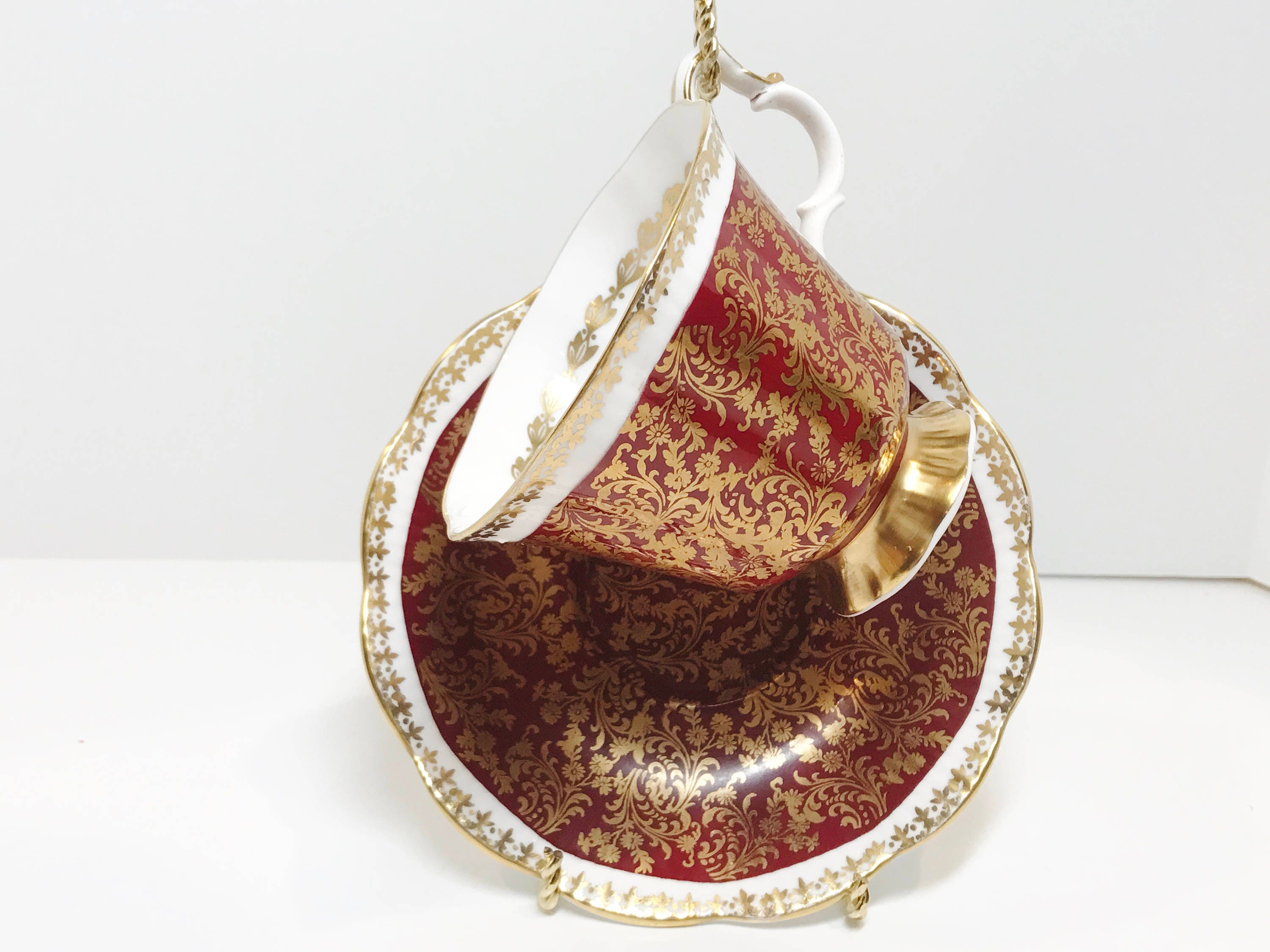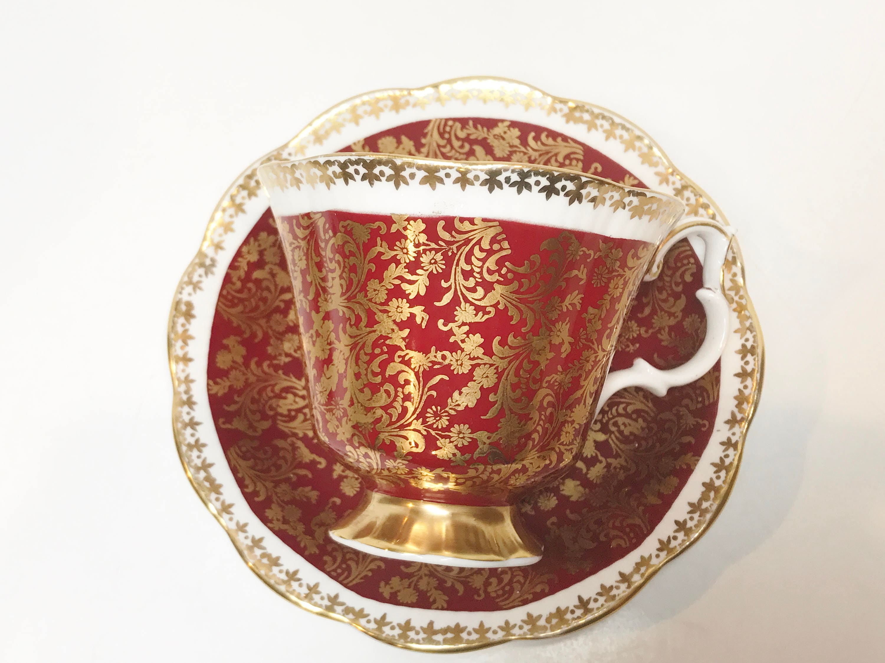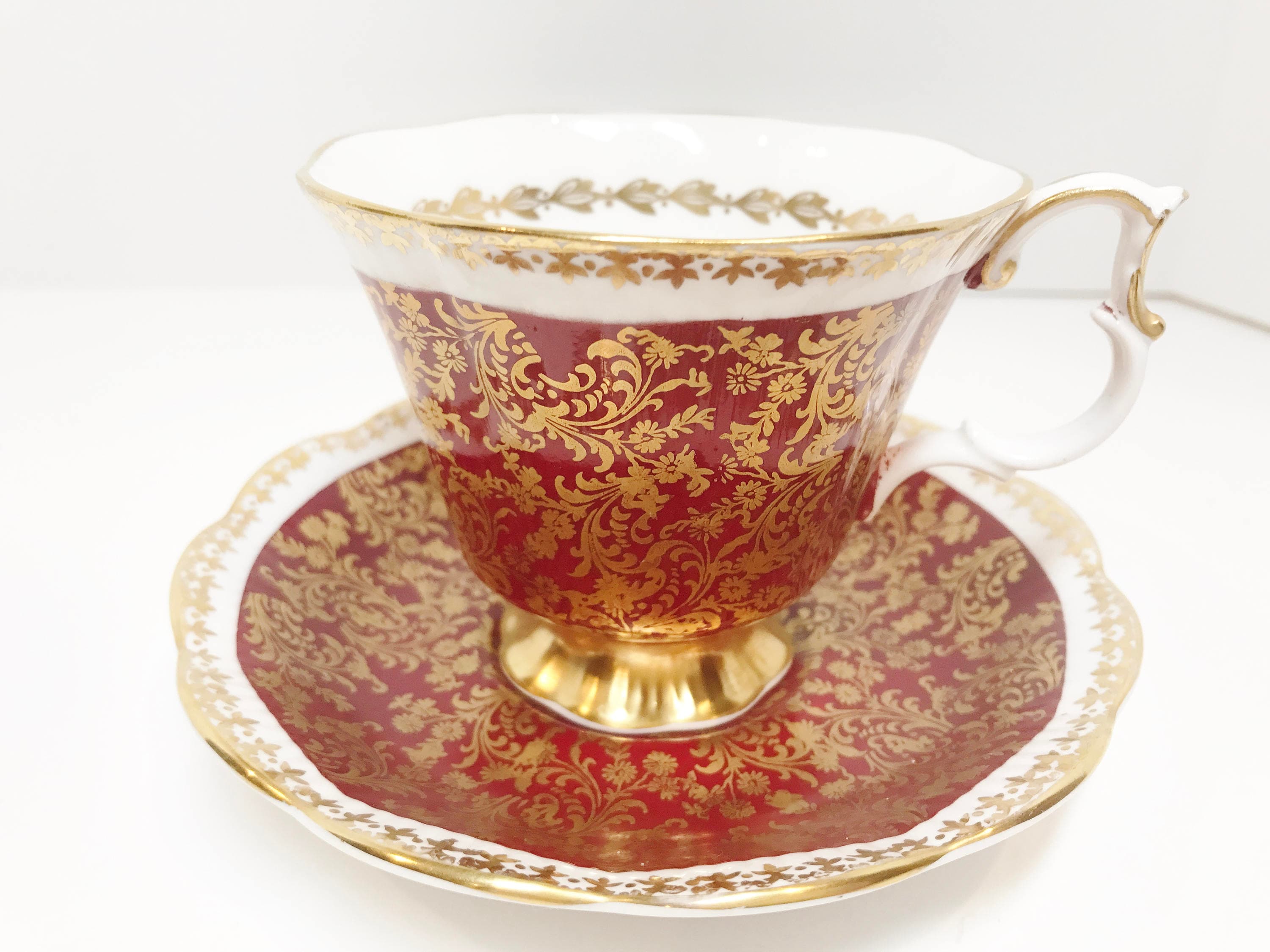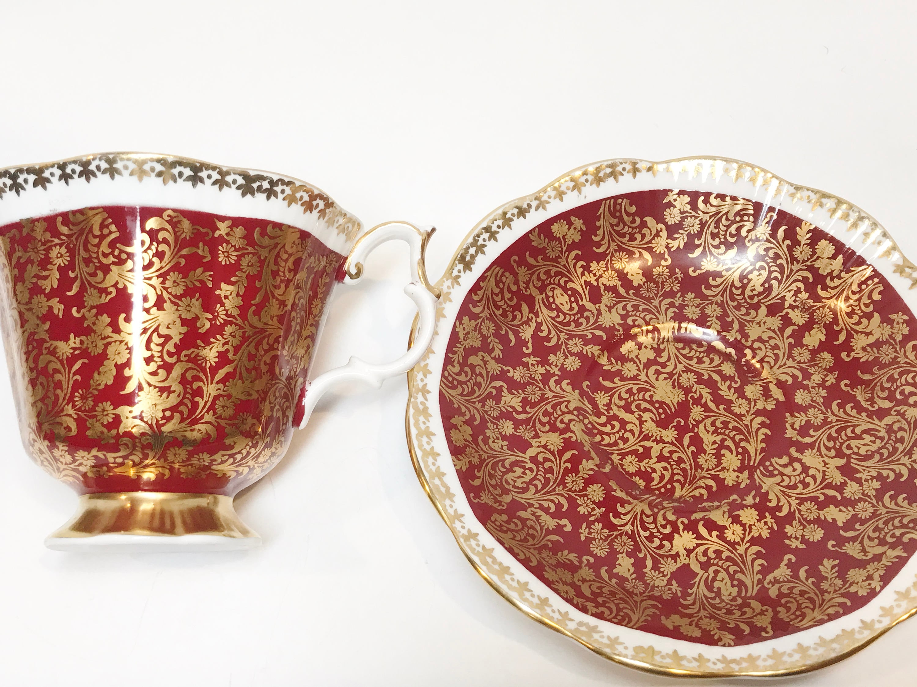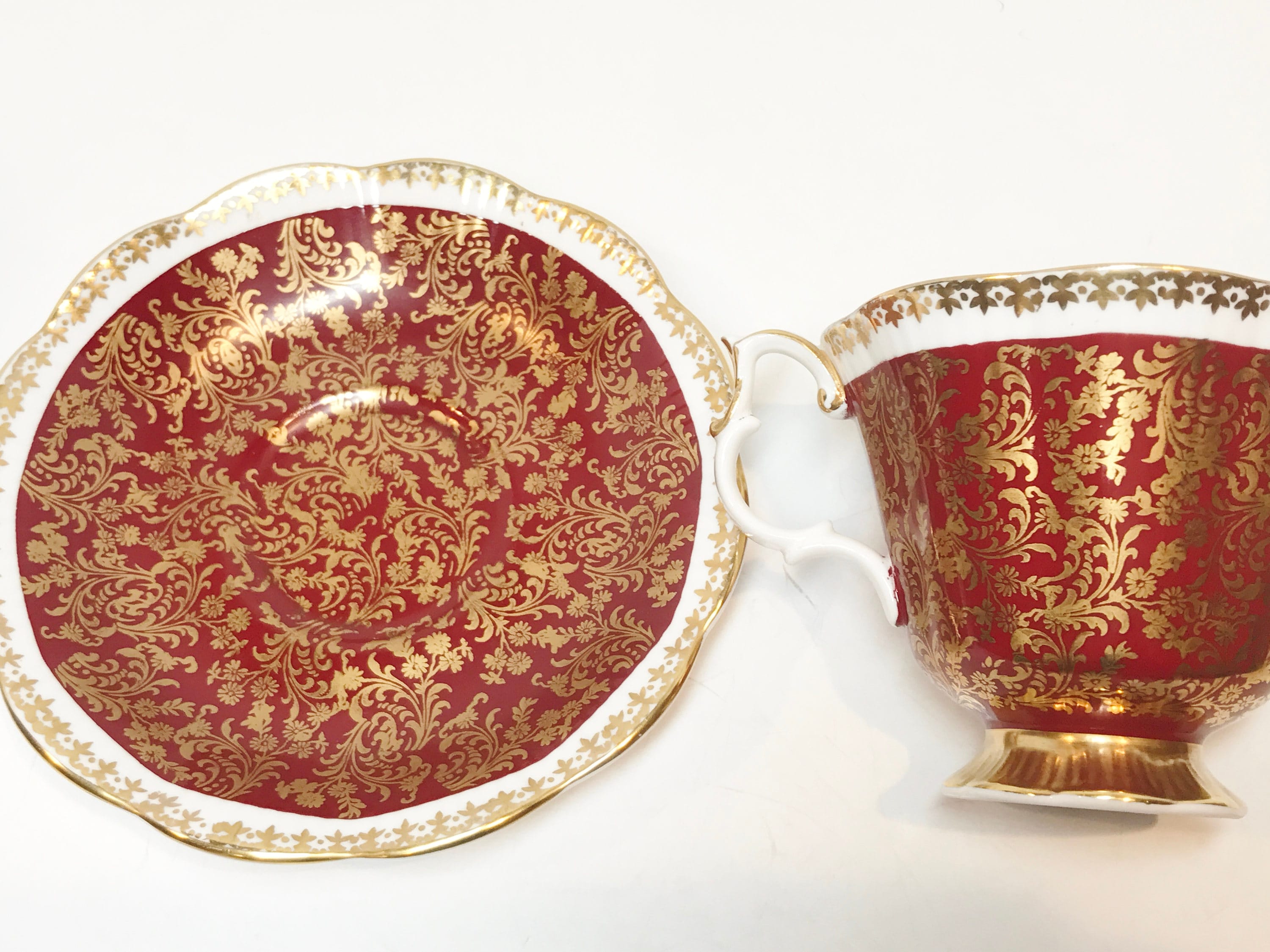 Royal Albert Bone China of England crafted this sophisticated tea cup and saucer. It is part of the Buckingham Series which was produced in the early 1970s. They offered blue, brown, green, dark green, orange, pink, turquoise and this red one. They were all created using the Gainsborough Shape.