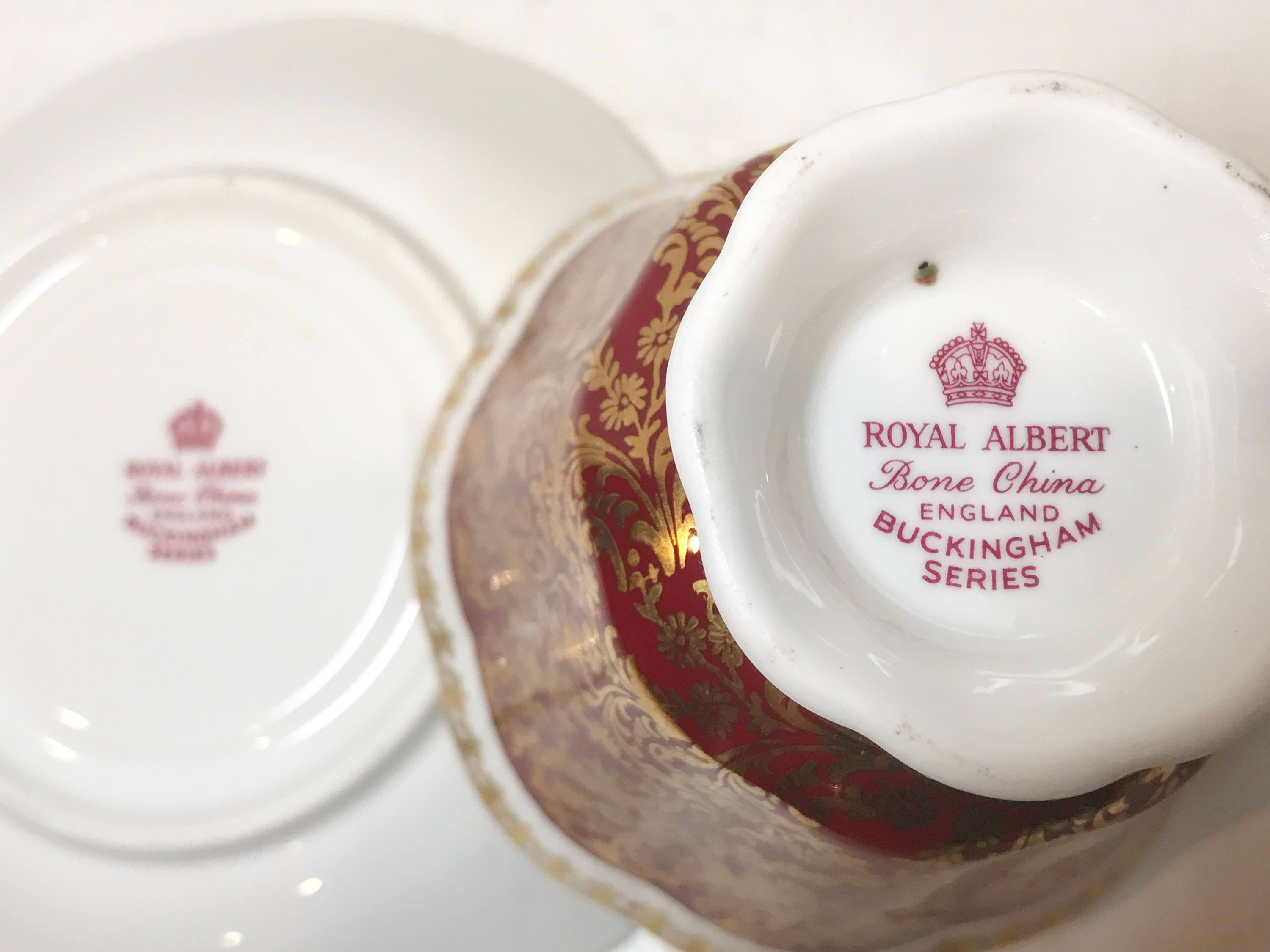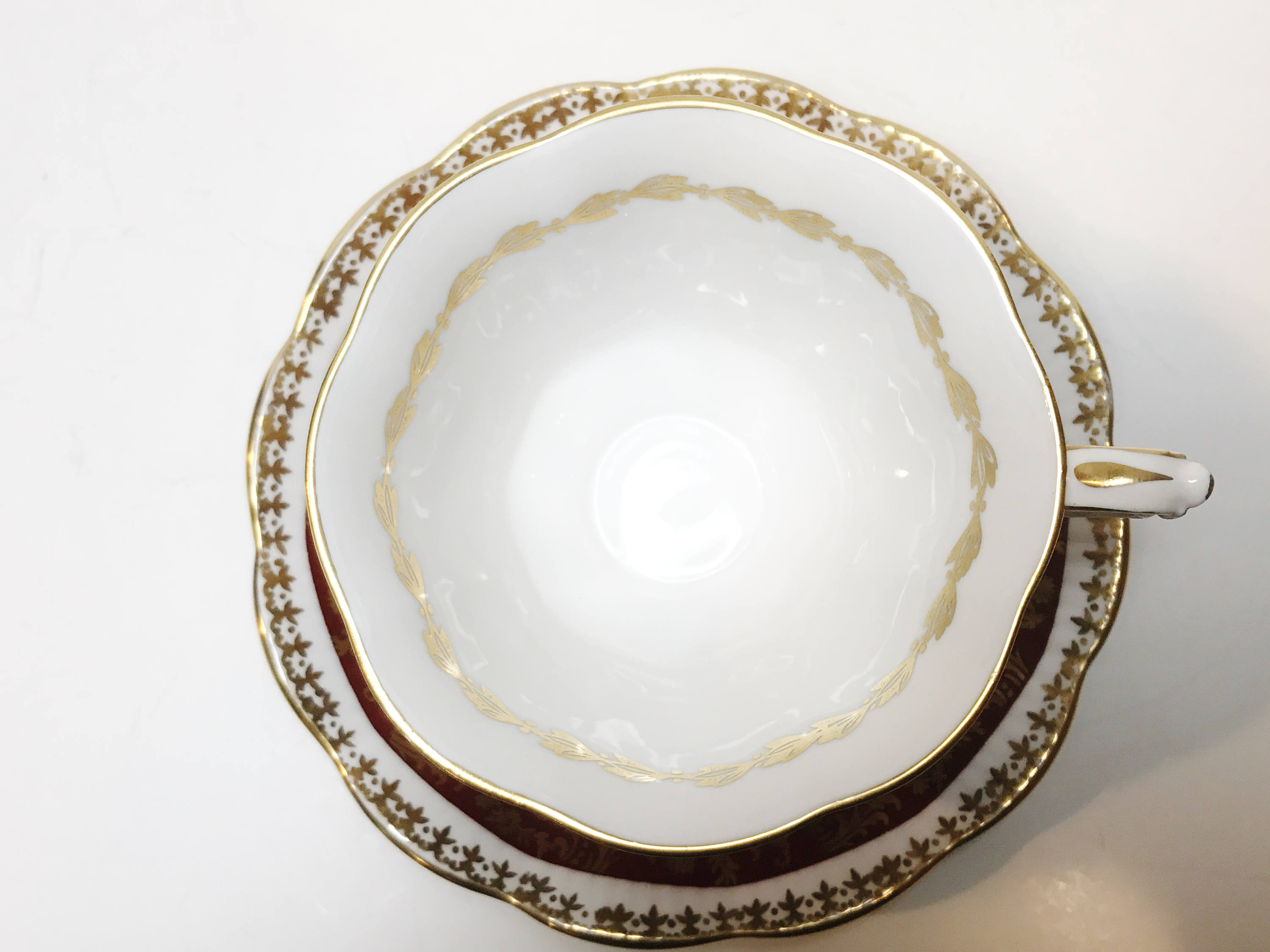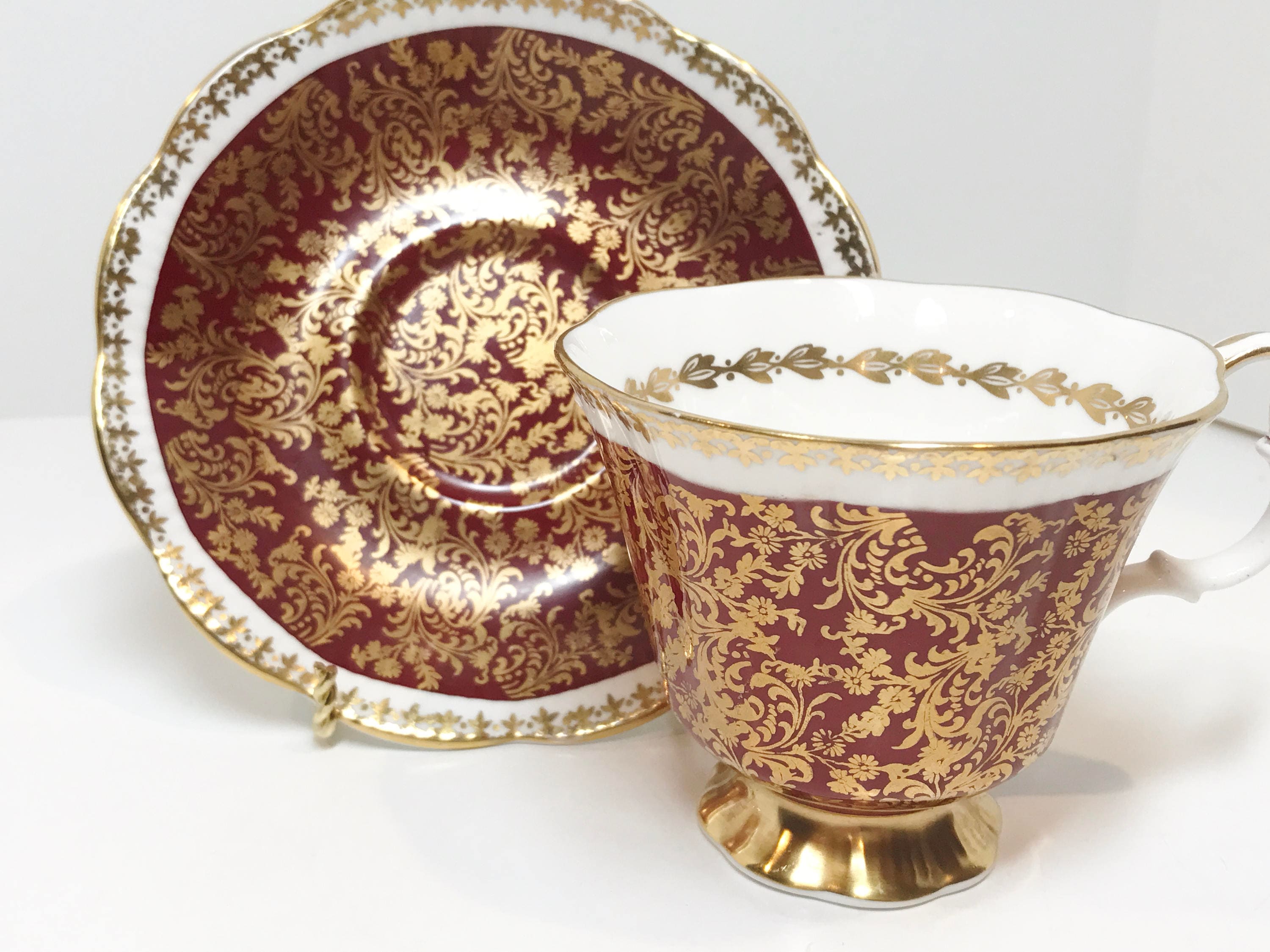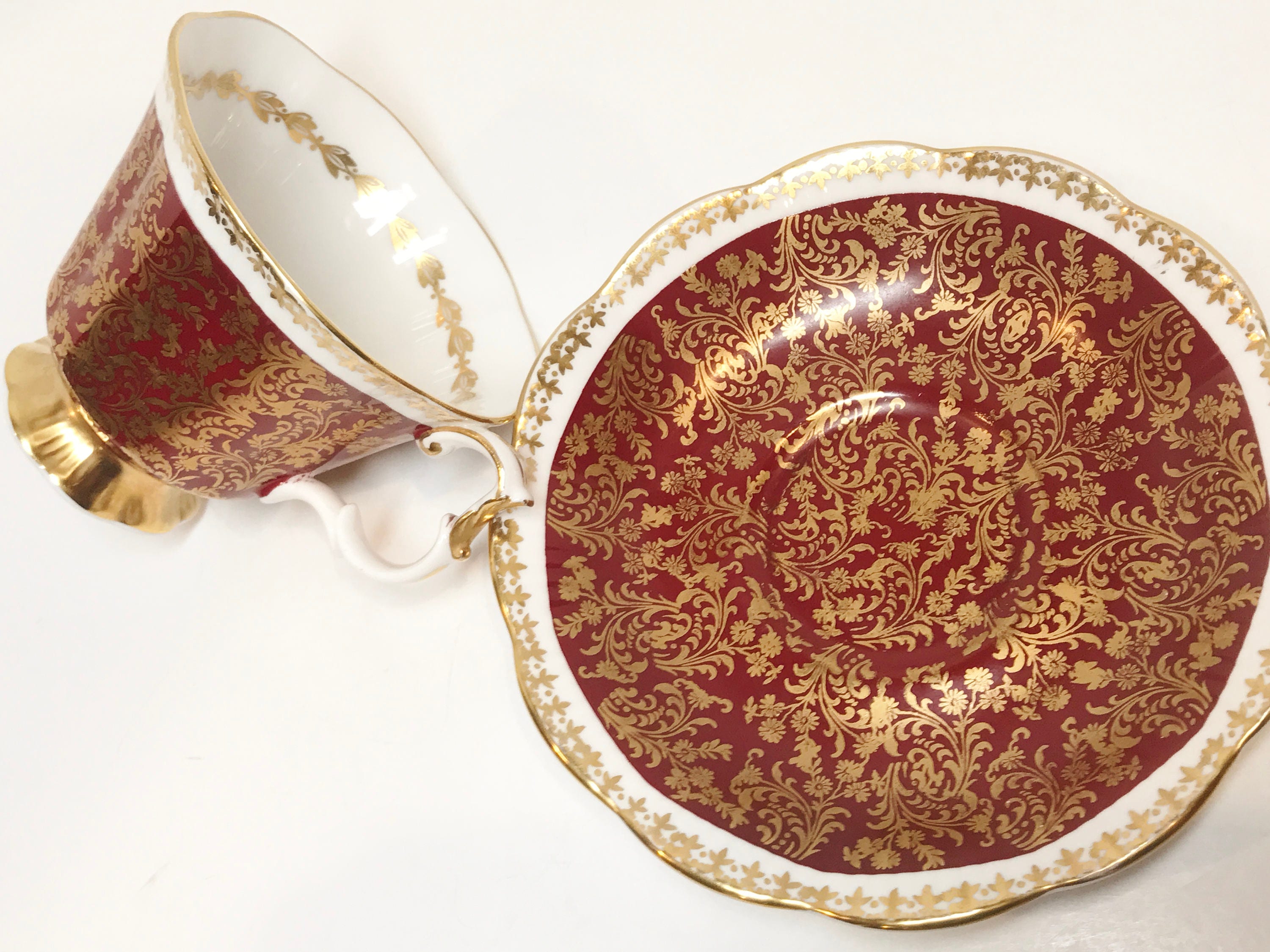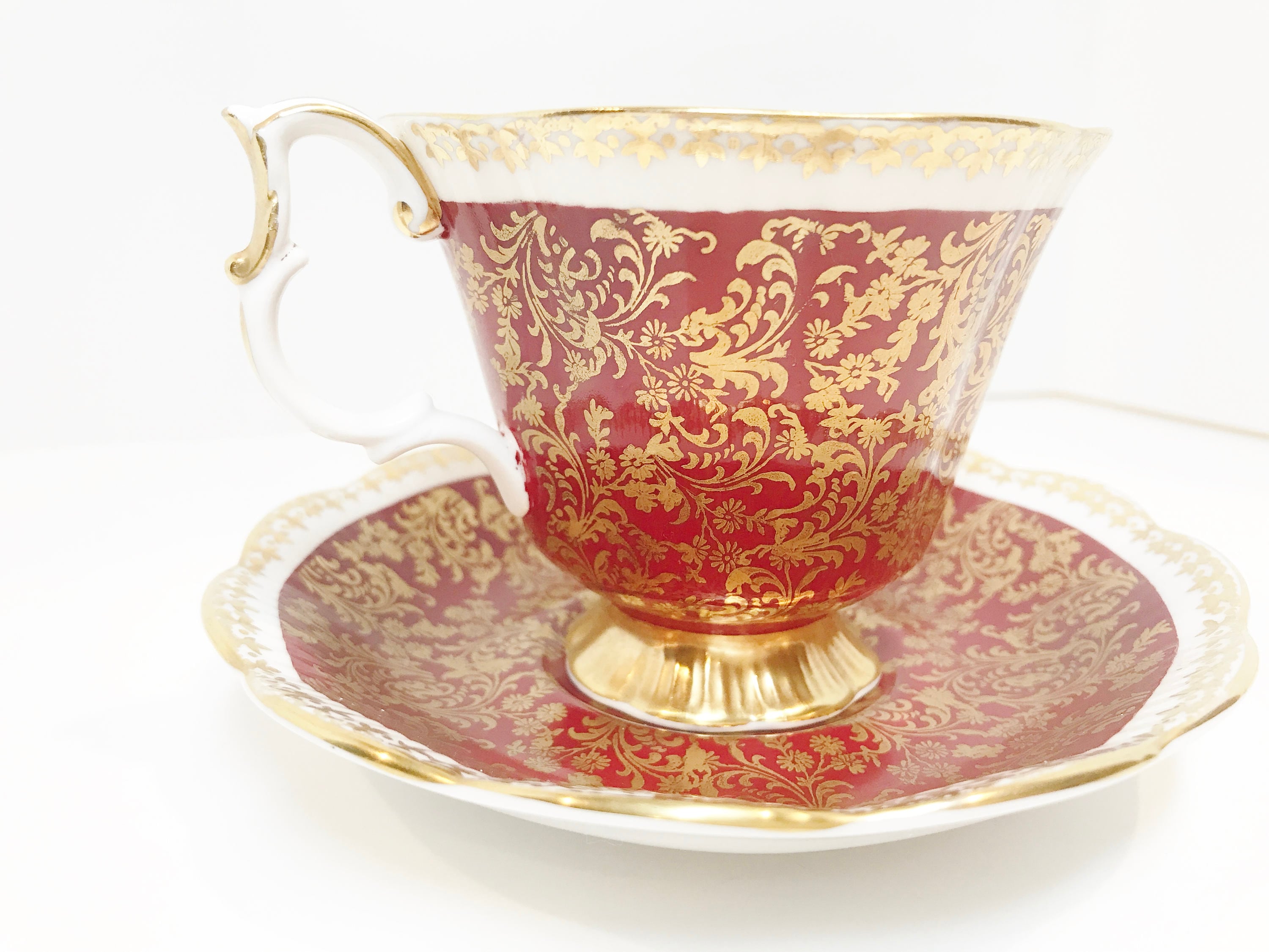 Royal Albert Bone China of England crafted this sophisticated tea cup and saucer. It is part of the Buckingham Series which was produced in the early 1970s. They offered blue, brown, green, dark green, orange, pink, turquoise and this red one. They were all created using the Gainsborough Shape.