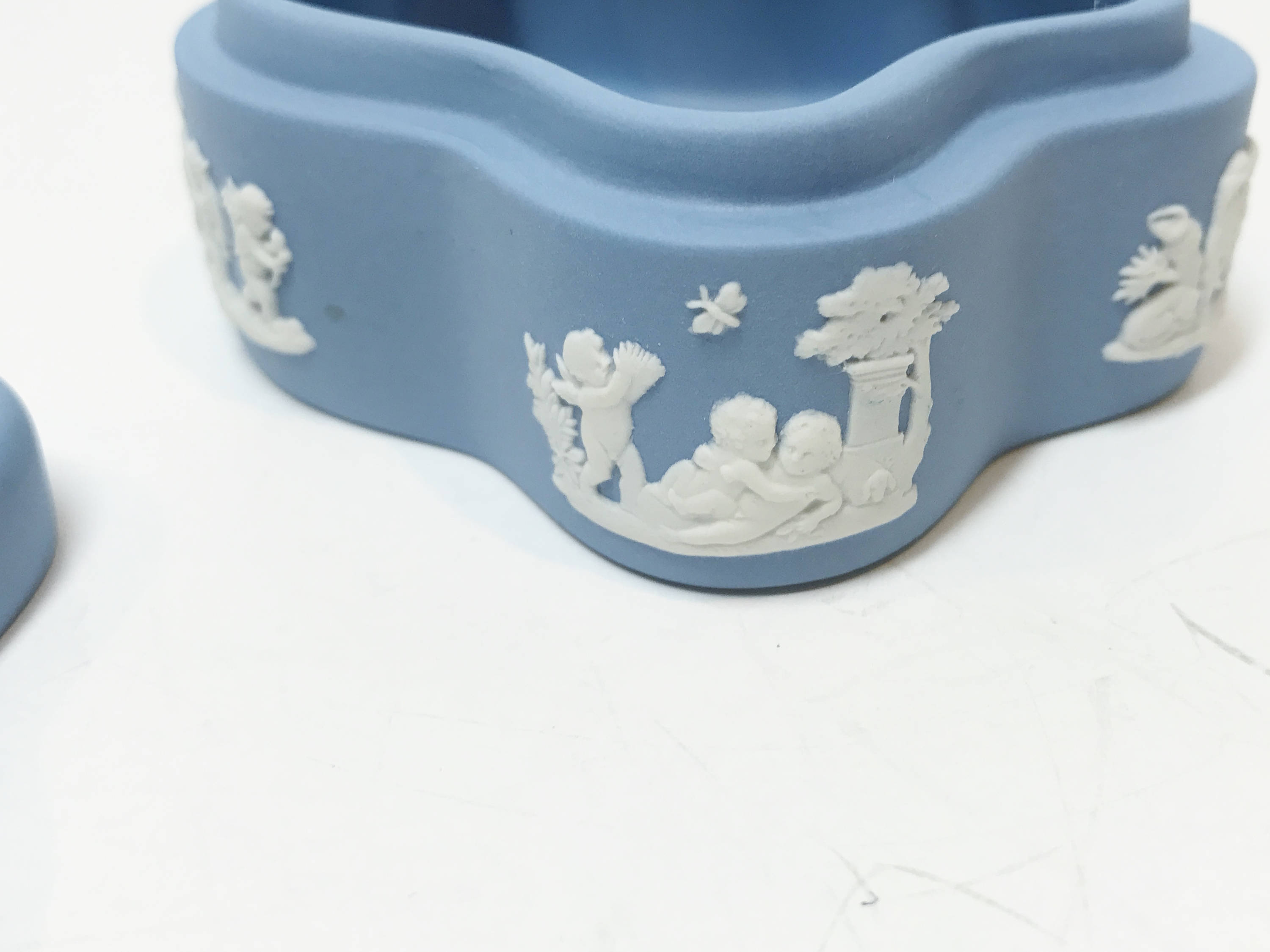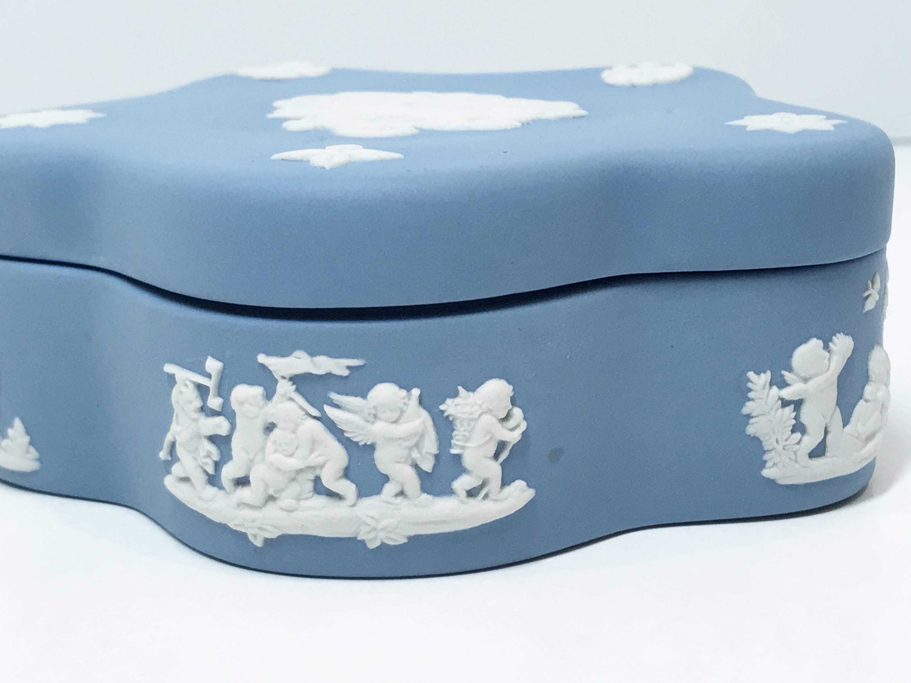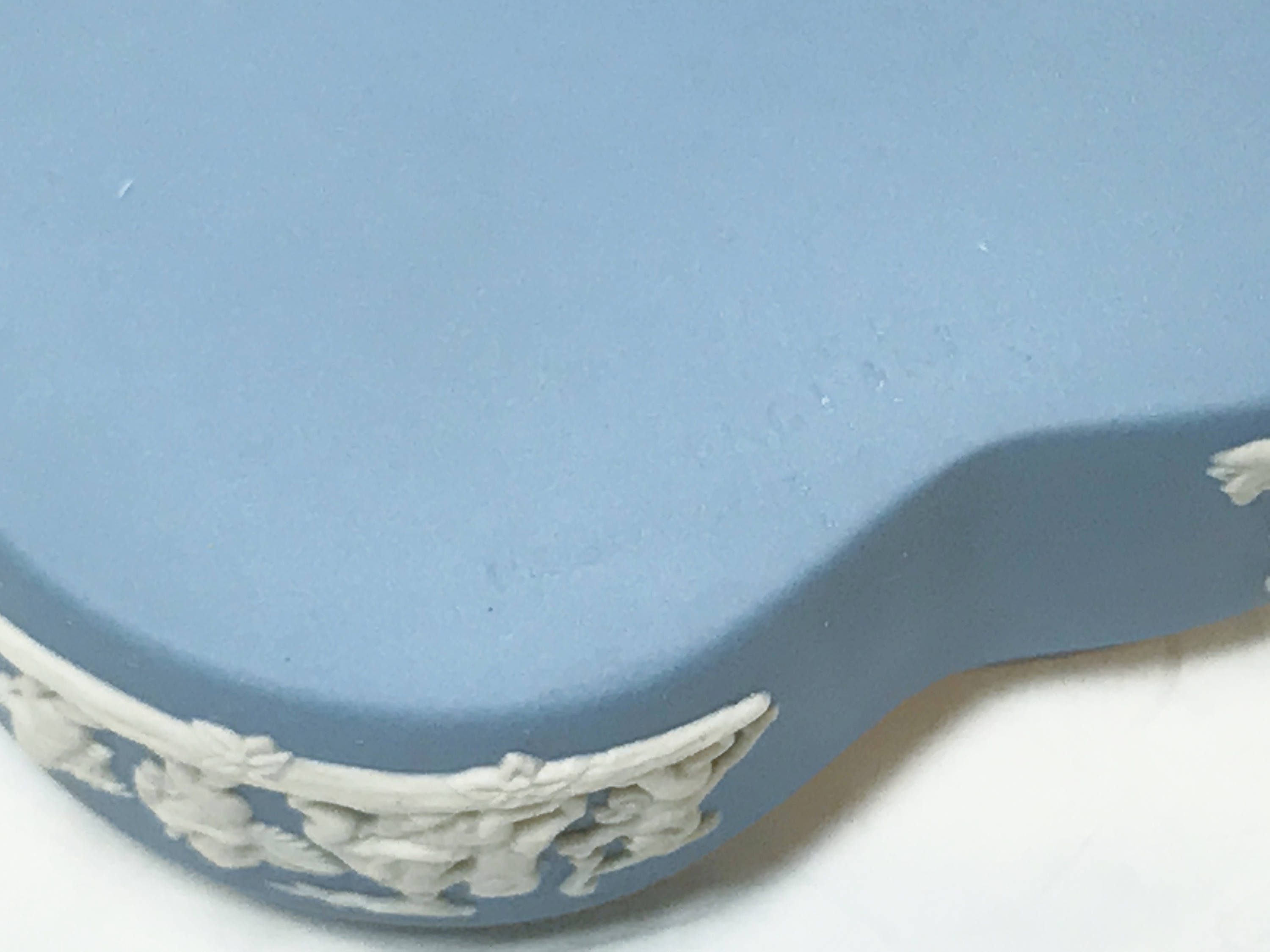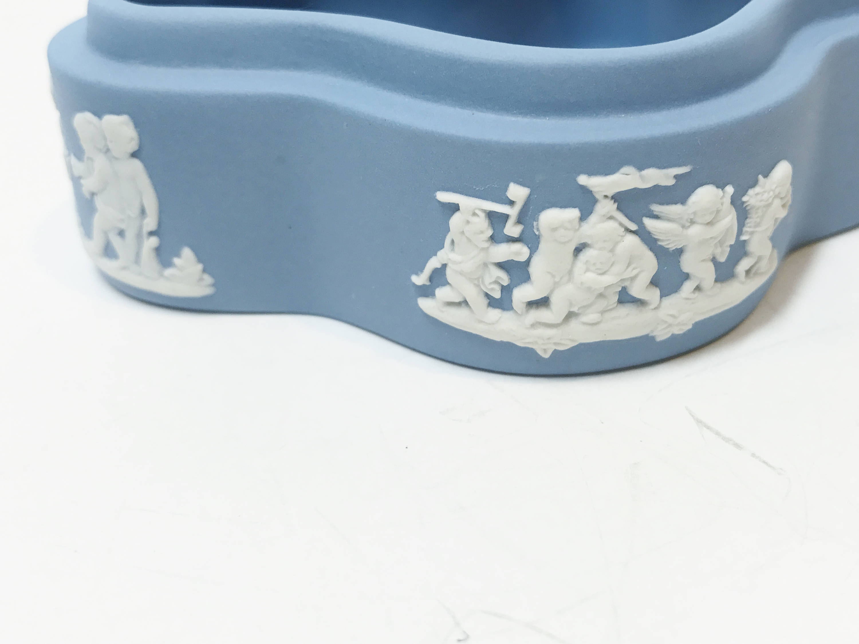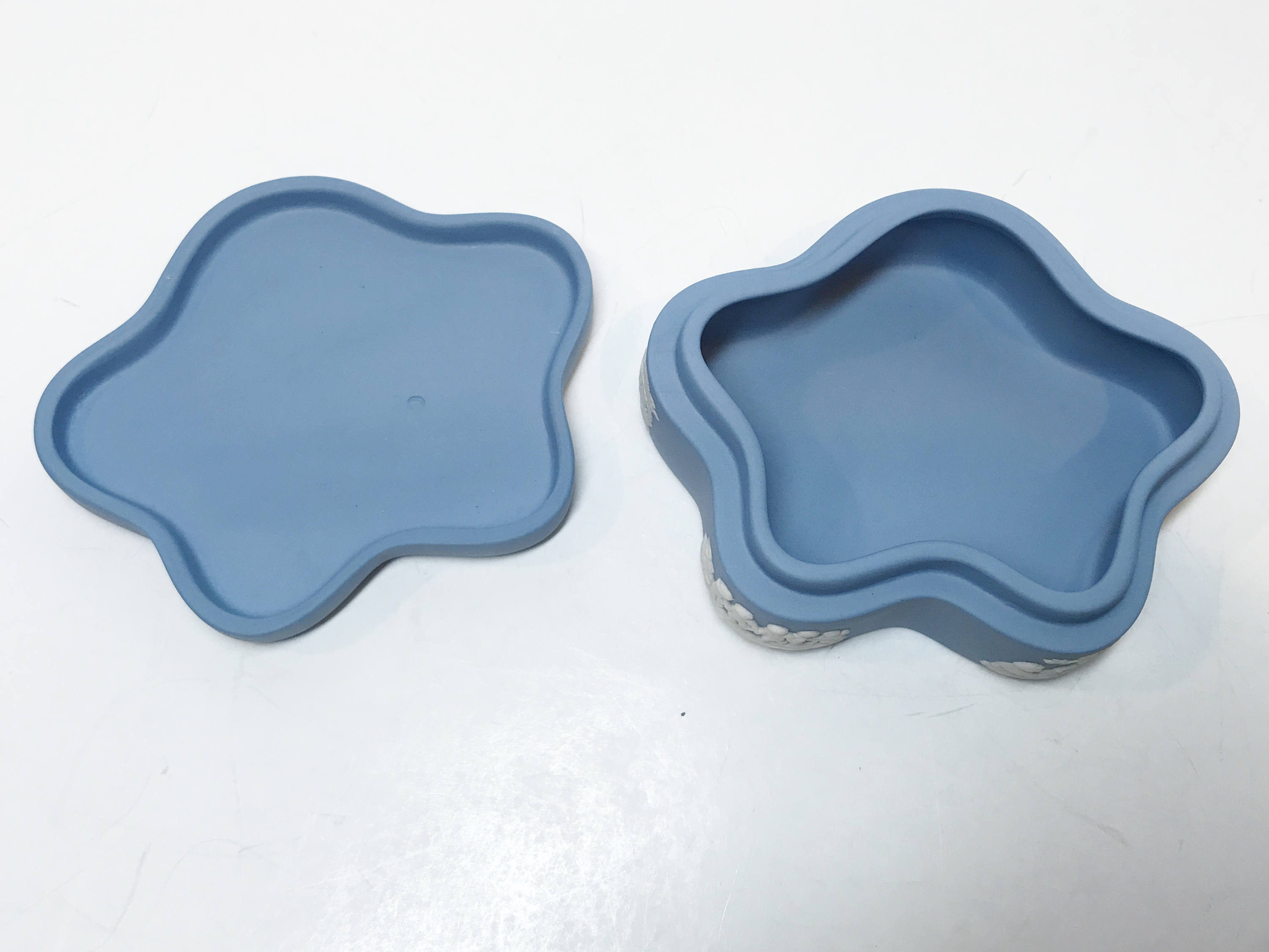 This is a blue jasperware (matte finish) trinket box. It also serves as a desk accessory for paper clips or other small objects. The bottom is incised with the company name "Wedgwood" on the bottom.