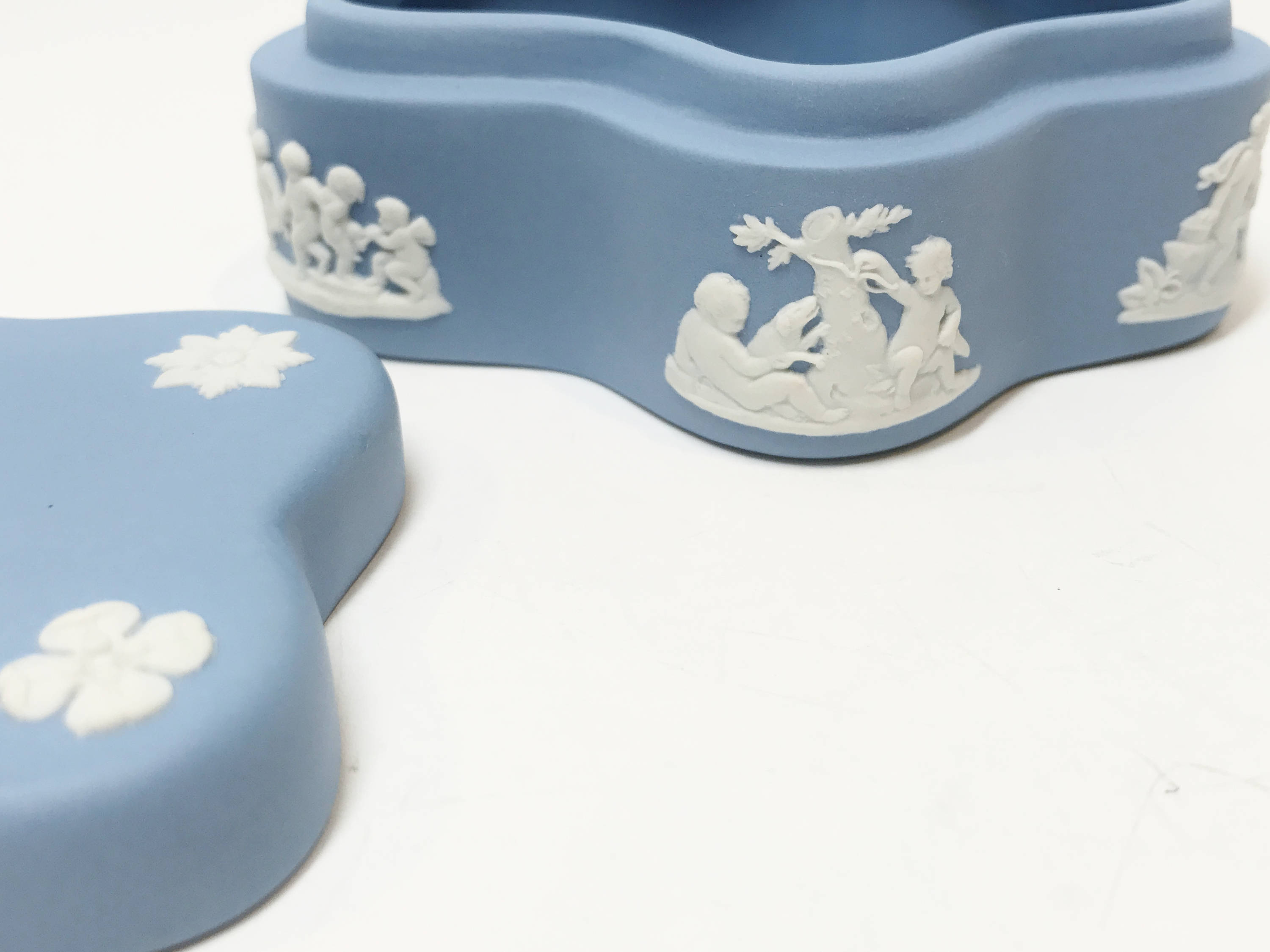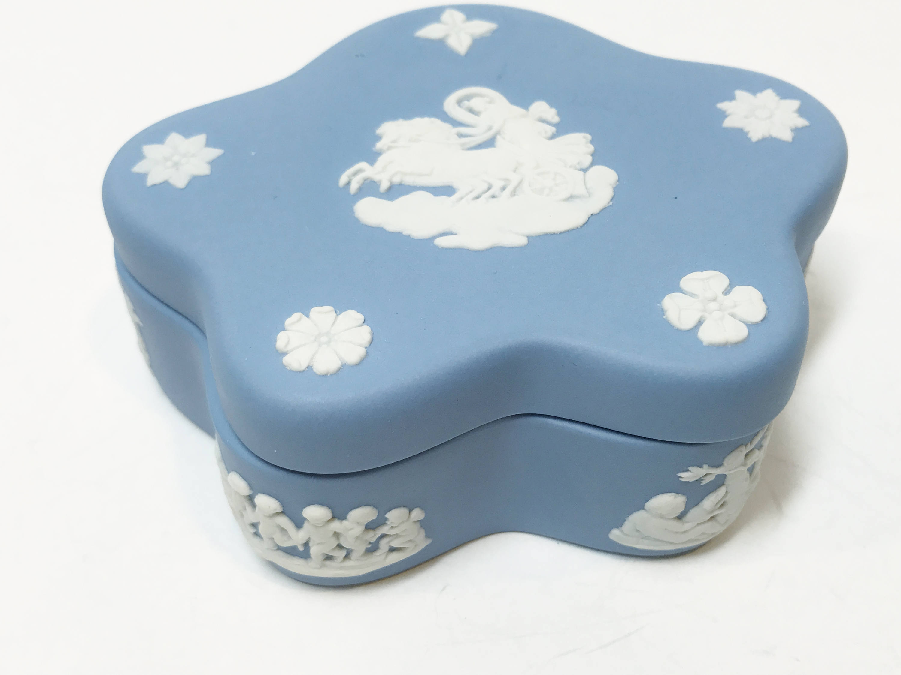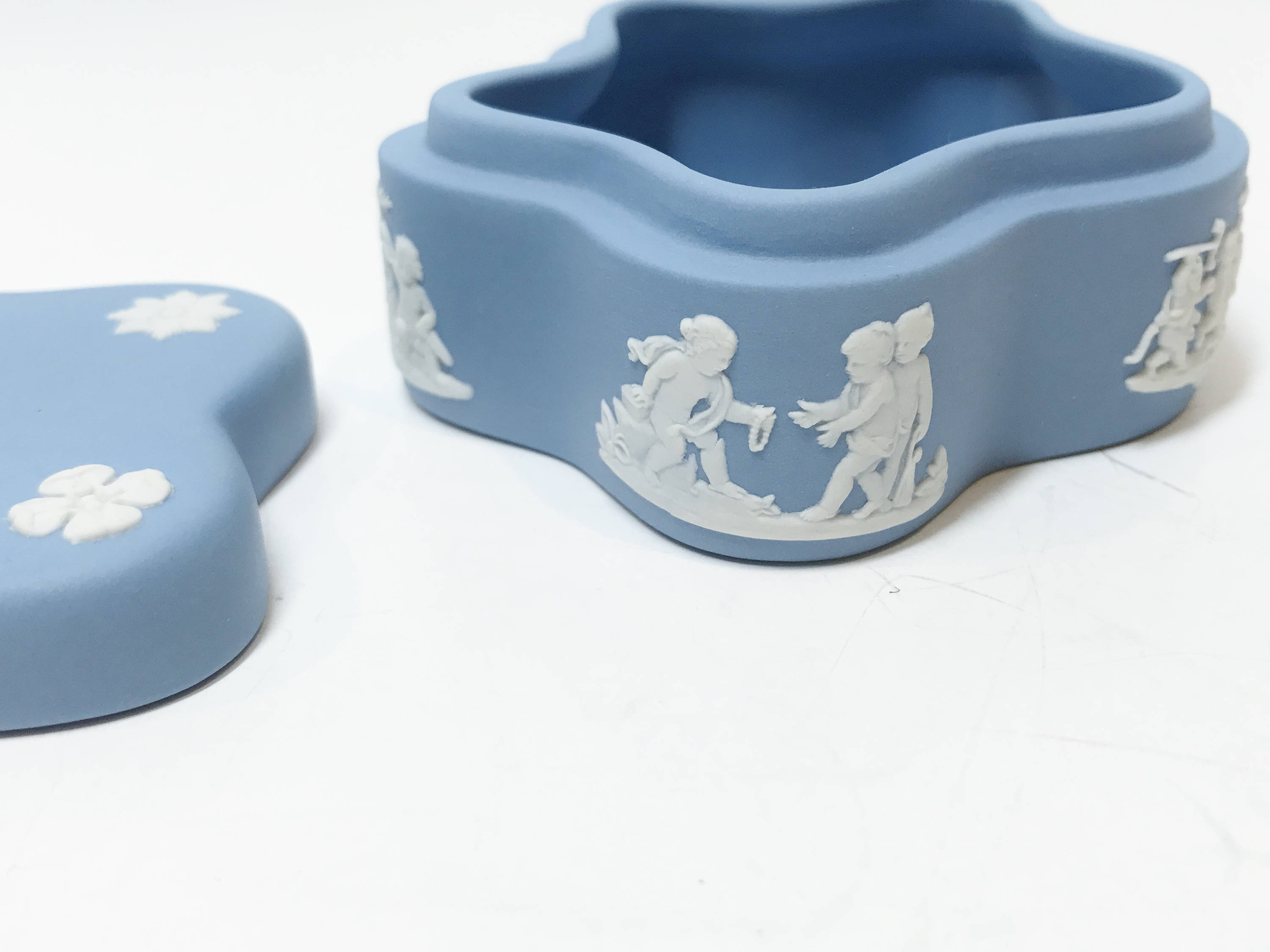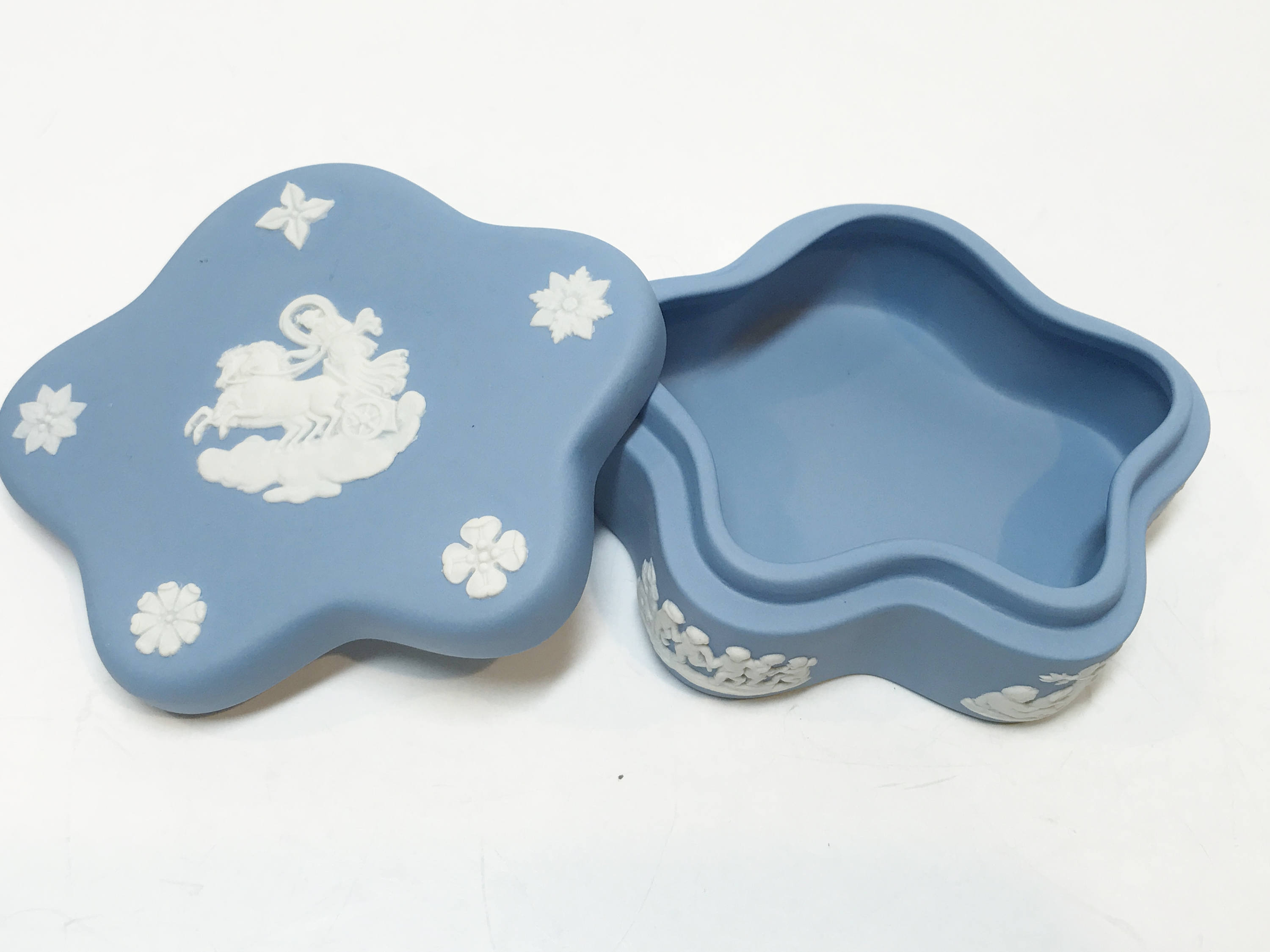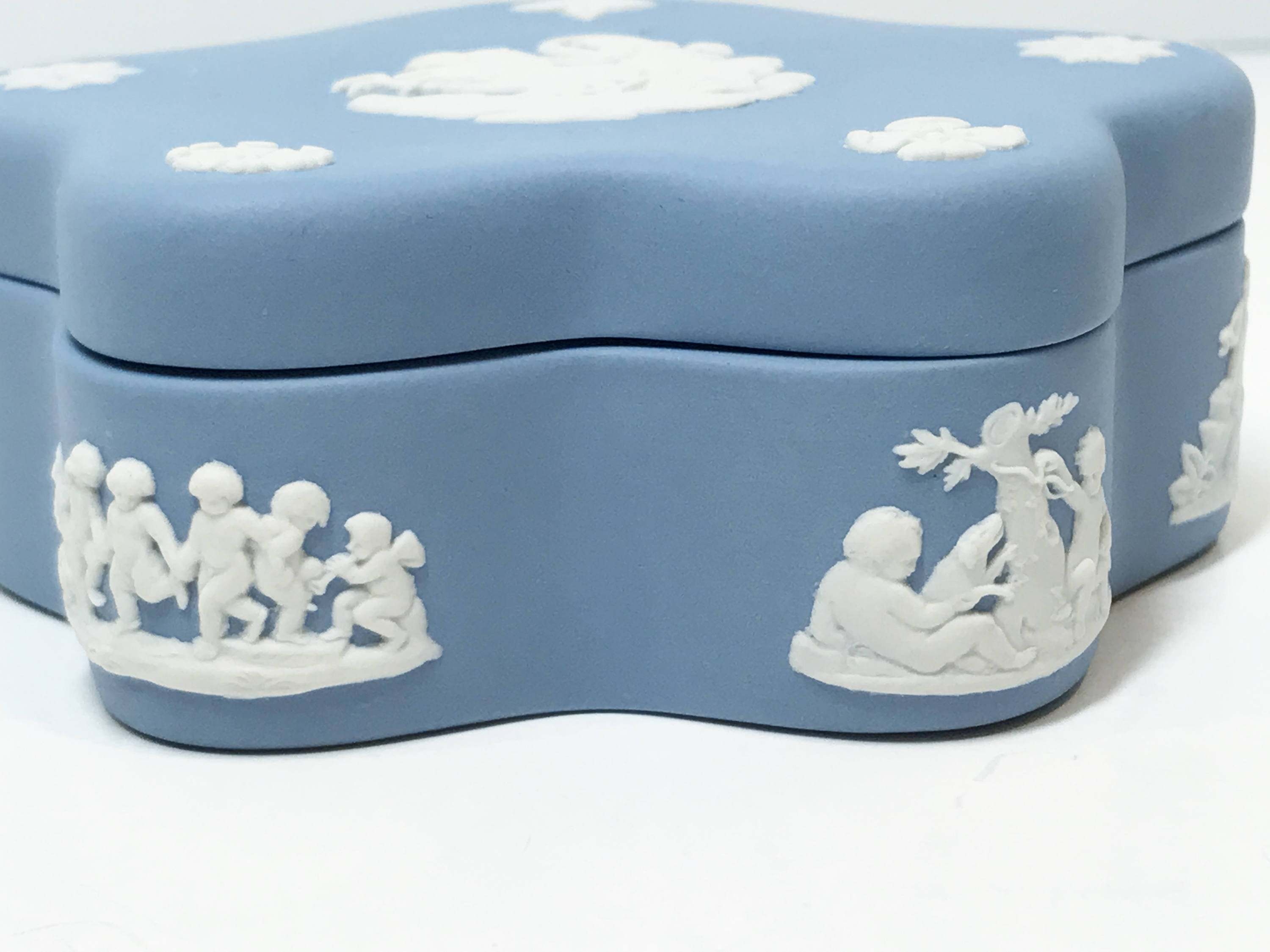 This is a blue jasperware (matte finish) trinket box. It also serves as a desk accessory for paper clips or other small objects. The bottom is incised with the company name "Wedgwood" on the bottom.