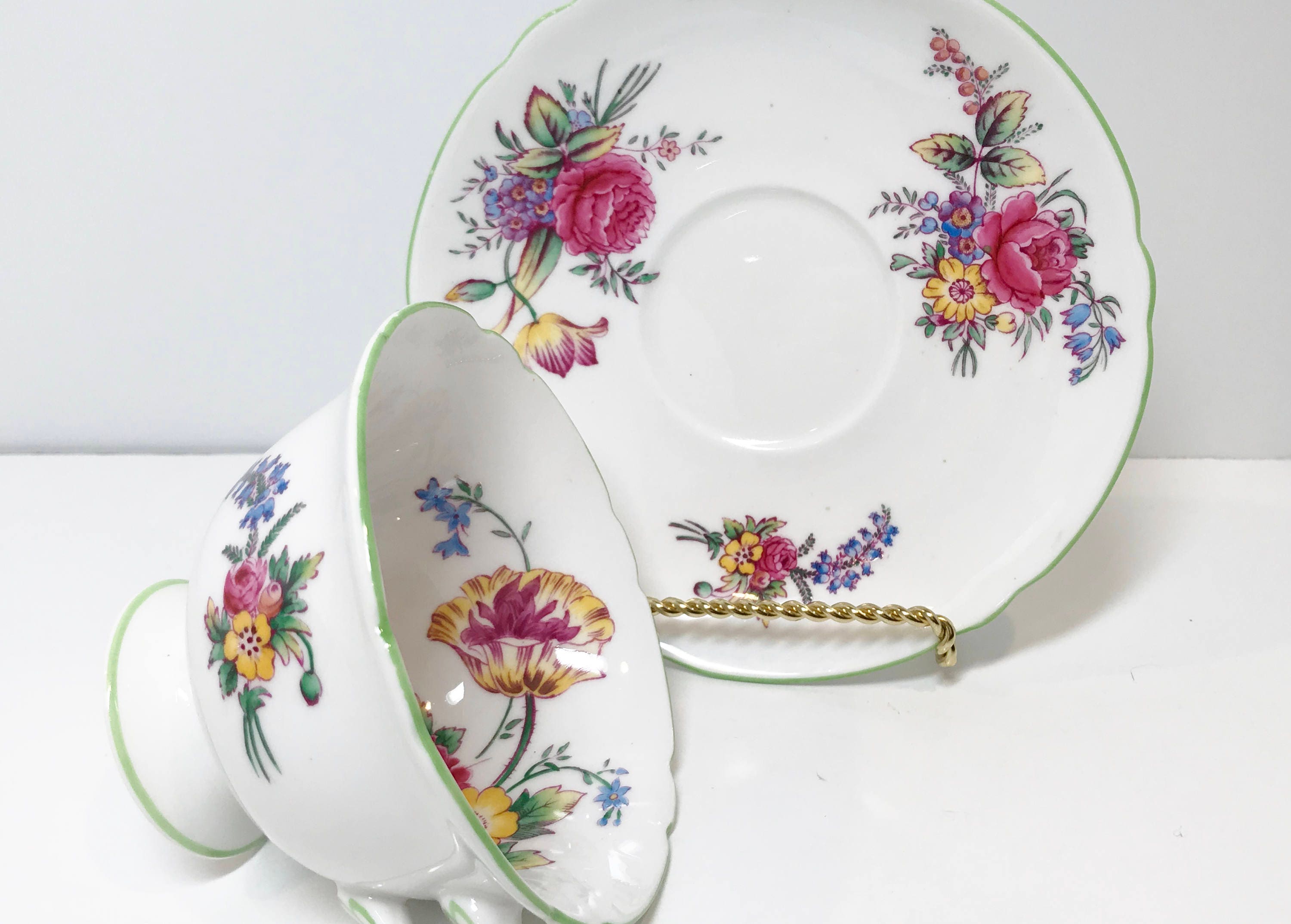 This English tea cup and saucer is in excellent condition. There are no chips, cracks or crazing. We do not sell damaged items. You may buy with confidence.