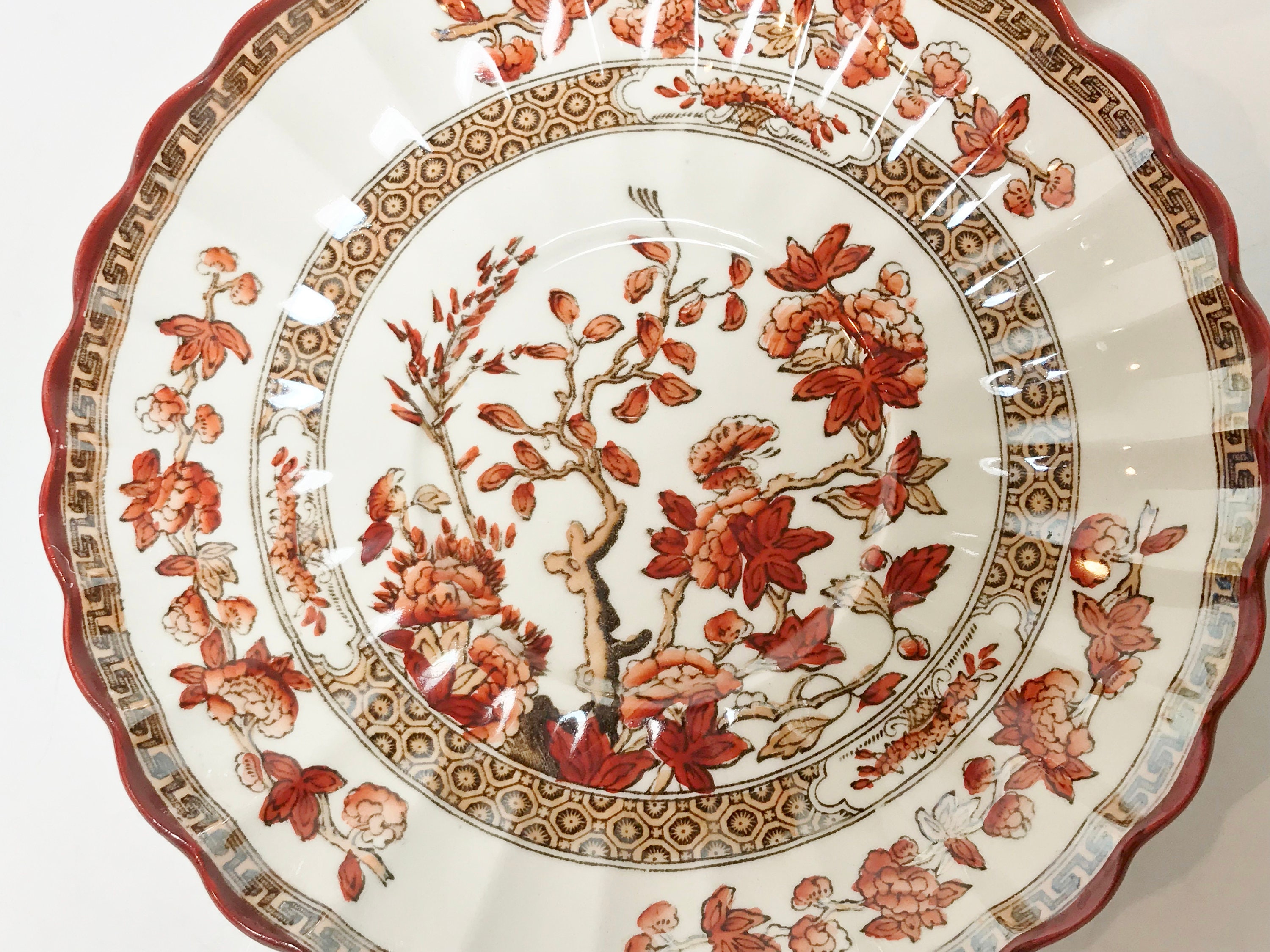Spode Bone China of England crafted this striking teacup and saucer. It is called the India Tree pattern. There were two backstamps used. This is the older one printed in black which dates between 1805 and 1815. The Josiah Spode company was on Stoke on Trent, making it one of the Staffordshire Potteries.