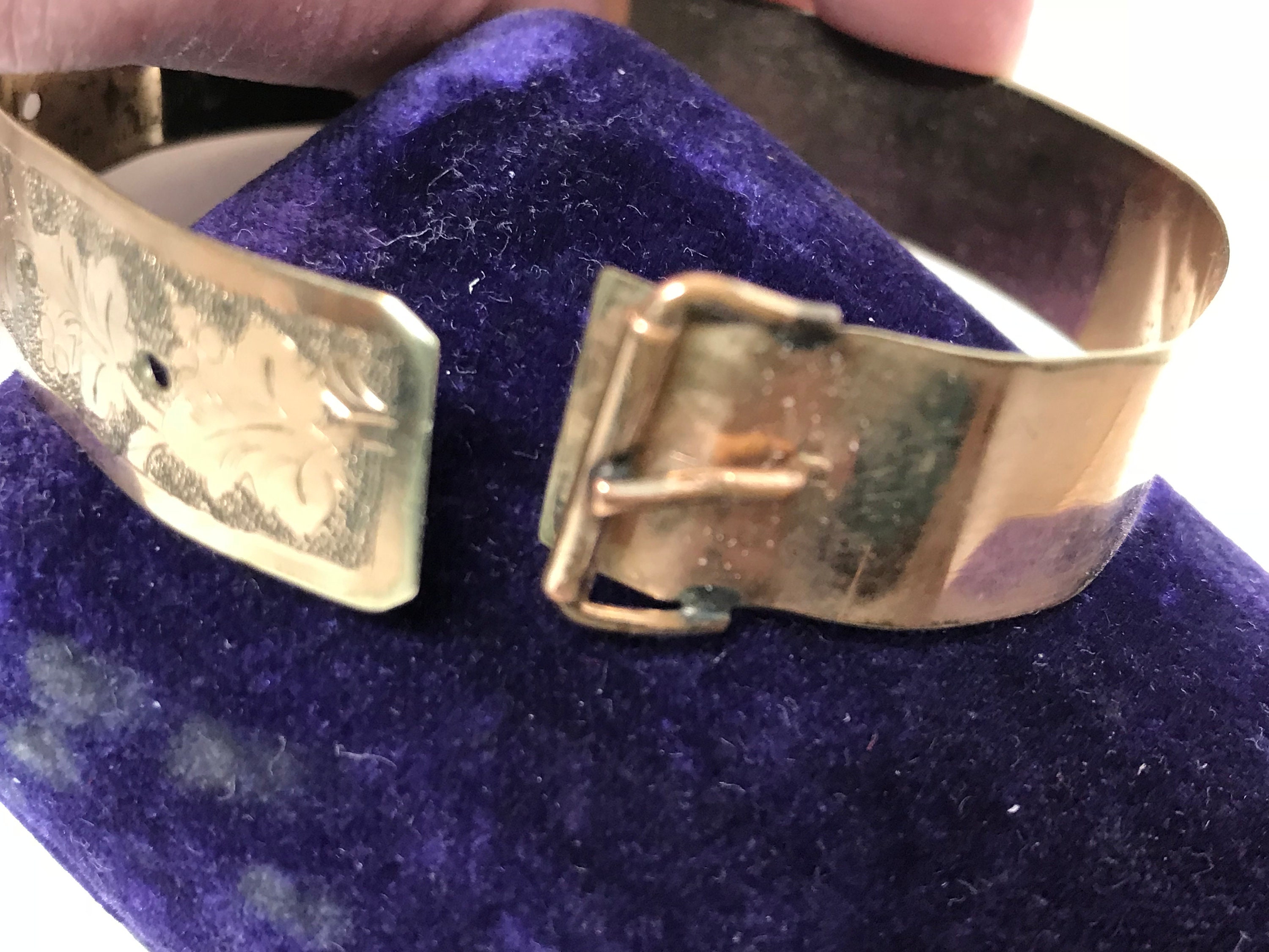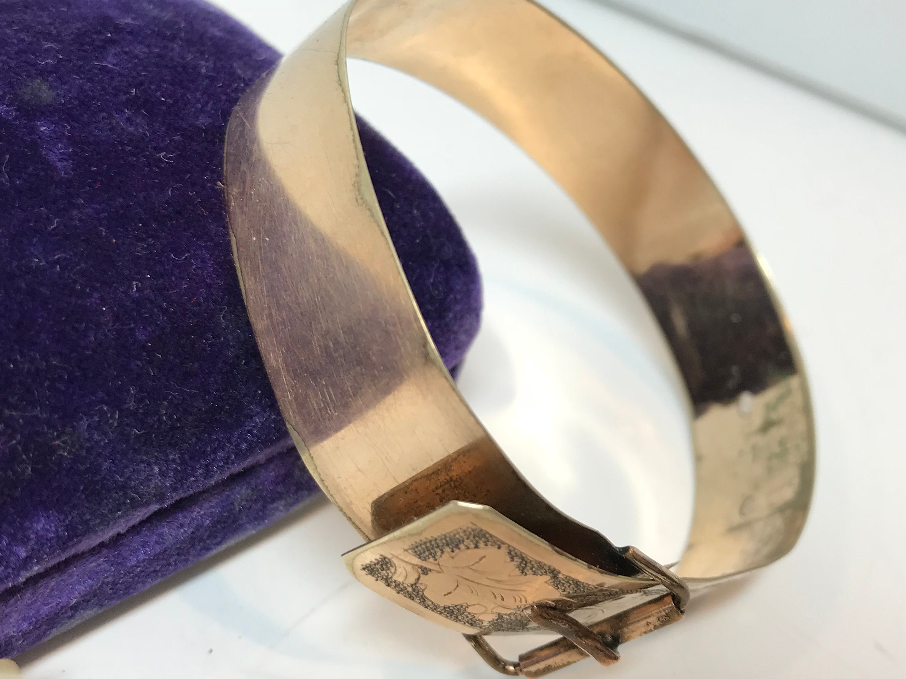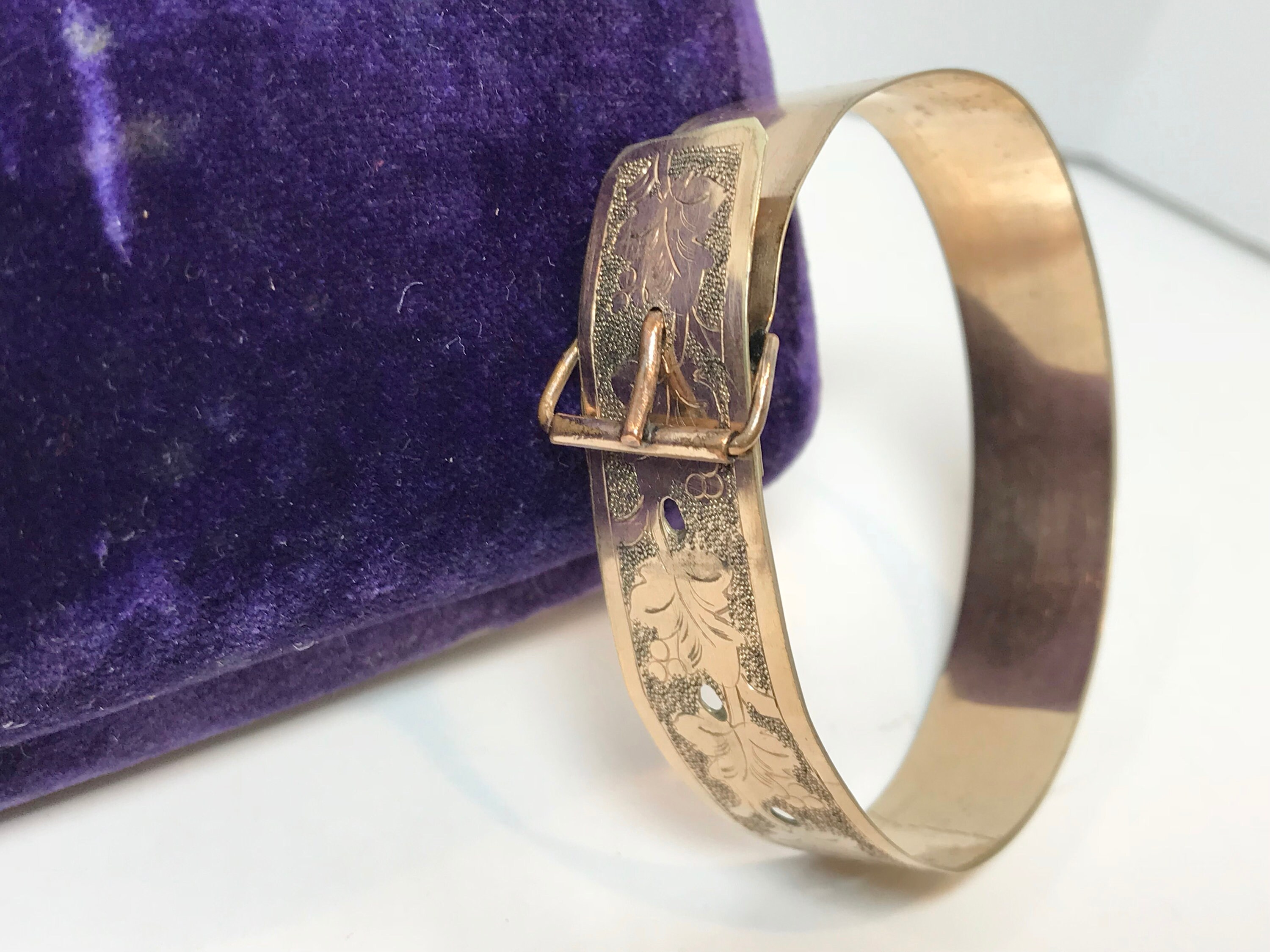The buckle actually works on this rolled gold bangle. That means that the gold was applied over a base metal. During the last century some has worn off as would be expected.