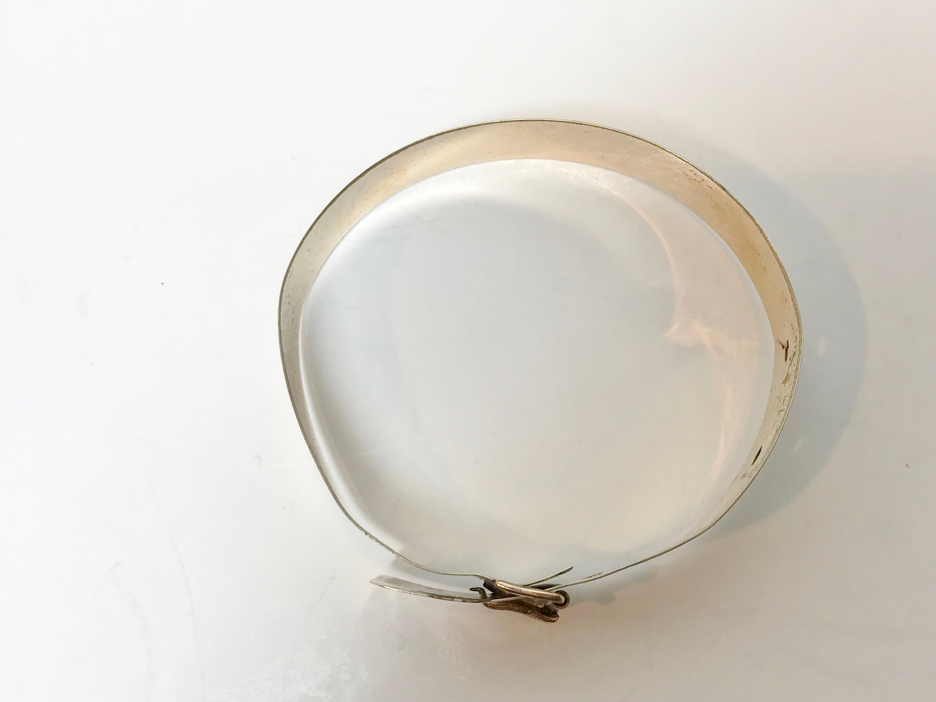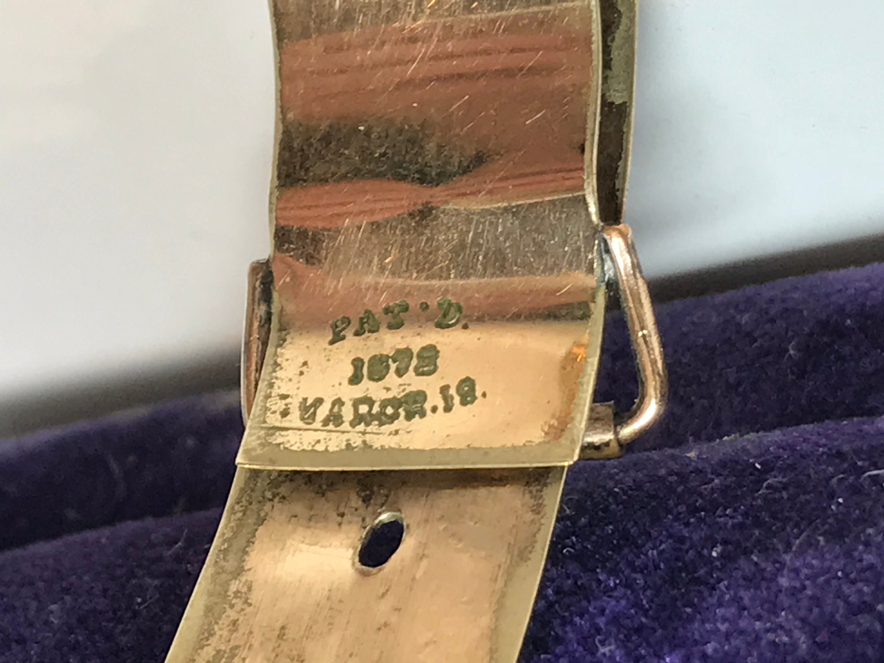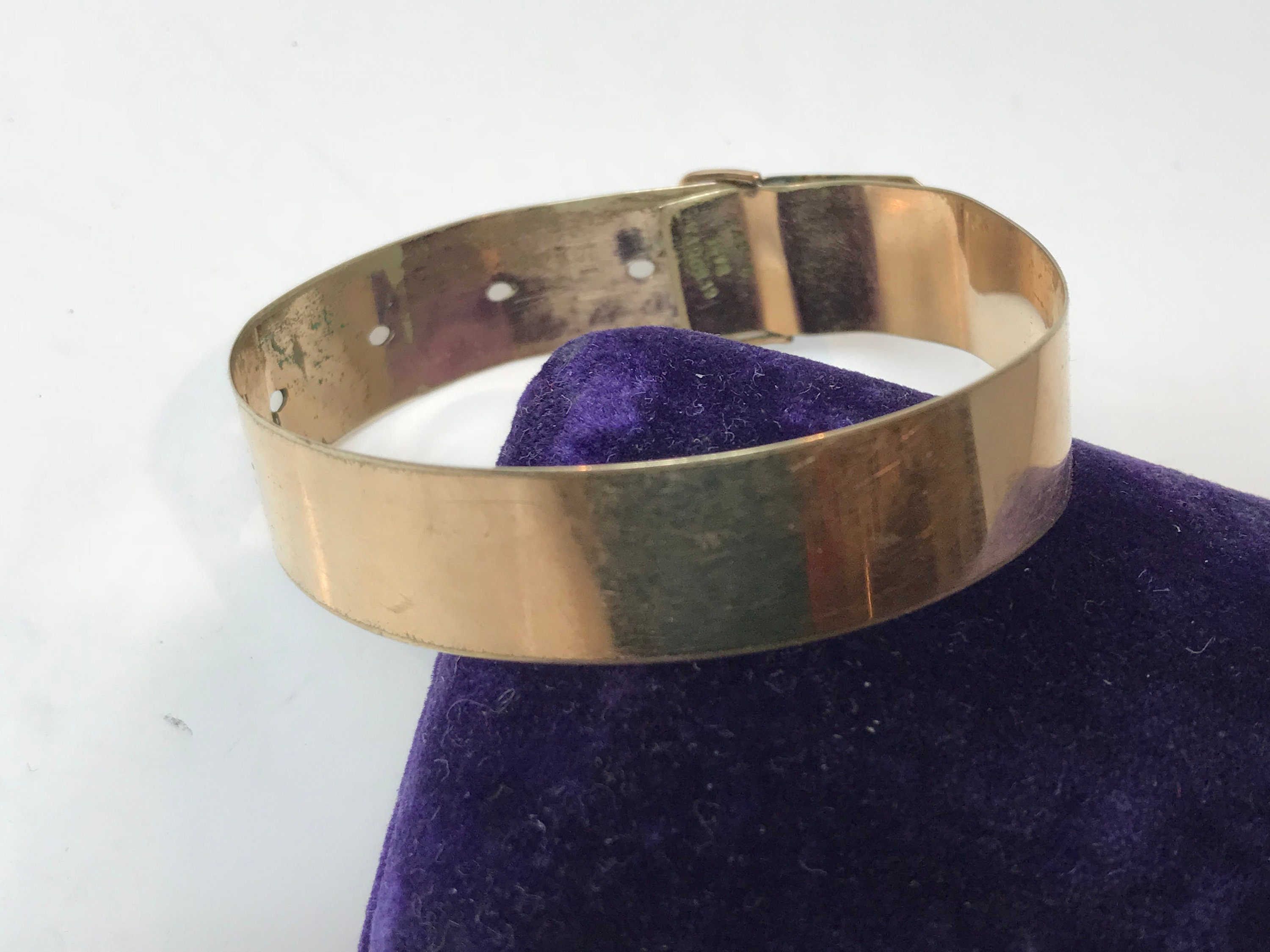 The buckle actually works on this rolled gold bangle. That means that the gold was applied over a base metal. During the last century some has worn off as would be expected.