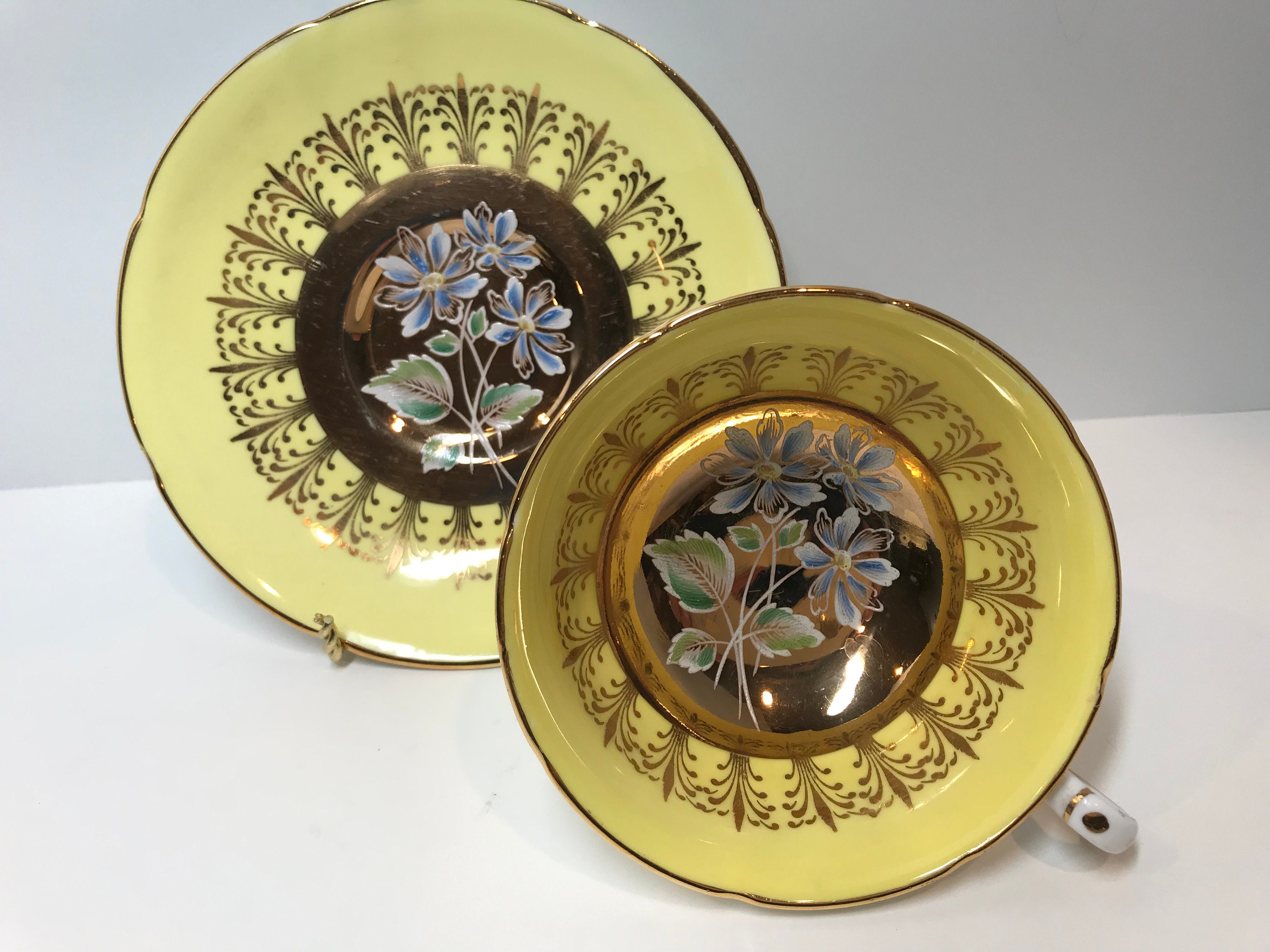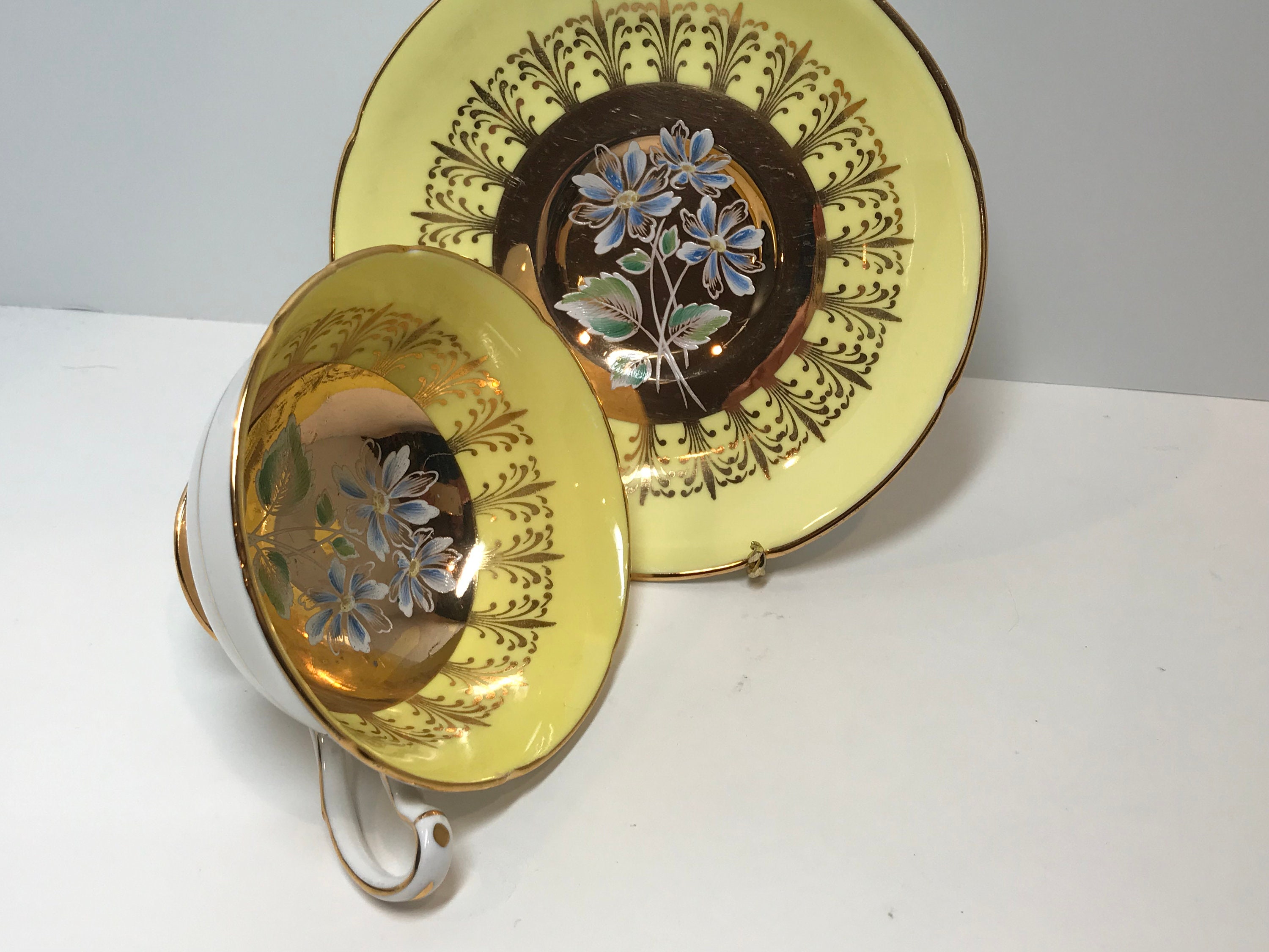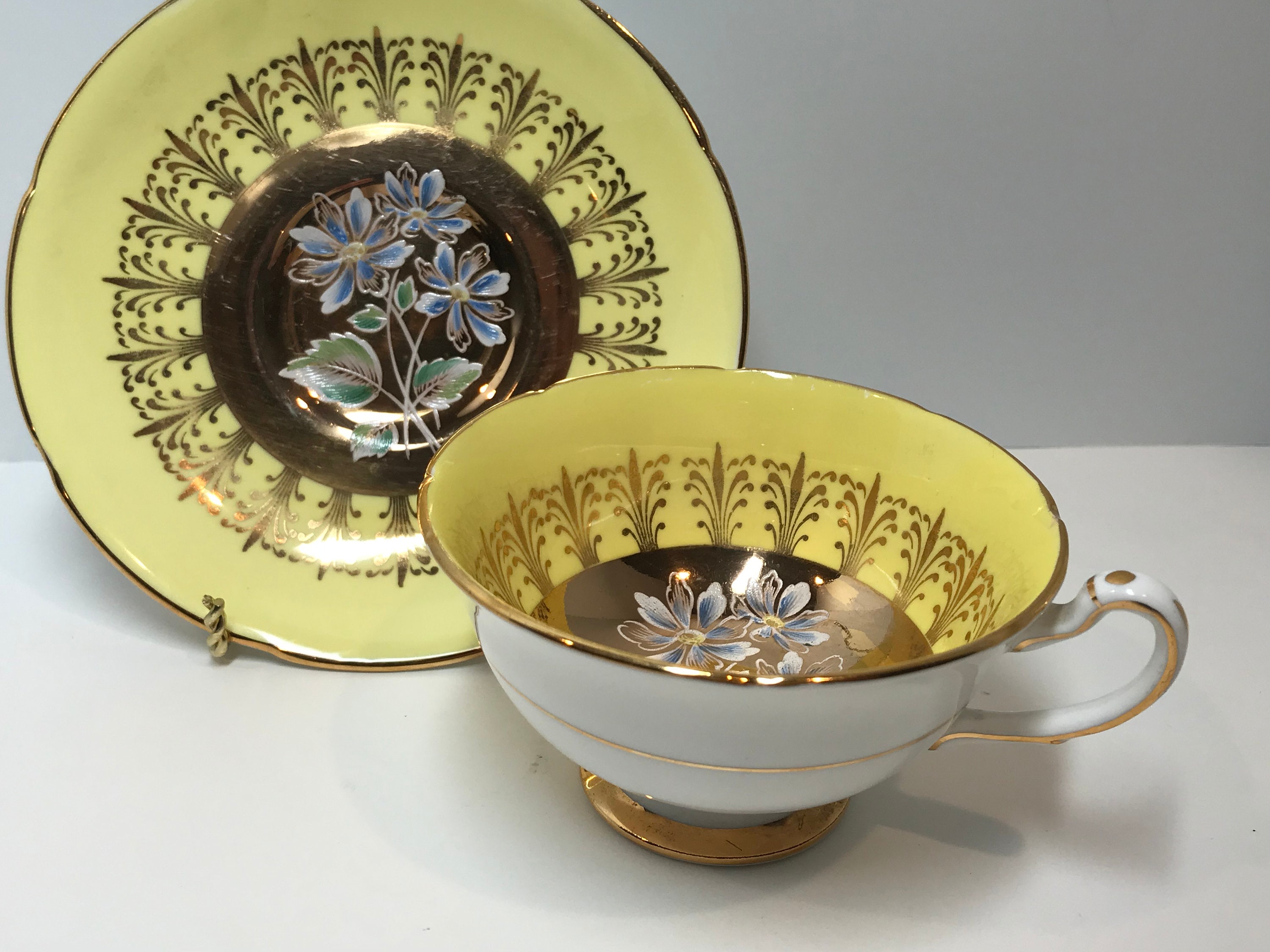 This yellow border with lavish gold design is the perfect frame for the hand painted center flowers and leaves. Note the aristocratic handle and ruffled edges on this charming English teacup and saucer. The backstamp was first issued in 1957.