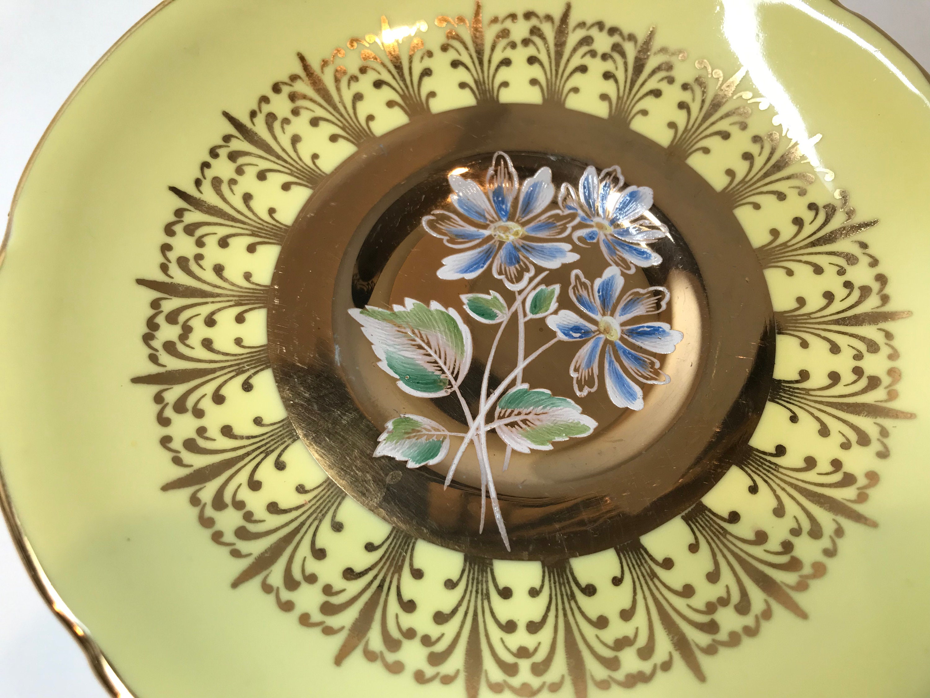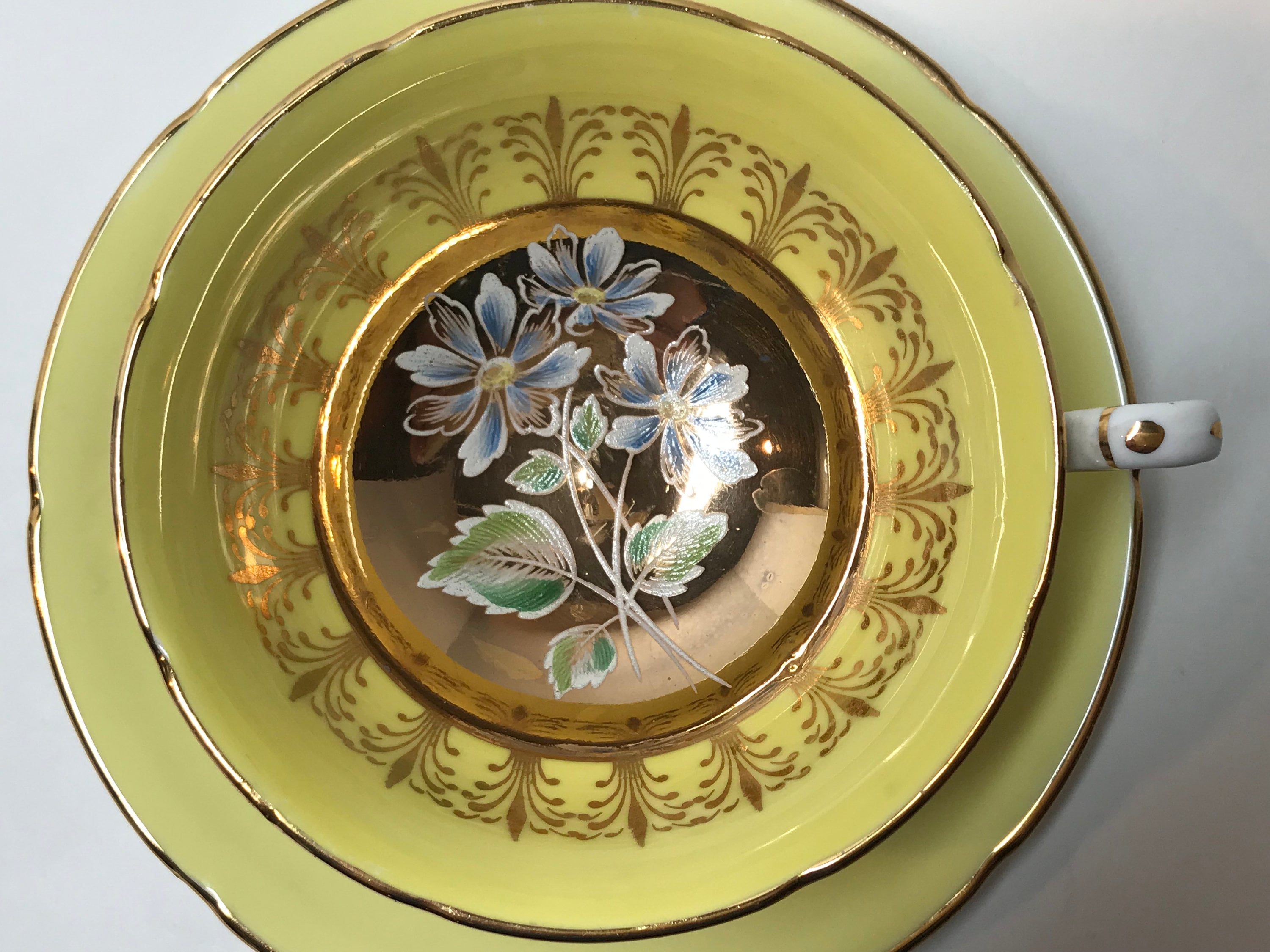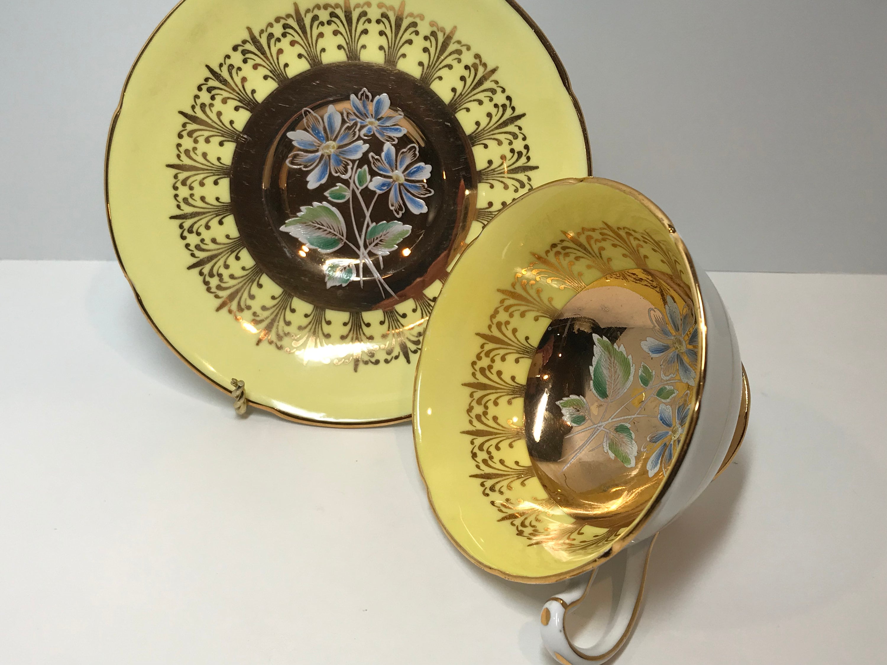 This yellow border with lavish gold design is the perfect frame for the hand painted center flowers and leaves. Note the aristocratic handle and ruffled edges on this charming English teacup and saucer. The backstamp was first issued in 1957.