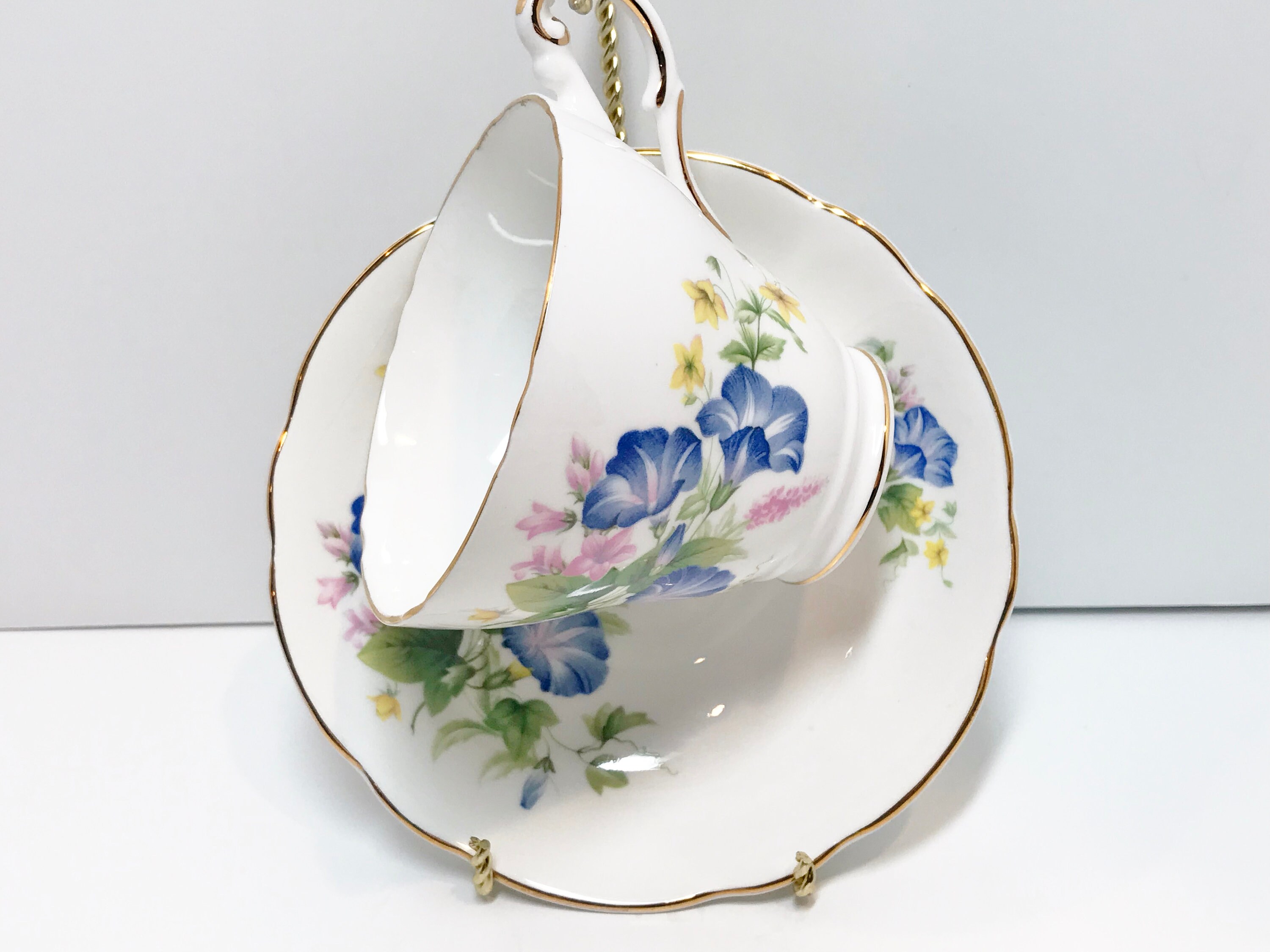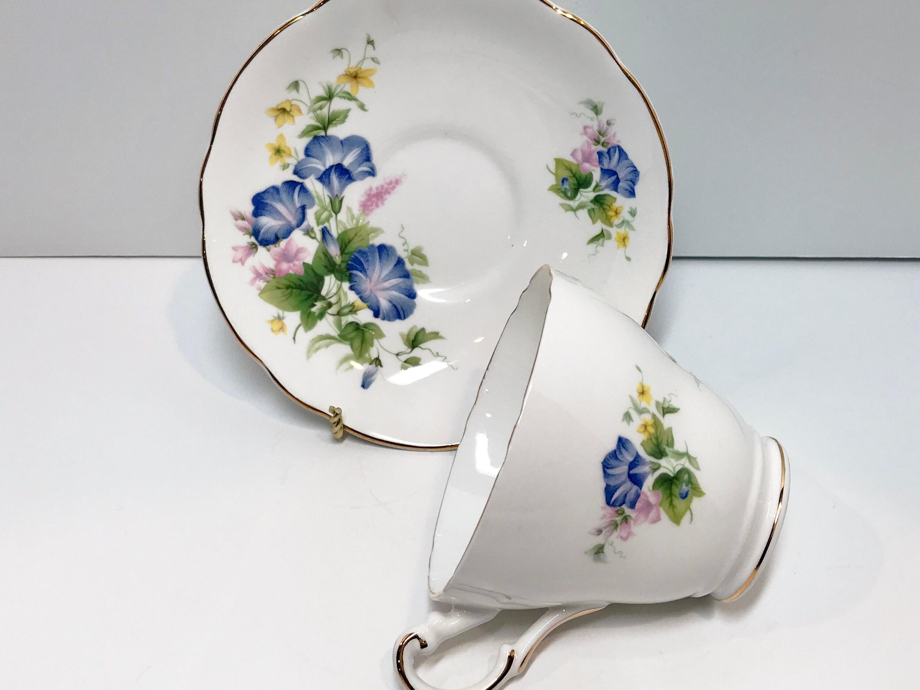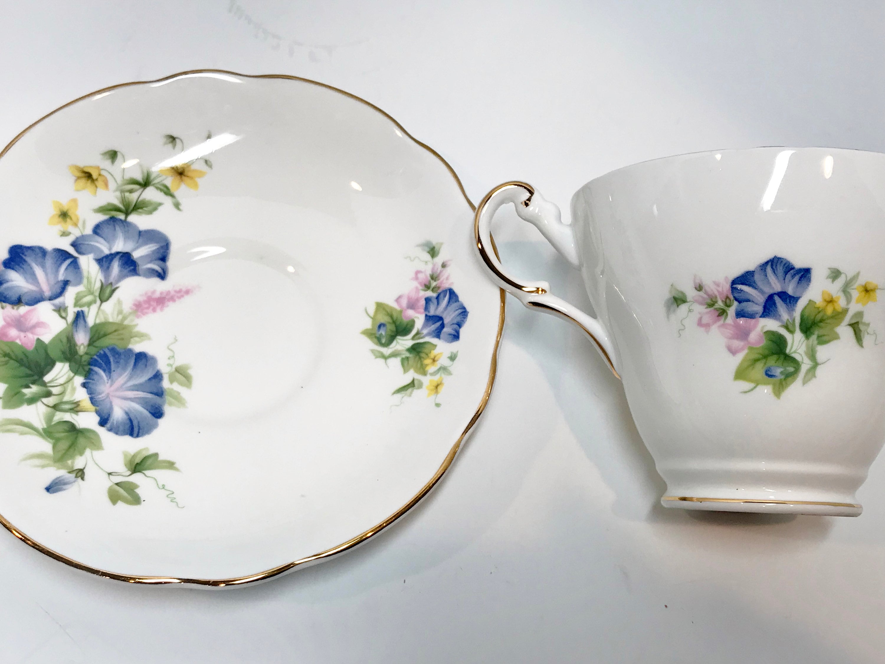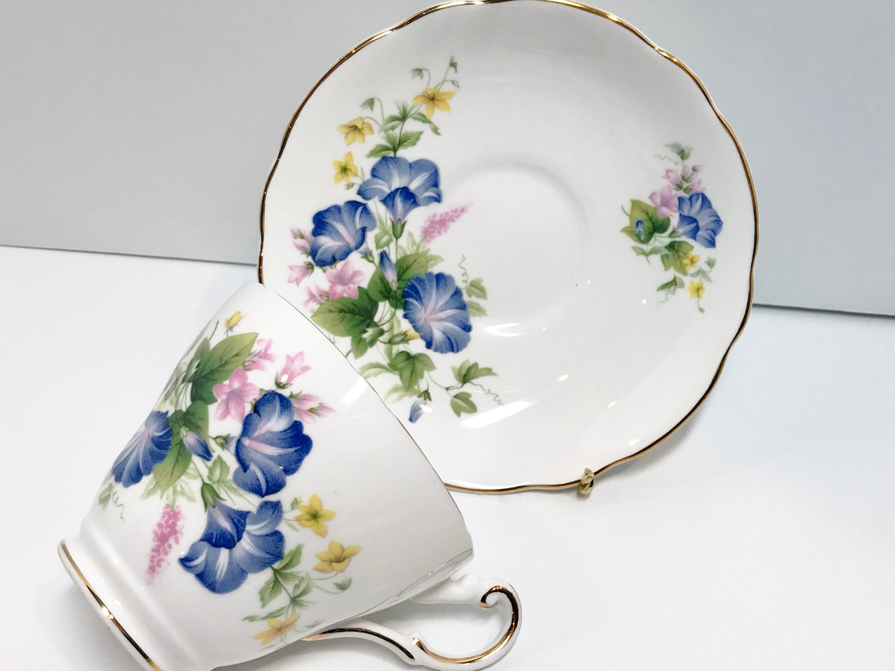 Morning Glory flowers are dispersed upon elegant white English bone china.