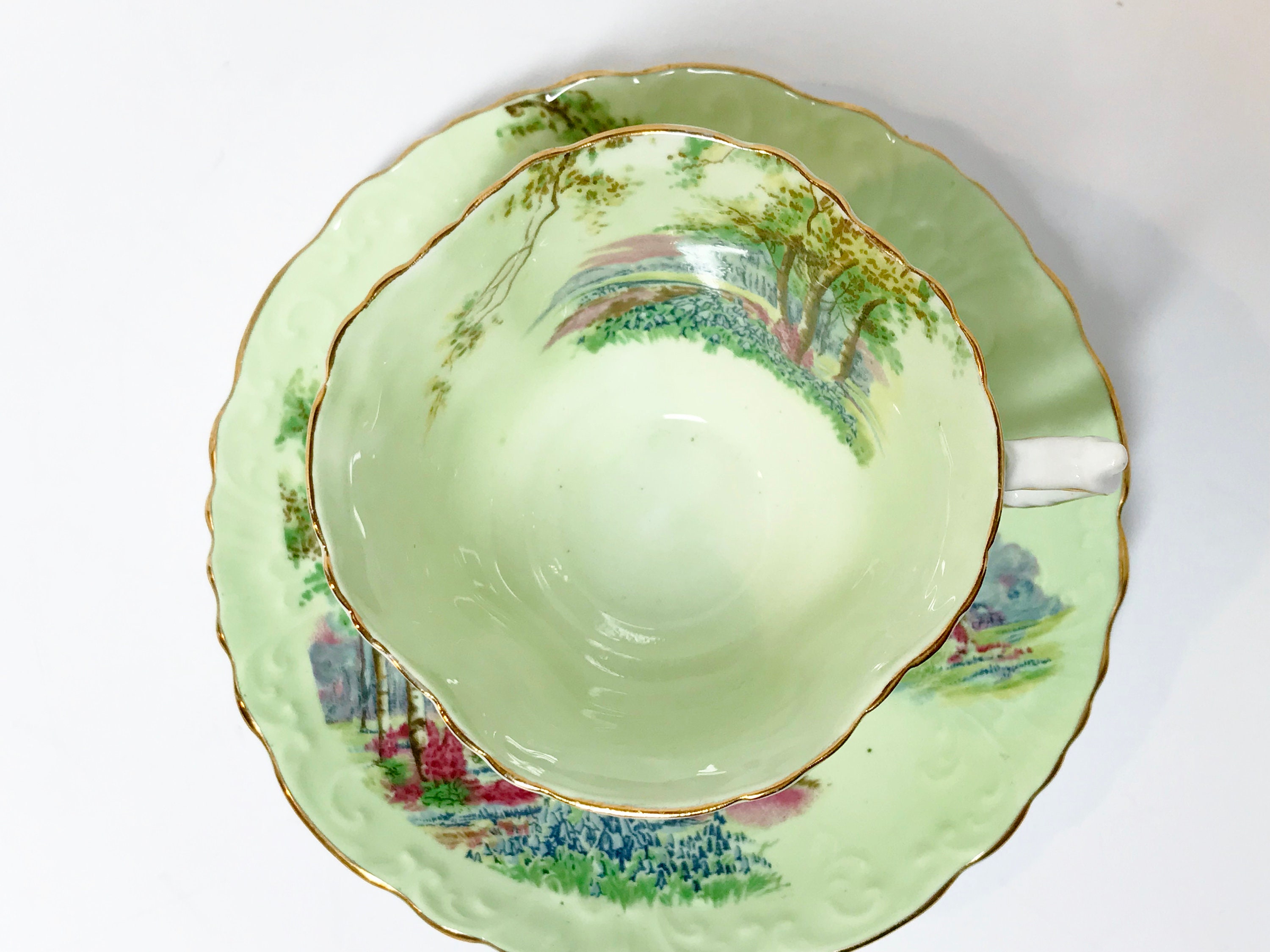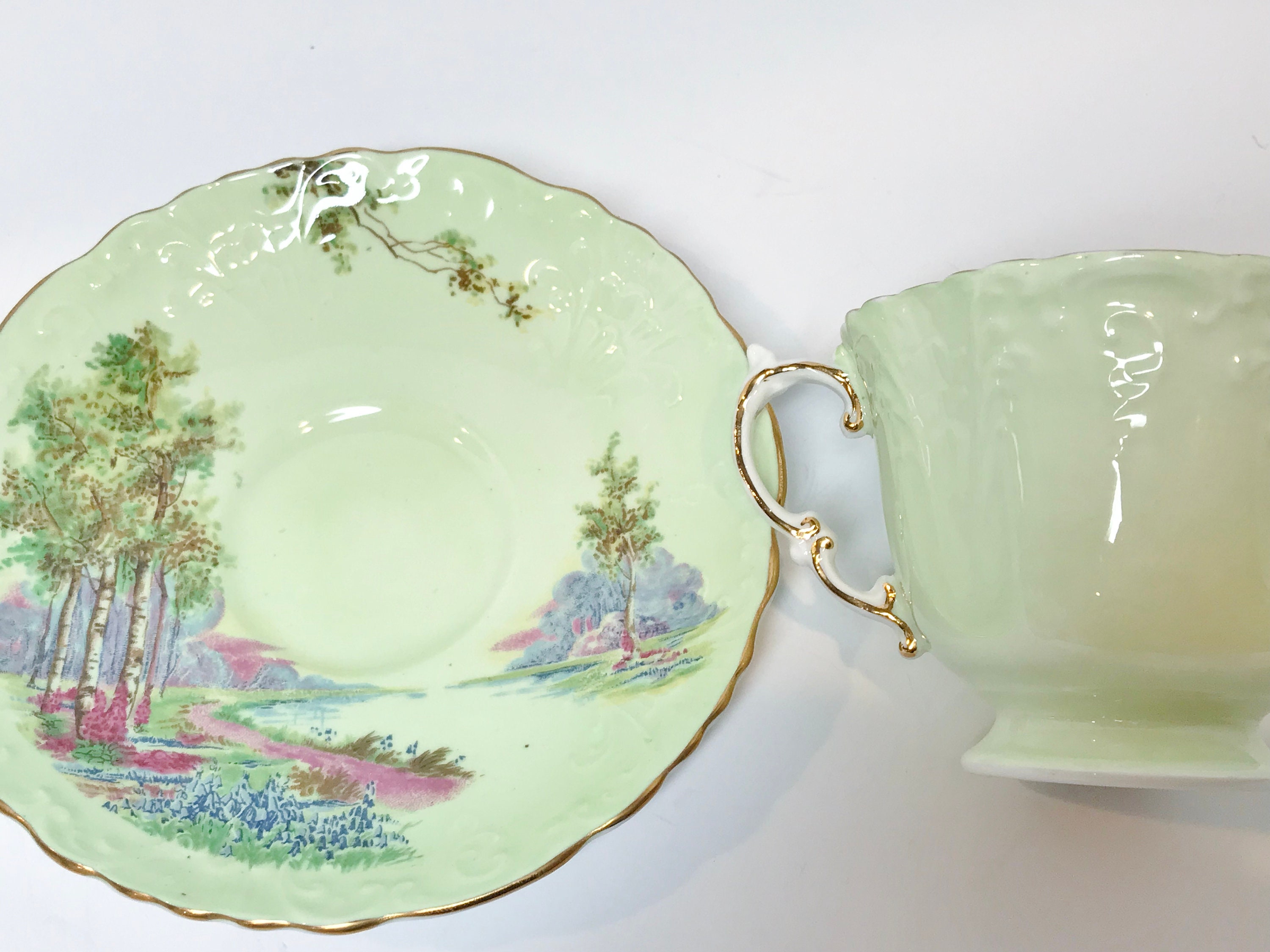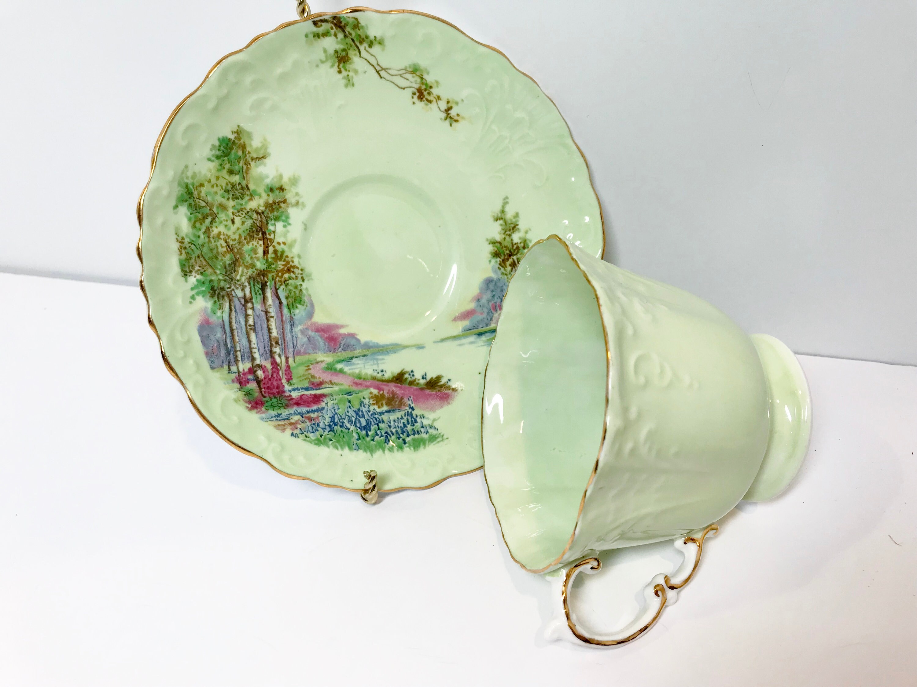 Green Aynsley Tea Cup and Saucer, Antique Tea Cups Vintage, Scenic Tea Cups, Aynsley Cups, Scenic Teacups