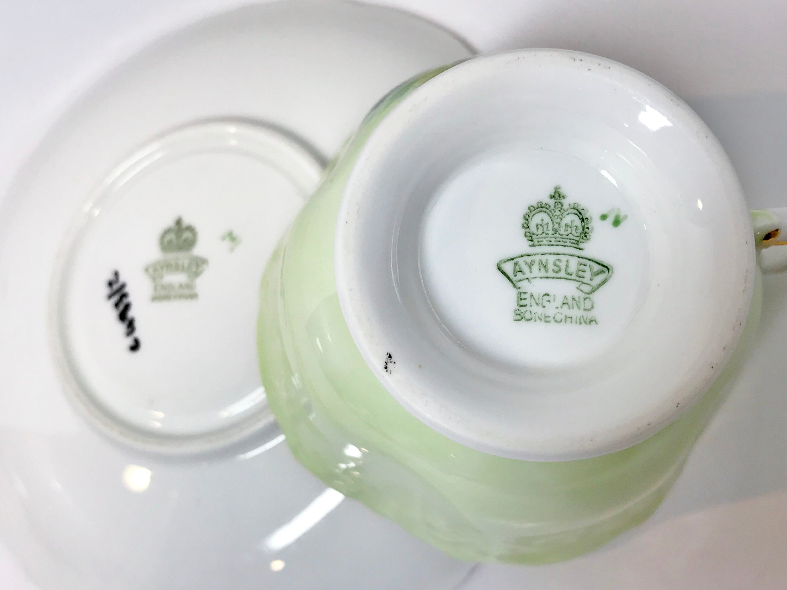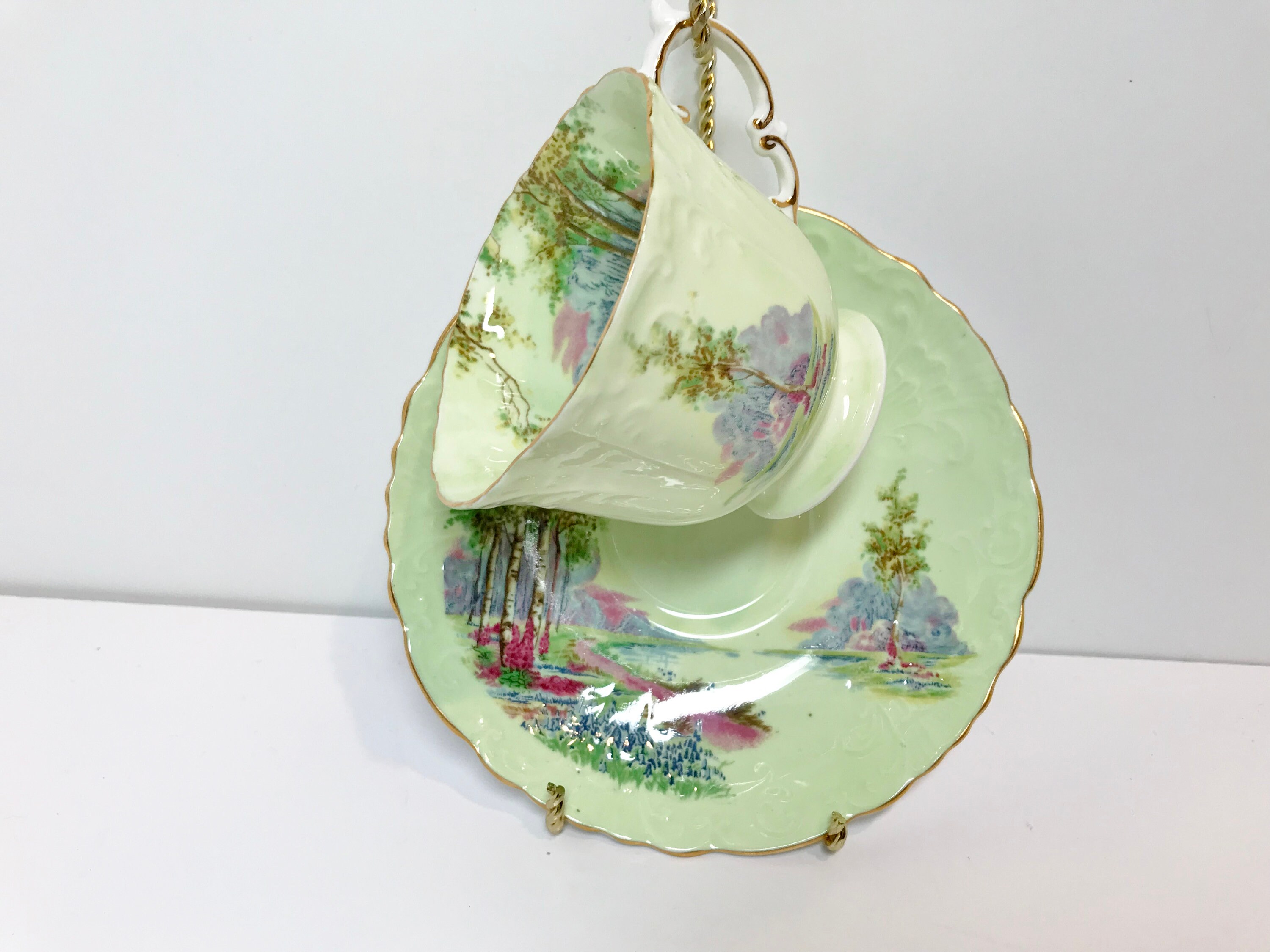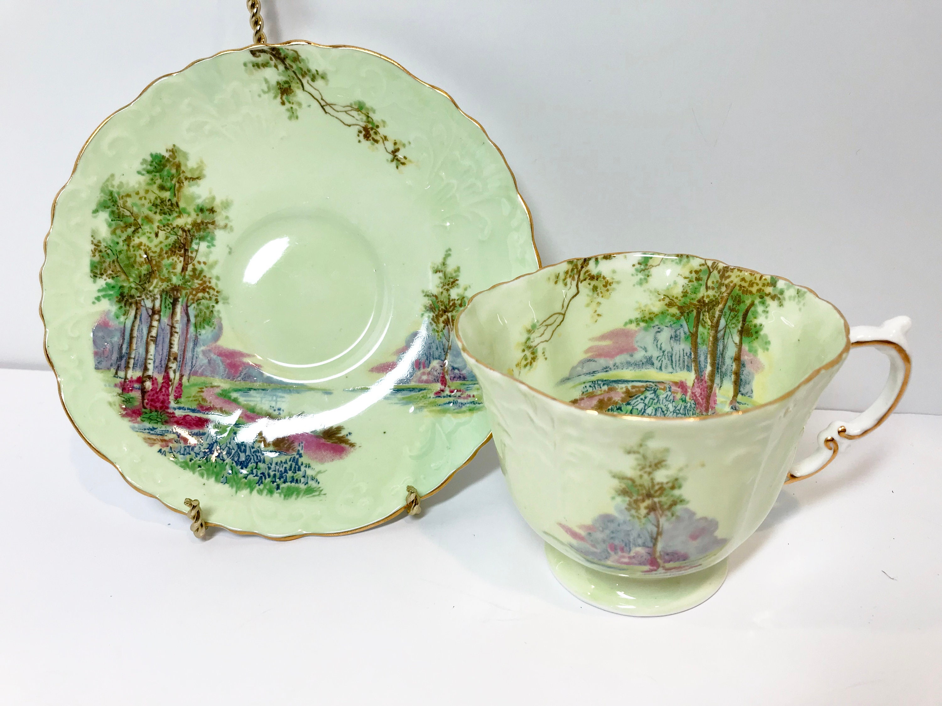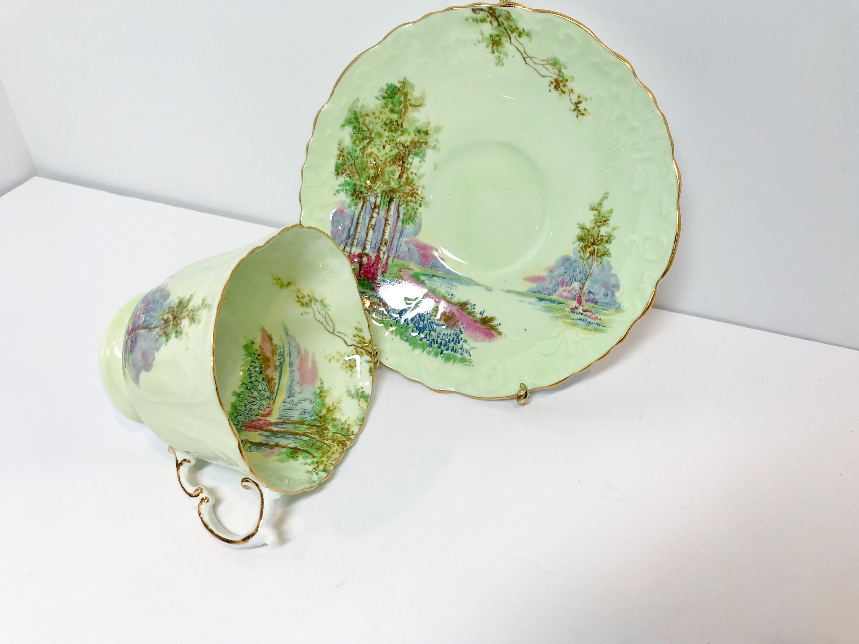 Green Aynsley Tea Cup and Saucer, Antique Tea Cups Vintage, Scenic Tea Cups, Aynsley Cups, Scenic Teacups