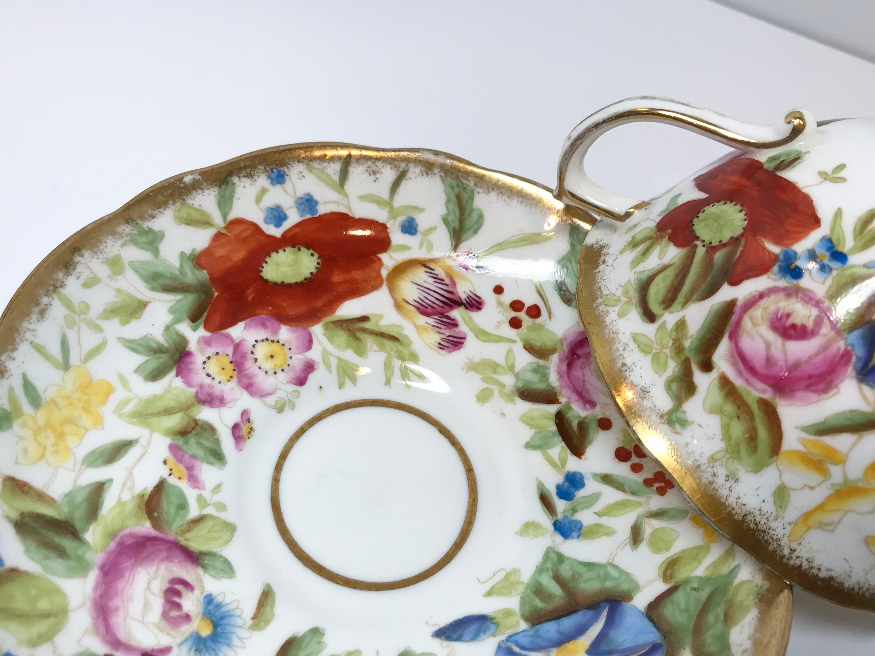 This charming antique tea cup and saucer is in excellent condition. We wish to sell and we prefer to have loyal, satisfied, repeat customers. We do this by fully describing every flaw that we see. Here we have slight gold wear on the saucer rim. There are no chips, cracks or chips. We do not sell damaged items. You may buy with confidence.