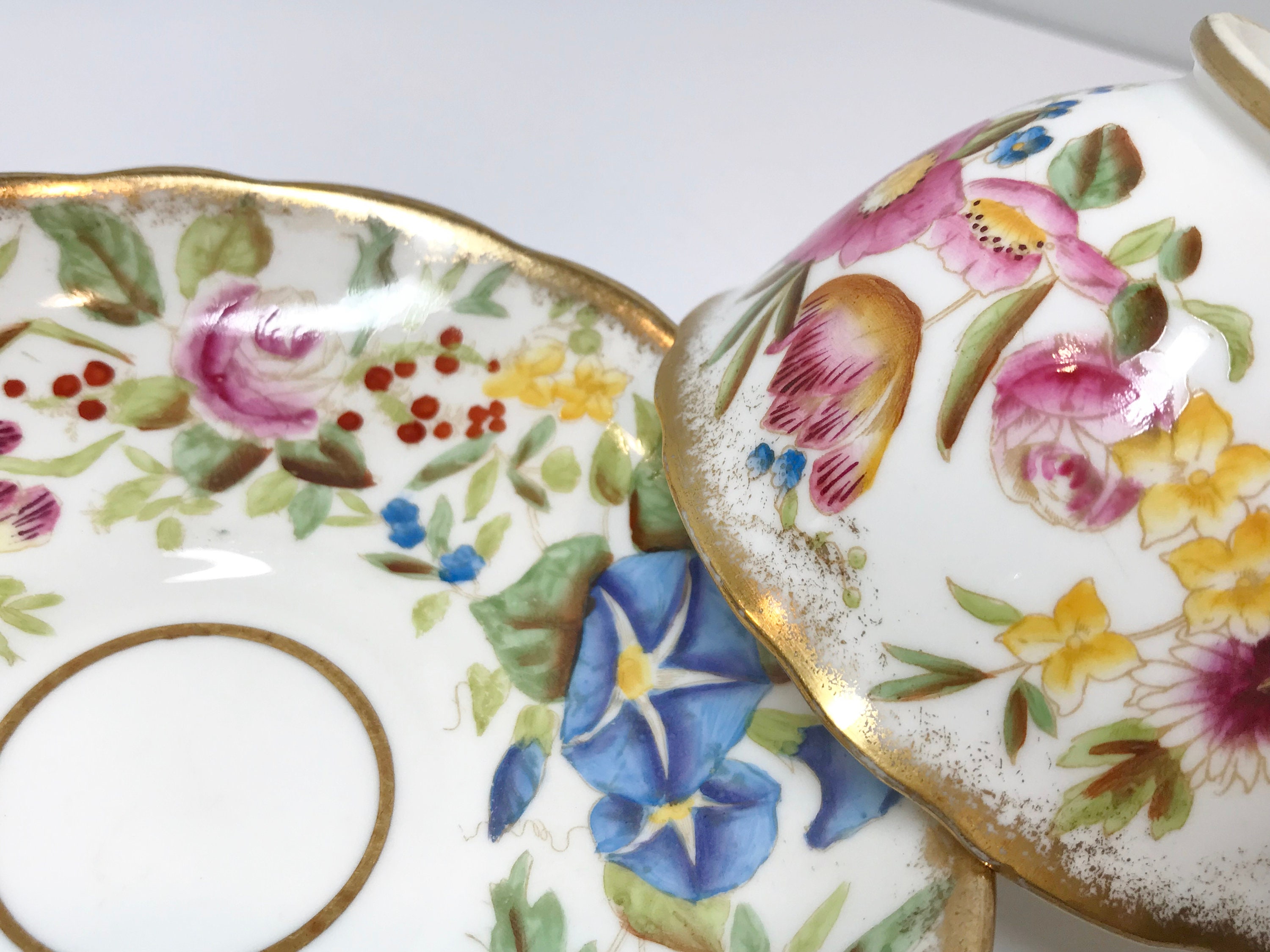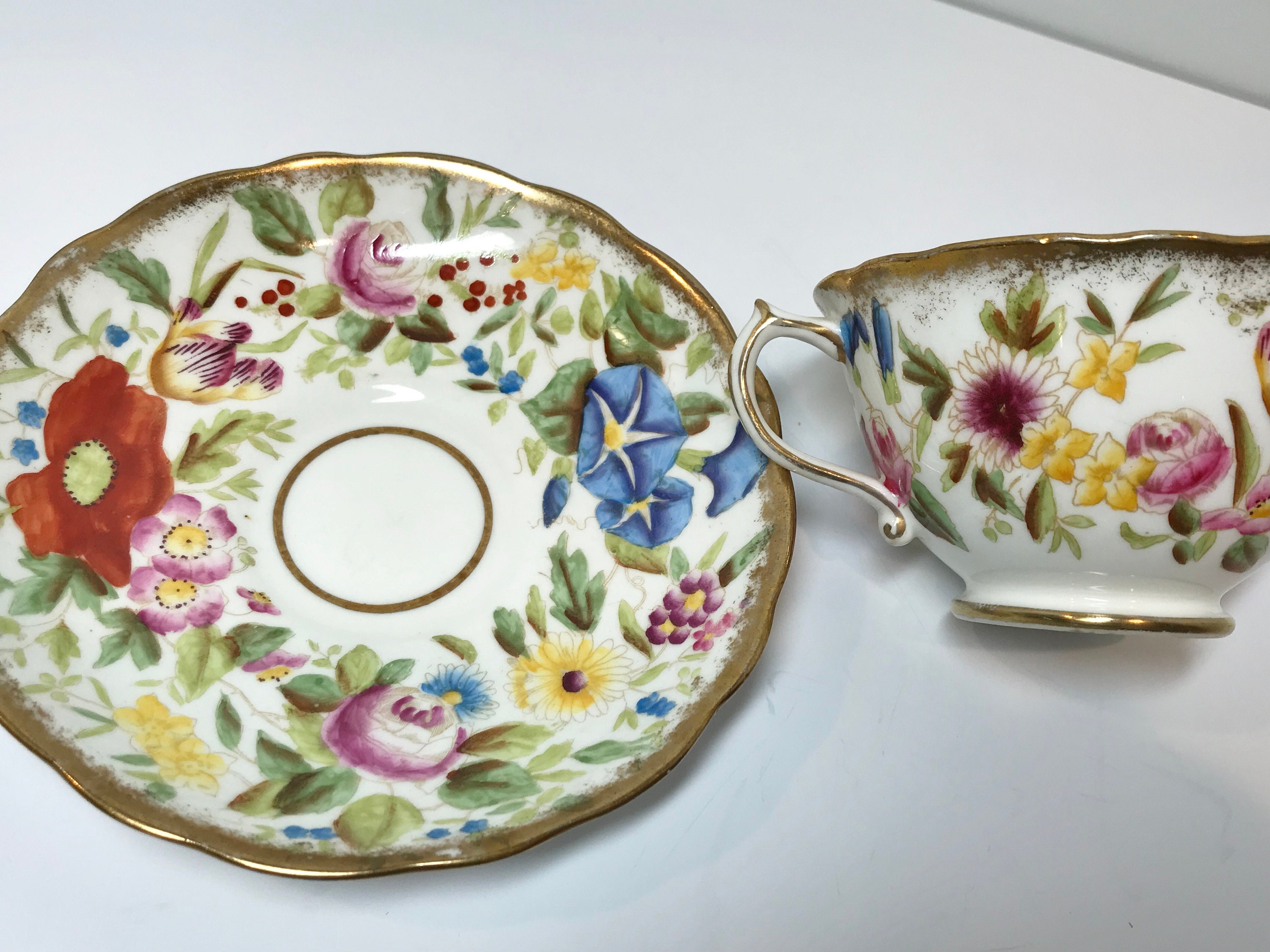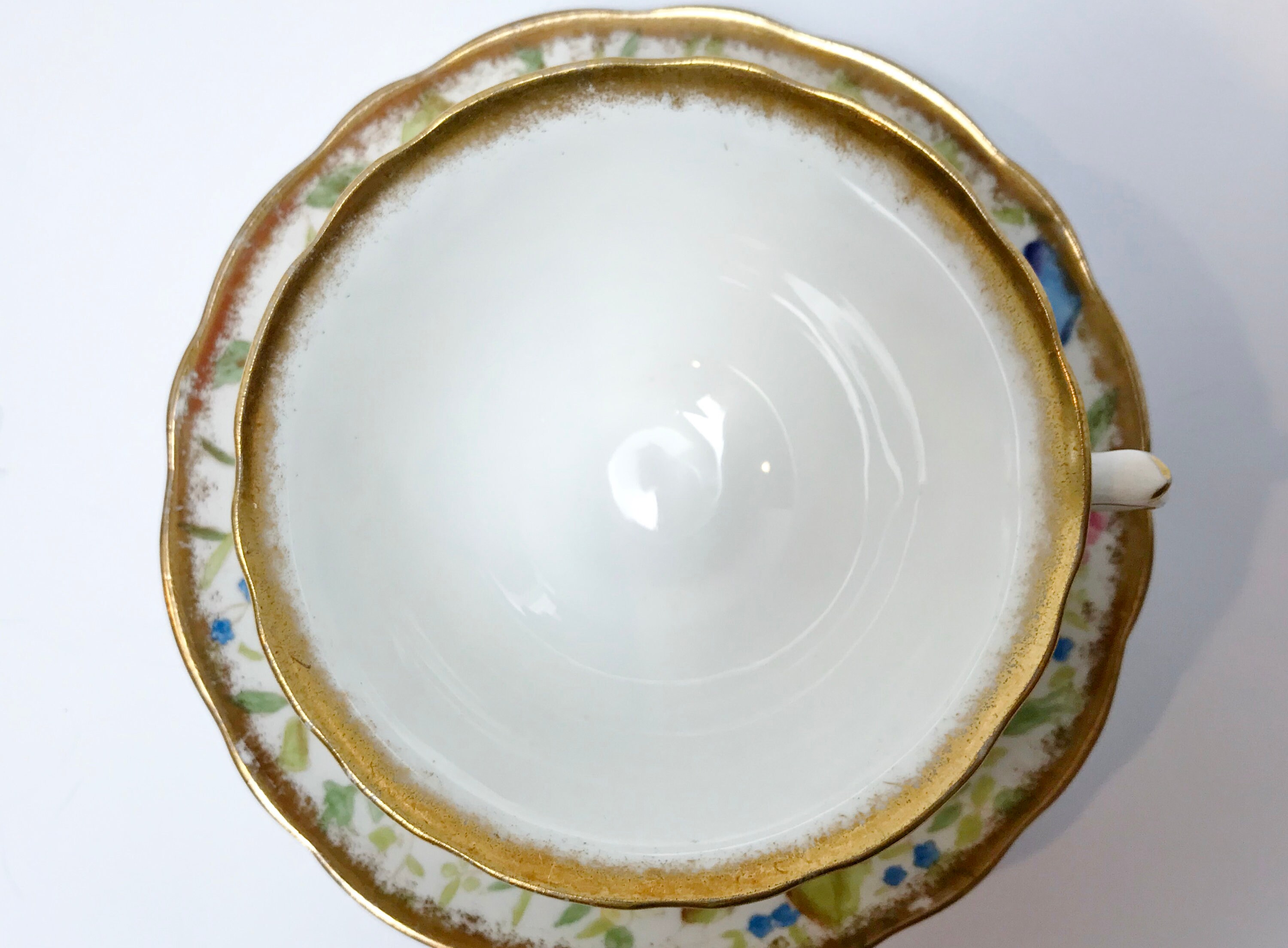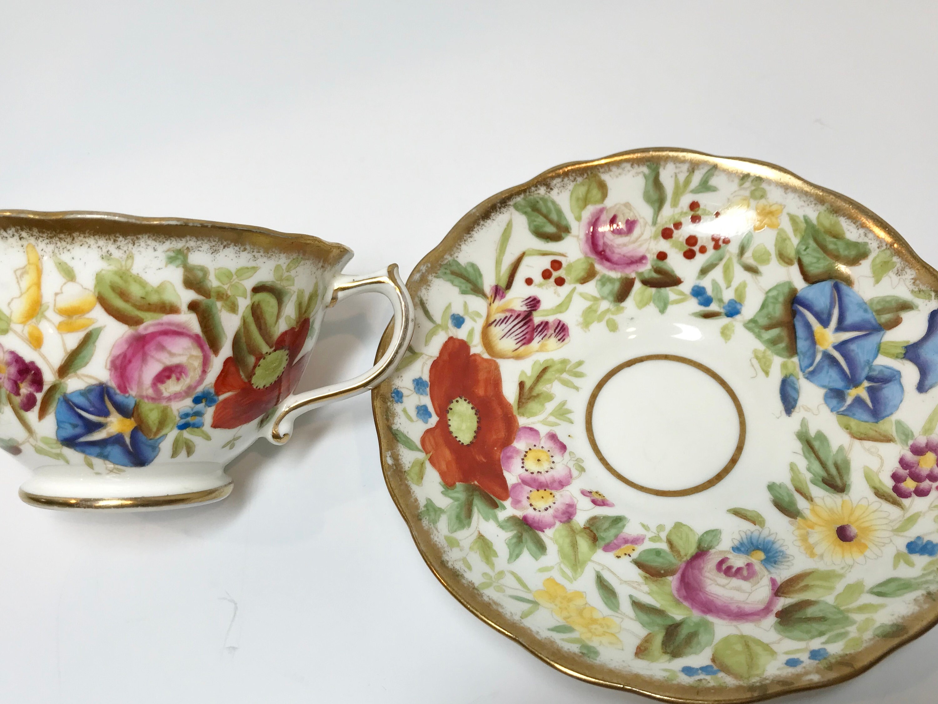 This English bone china teacup with its nod to elegance was crafted in 1939. It is carefully hand painted. We have taken a few pictures so that you may see the brush strokes.