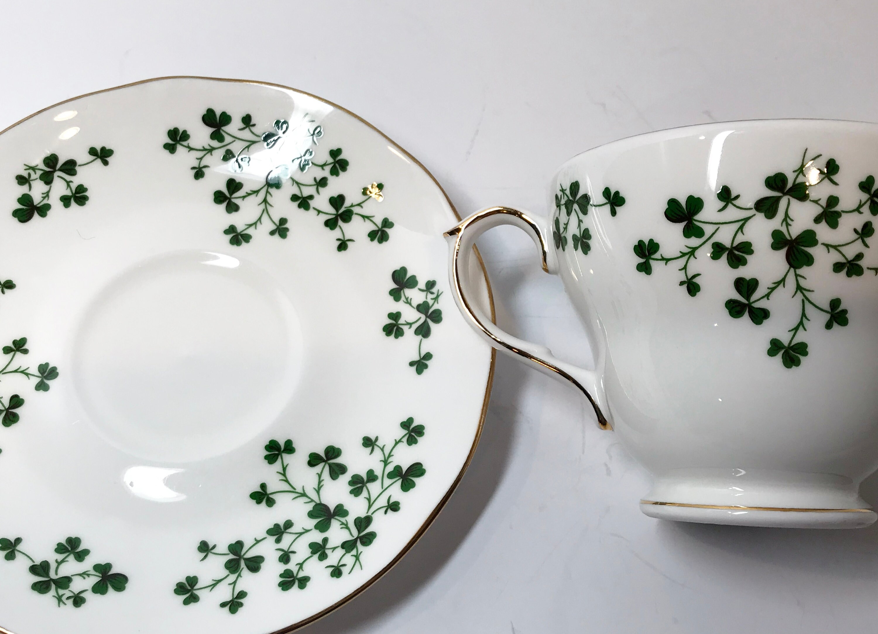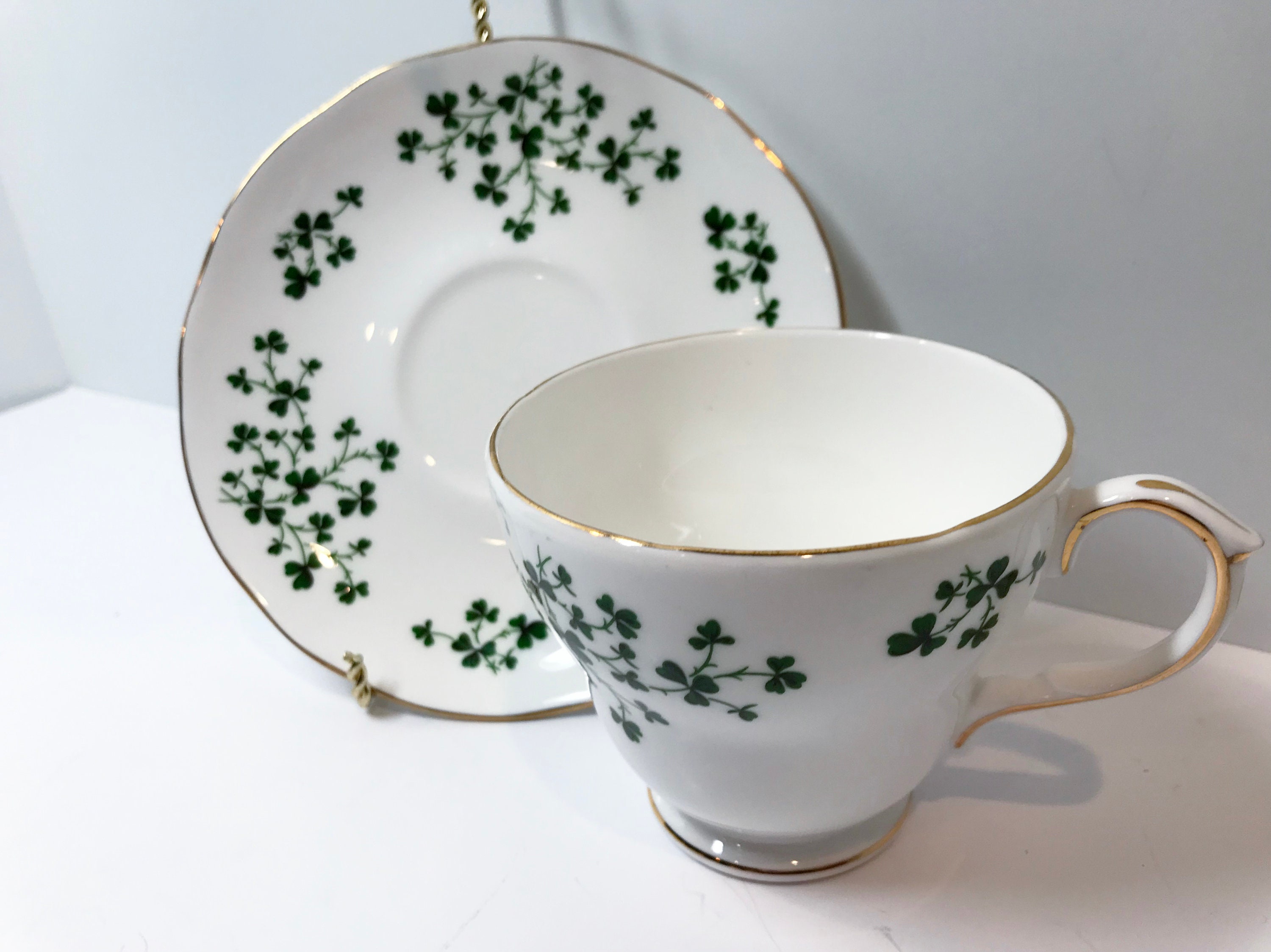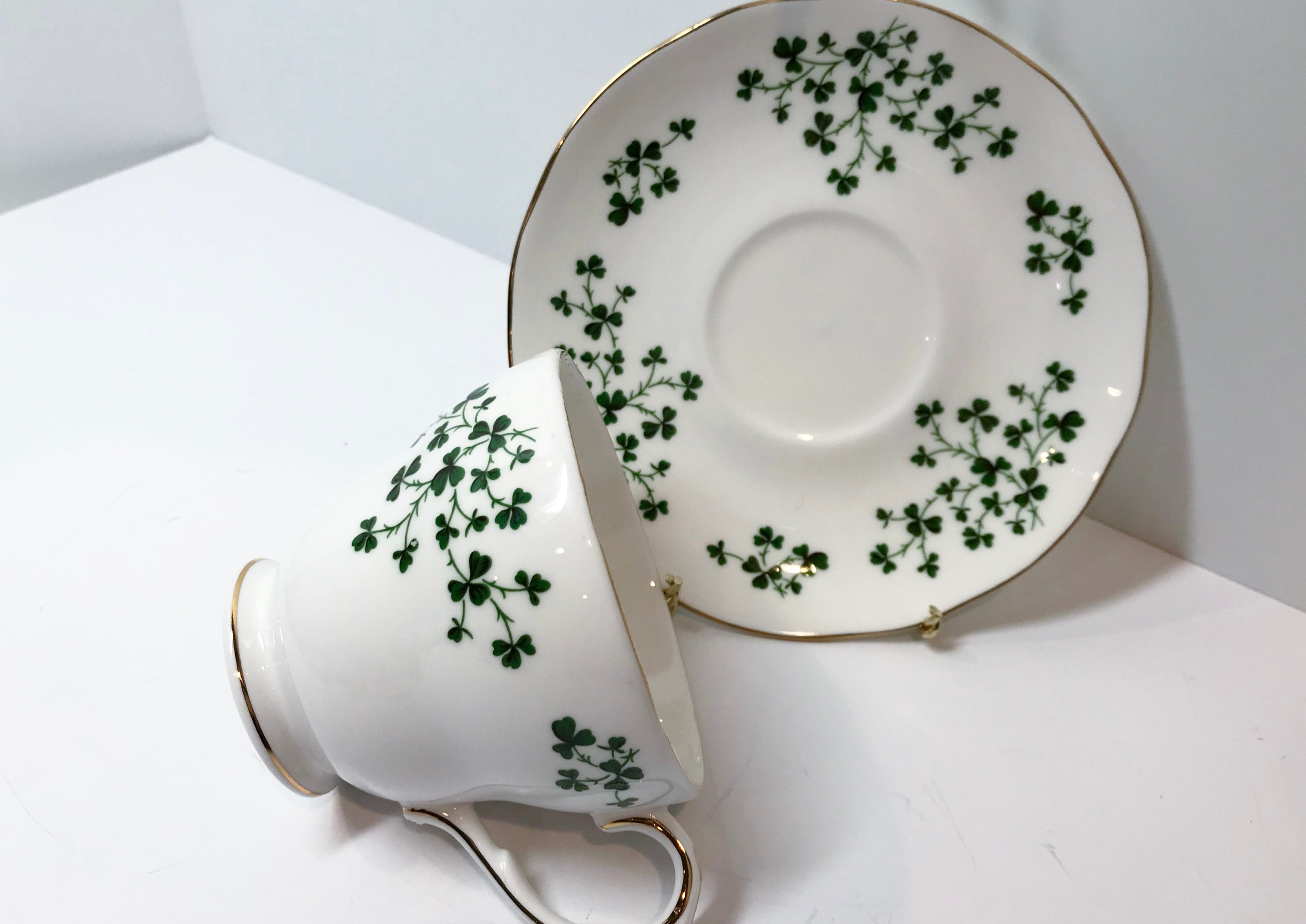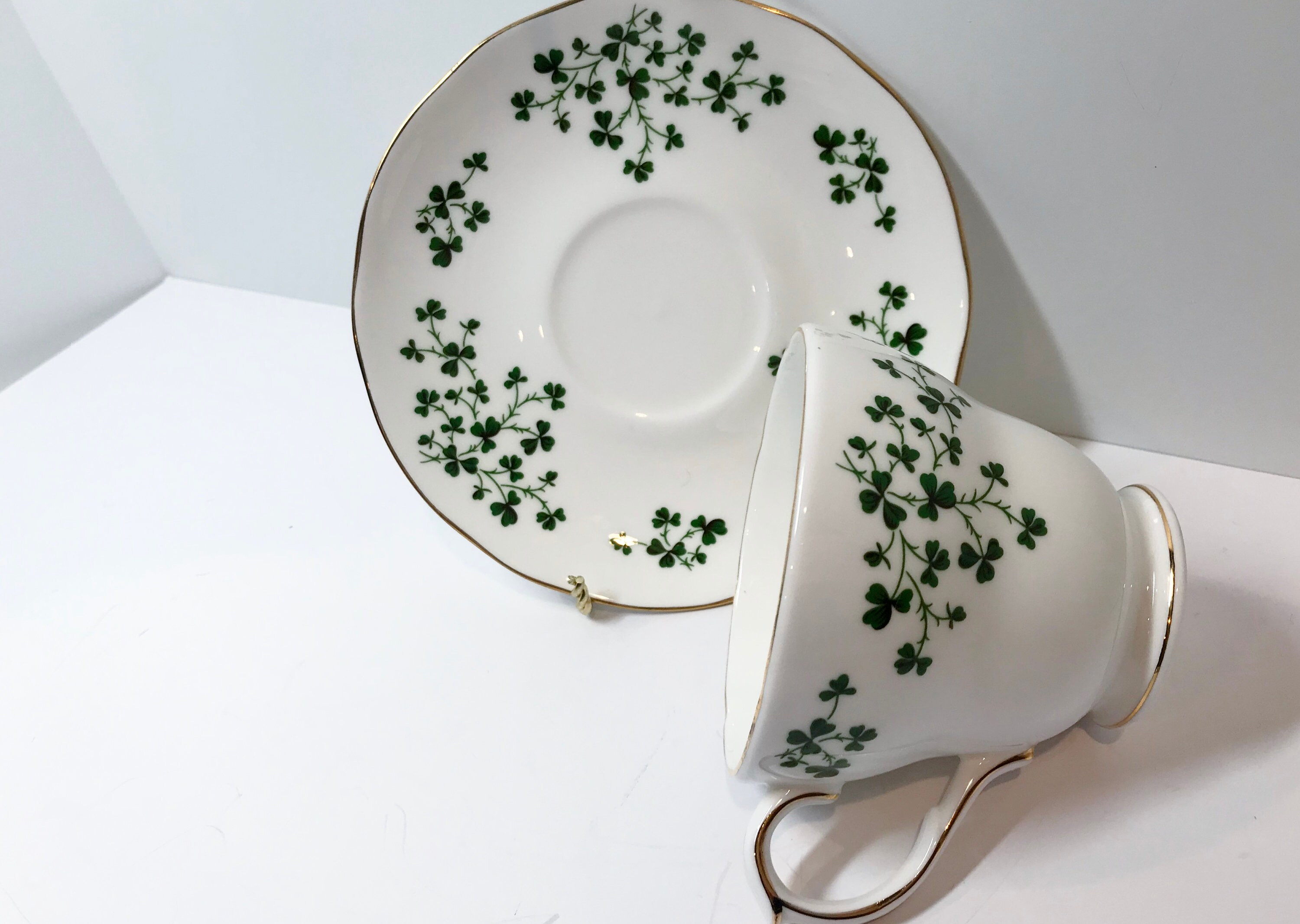 This shamrock bone china teacup and saucer is by Winchester Bone China of England.