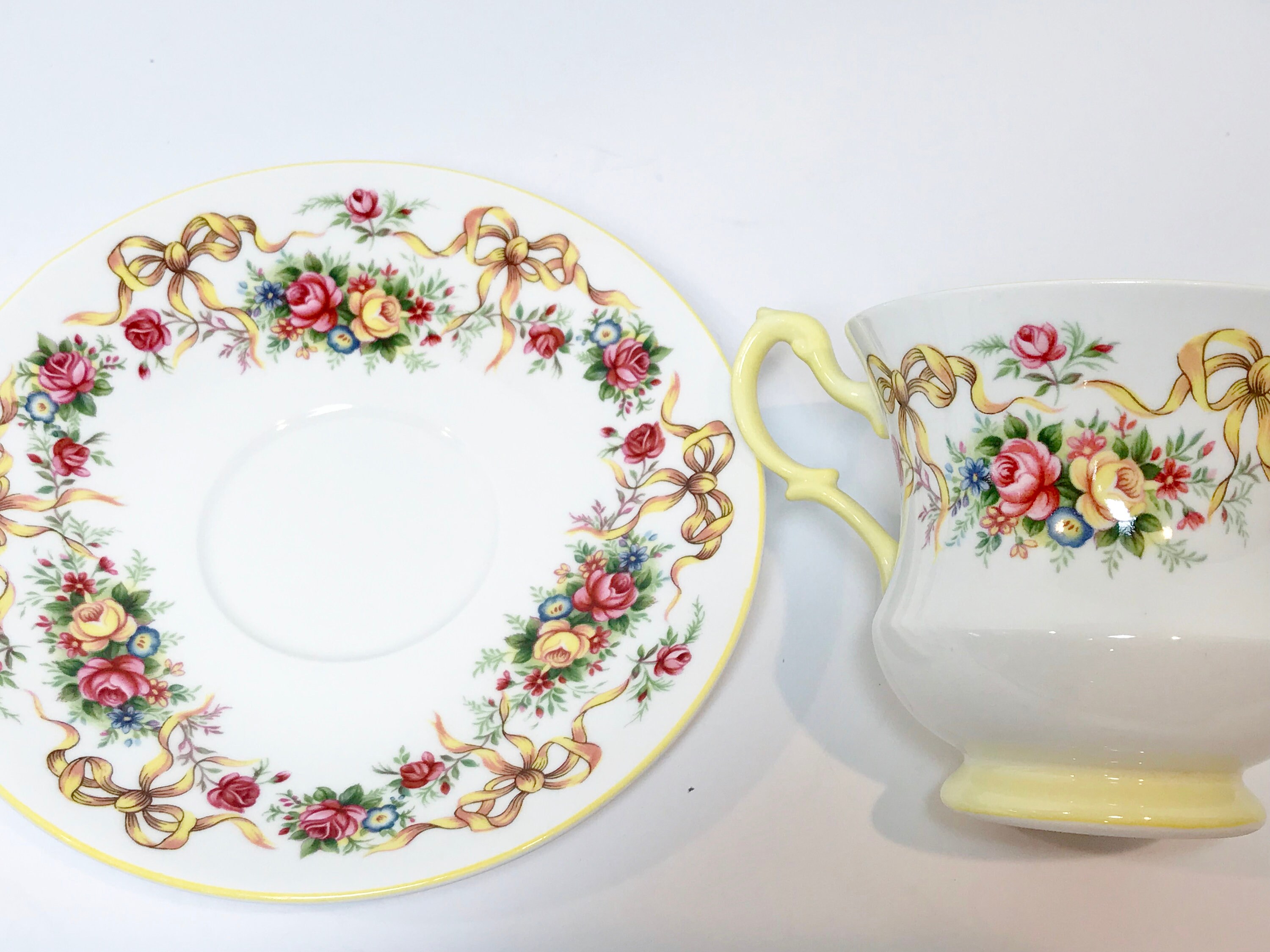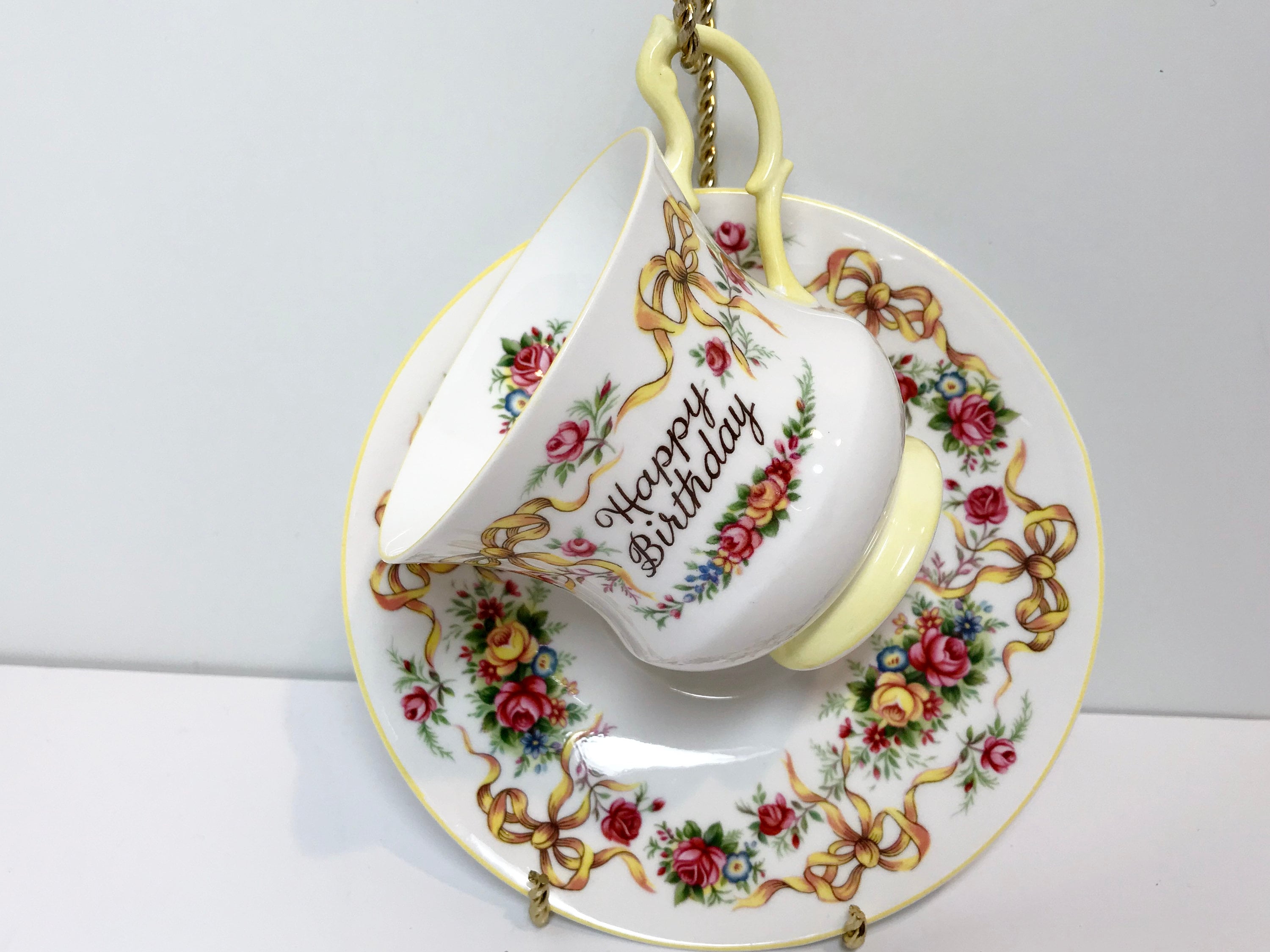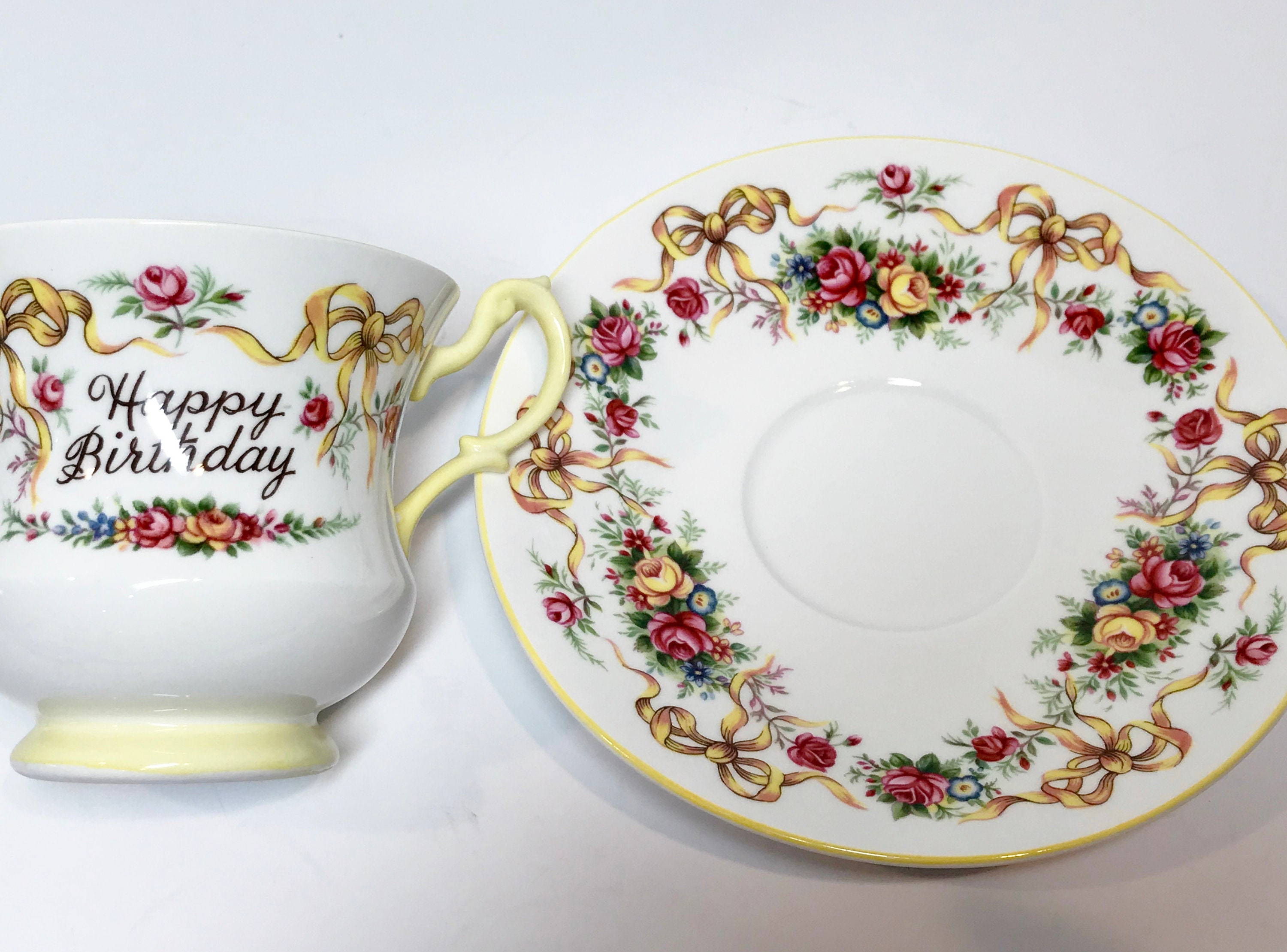 Happy Birthday Queens Tea Cup and Saucer, Ribbon Tea Cups, Yellow Ribbon Tea Cup, Antique Teacups, Birthday Ribbon Cup, Antique Tea Cups