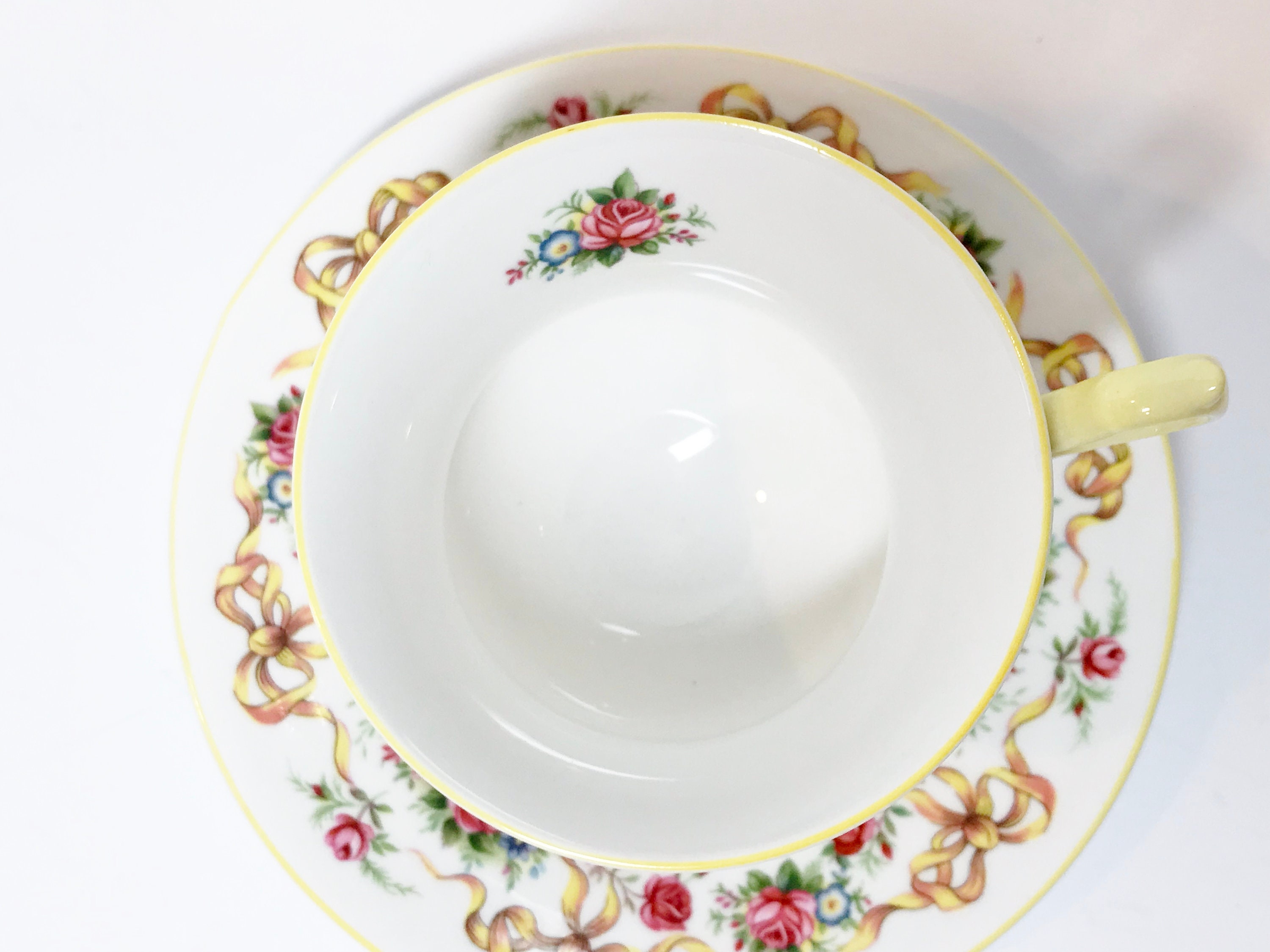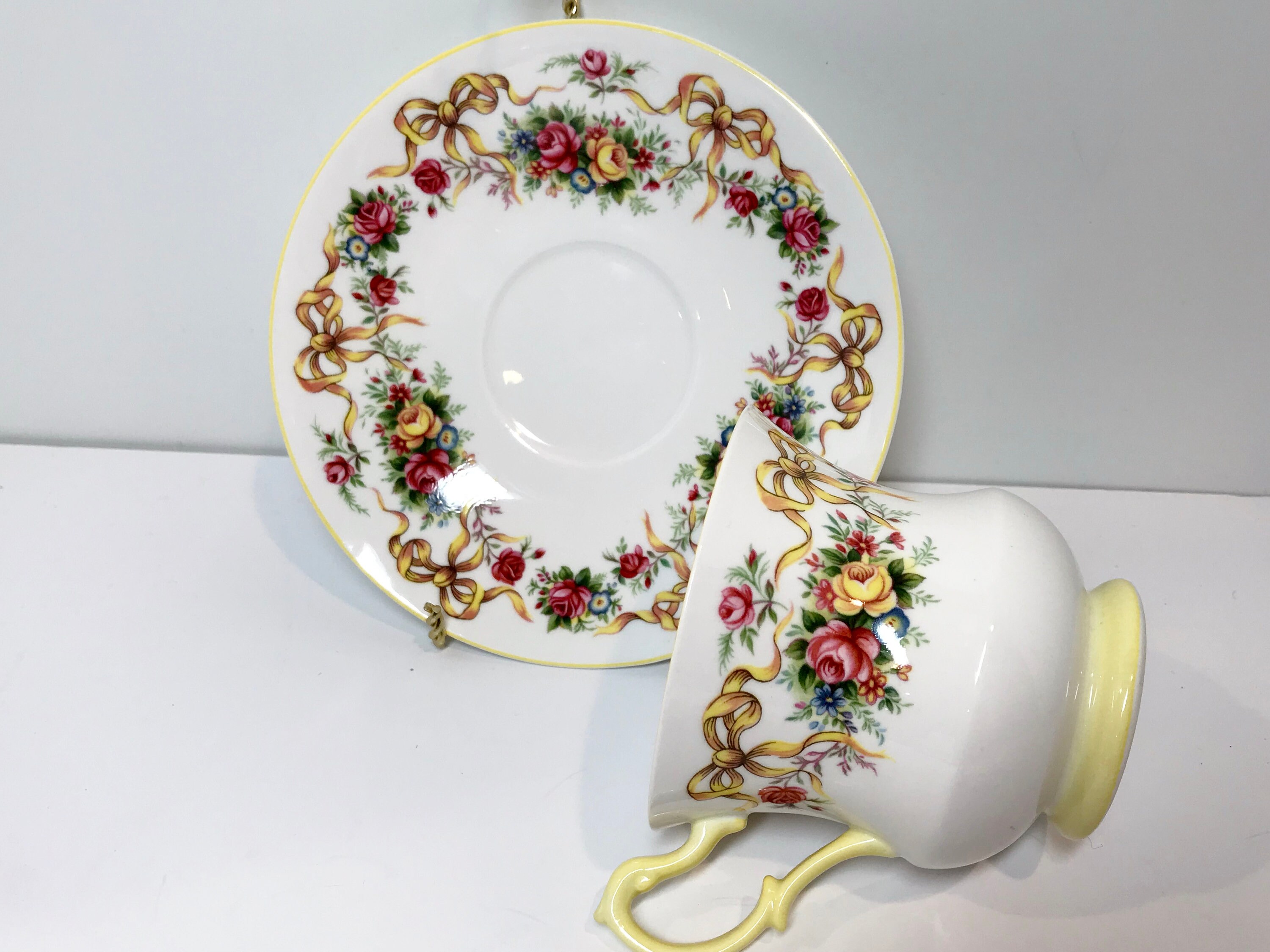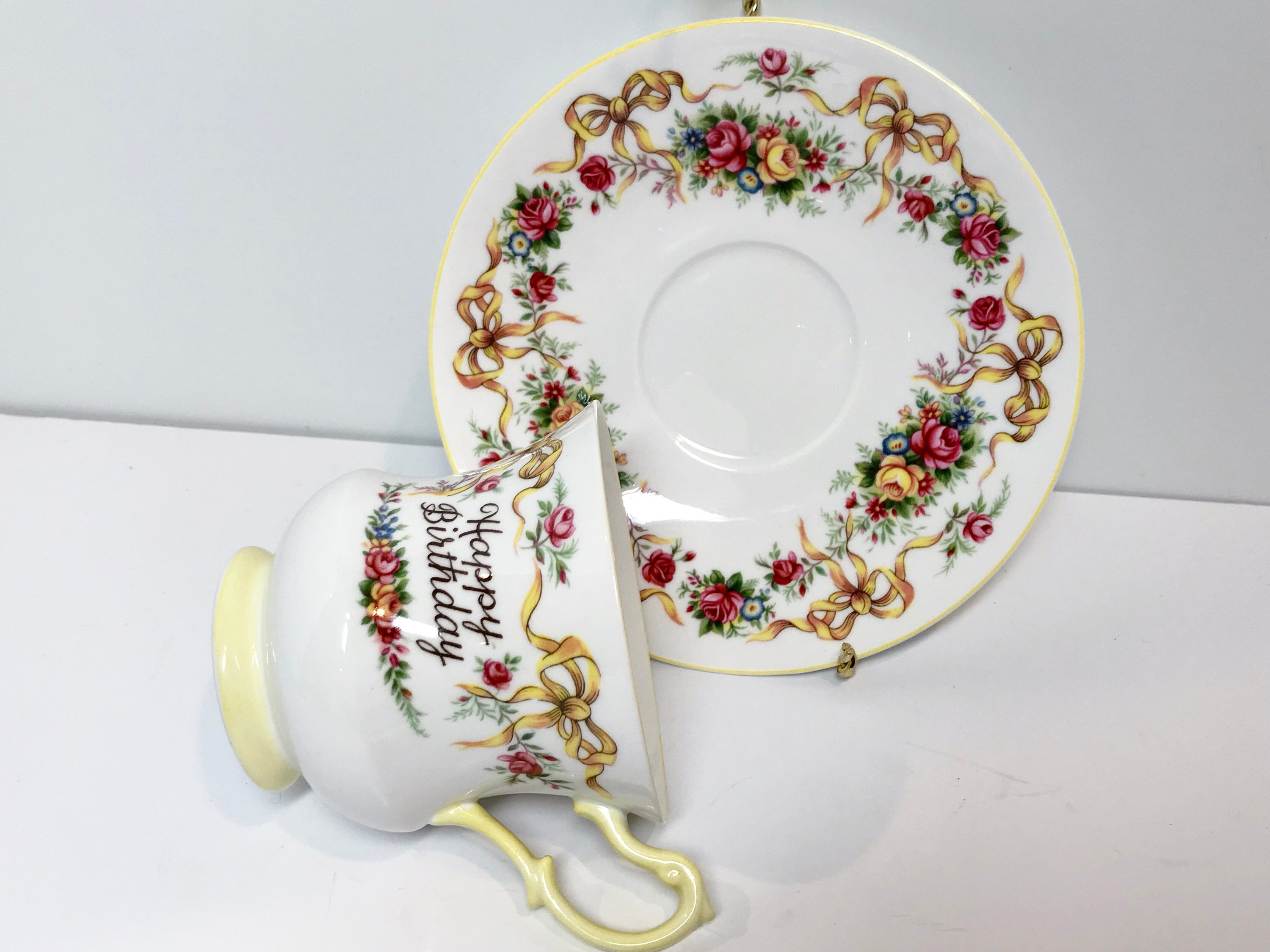 Happy Birthday Queens Tea Cup and Saucer, Ribbon Tea Cups, Yellow Ribbon Tea Cup, Antique Teacups, Birthday Ribbon Cup, Antique Tea Cups
