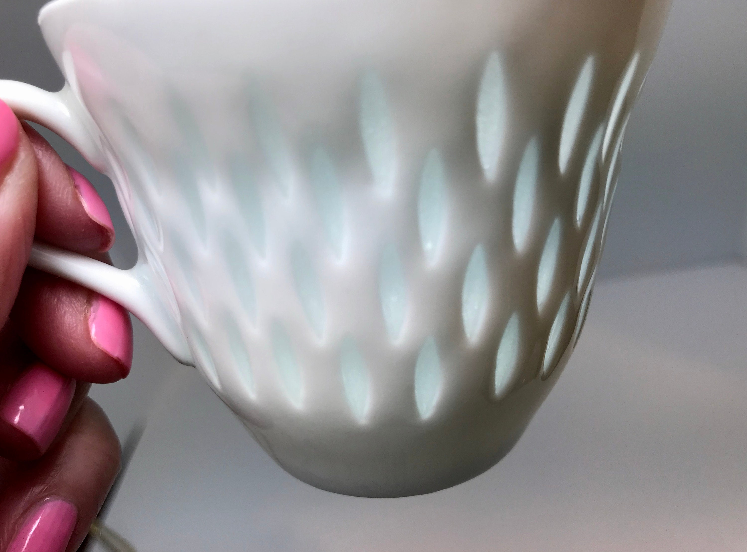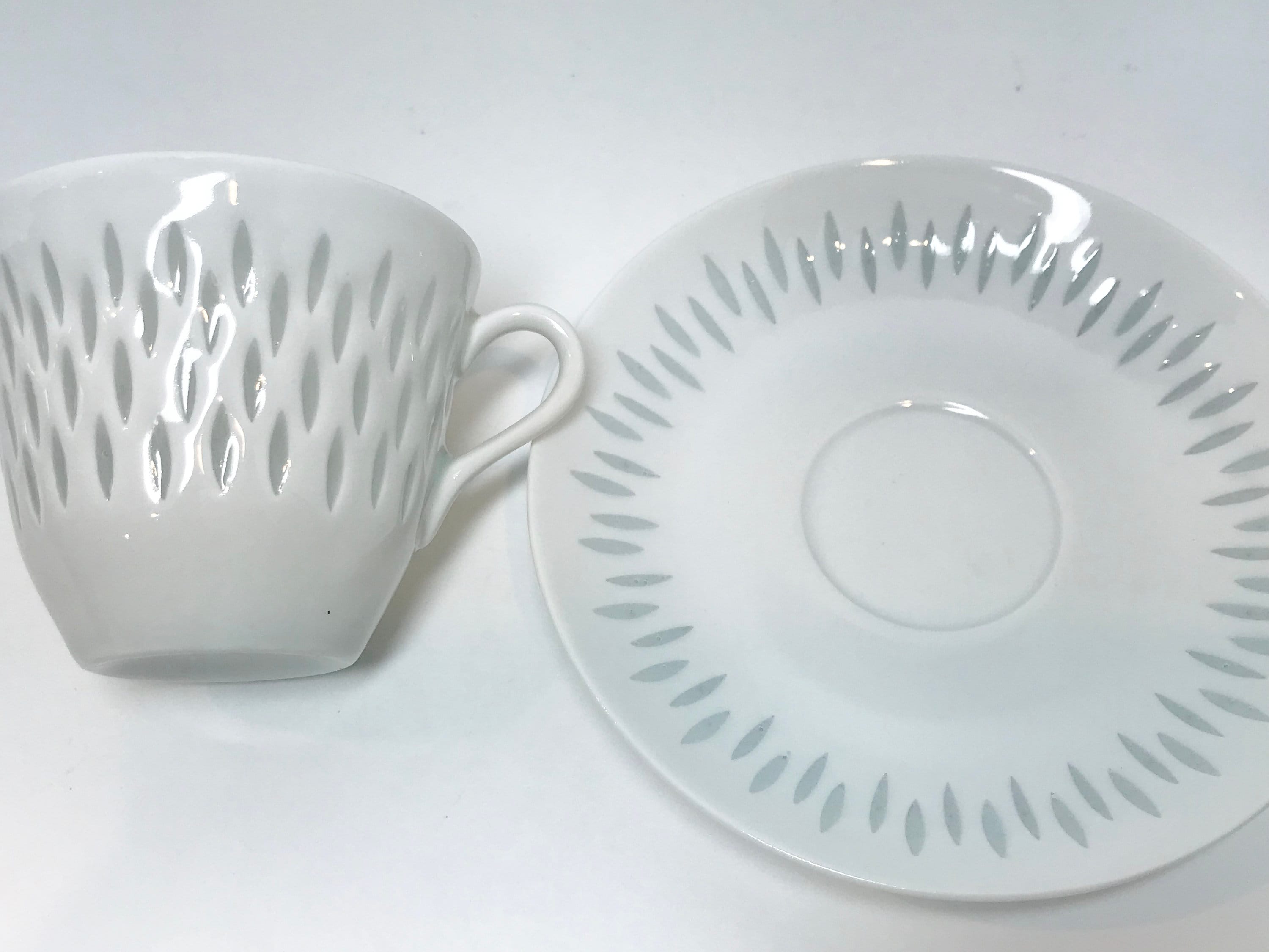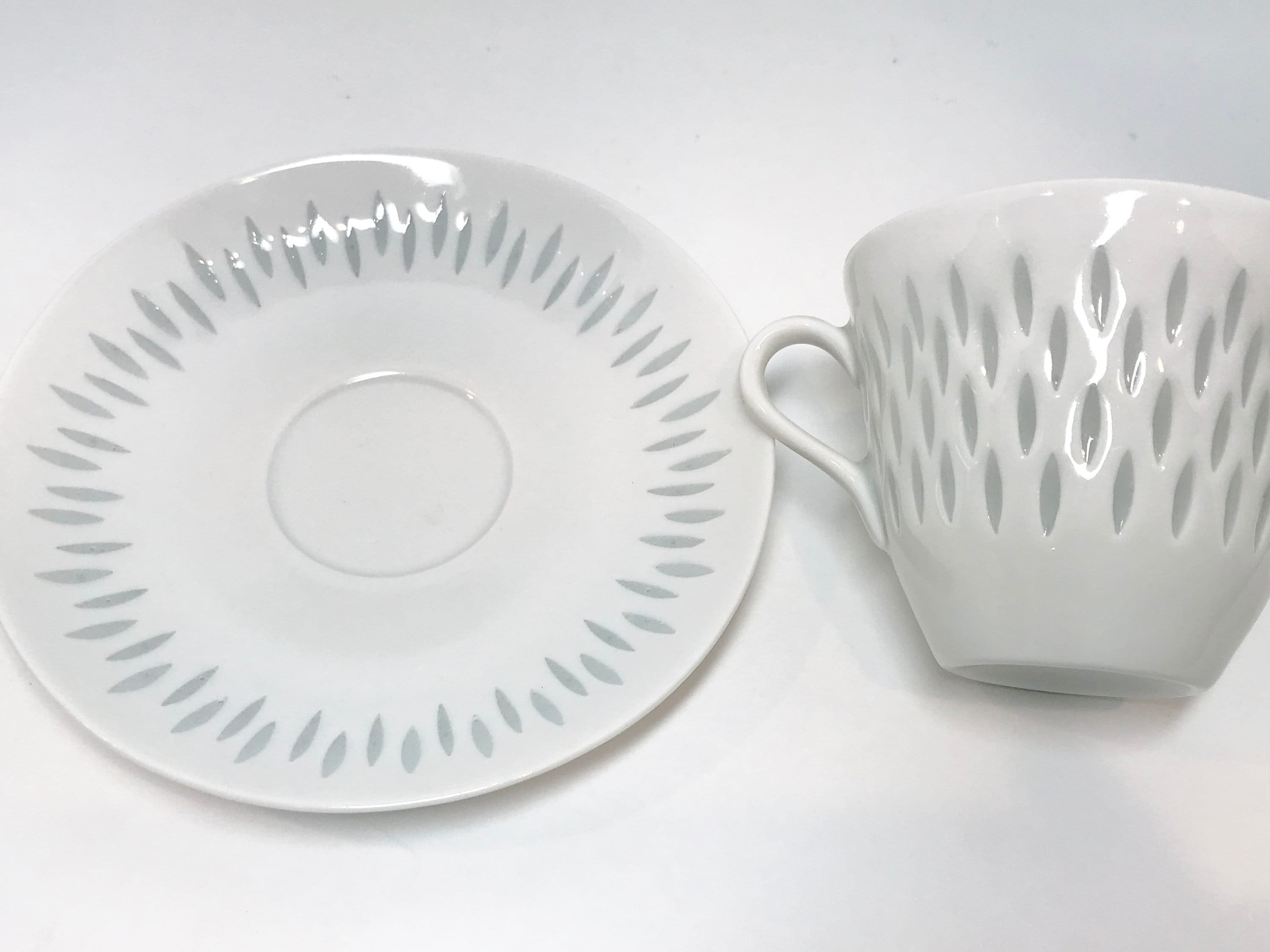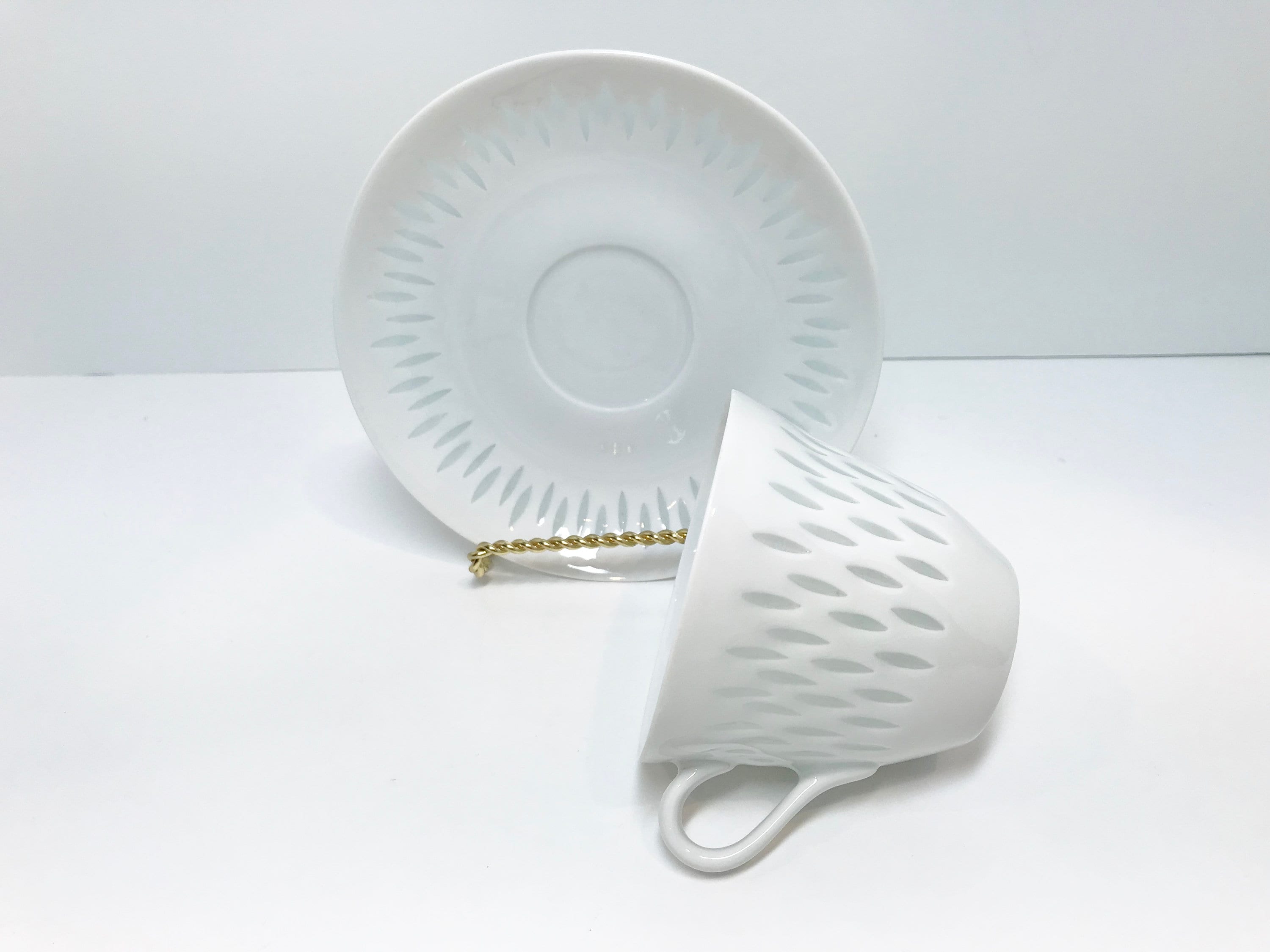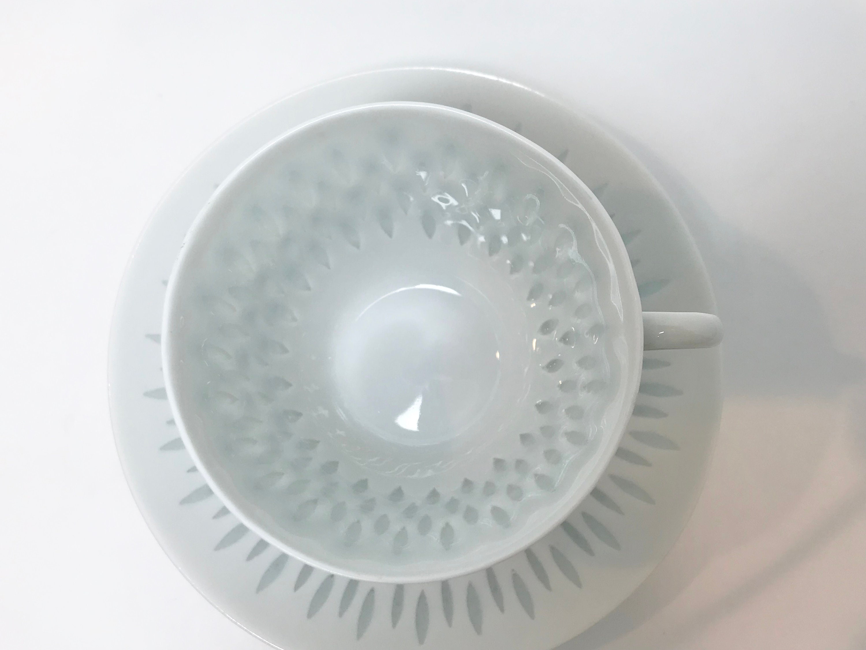 Arabia of Finland has been collected for decades. This is a special teacup and saucer because of the design. It is carefully created so that the clay is almost cut through in little ovals. The little streams through. It is also difficult to photograph when one wants to illustrate that fact.