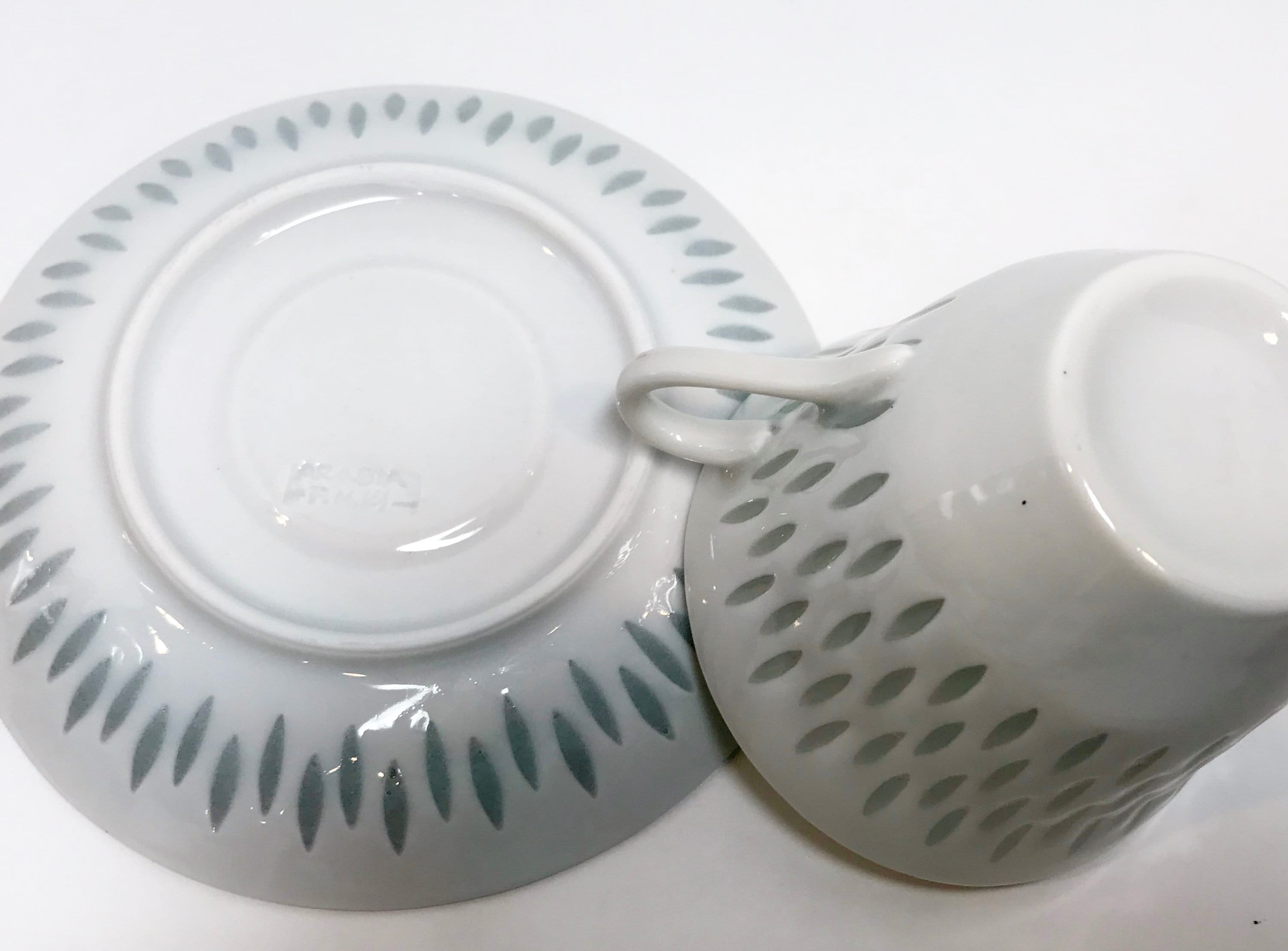 The inscribed words on the bottom of the saucer are Arabia Finland. Some call this pattern, white with translucent grains, or rice grains.
