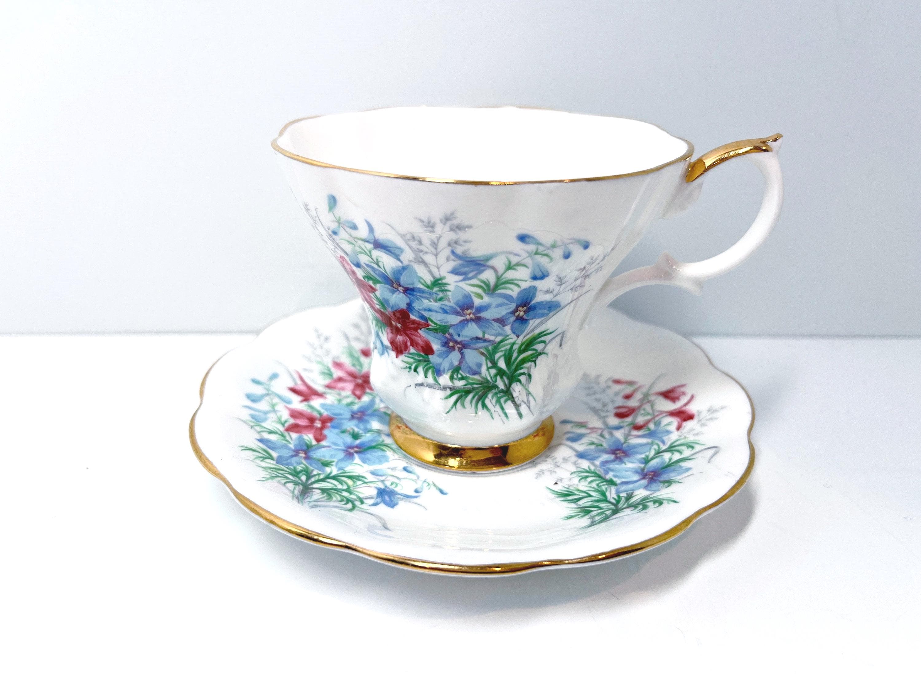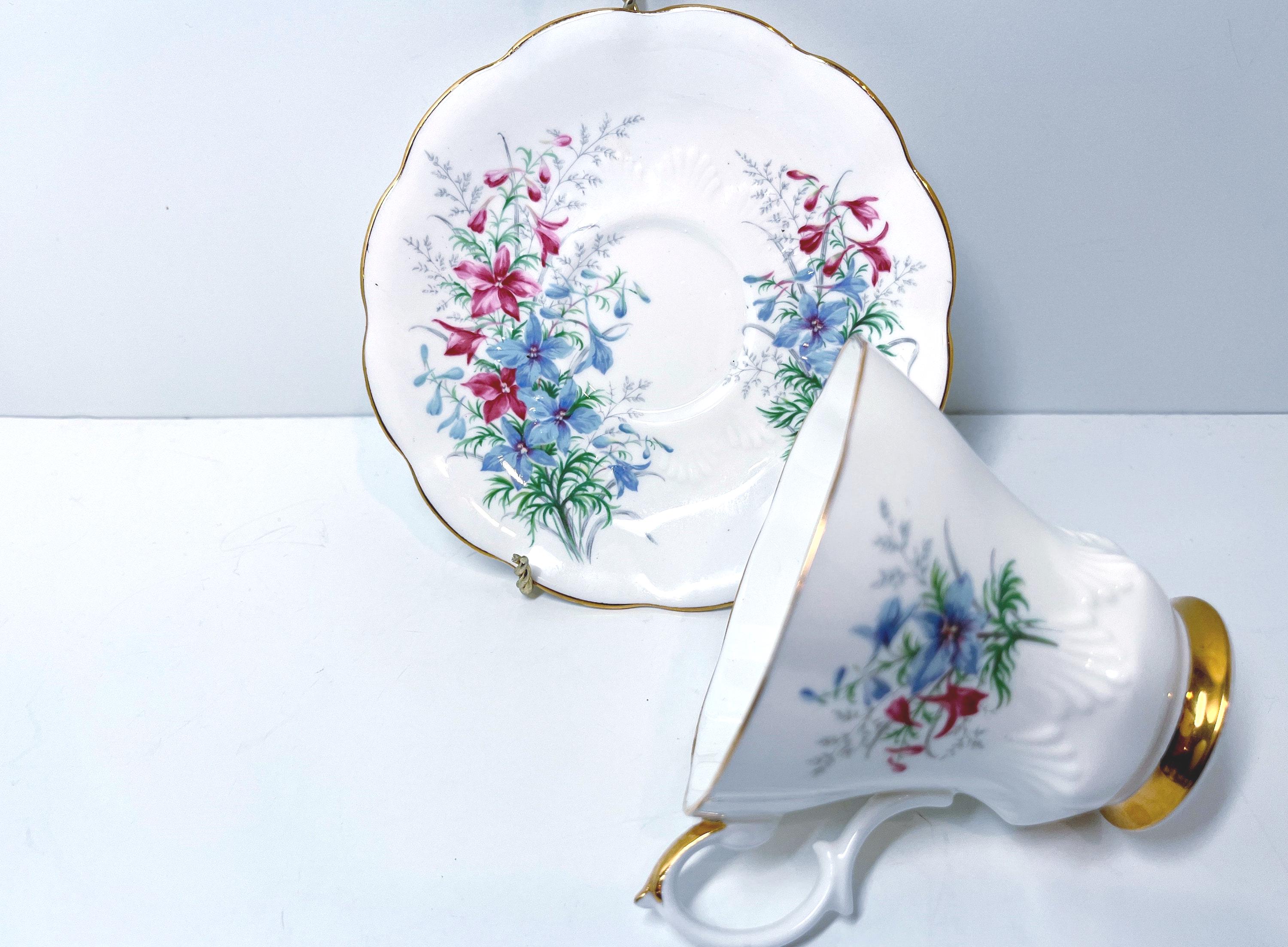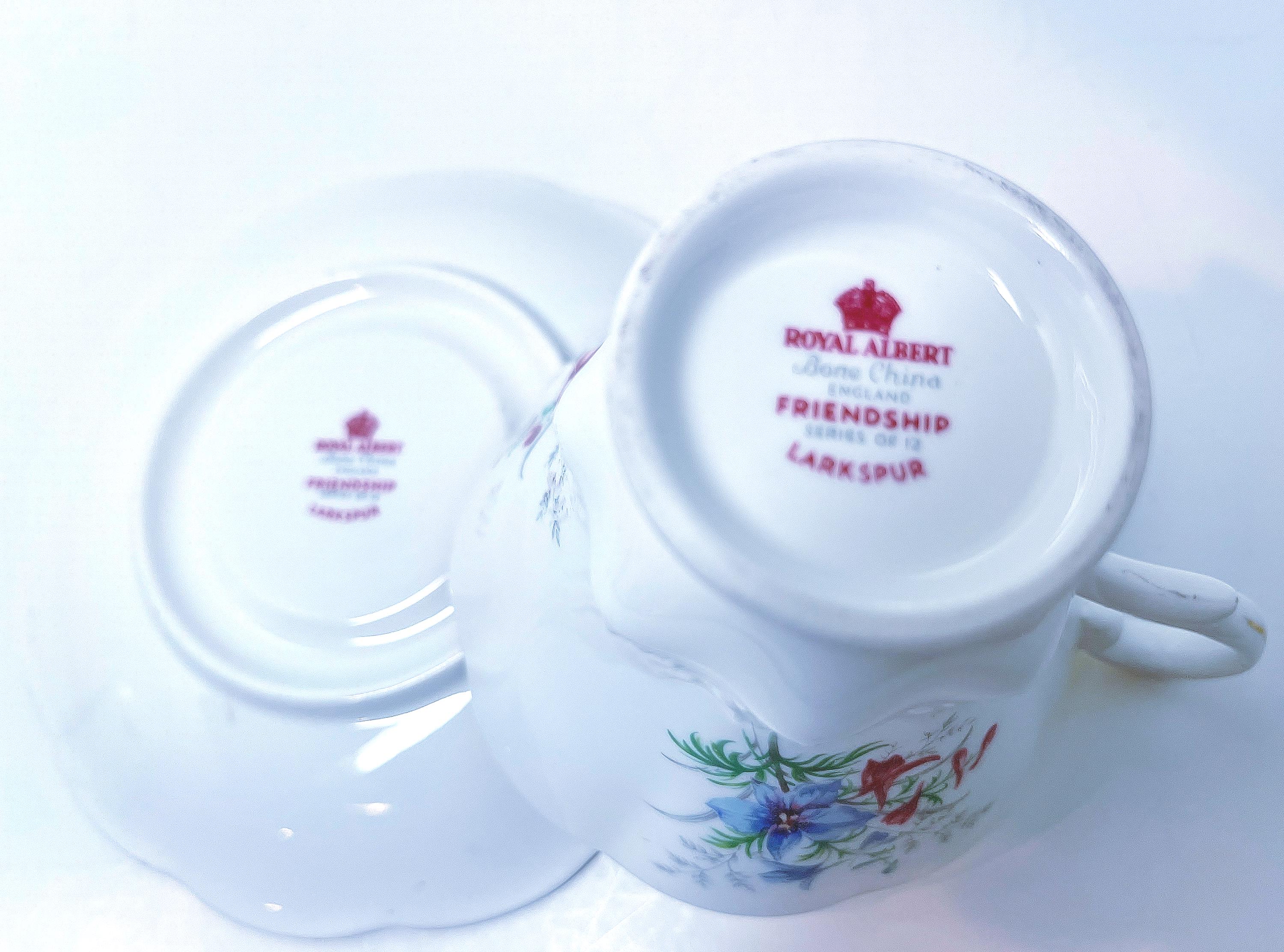 Royal Albert proudly introduced their Friendship series in the 1950s. It flourished until the 1970s. There were twelve blossoms in the issue. This is Larkspur and it is on the Lyric shaped teacup and saucer. The bouquets have a delicate air with fresh green leaves. The bone china has a soft fan design in it and both pieces have gentle curves which create a scalloped rim and saucer edge.