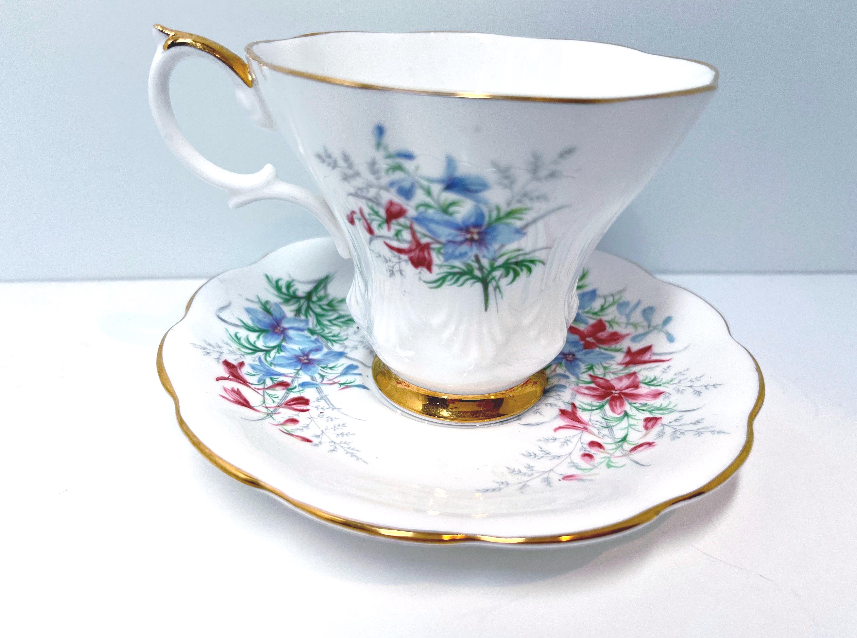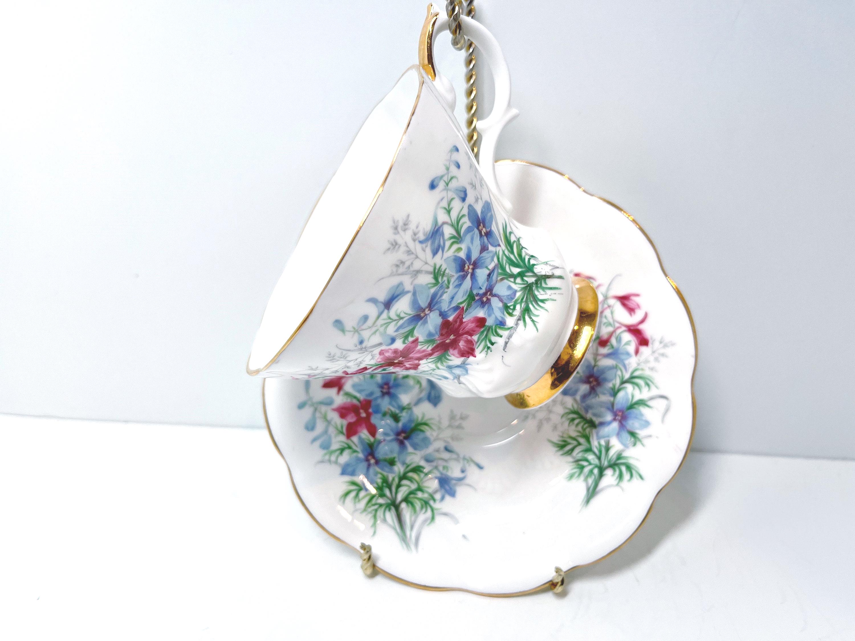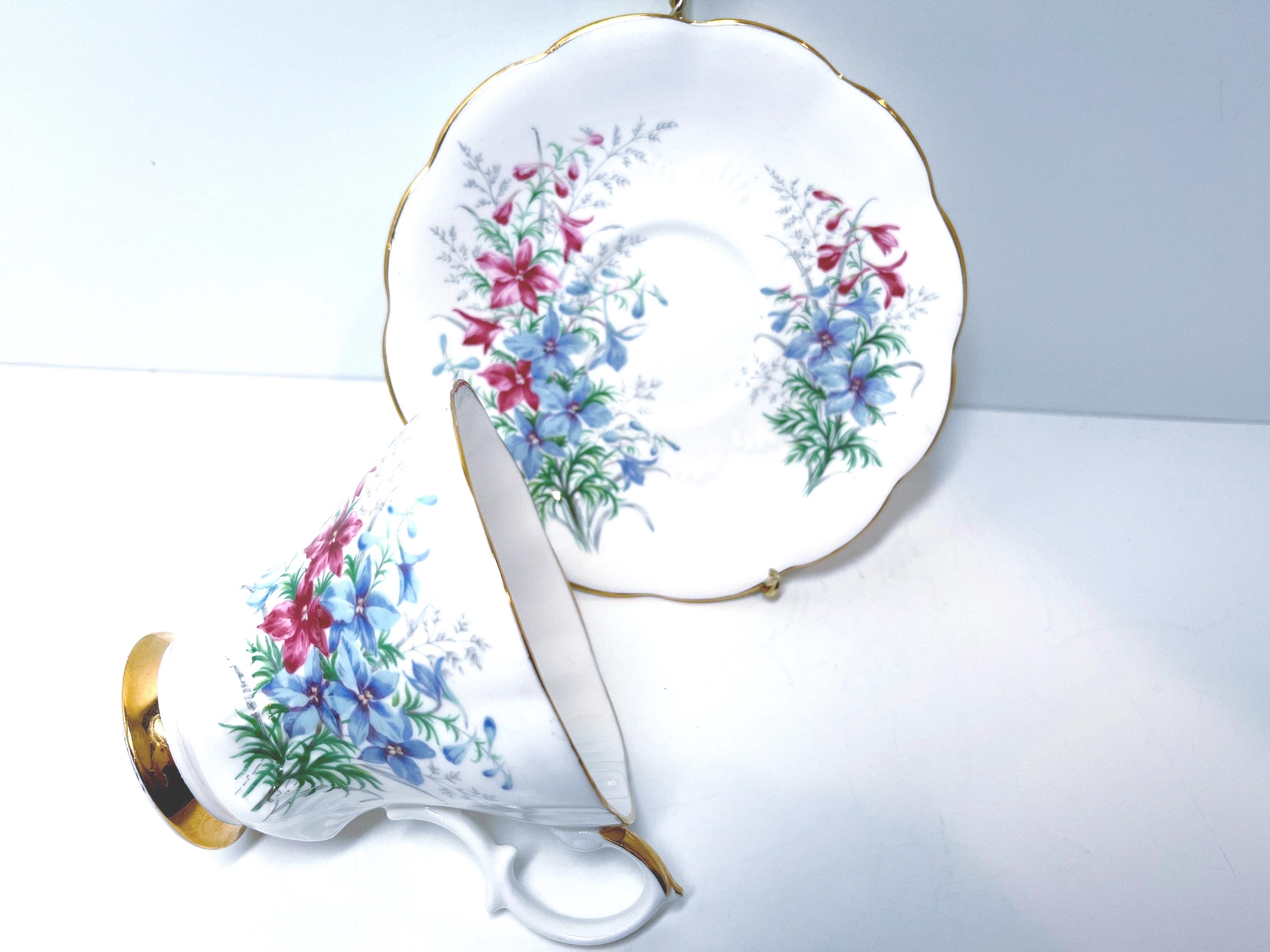 Royal Albert proudly introduced their Friendship series in the 1950s. It flourished until the 1970s. There were twelve blossoms in the issue. This is Larkspur and it is on the Lyric shaped teacup and saucer. The bouquets have a delicate air with fresh green leaves. The bone china has a soft fan design in it and both pieces have gentle curves which create a scalloped rim and saucer edge.