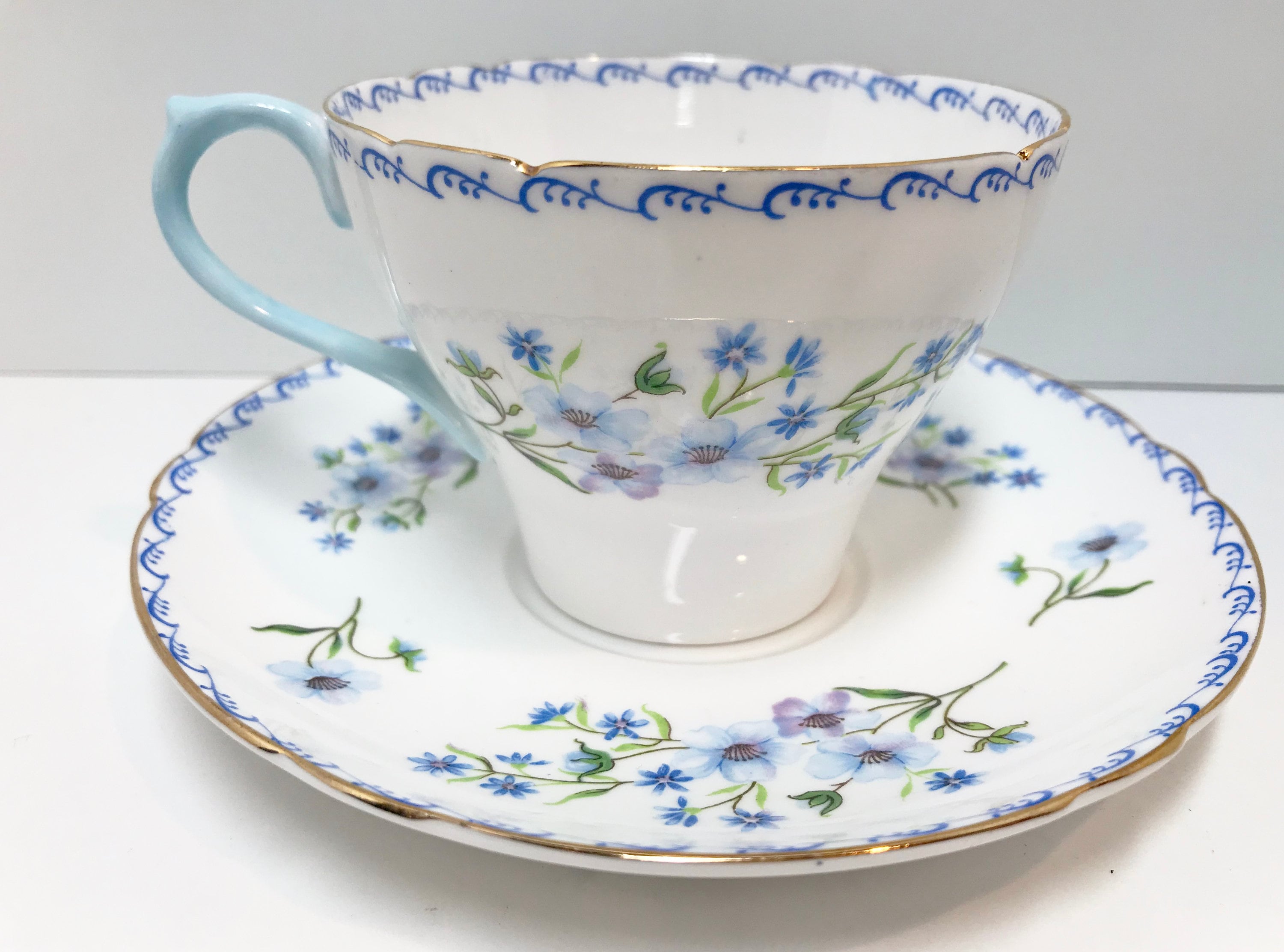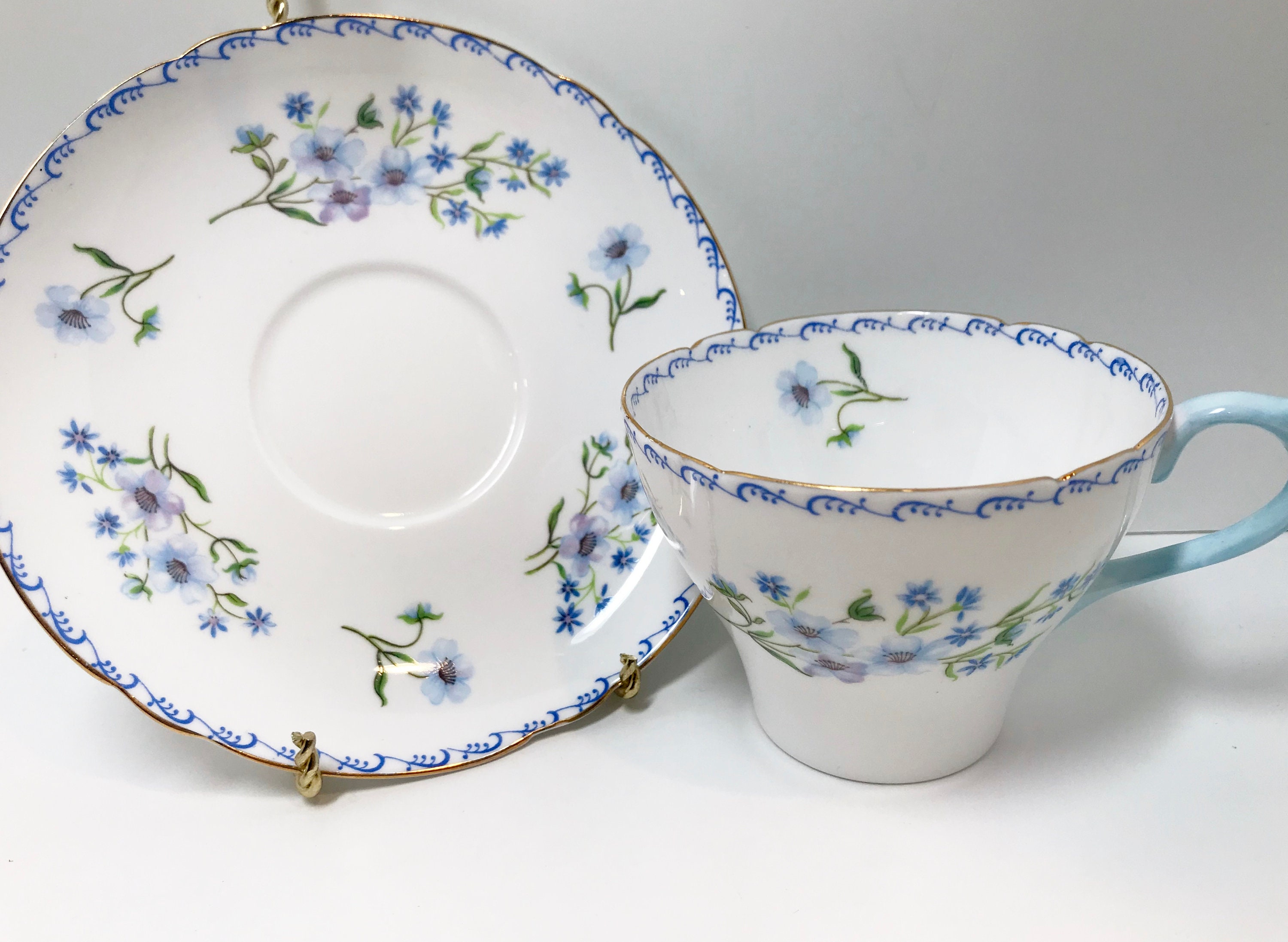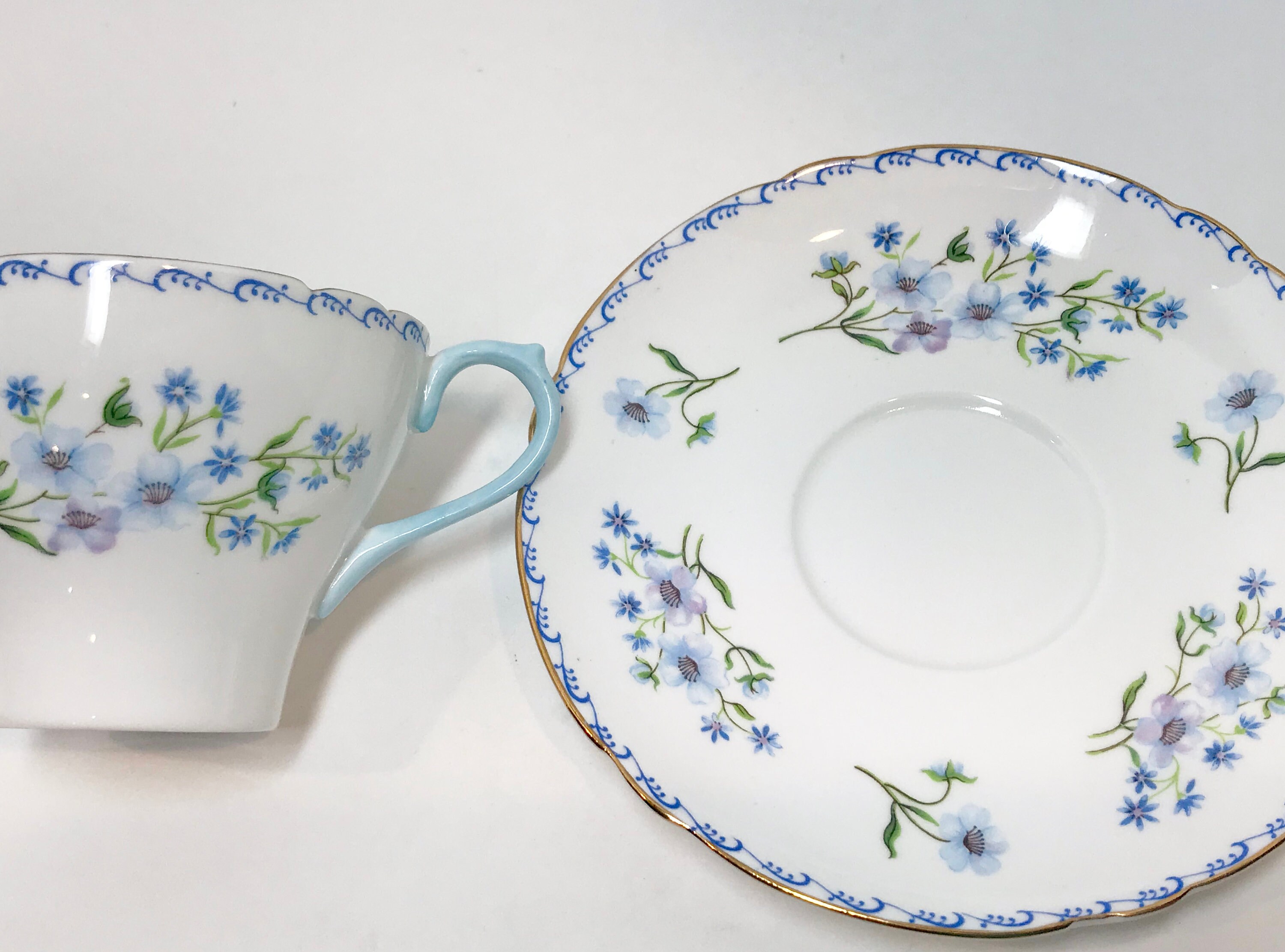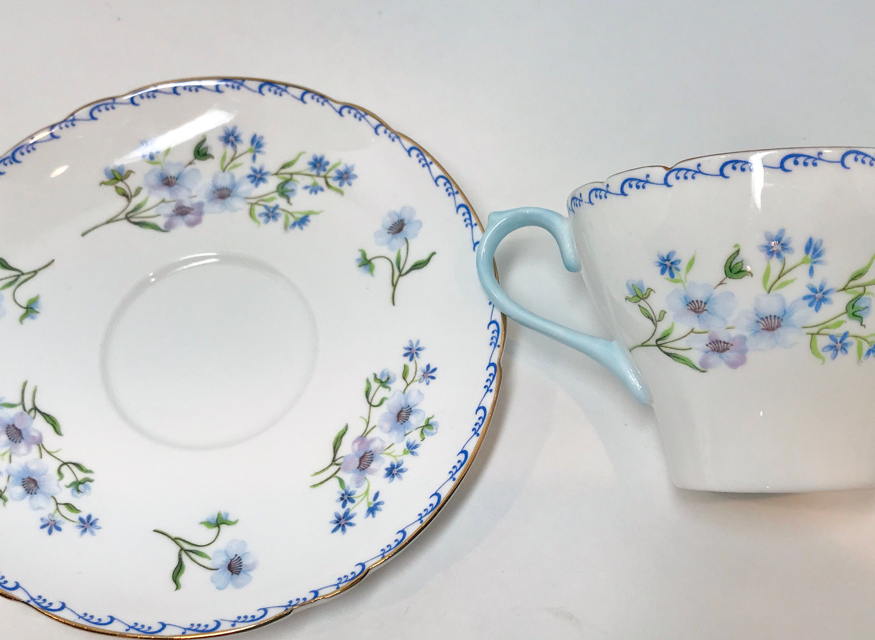 Shelley Fine Bone China of England created this charming antique tea cup in the Blue Rock pattern using their New Cambridge shape.