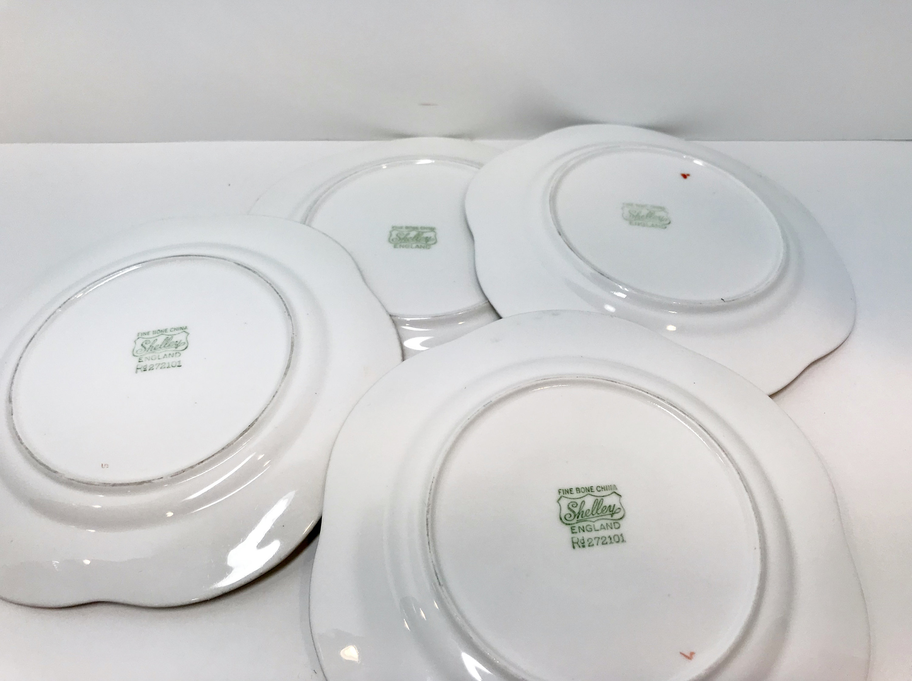 Shelley Fine Bone China of England created these elegant plates using their Dainty shape in the 1940s. Shelley was known for hiring the best artisans of the time and using excellent materials.
