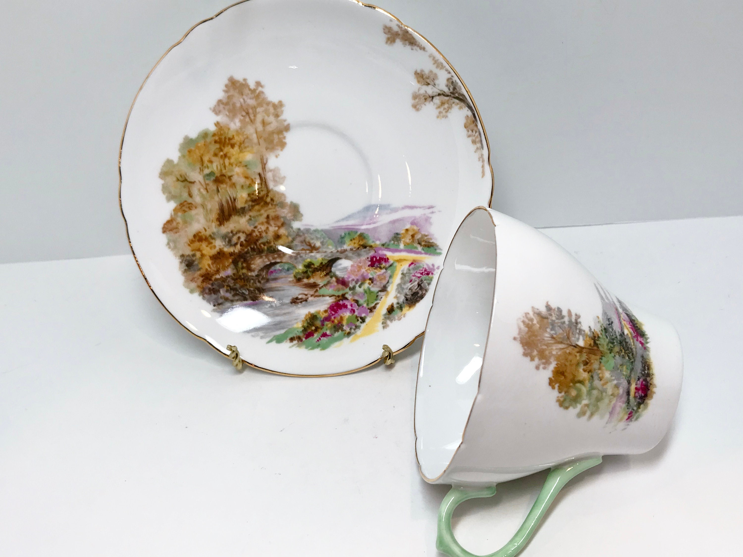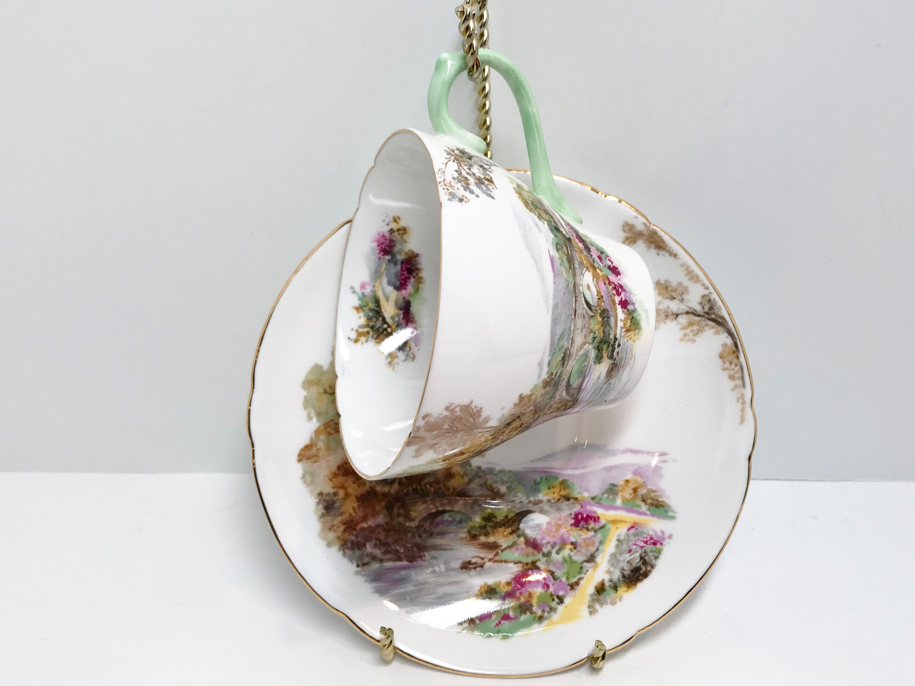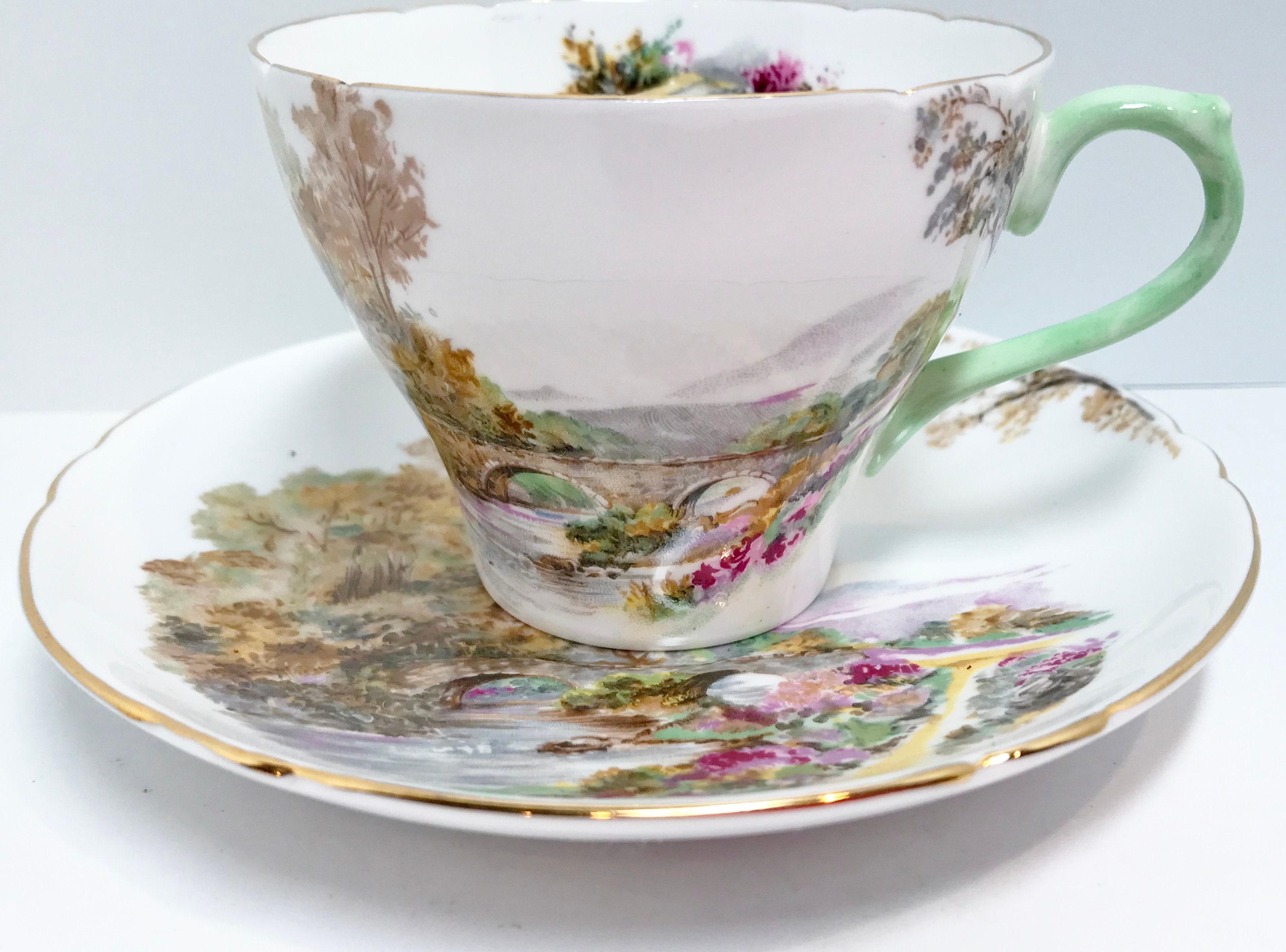 The handle is a soft pastel celadon green color. Heather is the perfect name for this nature inspired cup and saucer crafted in the New Cambridge style.