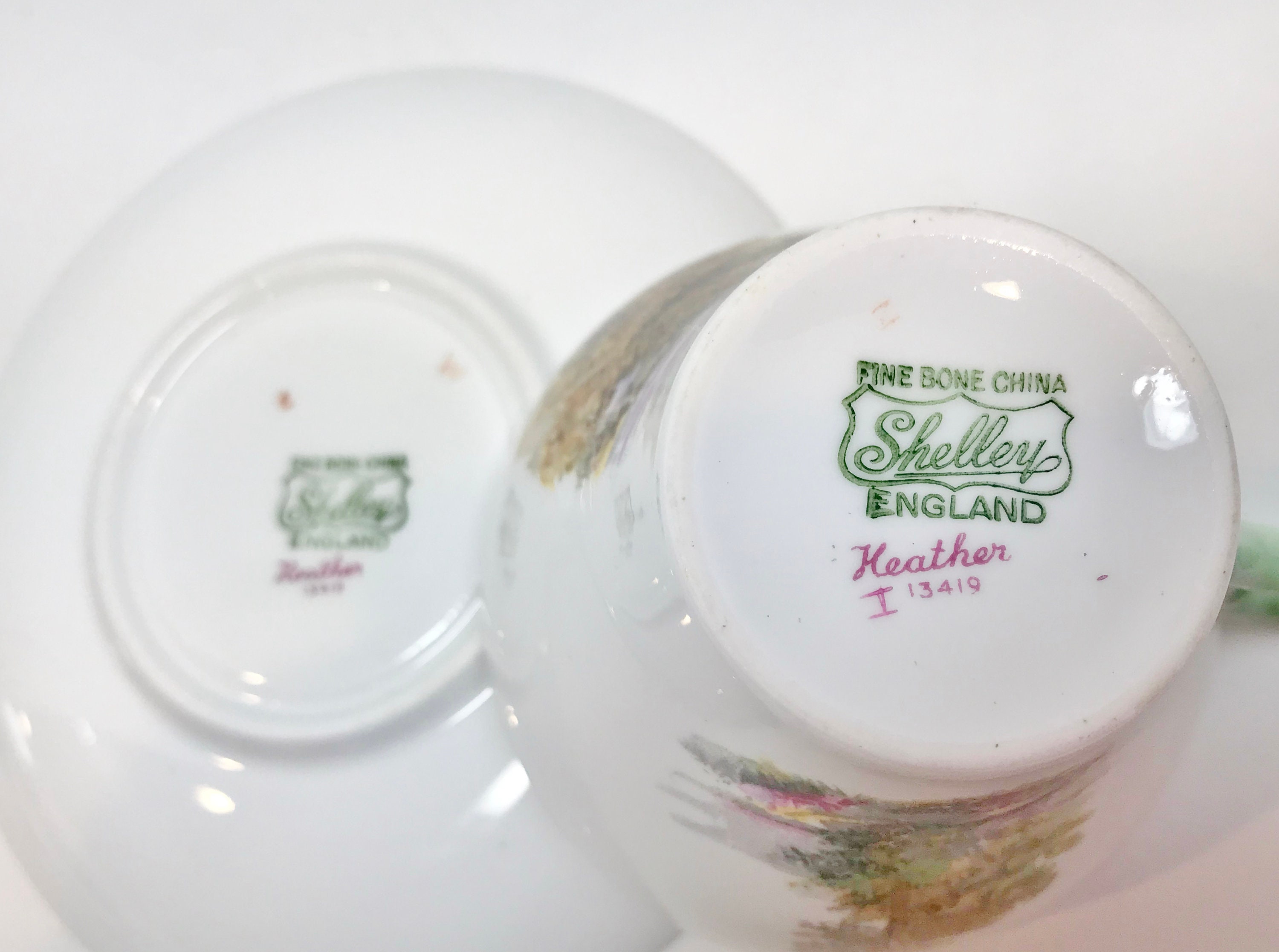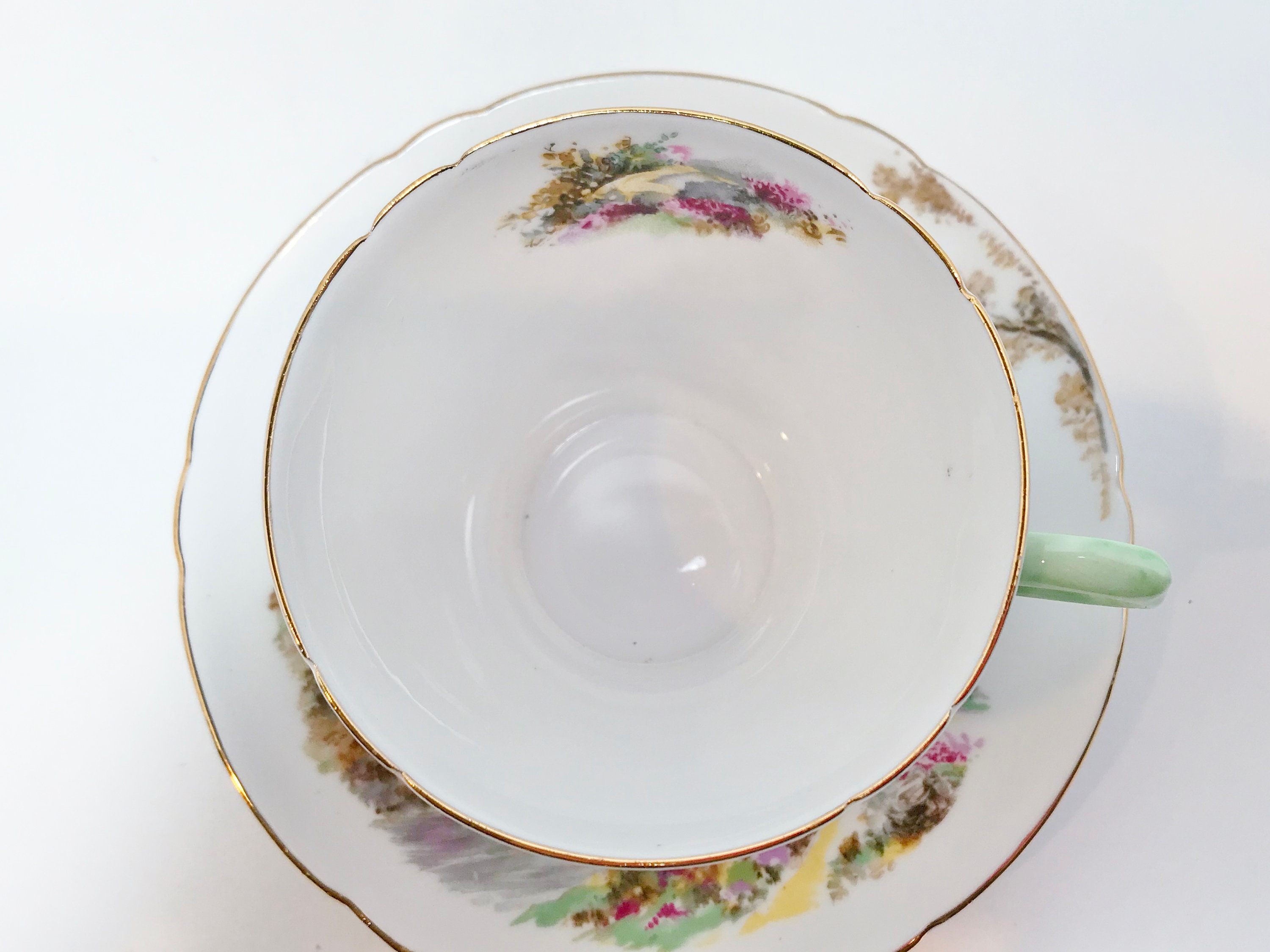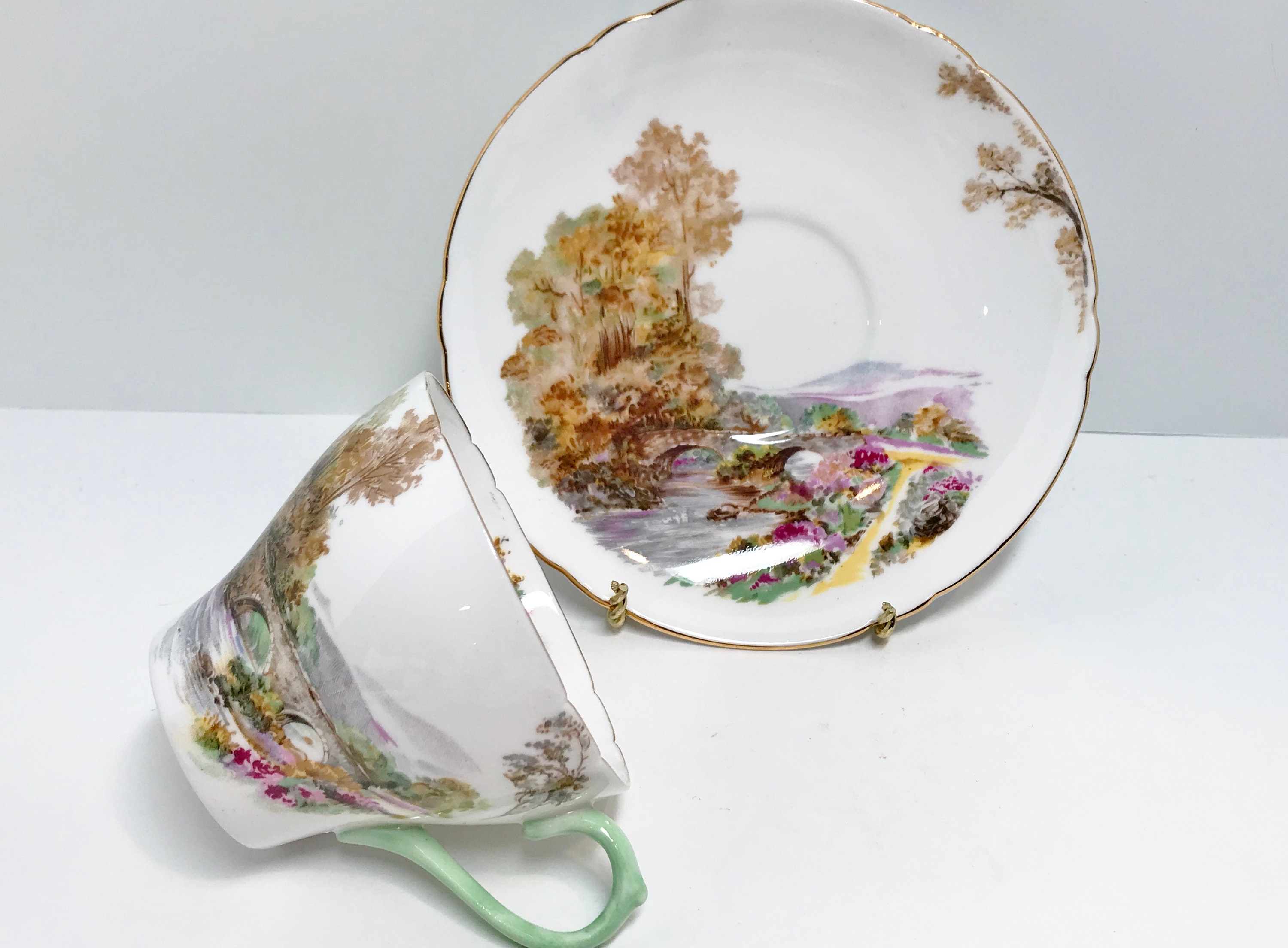 The handle is a soft pastel celadon green color. Heather is the perfect name for this nature inspired cup and saucer crafted in the New Cambridge style.
