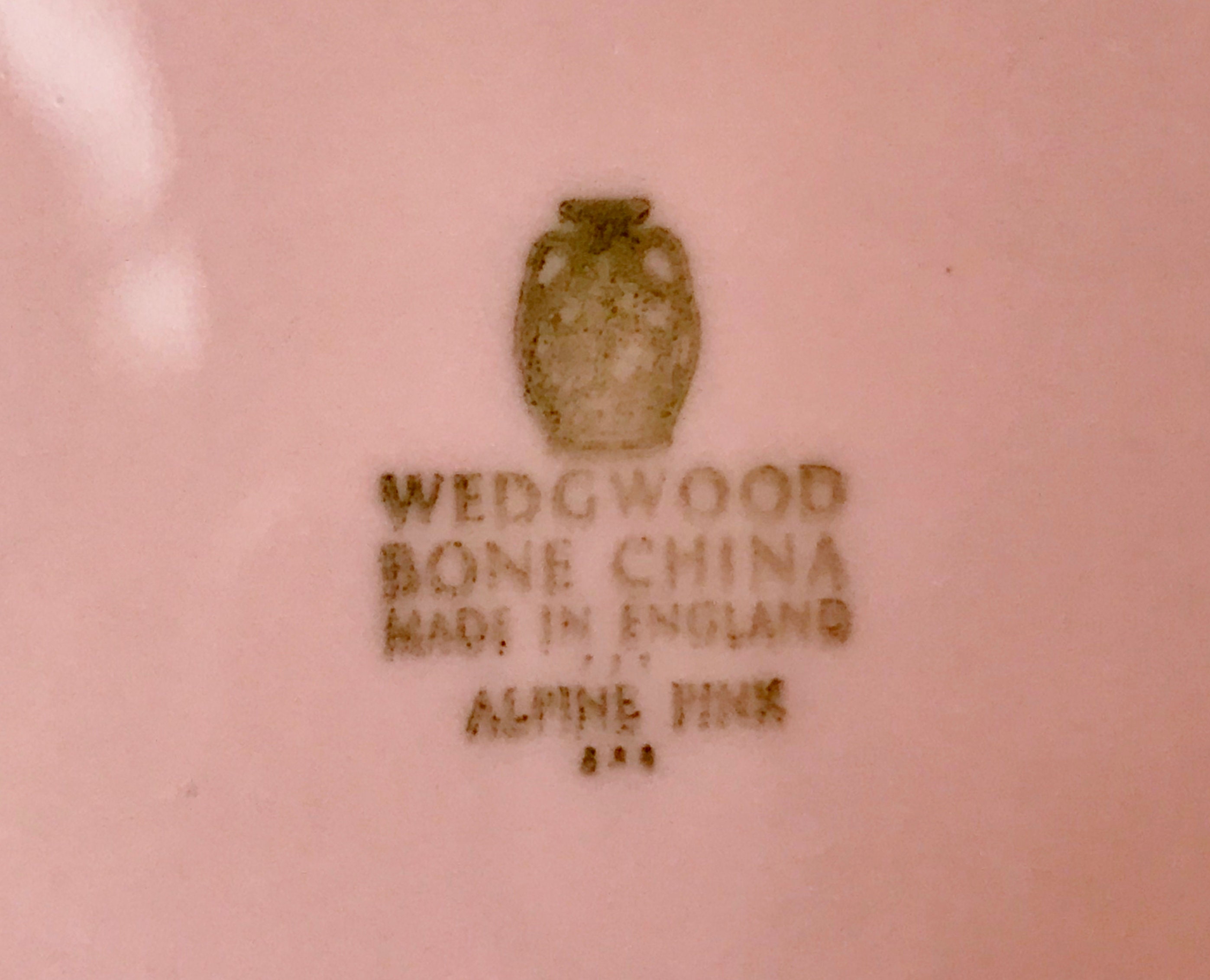 Enjoy a piece of classic Alpine Pink by Wedgwood of England. This is a dinner plate which is 10 3/8"wide and 10.5" from the handle edge to the top of the shell.