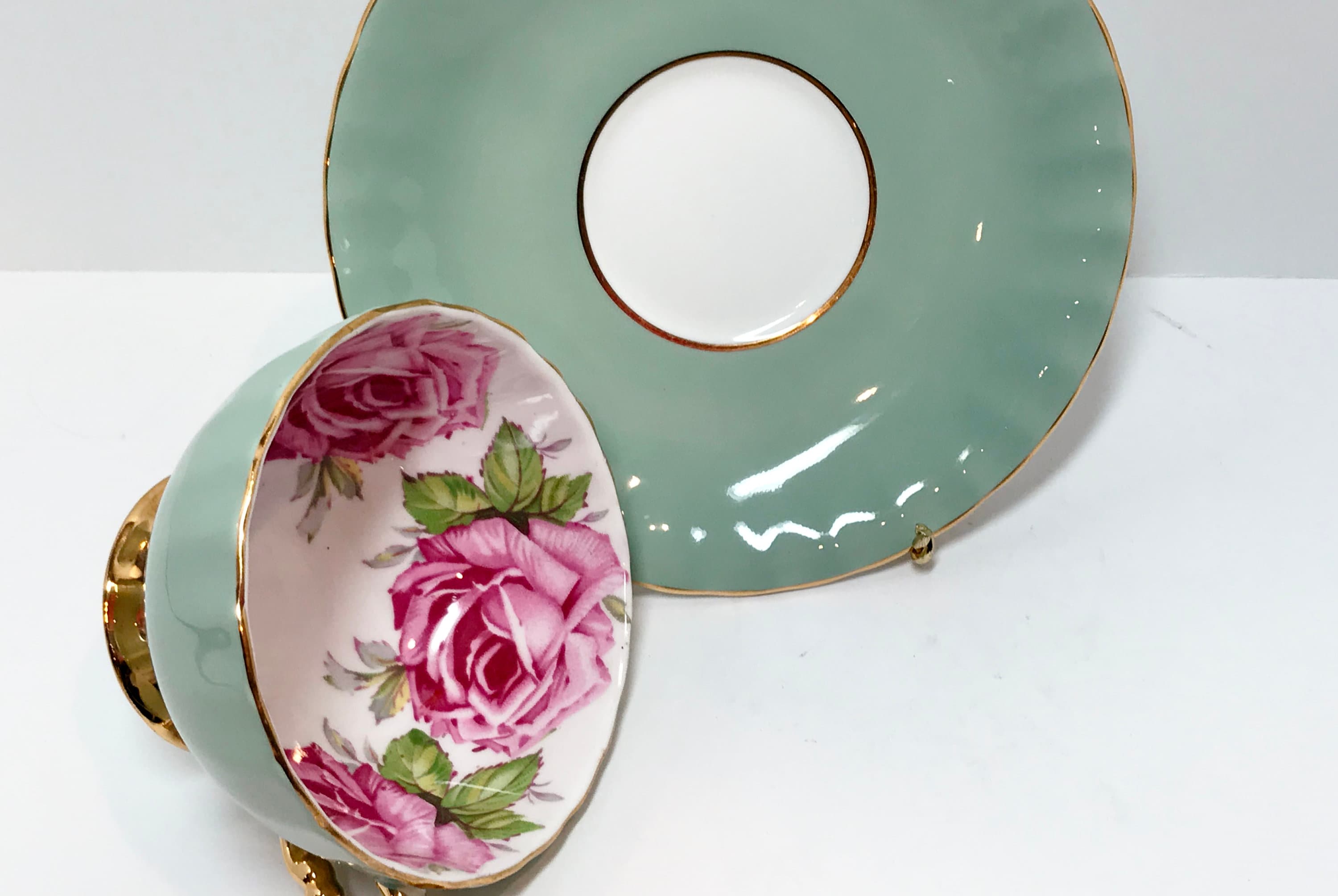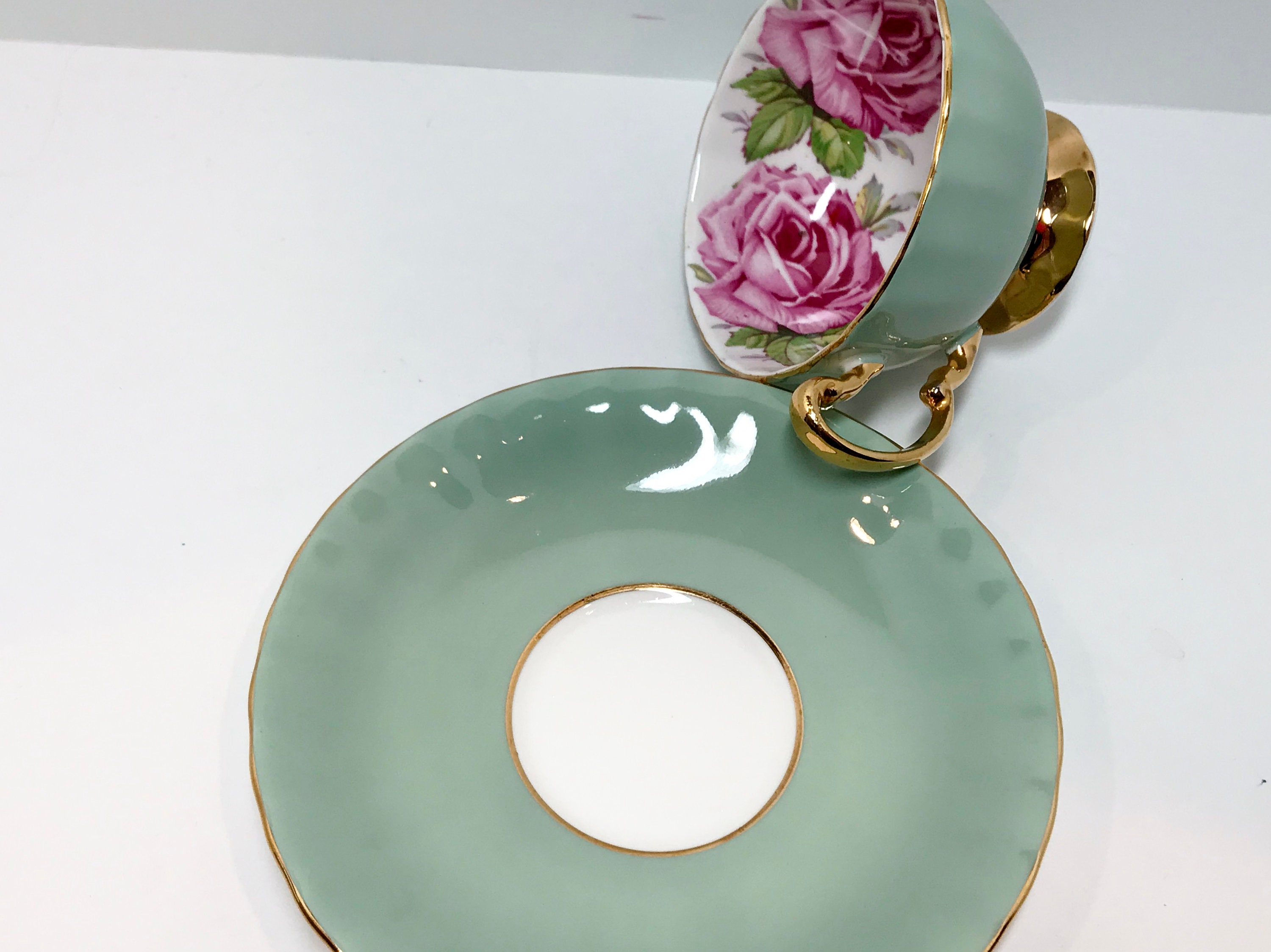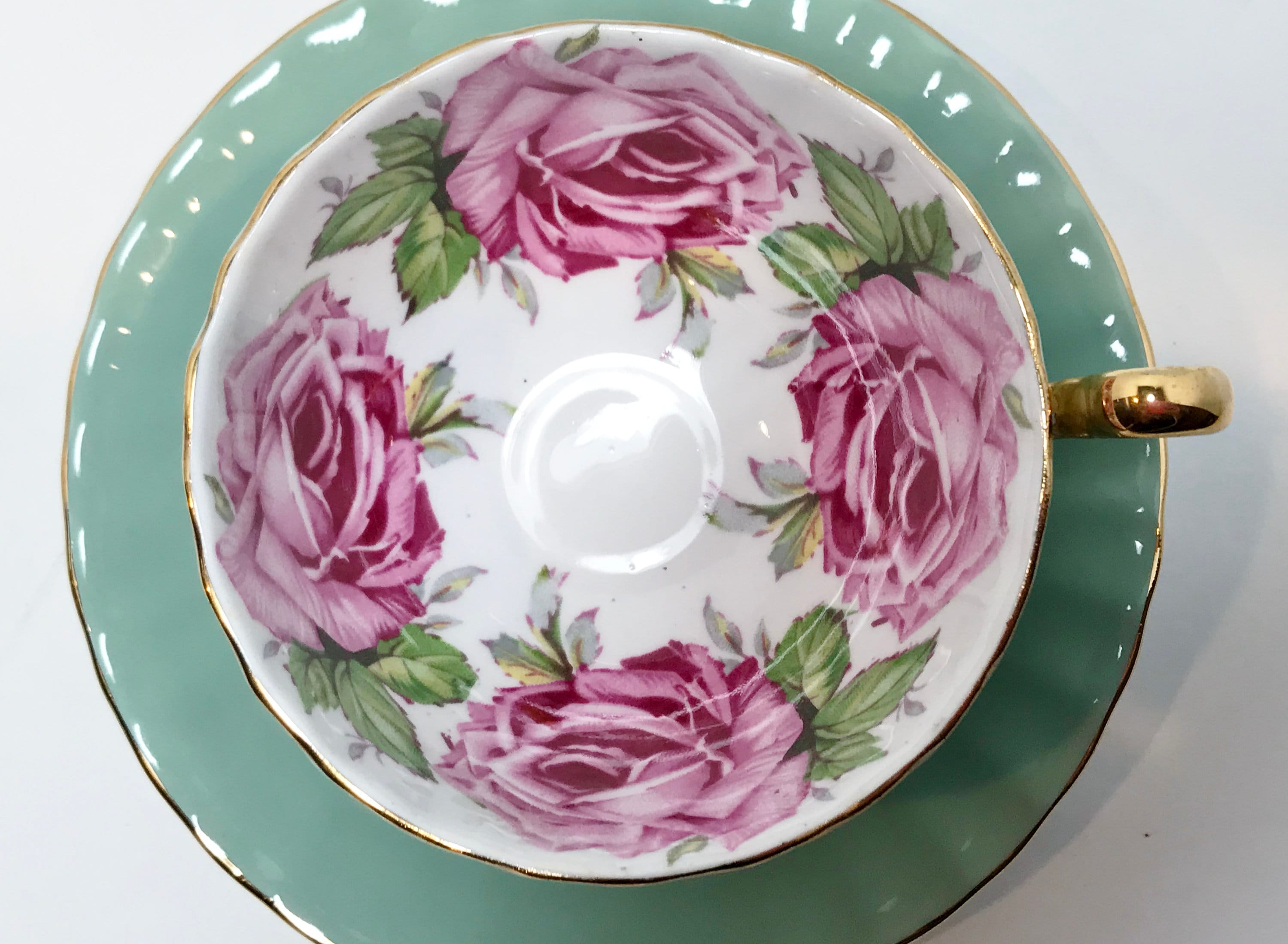 Four large cabbage roses inside the antique Aynsley teacup and saucer. The design was used upon their Oban shape.