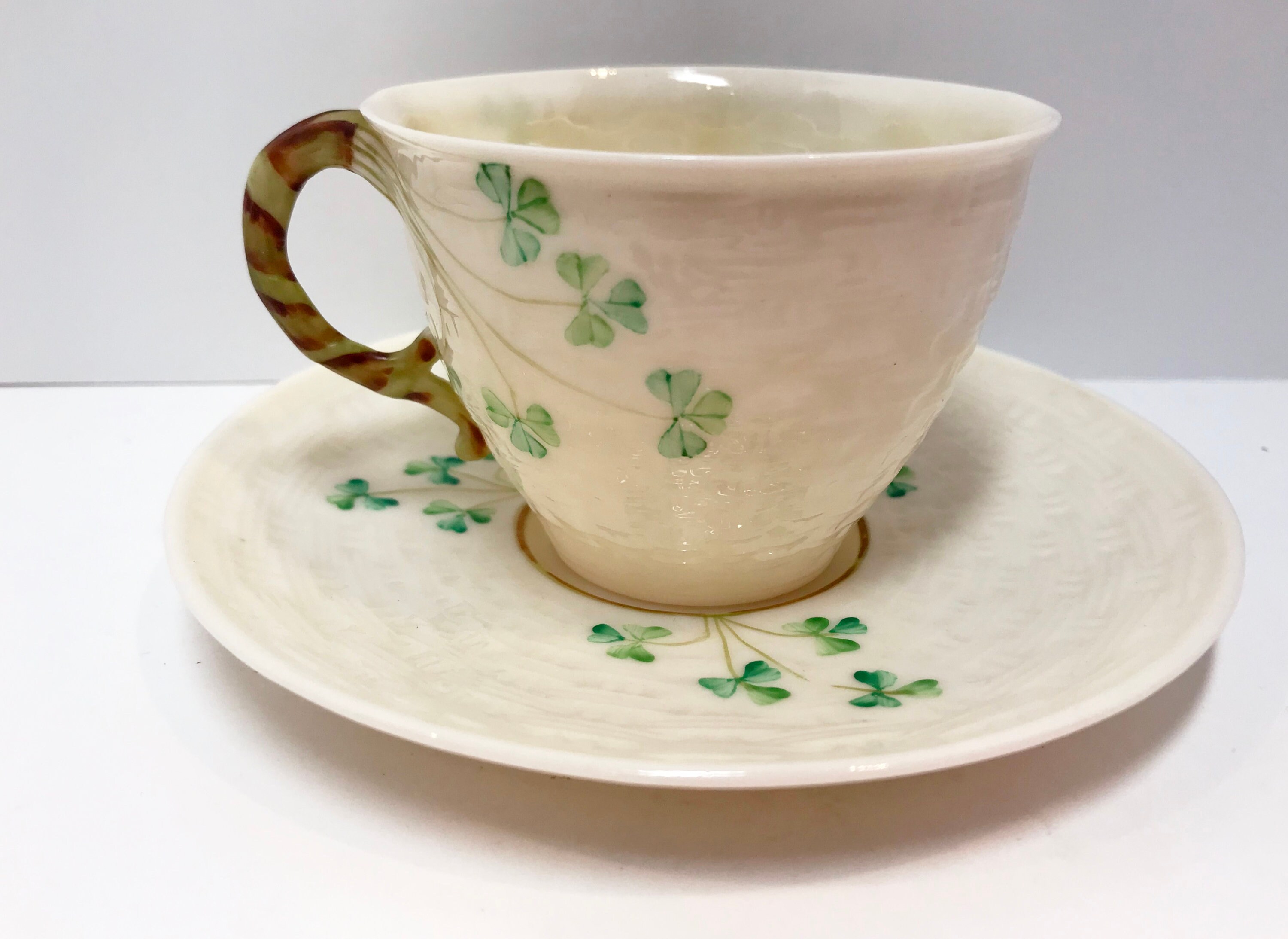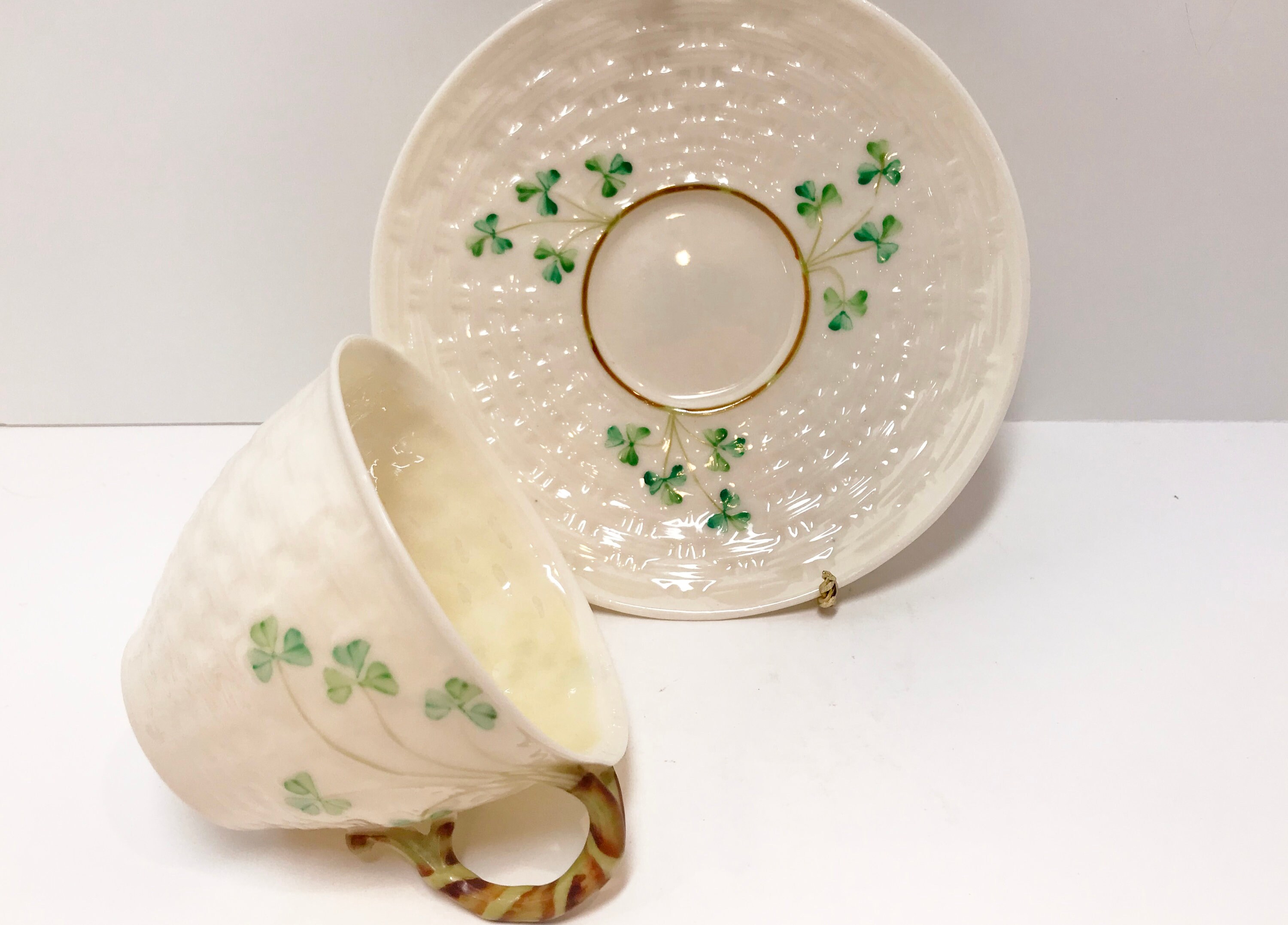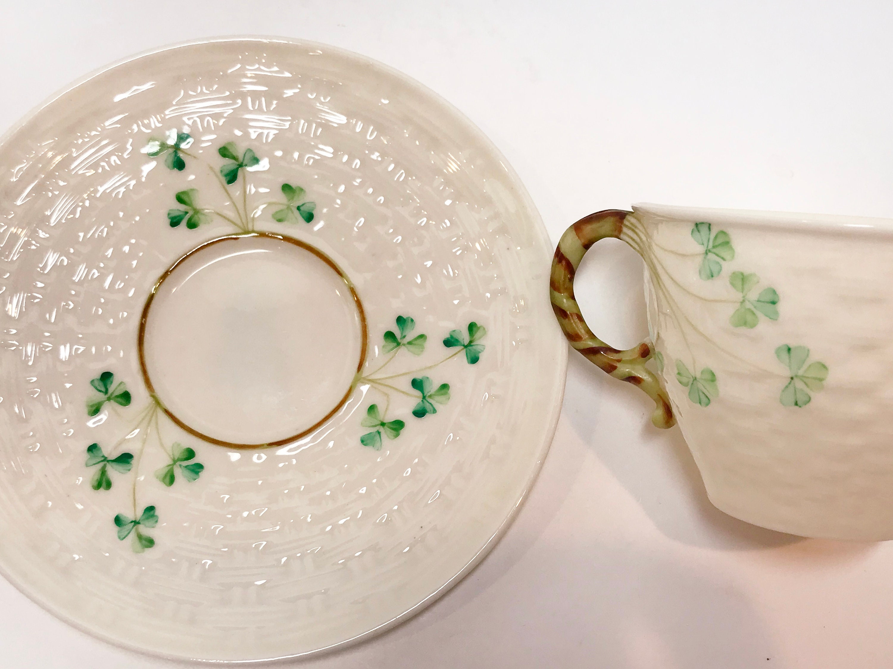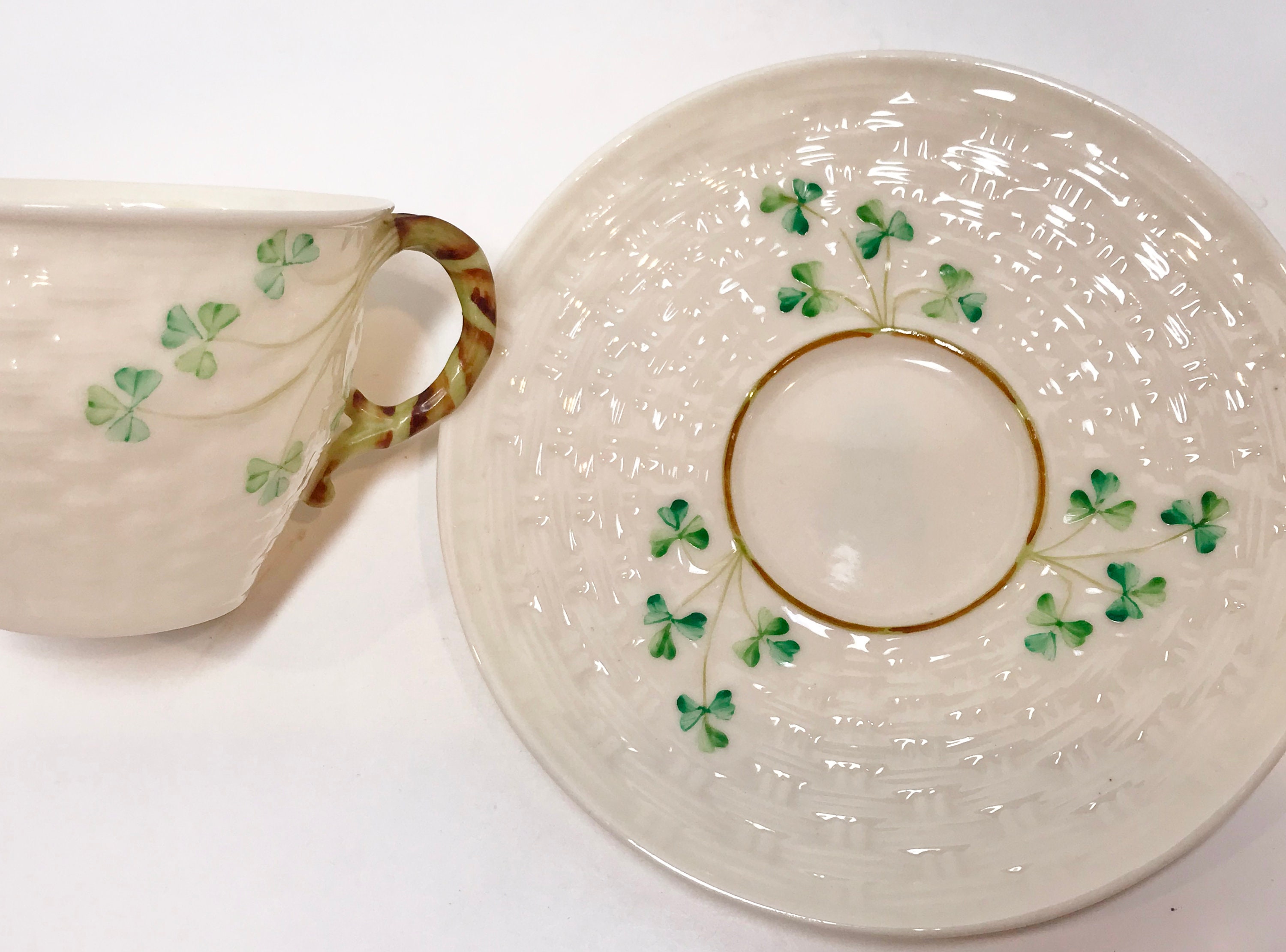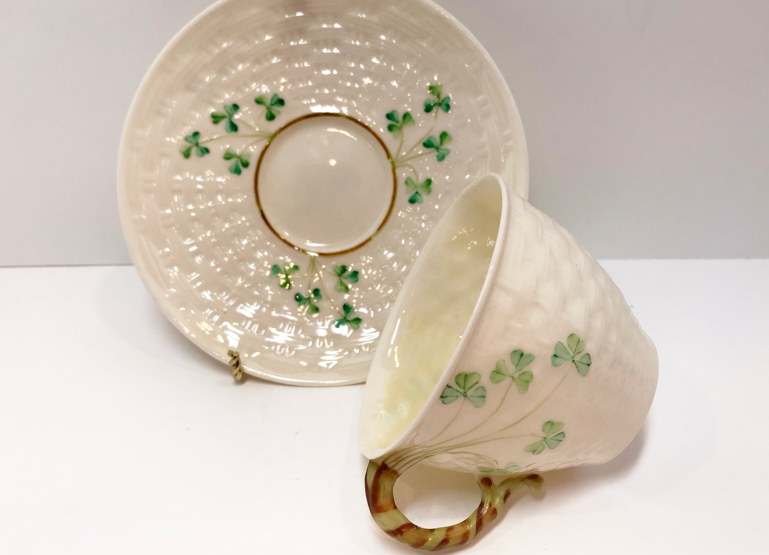 Irish shamrocks drape beautifully across the basket weave Belleek tea cup and saucer. The shamrocks and handle are hand painted. In this case, the cup is a slightly lighter green than those on the saucer. Because one is vertical and the other is horizontal, it barely shows, but we strive to tell you everything that we see.