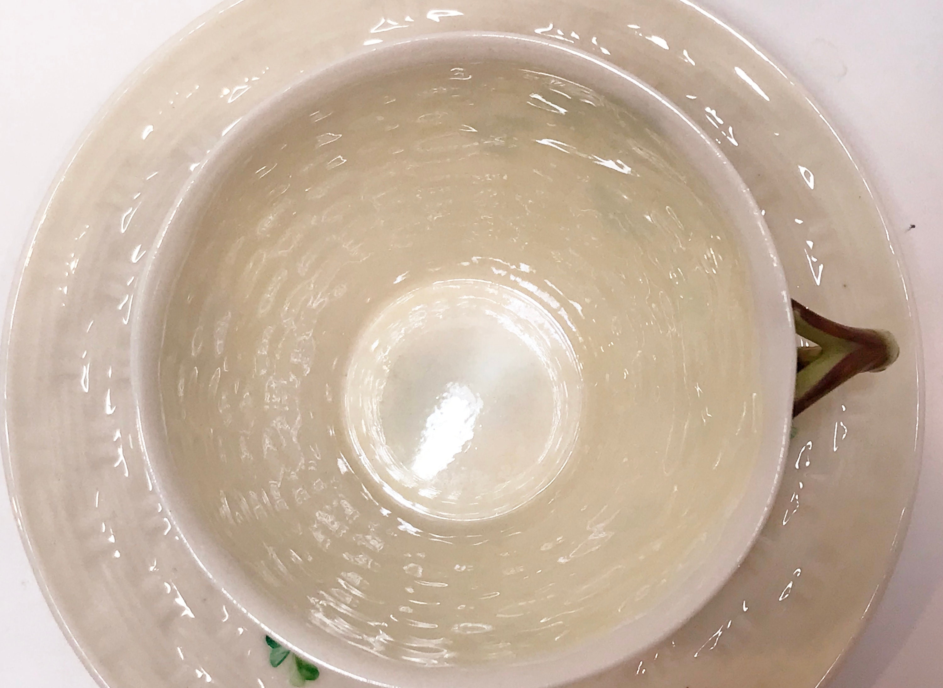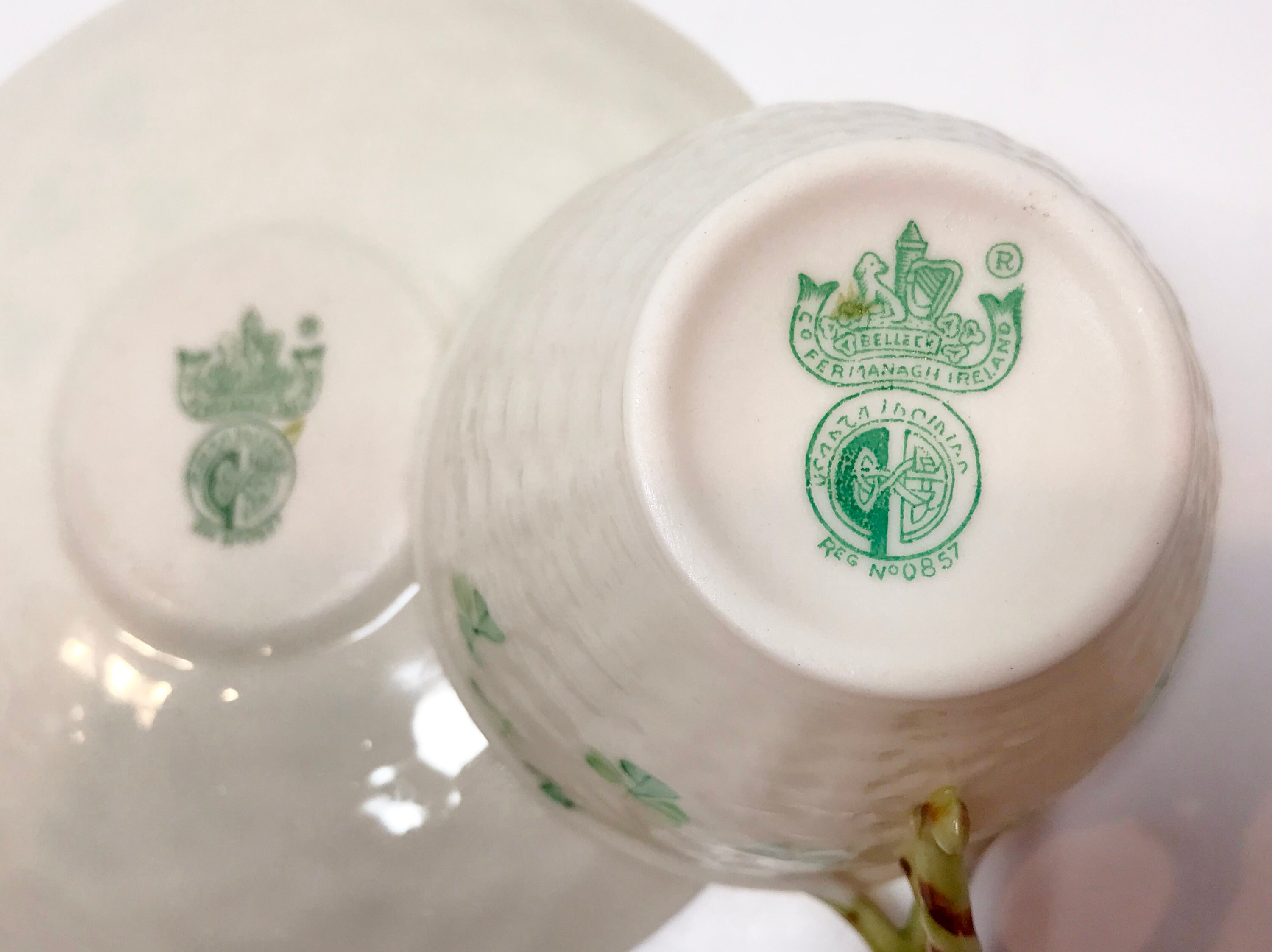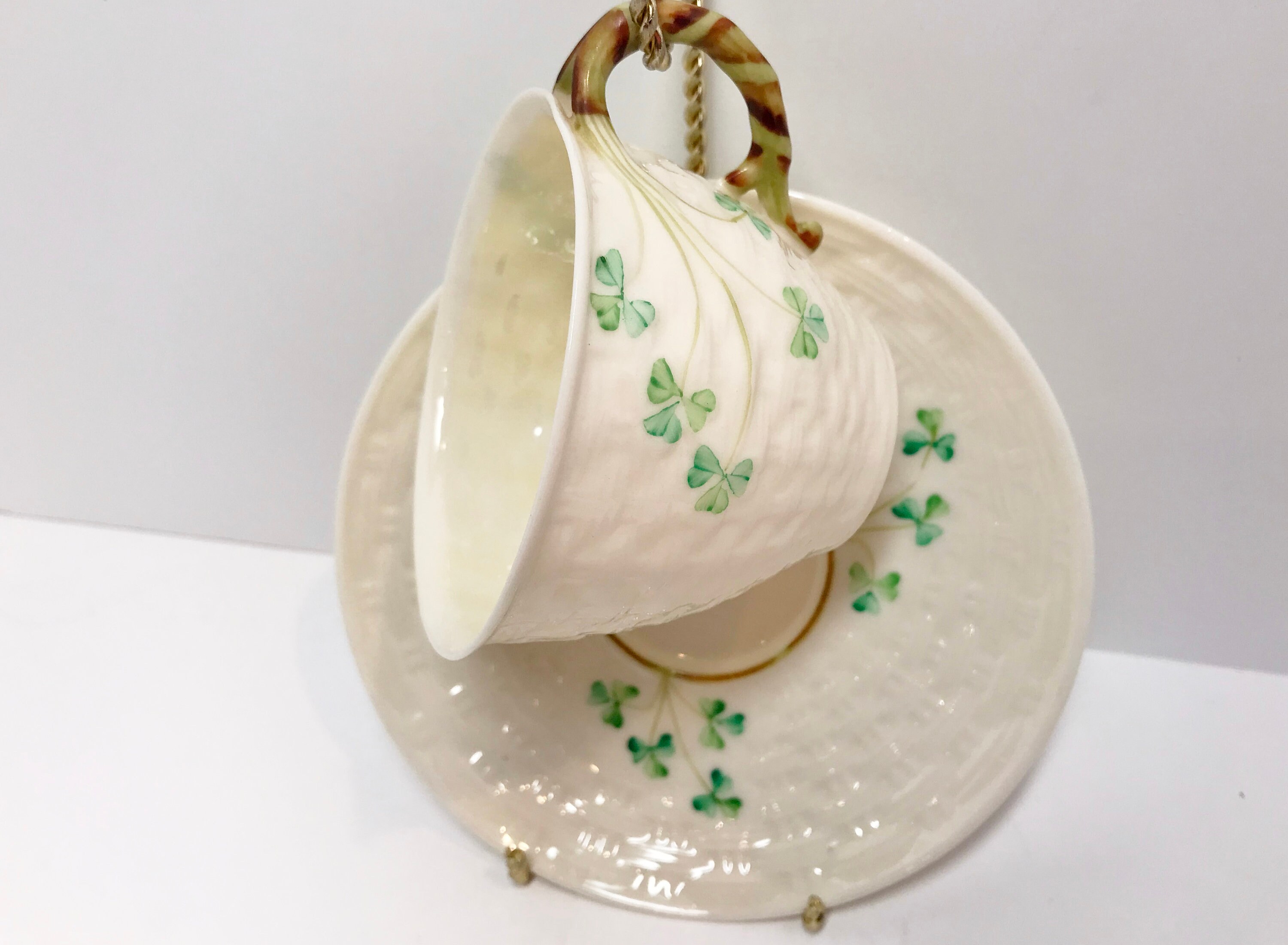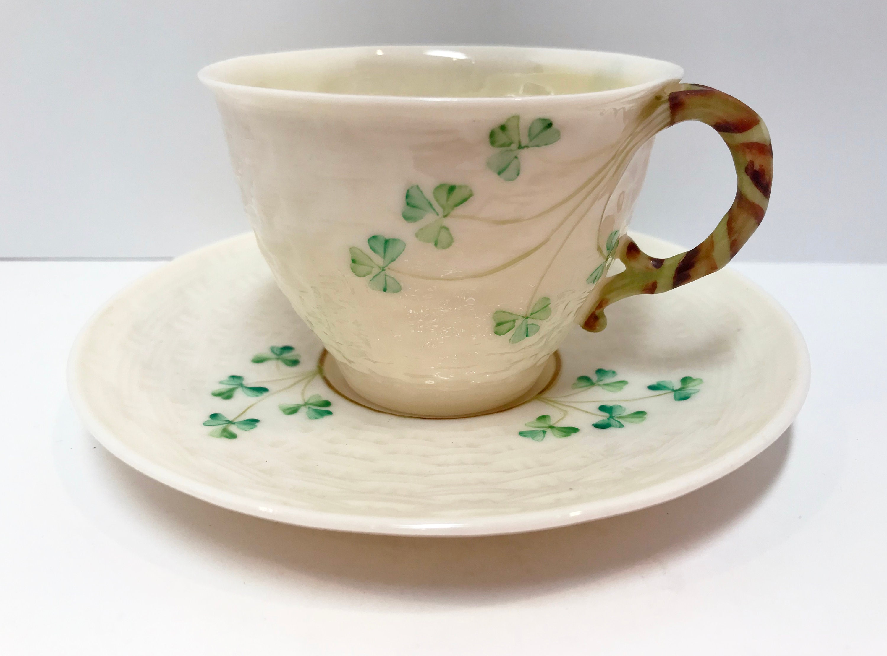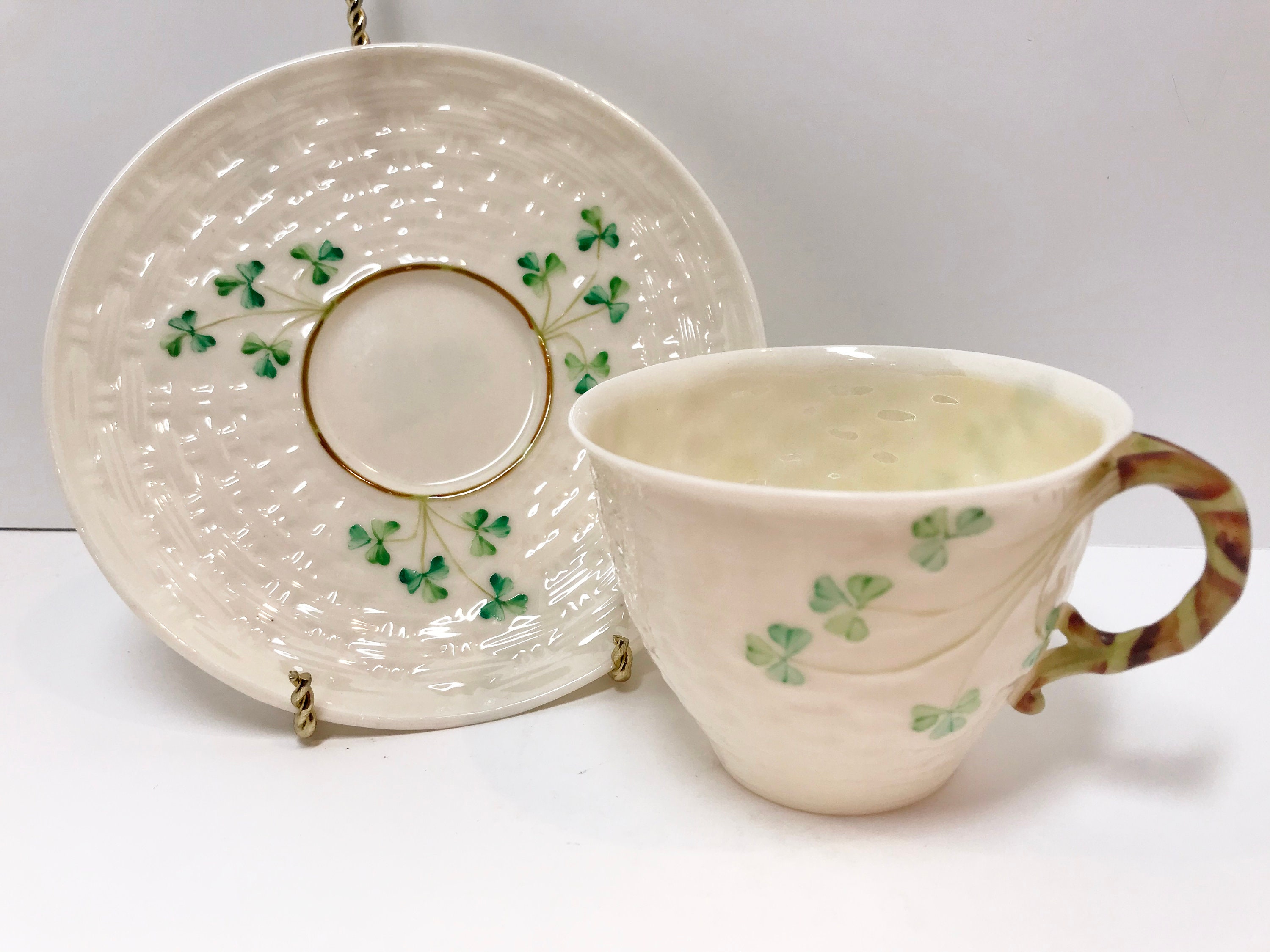 Irish shamrocks drape beautifully across the basket weave Belleek tea cup and saucer. The shamrocks and handle are hand painted. In this case, the cup is a slightly lighter green than those on the saucer. Because one is vertical and the other is horizontal, it barely shows, but we strive to tell you everything that we see.