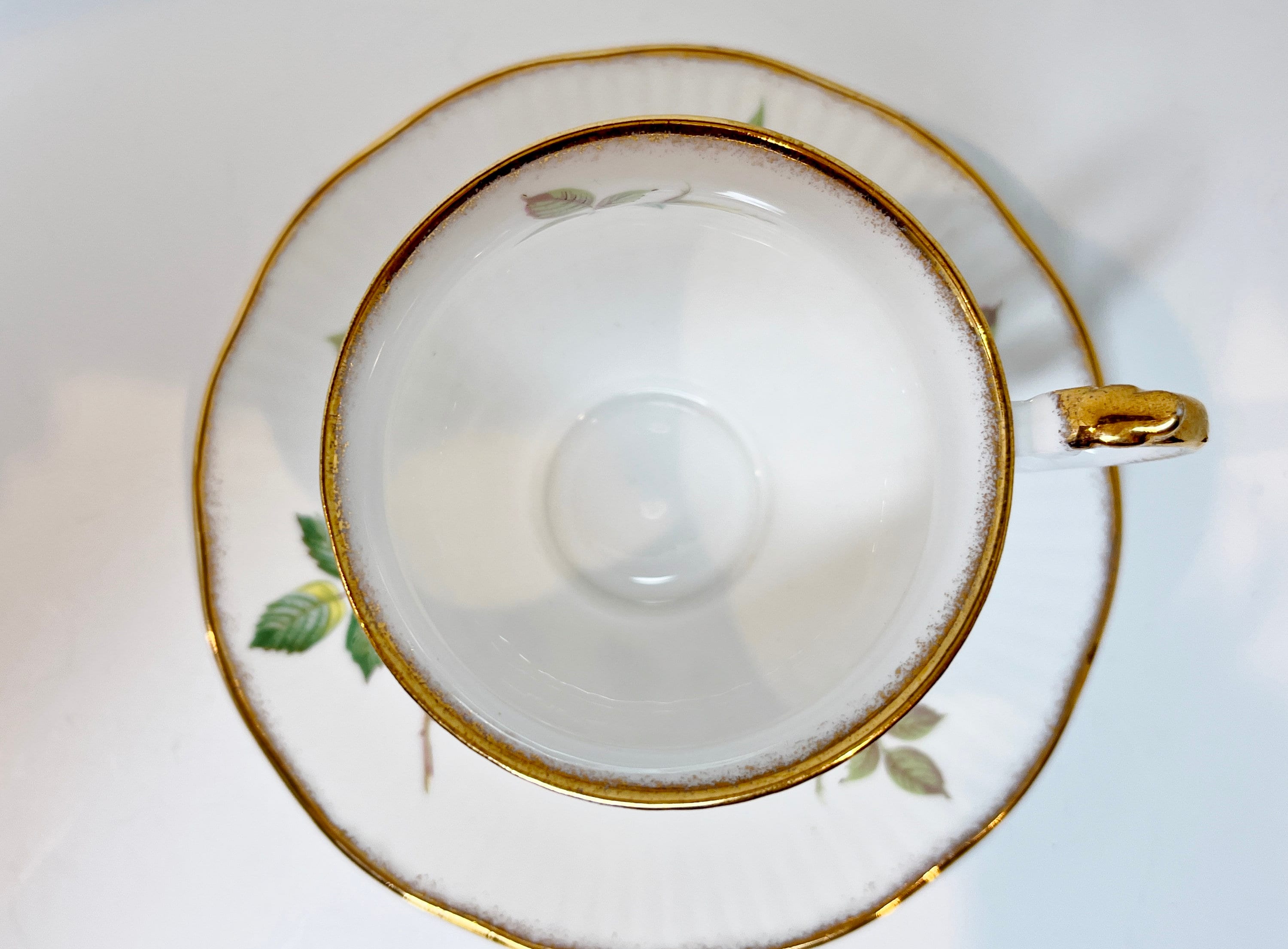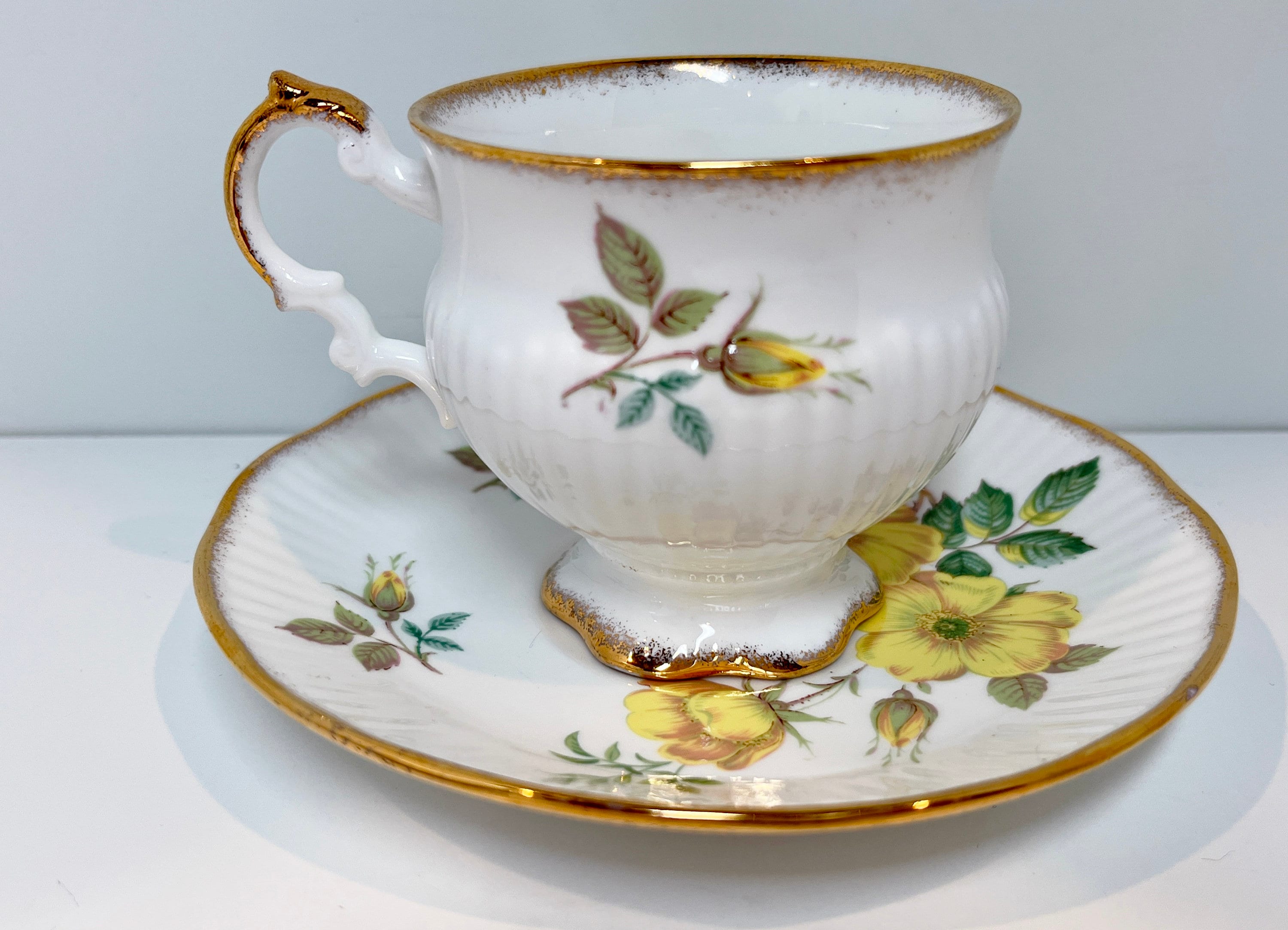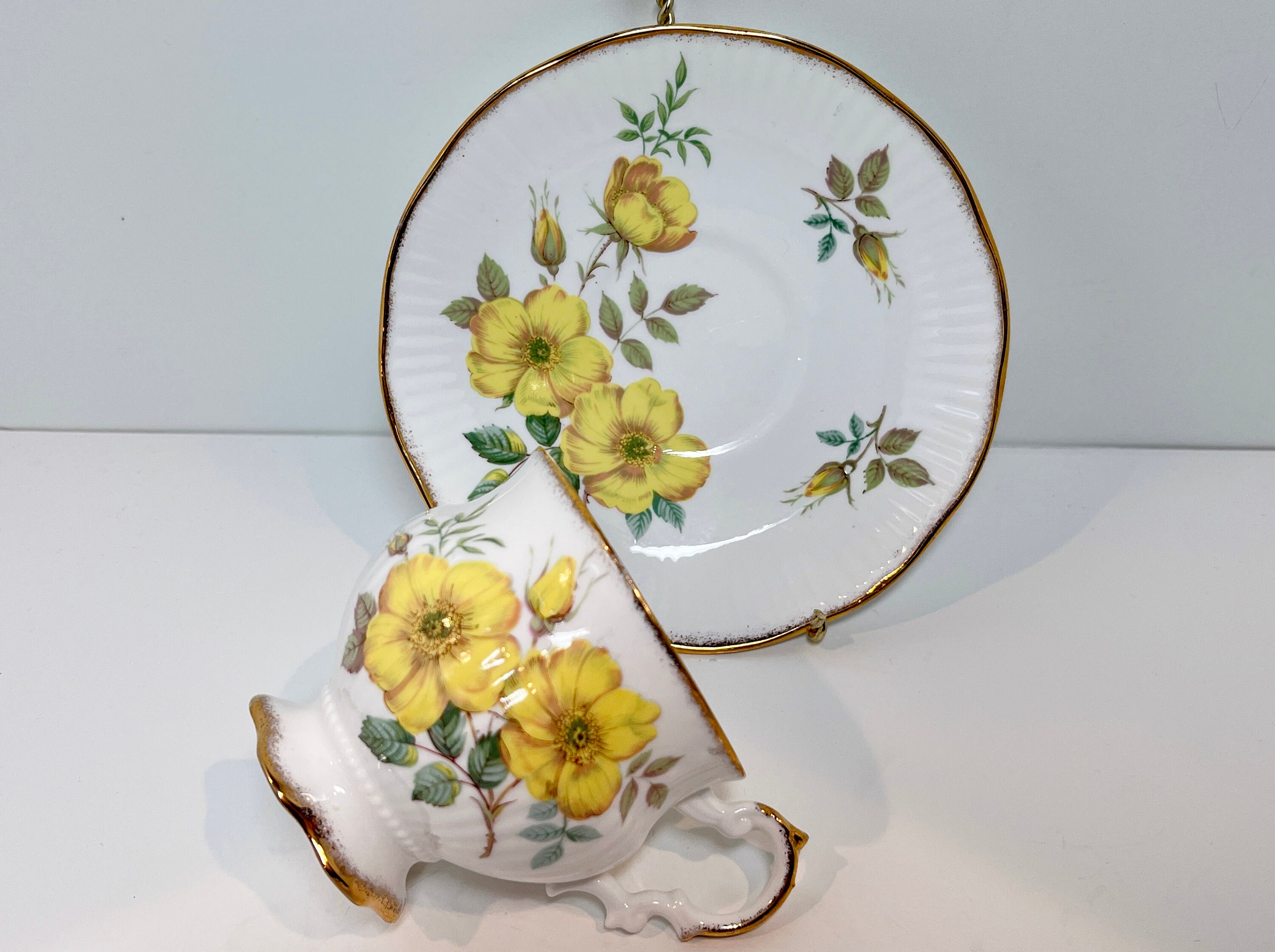 This floral teacup with its yellow flowers is perfectly framed by the hand applied gold trim. Notice the pleats in the footed shaped teacup. This is also partially hand painted.
