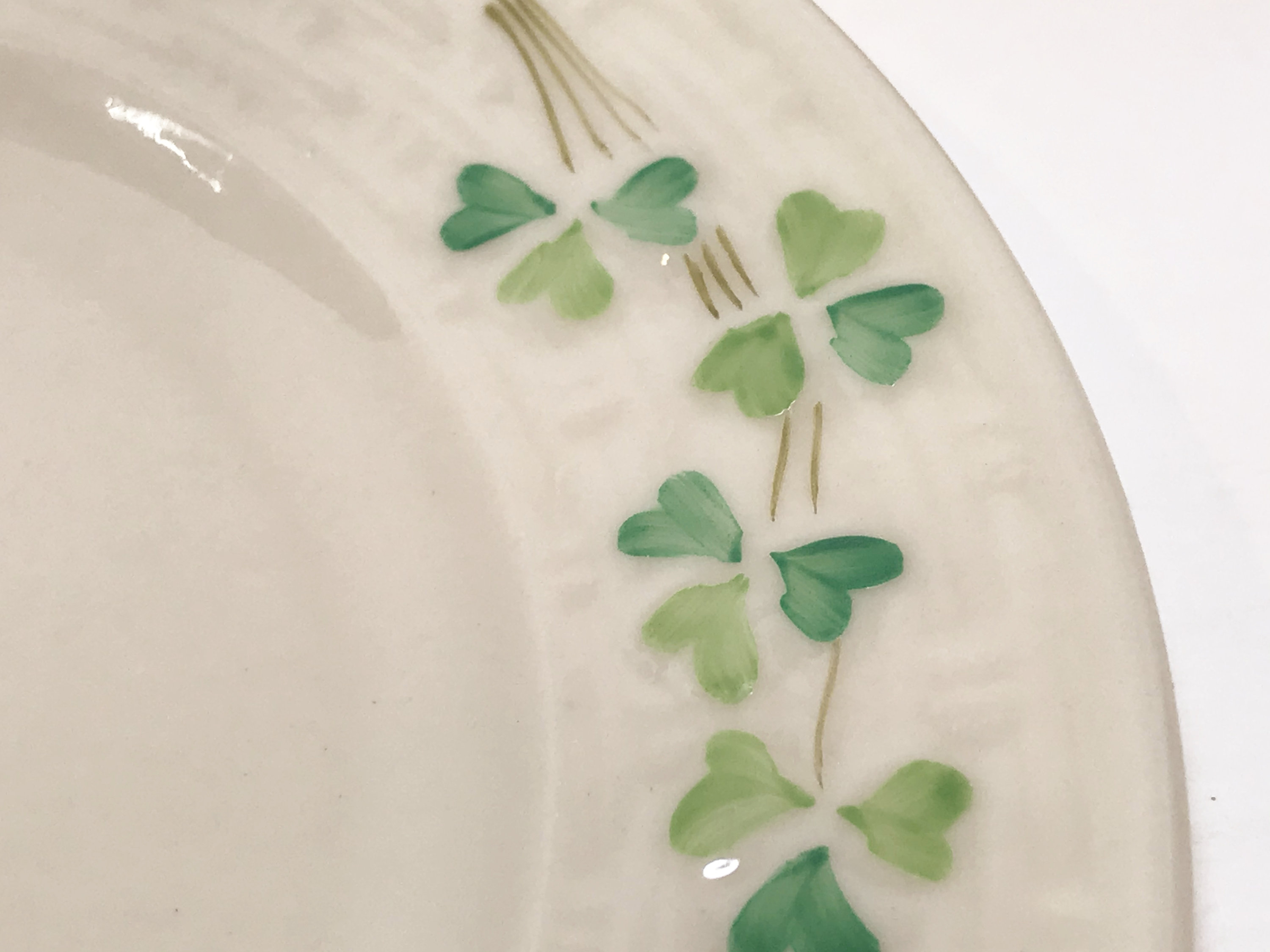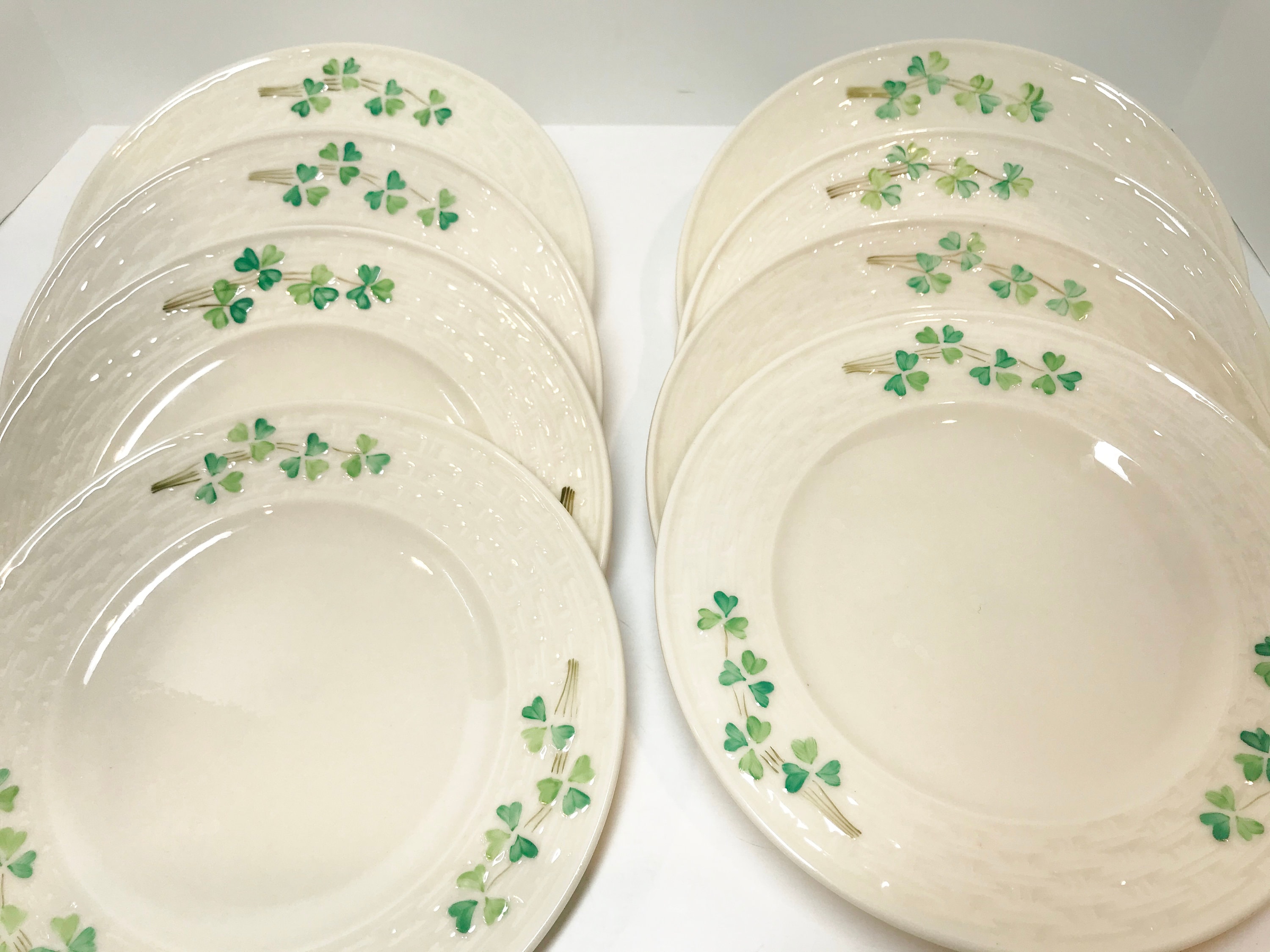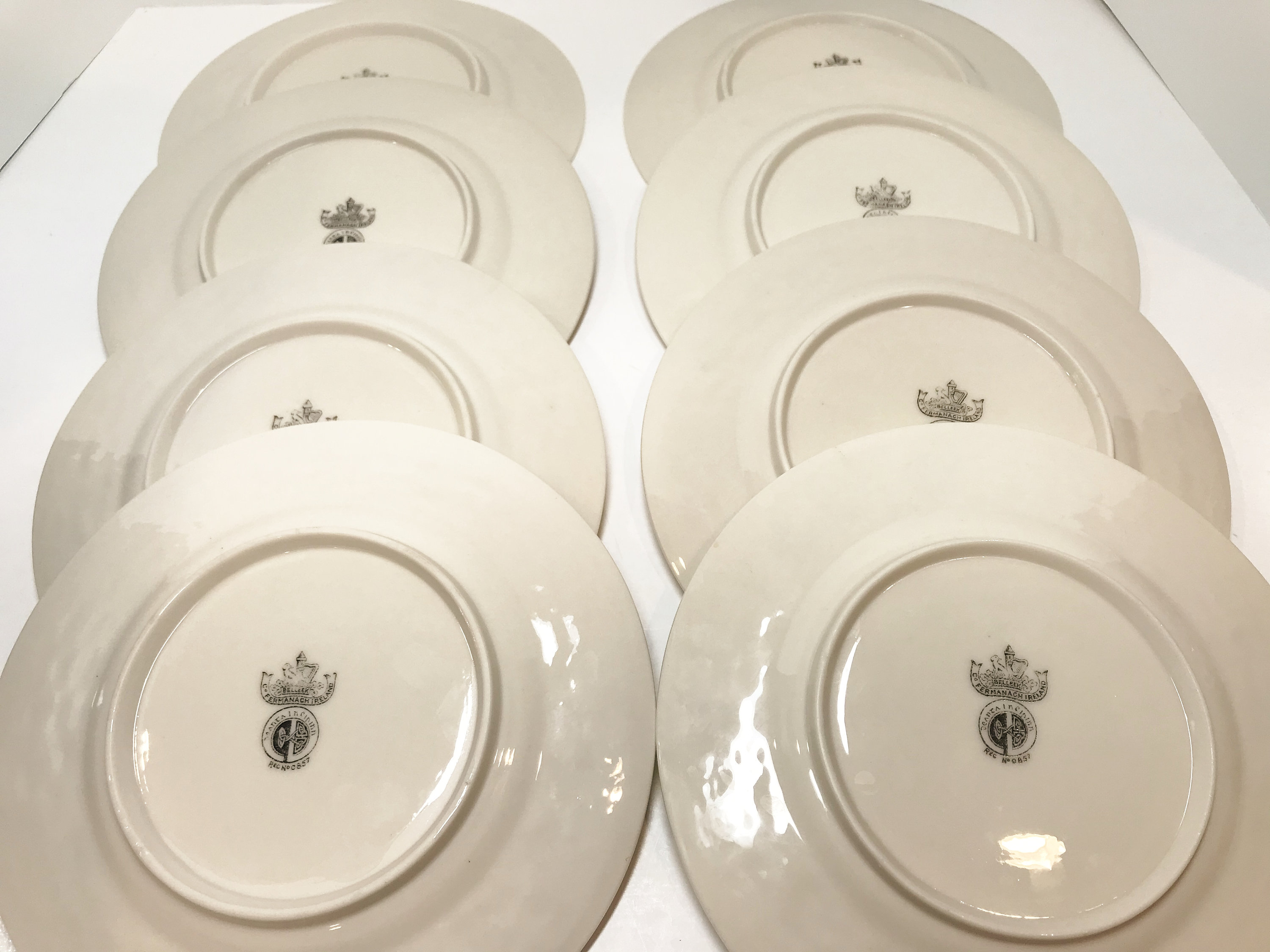 This is a beautiful set of eight Belleek plates. The light dances on the creamy porcelain. The design is called Shamrock Ware. They have the third black mark which means they were made between 1926 and 1946.