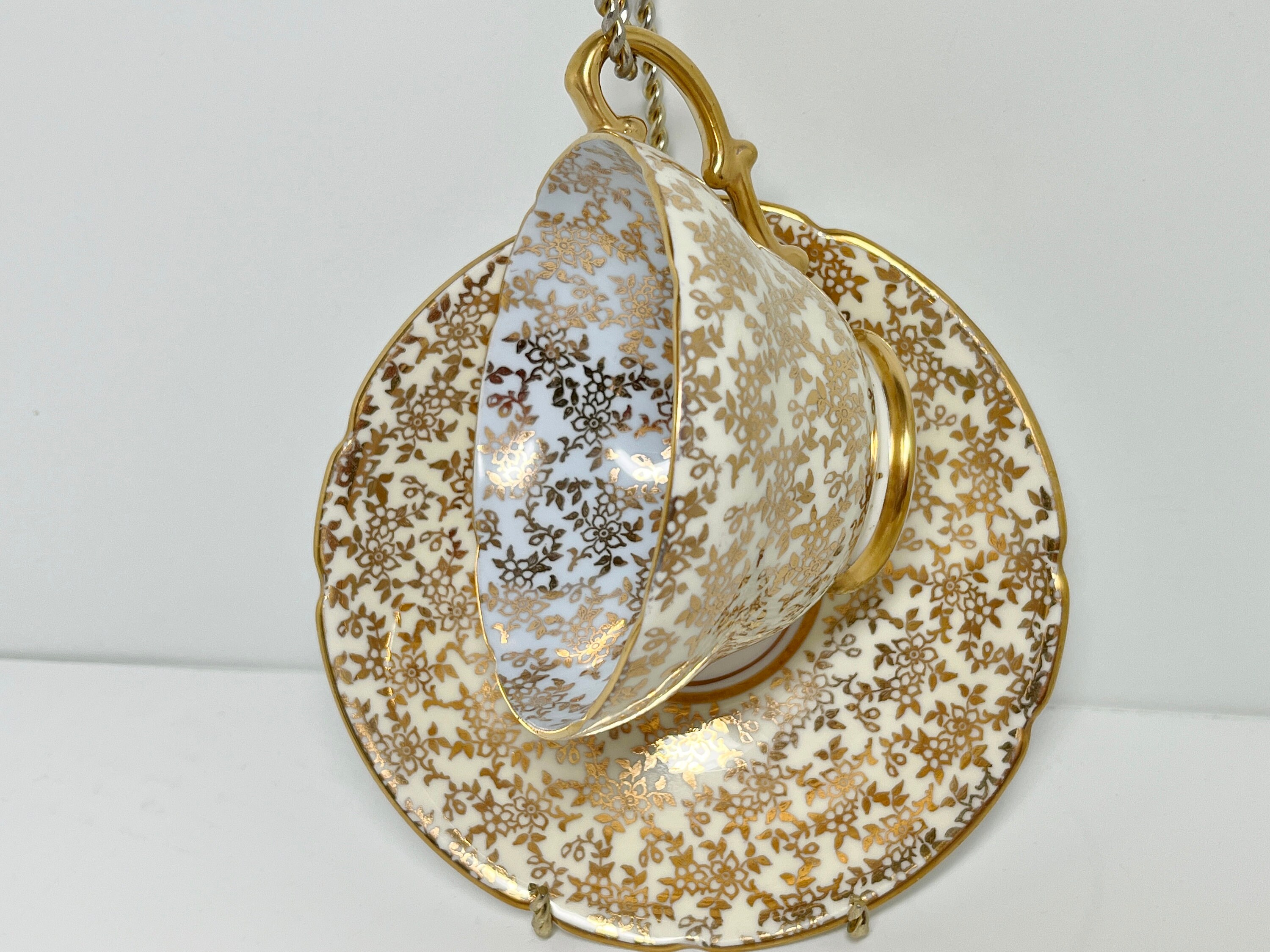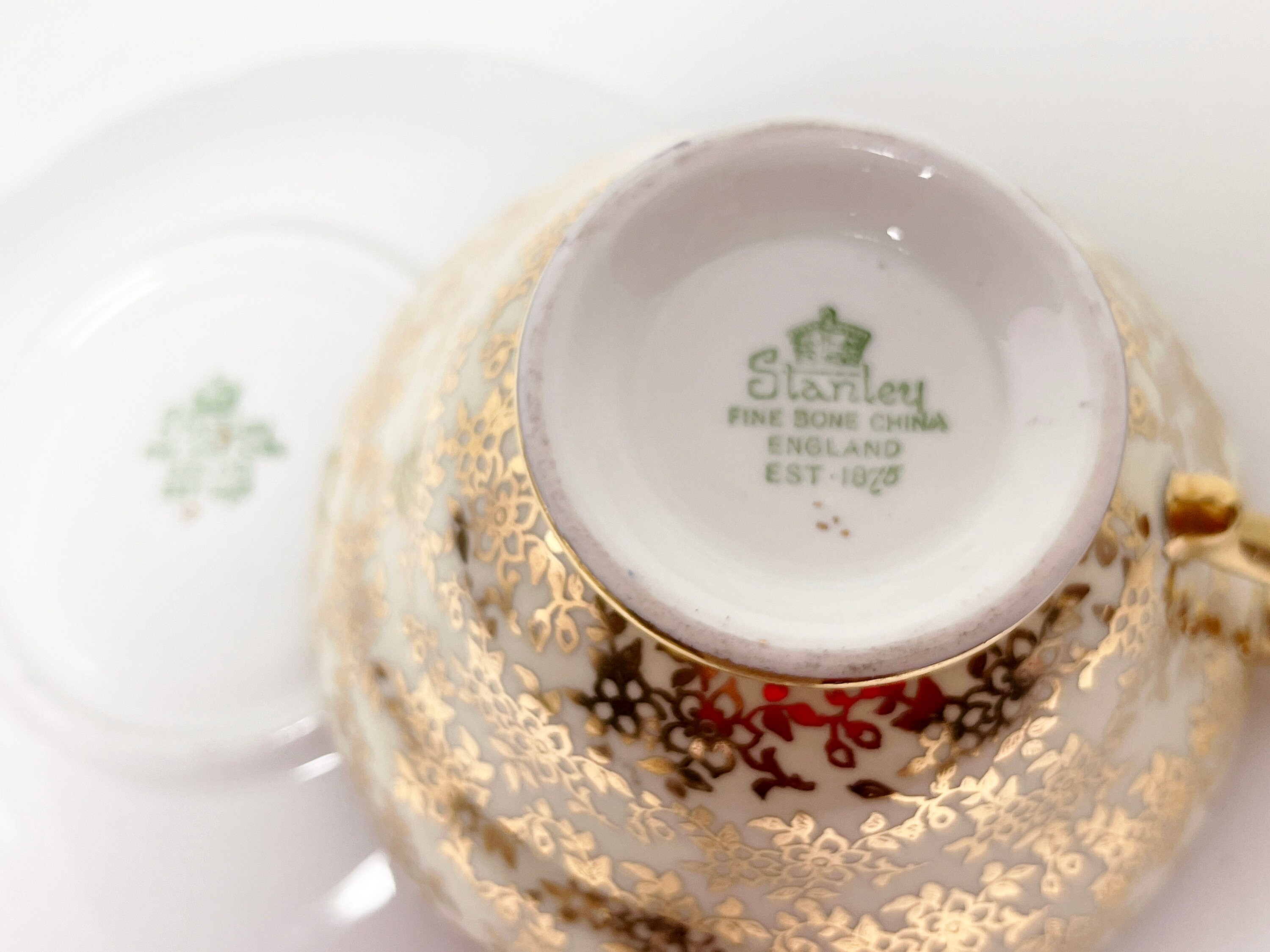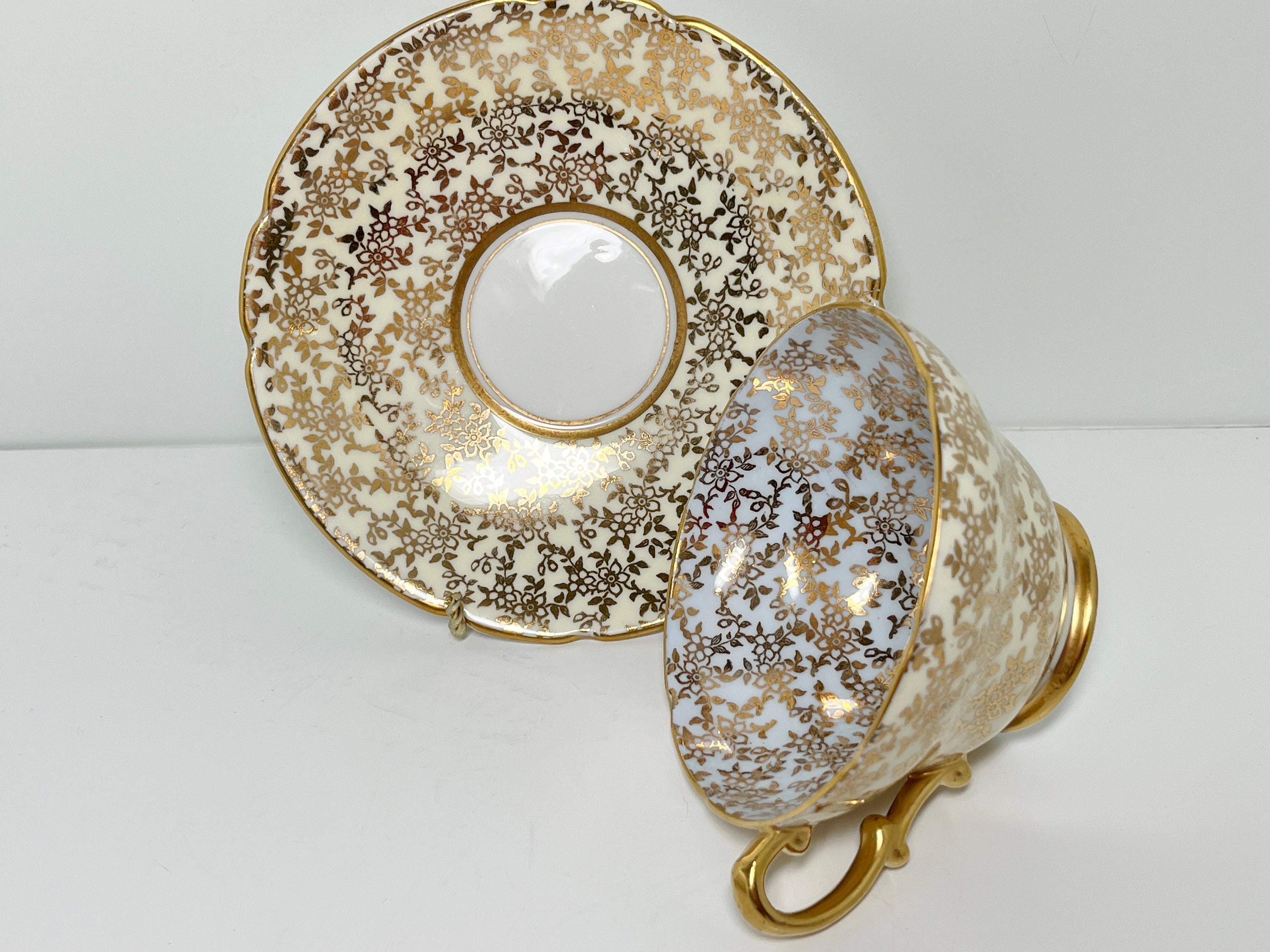 Inspired by lace, this elegant teacup and saucer is by Stanley Fine Bone China of England. The buttercup yellow is pale. The blue feels like a gentle day, but is the all over golden lace pattern that sets these pieces apart.