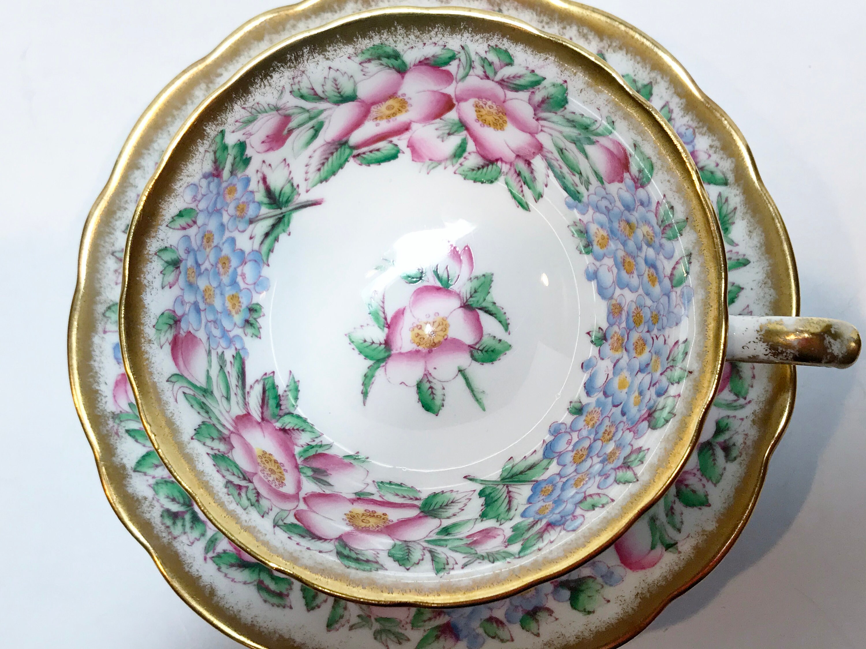 This charming antique teacup and saucer is in excellent condition. We wish to sell and we prefer to have loyal, satisfied, repeat customers. We do this by fully describing every flaw that we see. There are no chips, cracks or chips. We do not sell damaged items. You may buy with confidence.