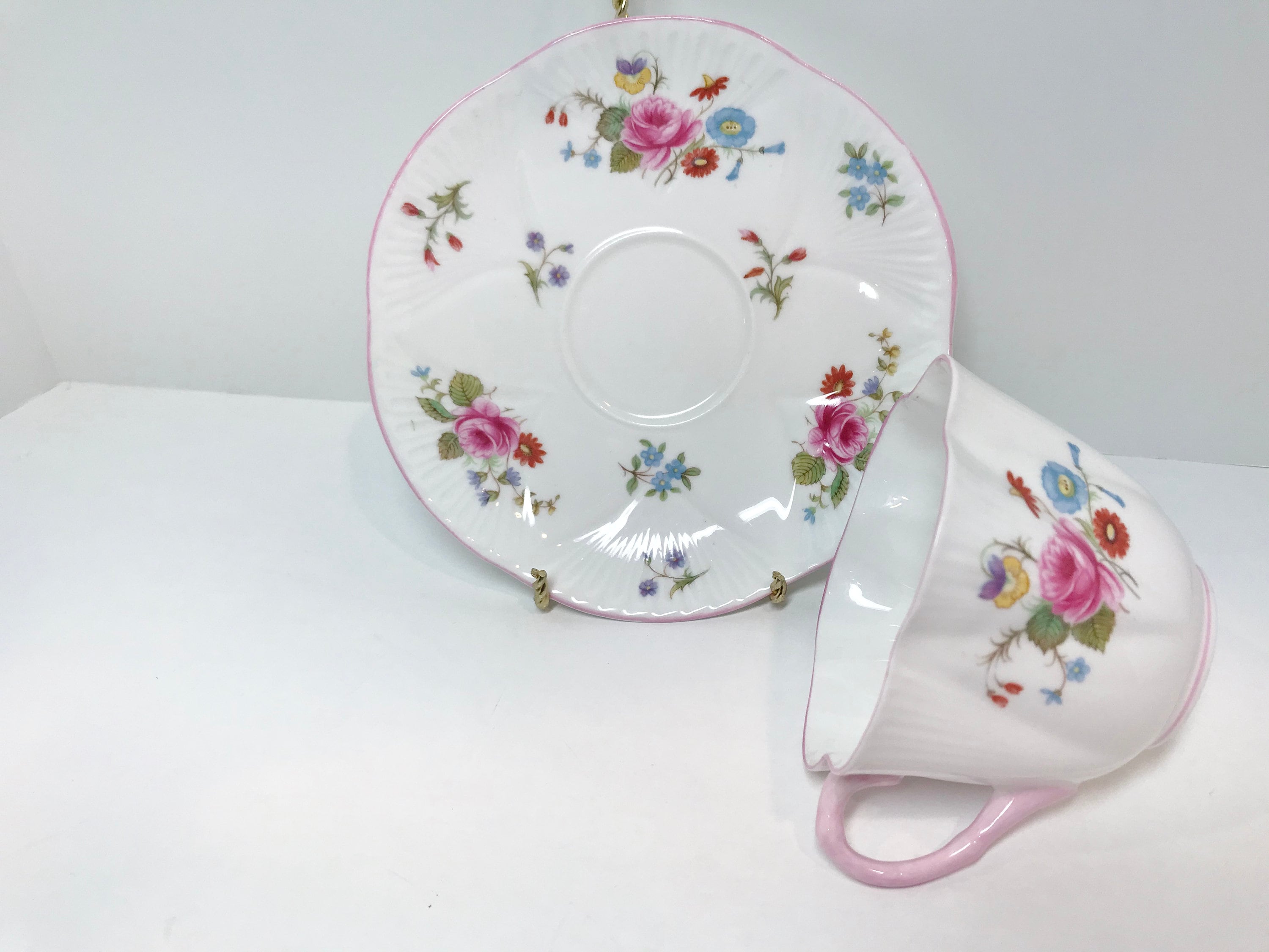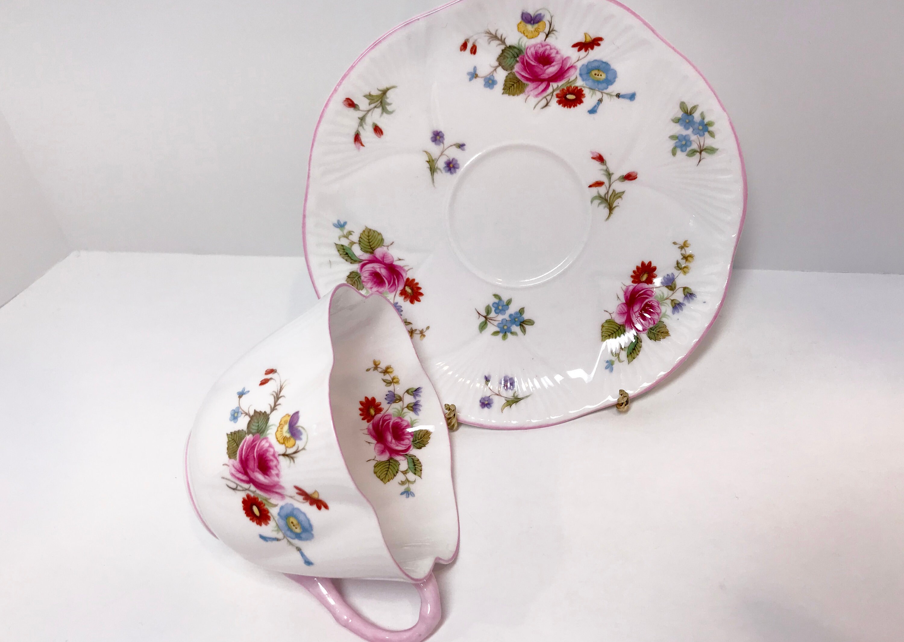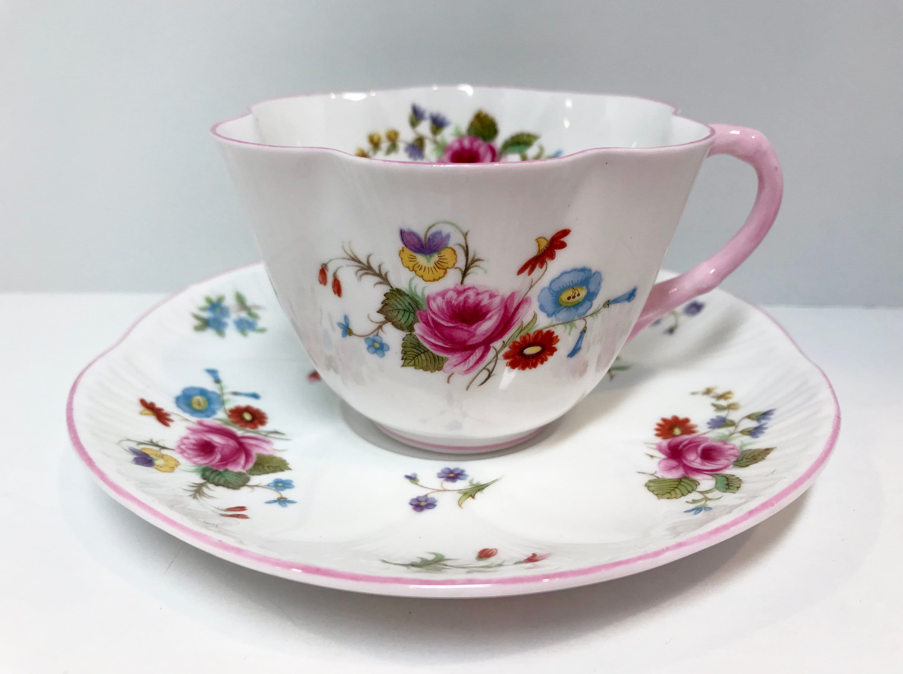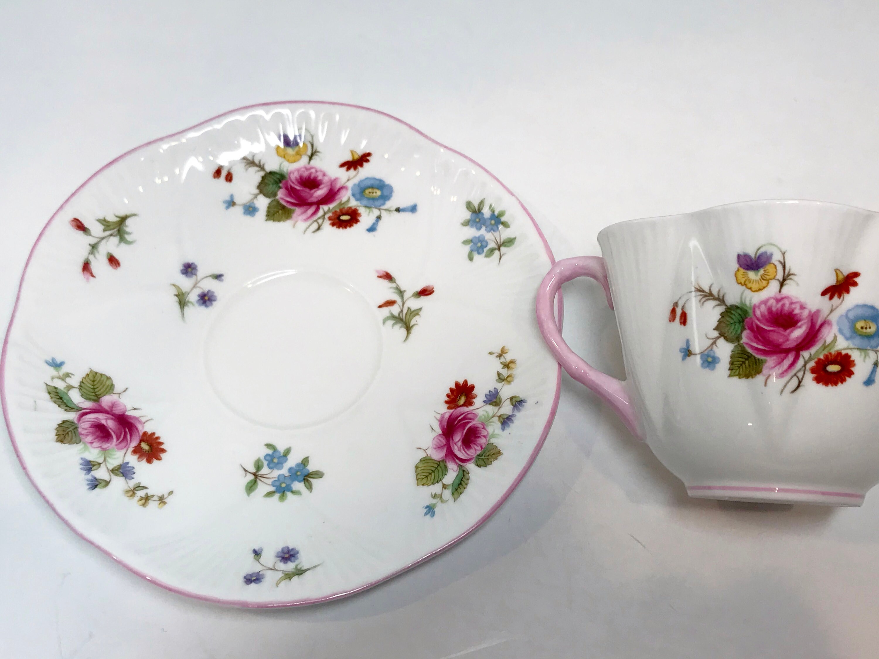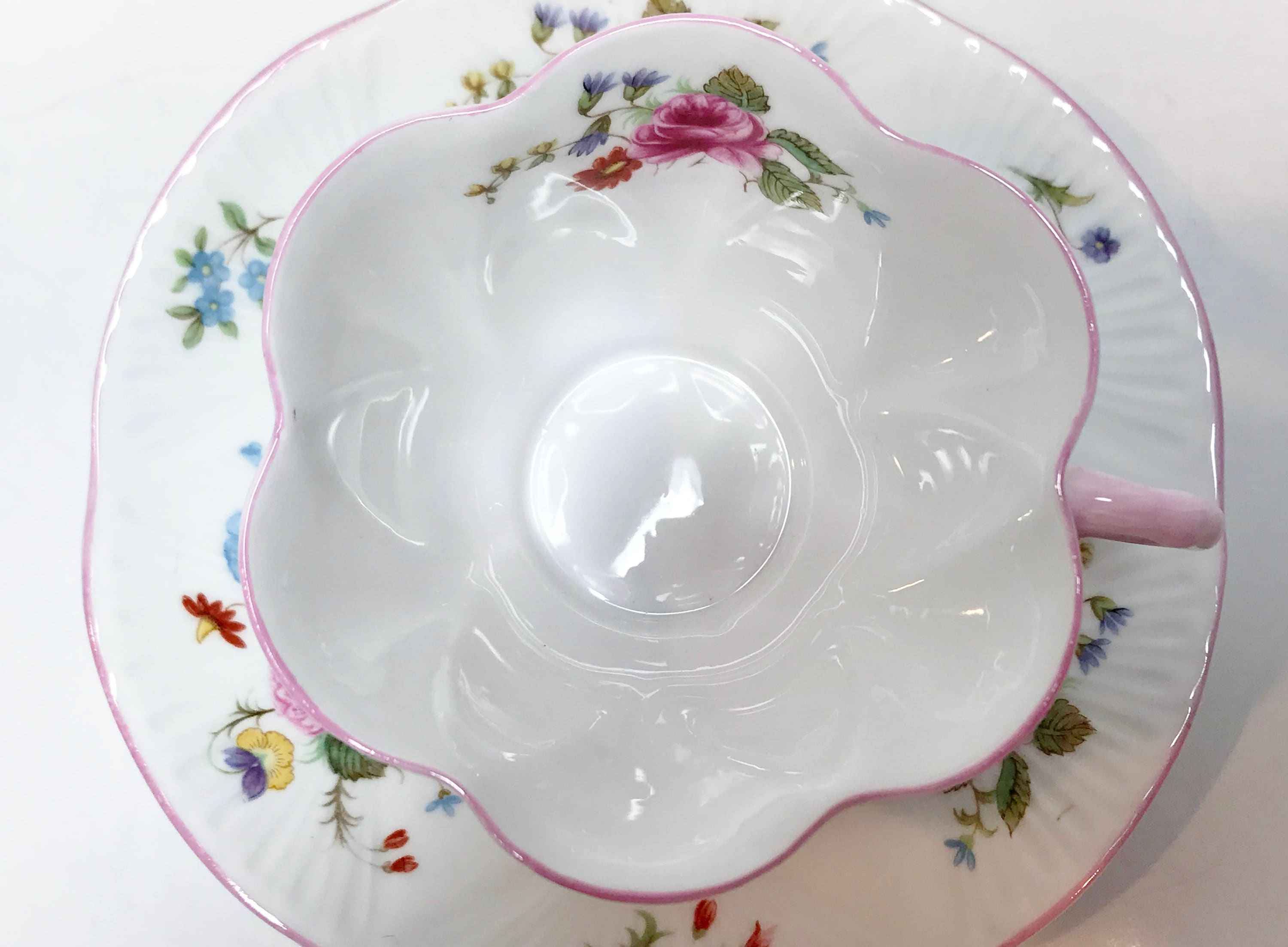 This lovely teacup and saucer is by Shelley Fine Bone China of England in their Dainty shape. The backstamp was used from 1940 to 1966, but the pattern was registered in England in 1957. This is number 13425. The pattern is called Rose and Red Daisy. Note the pink handle and edges.