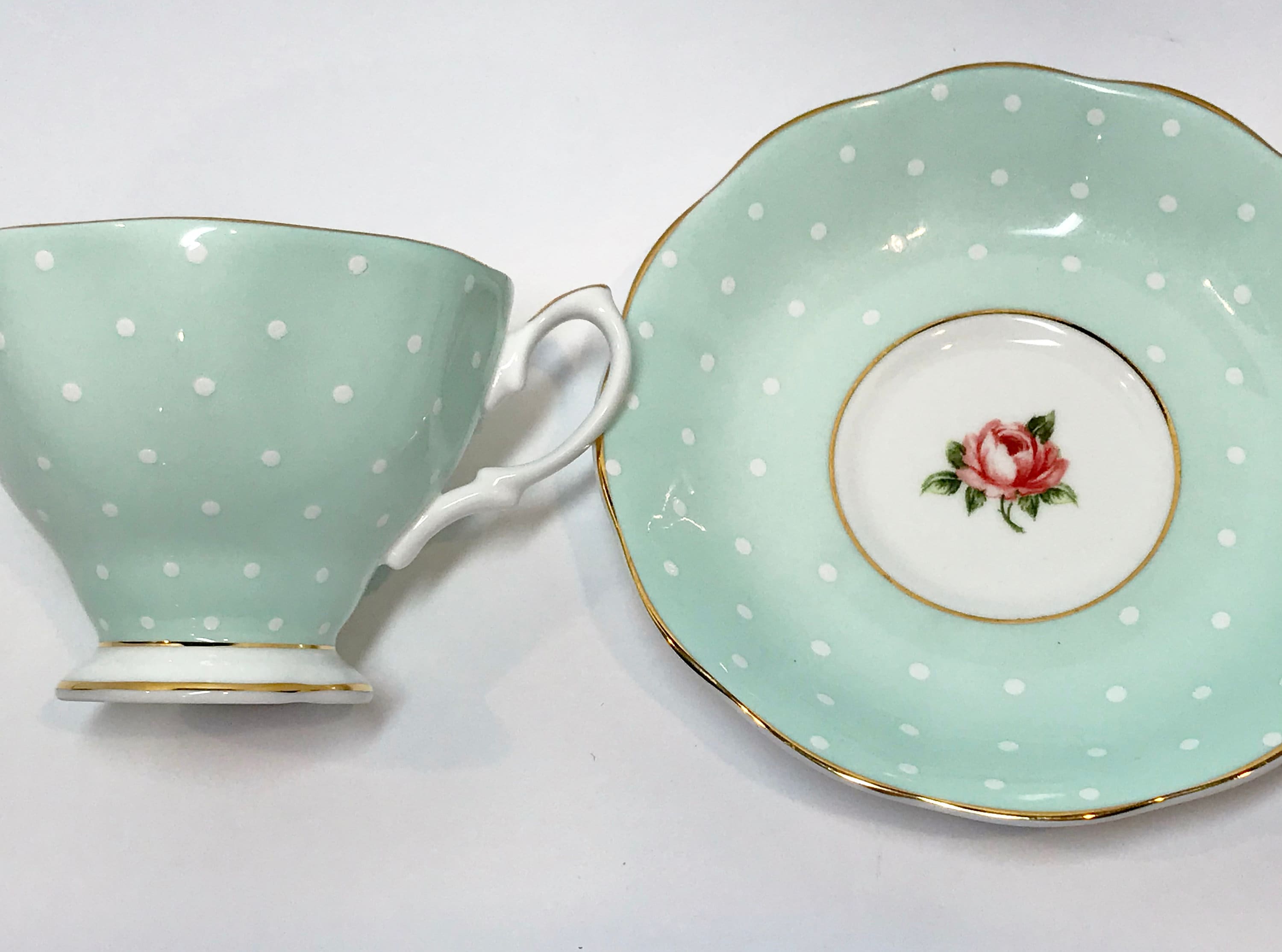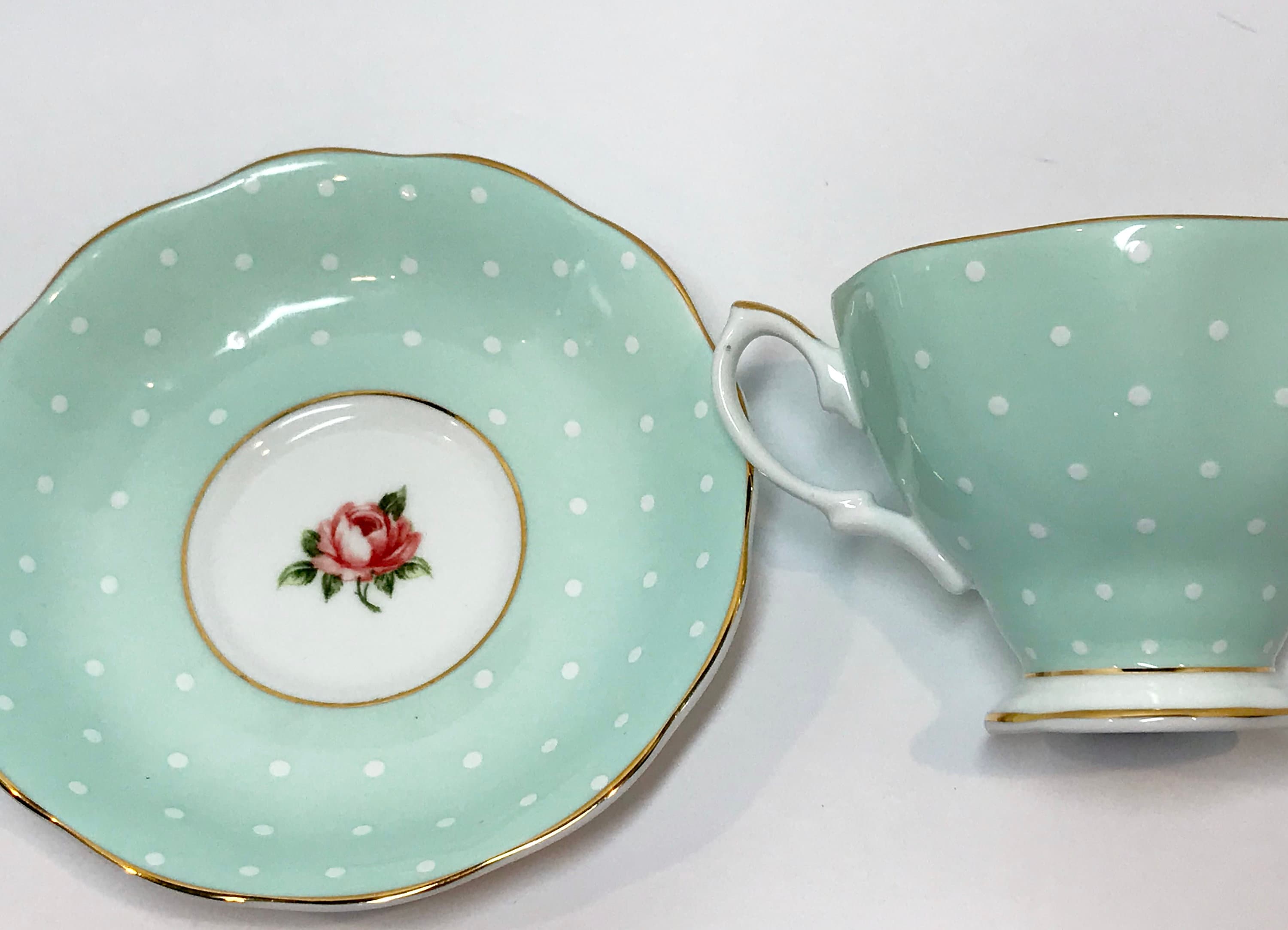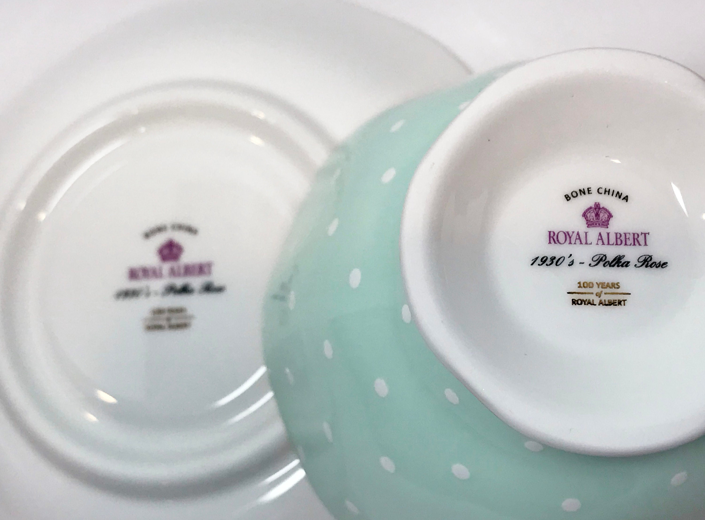 Royal Albert Bone China created fine teacups and saucers with a theme in mind. In the 1930s, they created this design and called it Polka Rose. After 100 years of business, they celebrated by reissuing some of their best sellers. Since they were founded in 1894, this means this teacup was made in 1994.