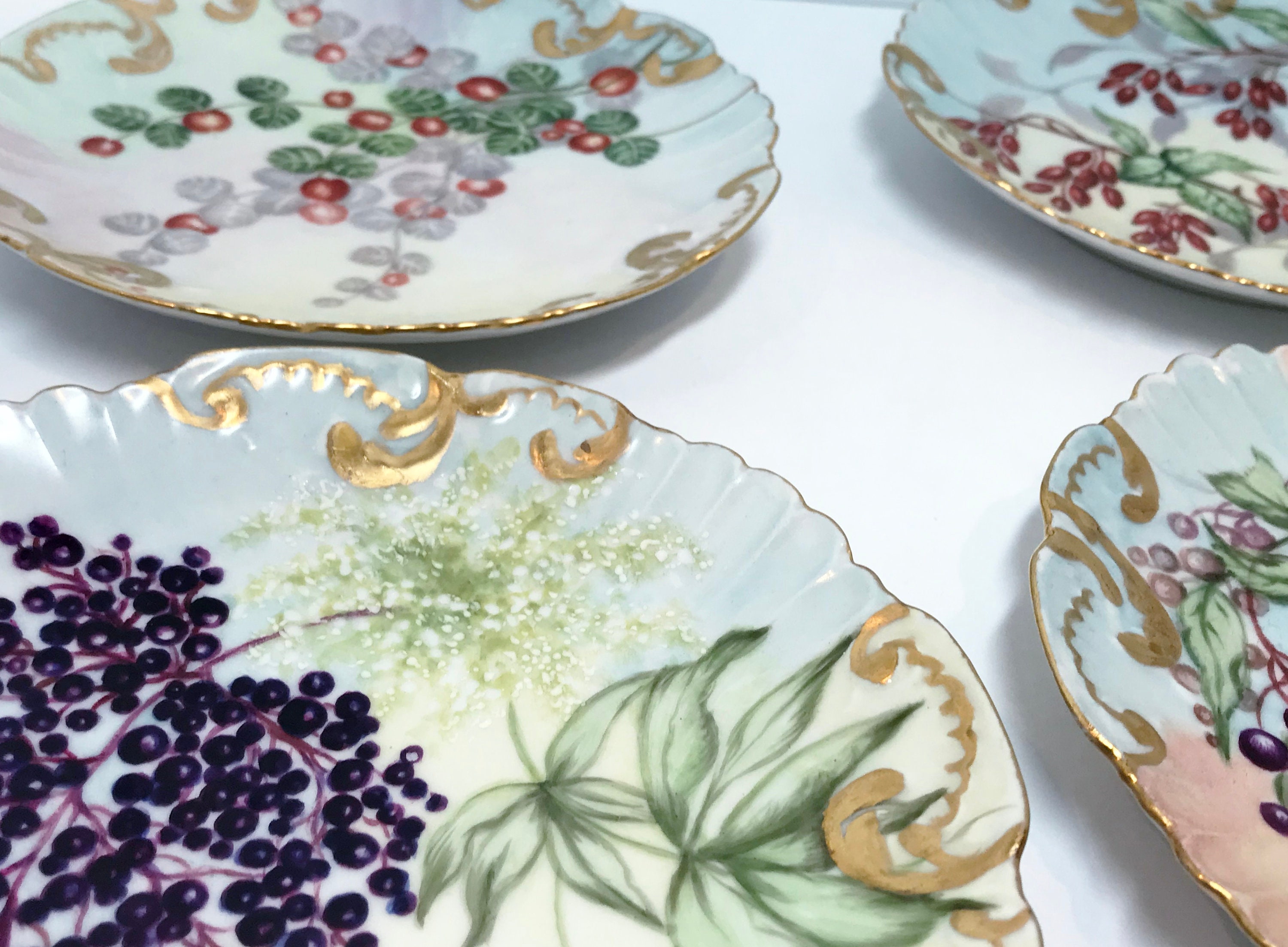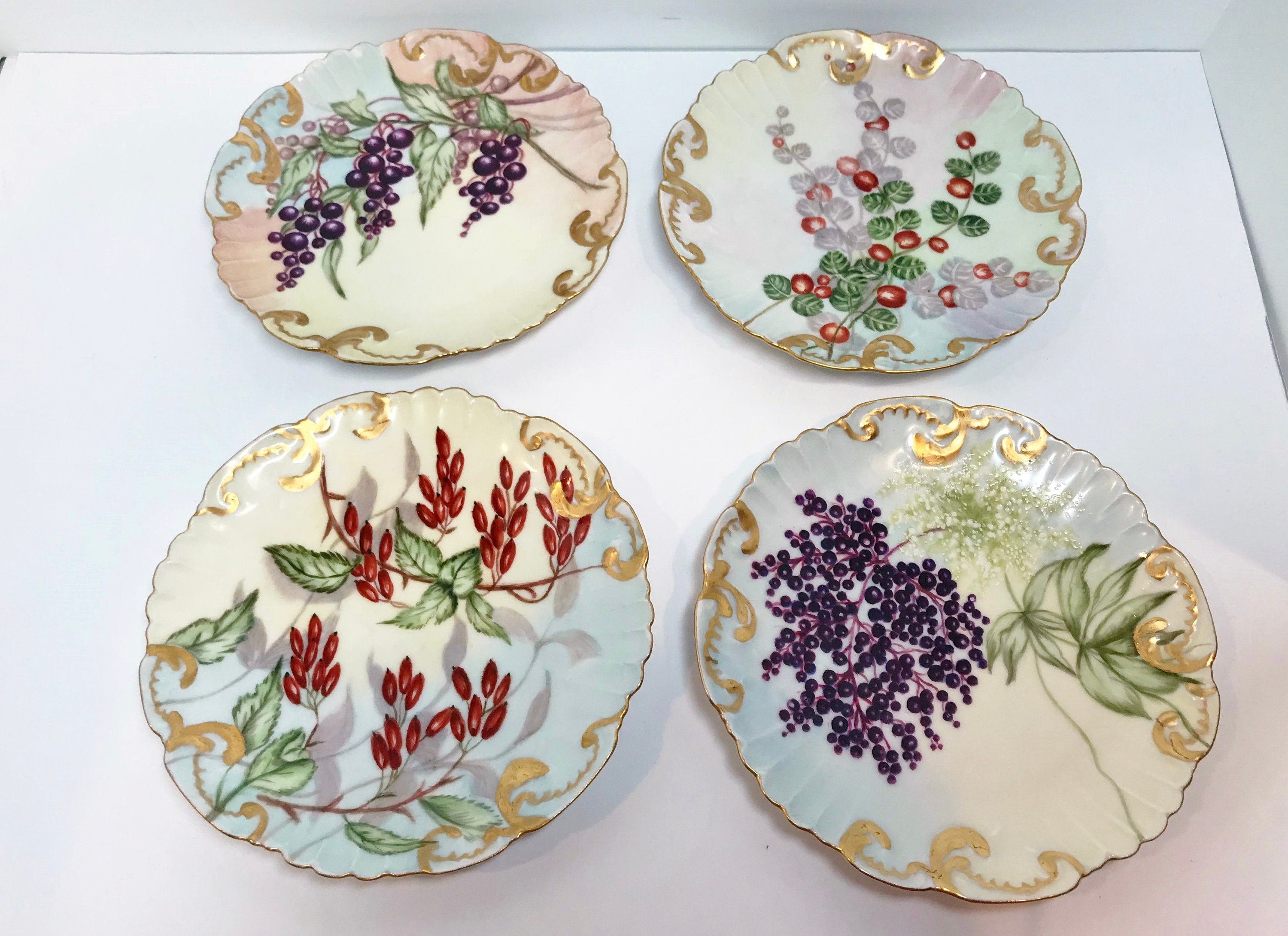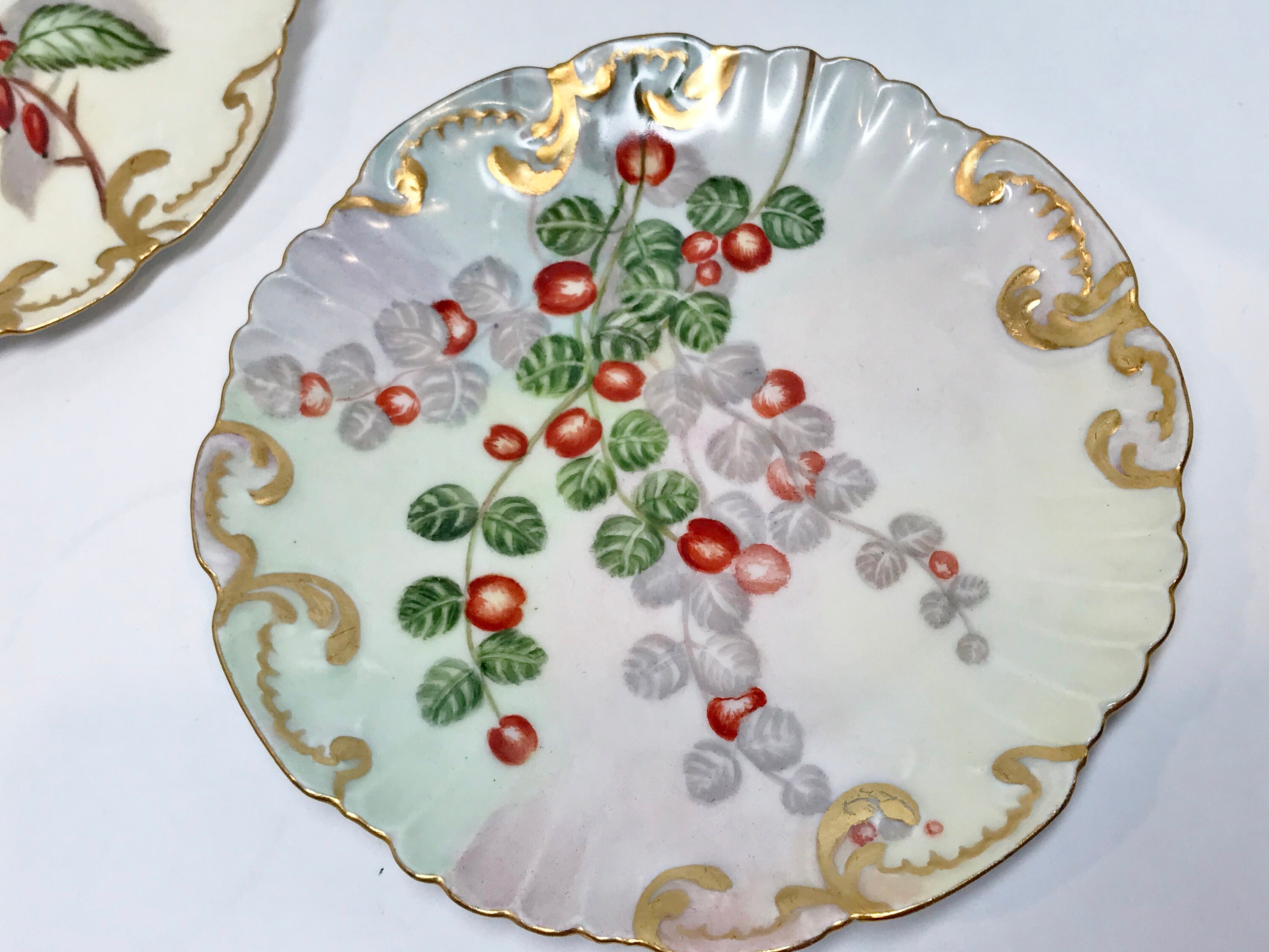 These classic botanical dessert plates were crafted in Limoges, France. They are partially hand painted.